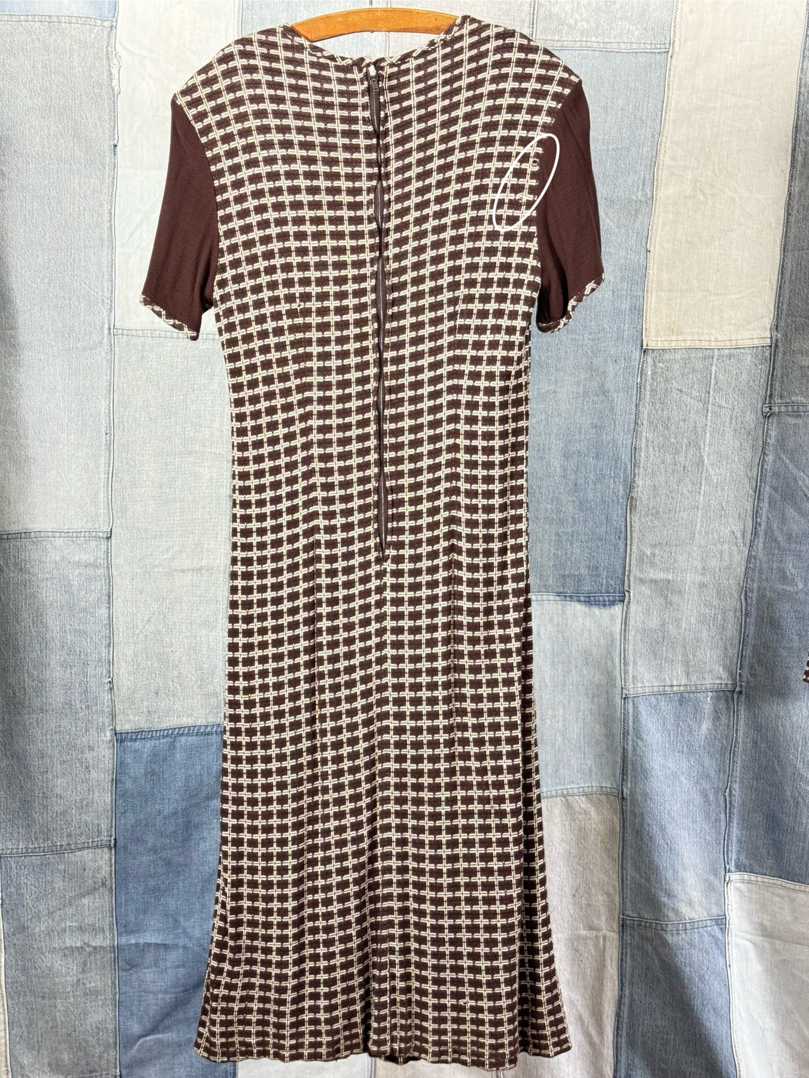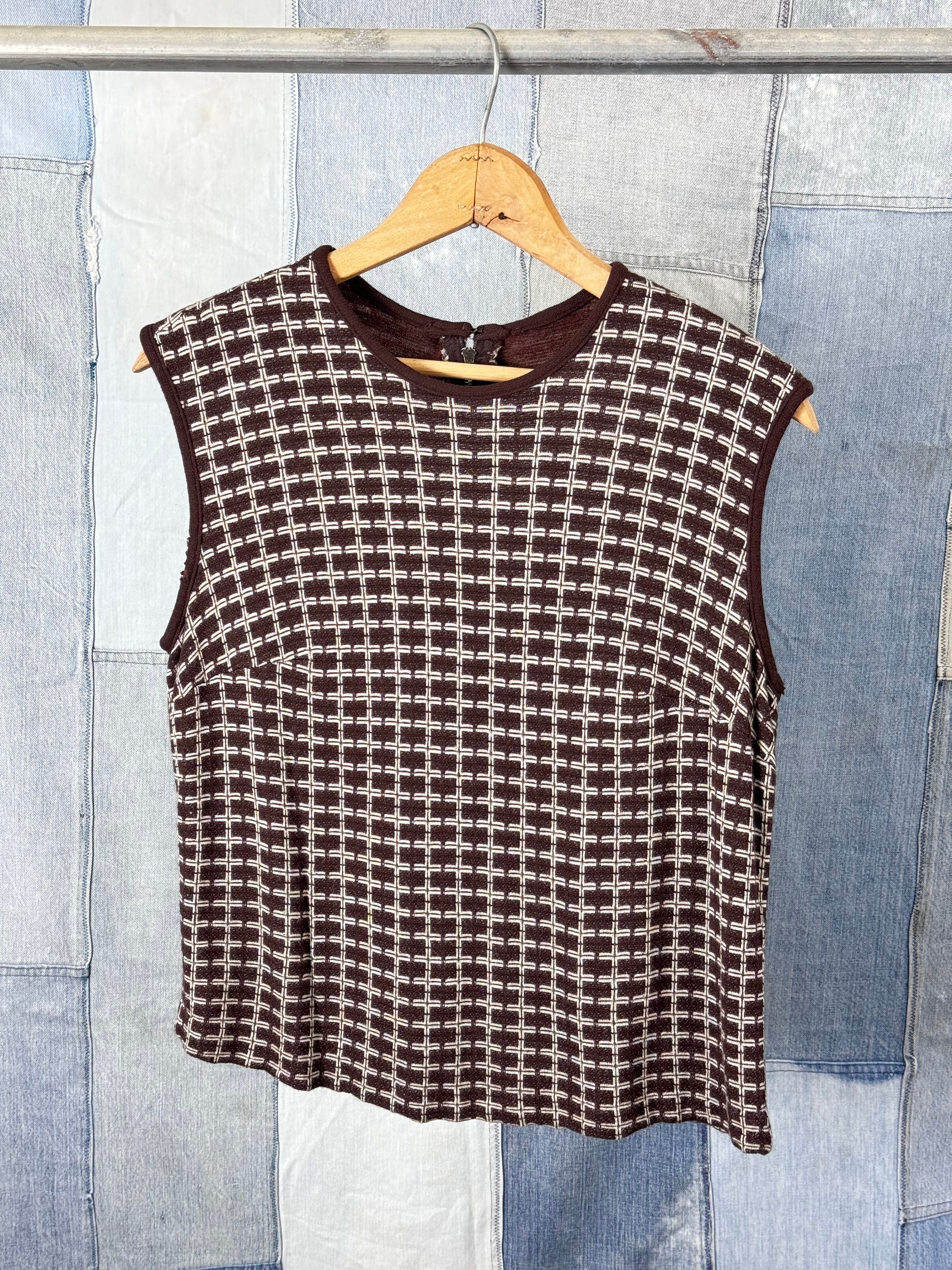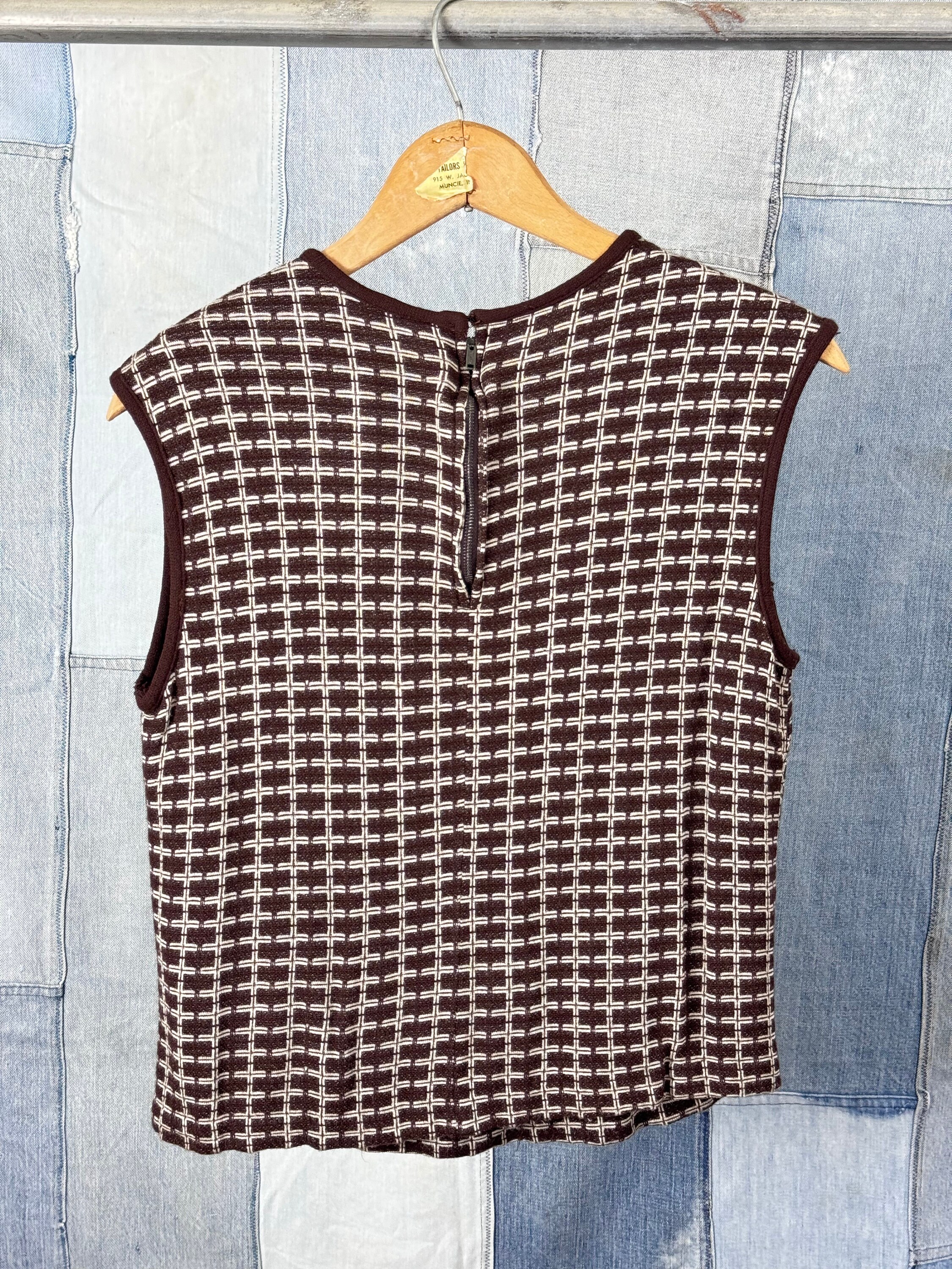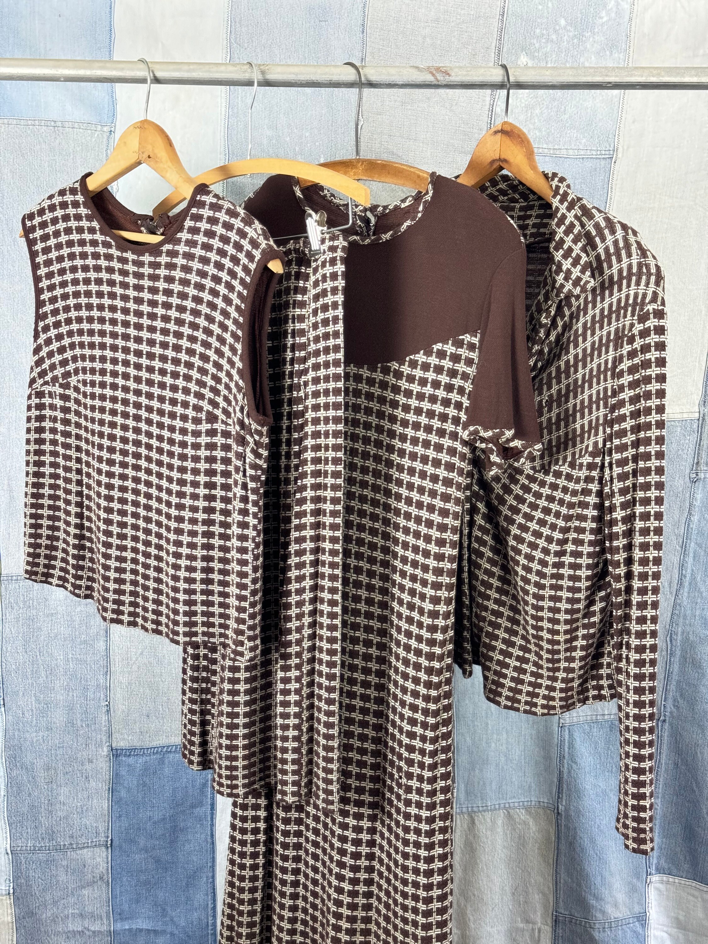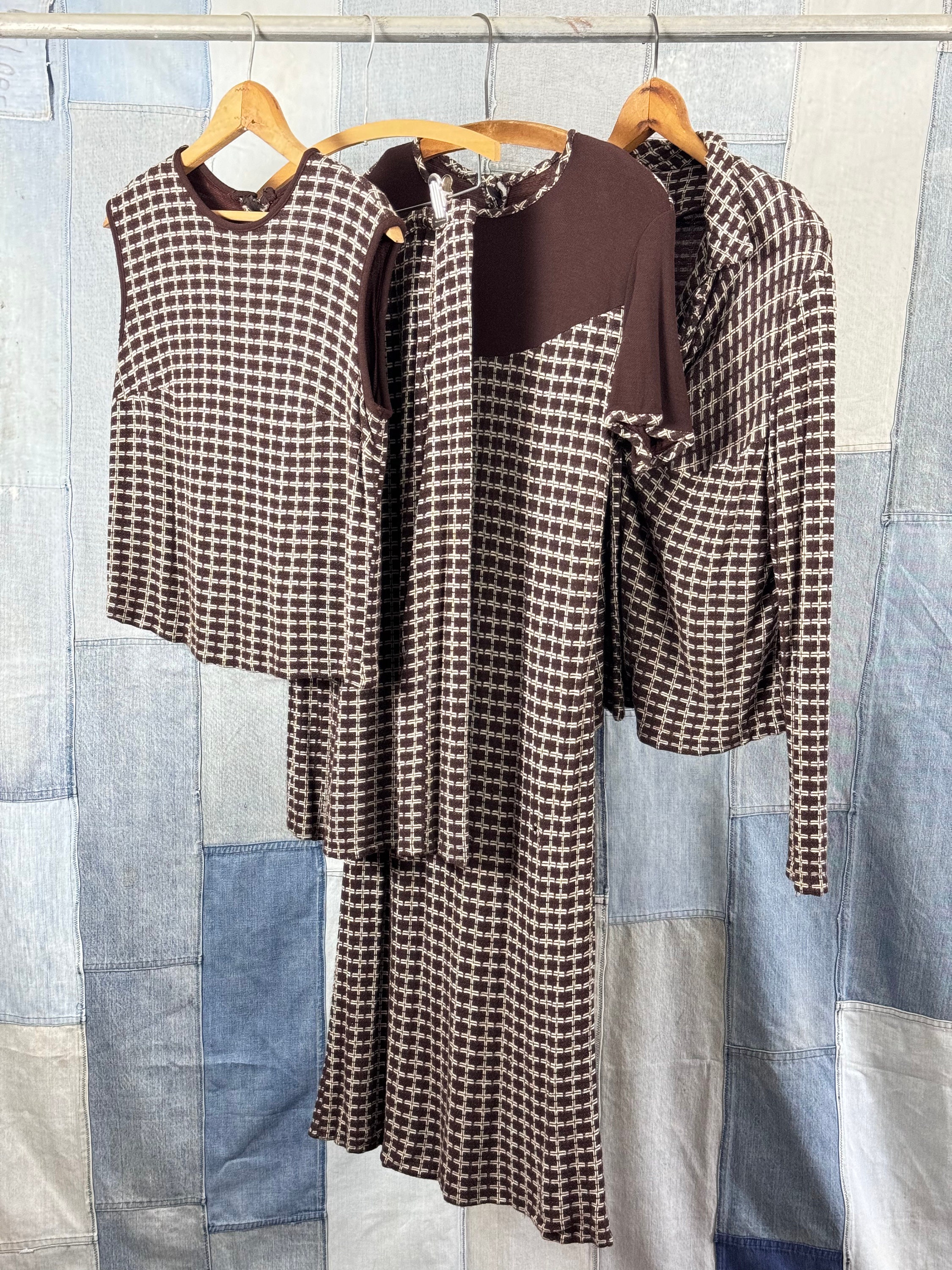An authentic vintage womens dress, top, skirt, and jacket set in a geometric knit fabric. a quirky design that can be style several different ways