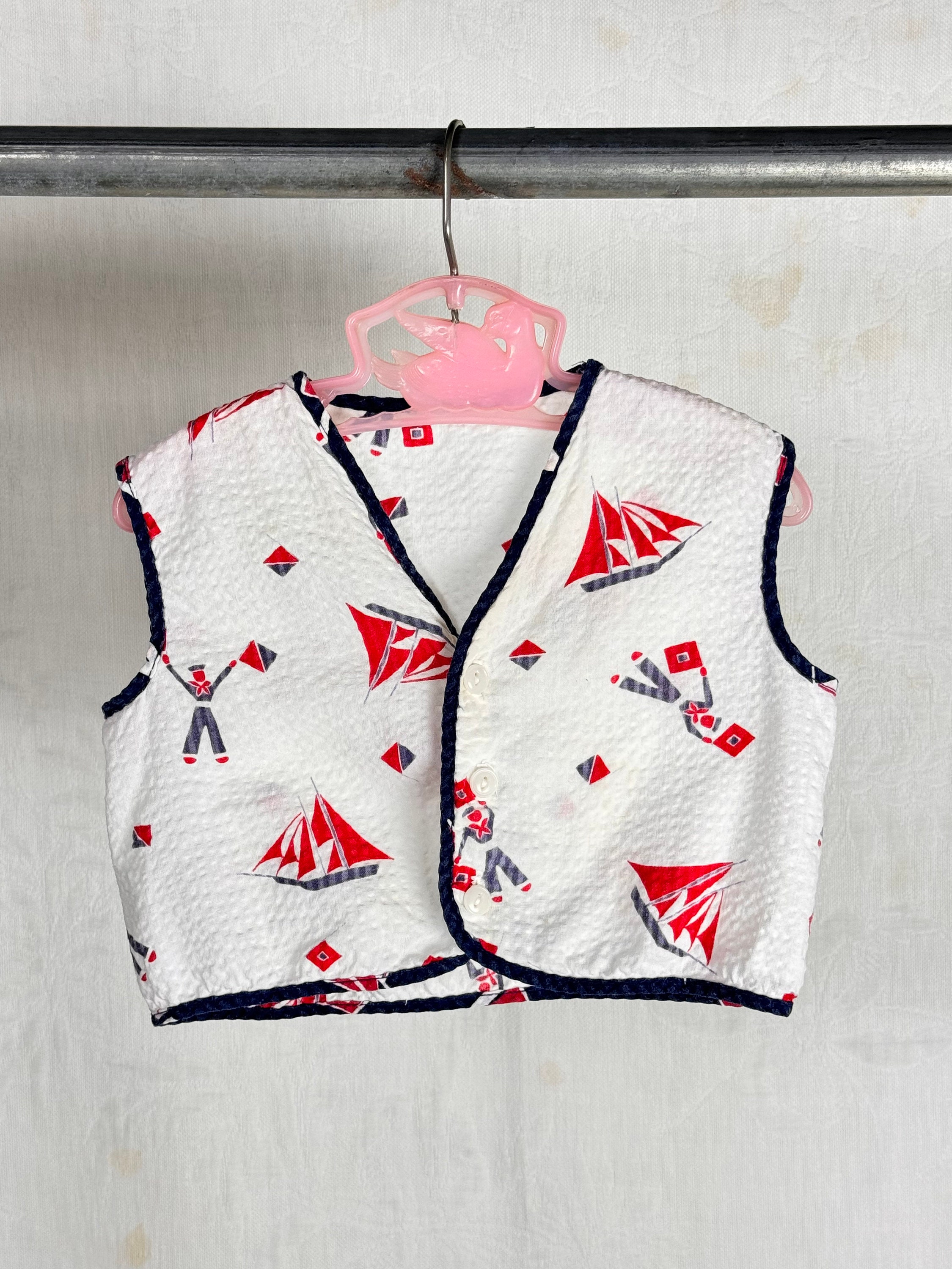 Authentic vintage children’s shirt. a lightweight seersucker fabric with sailor themed novelty print. button fasteners.