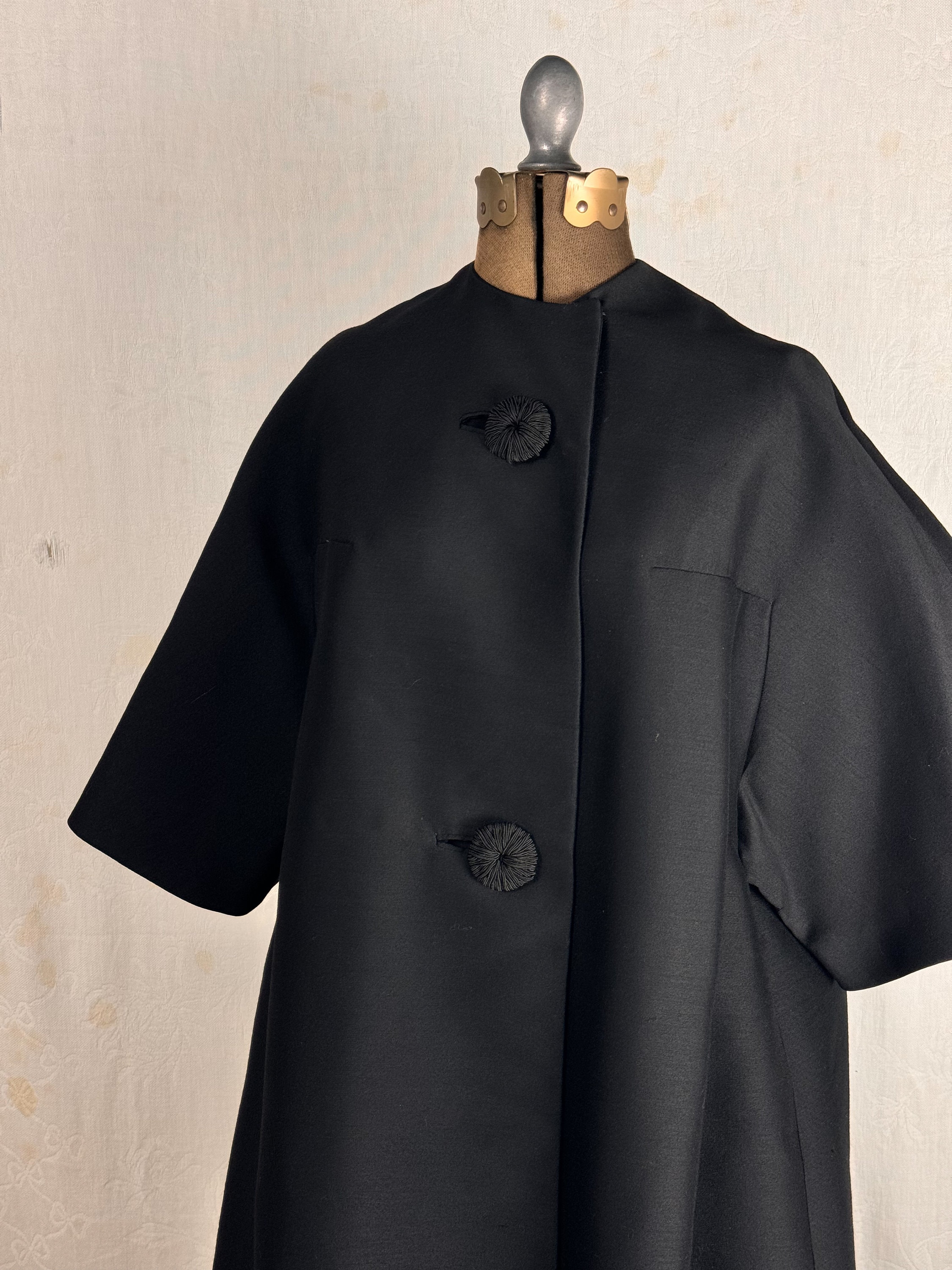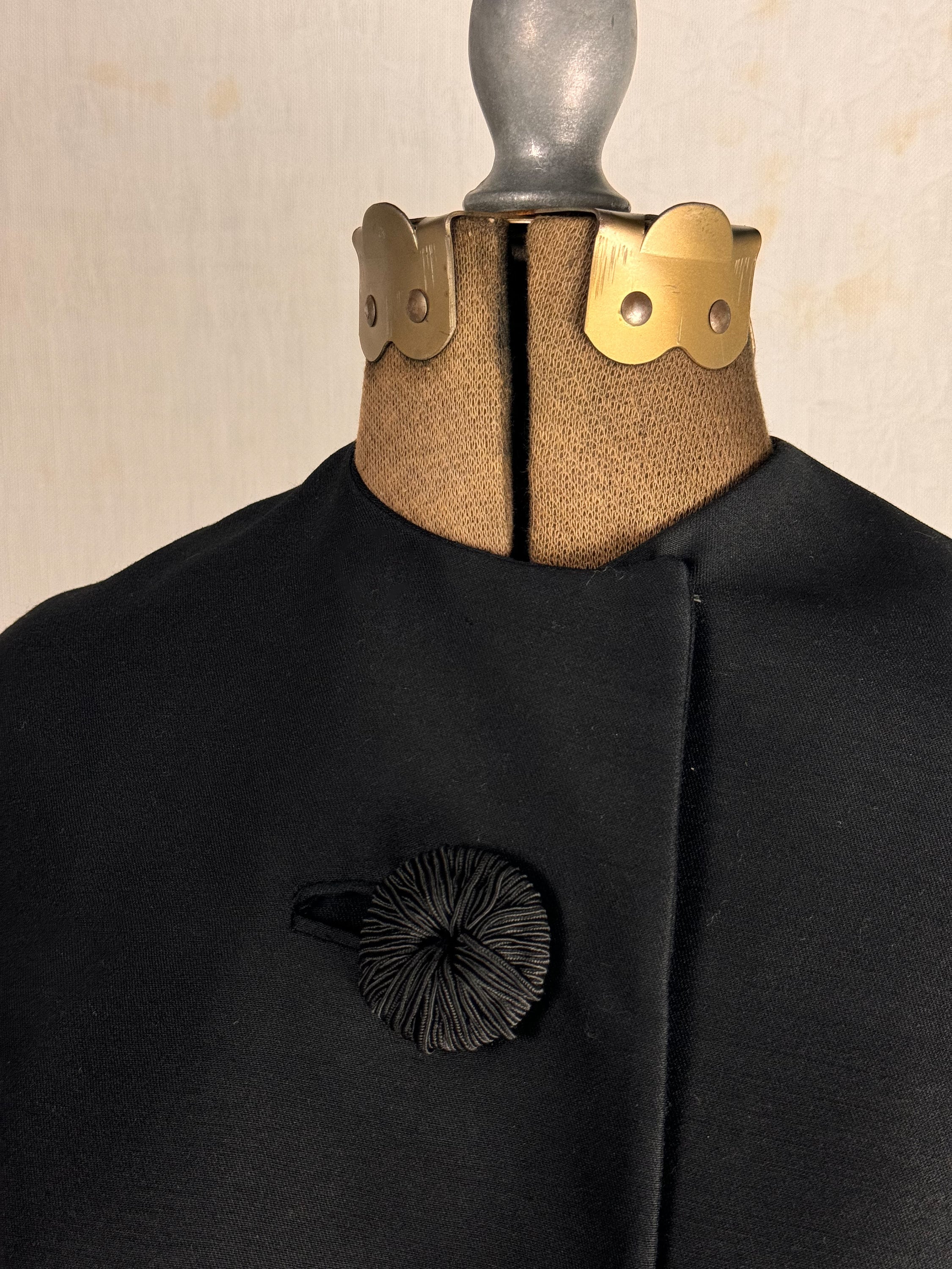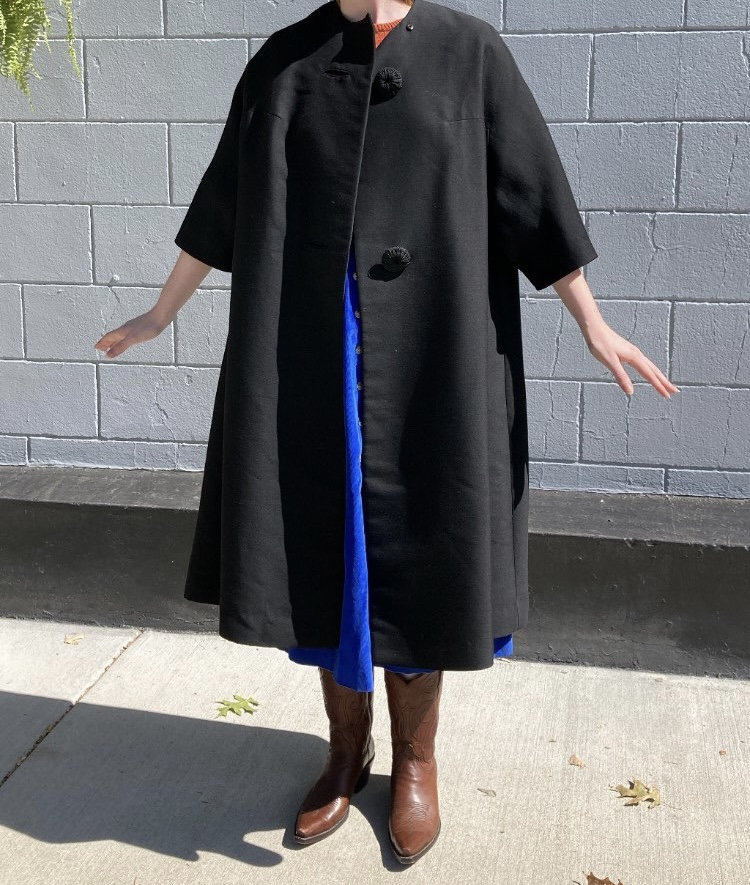 An authentic vintage dress originally sold by Selman’s department store in Louisville , Kentucky. an incredibly elegant opera coat with oversized cord wrapped button fasteners and a wide structure and cropped sleeves. invisible pockets, right pocket is still sewn shut.