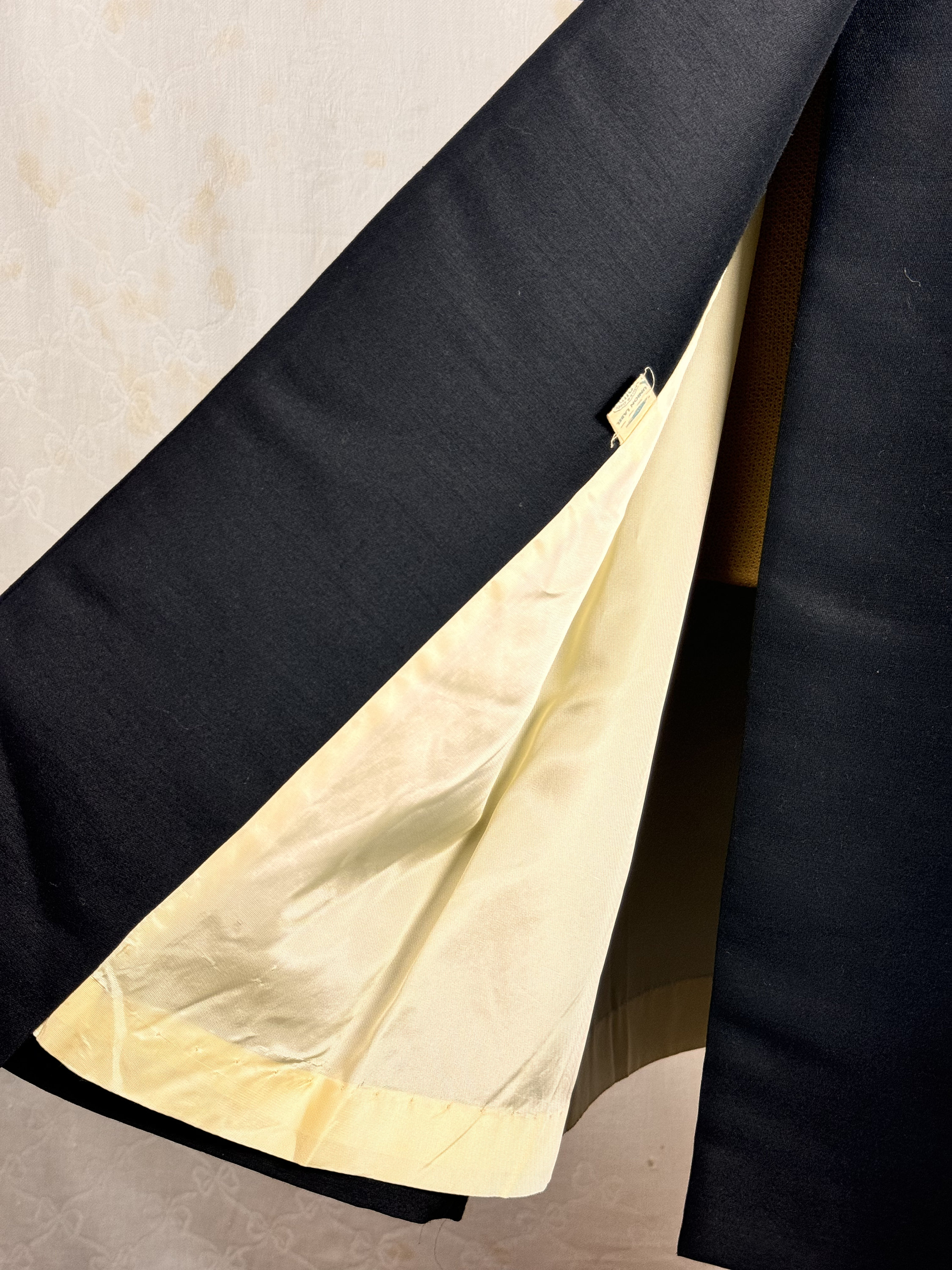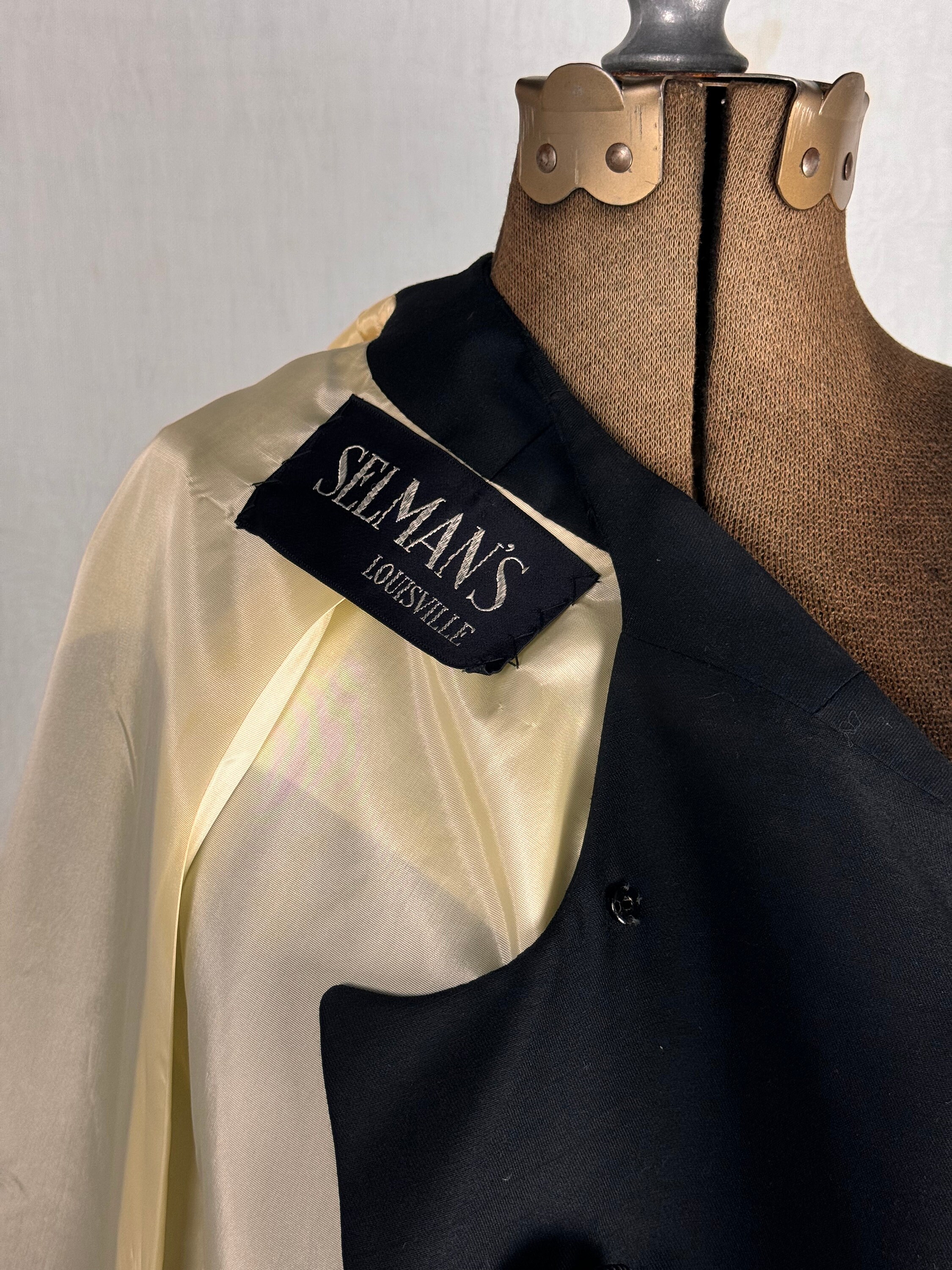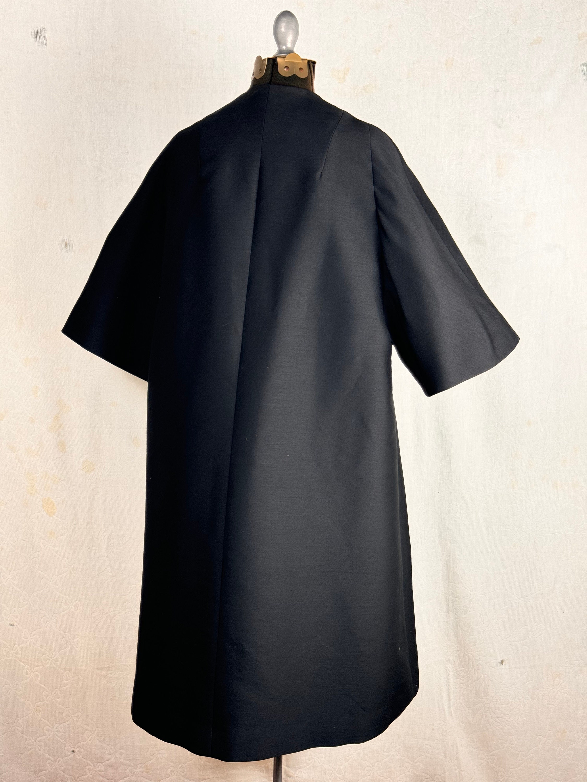 An authentic vintage dress originally sold by Selman’s department store in Louisville , Kentucky. an incredibly elegant opera coat with oversized cord wrapped button fasteners and a wide structure and cropped sleeves. invisible pockets, right pocket is still sewn shut.