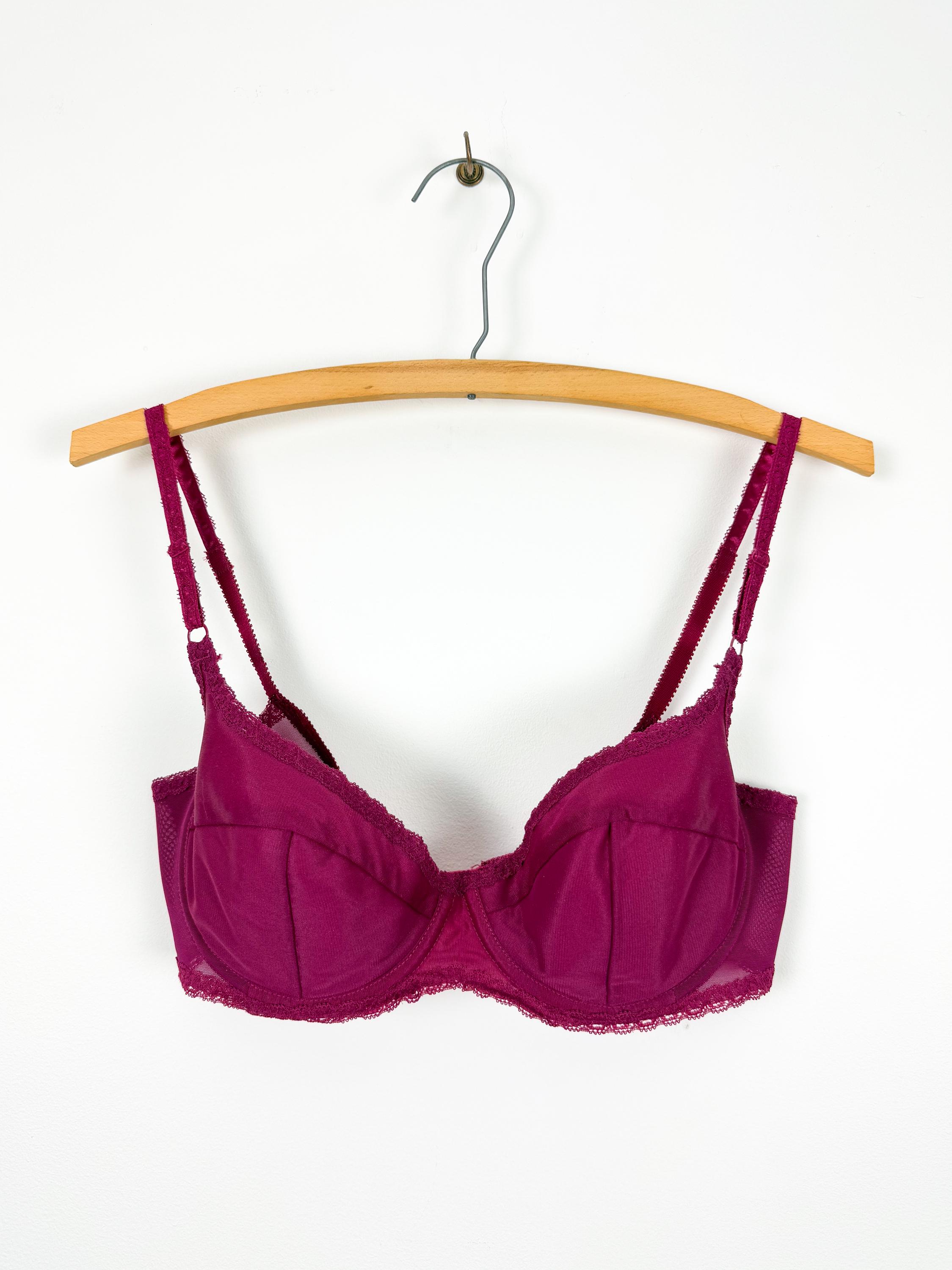 An authentic vintage balconette bra by Hollywood Vassarette. mesh stretch fabric around the band. satin and lace trim. adjustable straps. thin soft padded fine nylon bra cups with underwire. made in USA.
