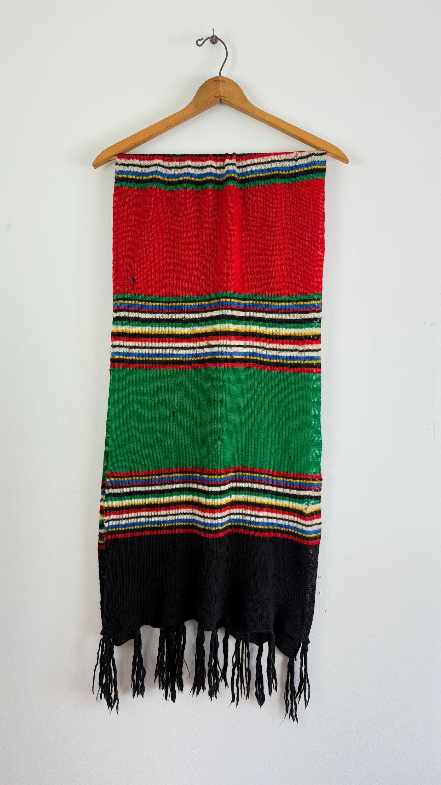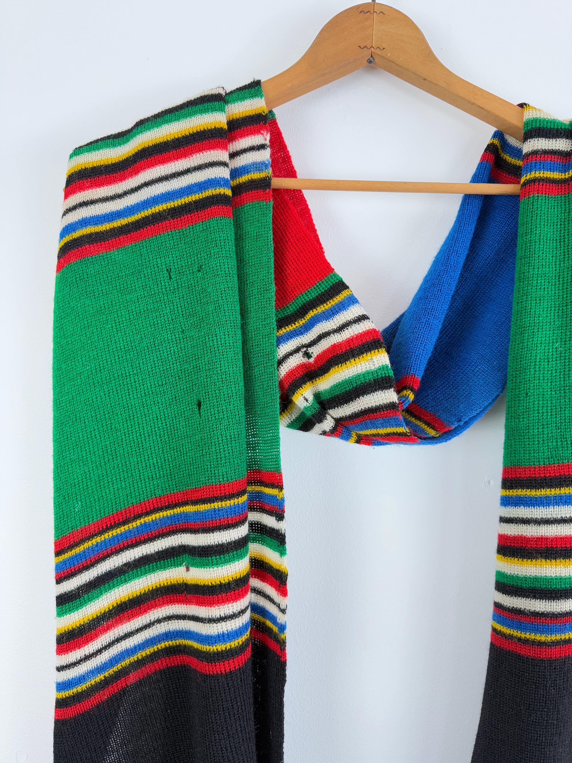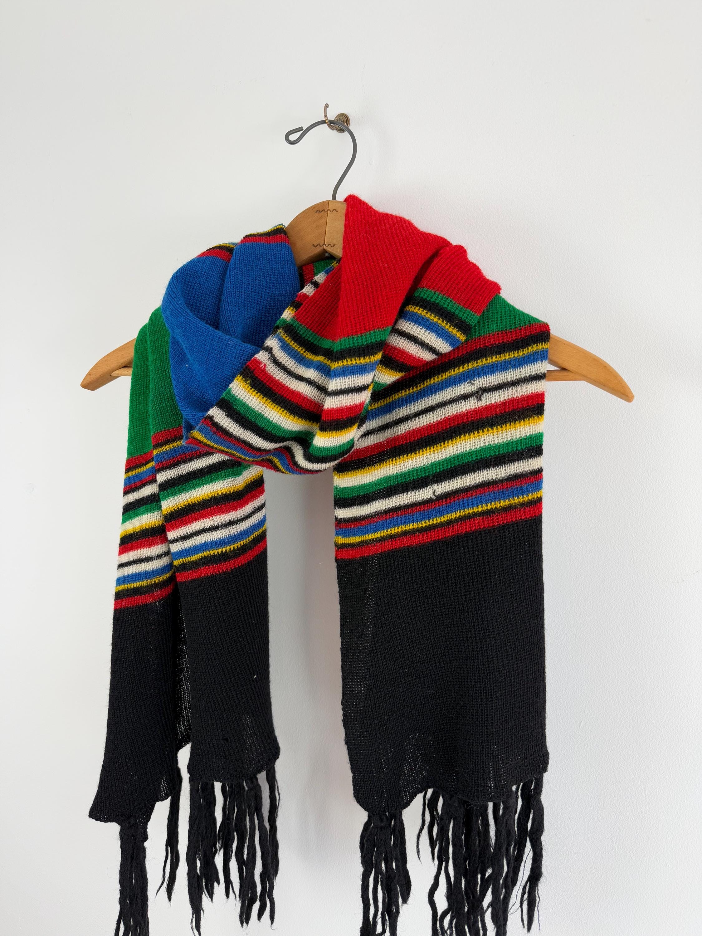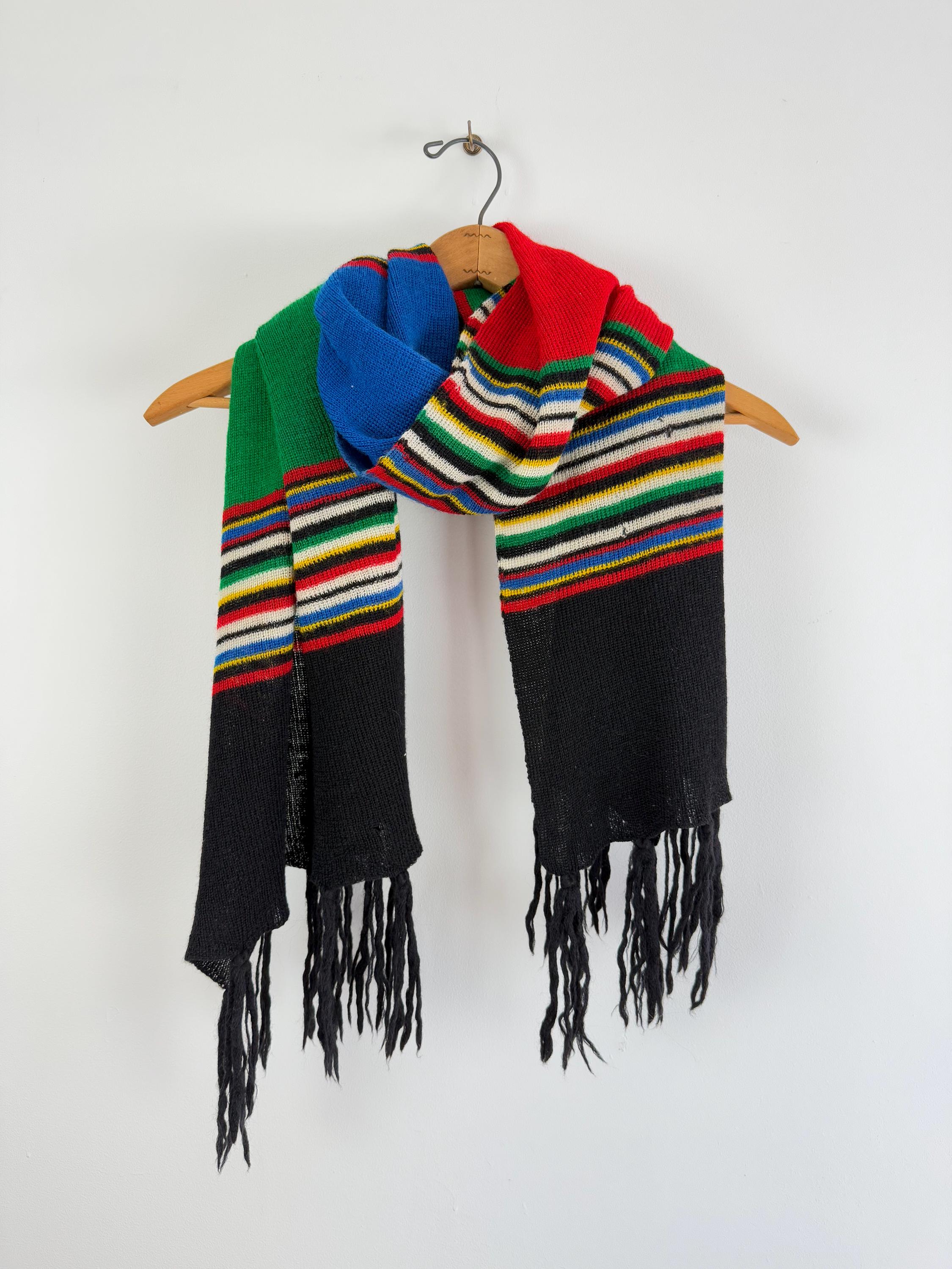 An authentic vintage knitted winter scarf in a multicolor stripe pattern. soft fine yarns. extra long length with fringe. very old knitwear aged to perfection with natural distressing.