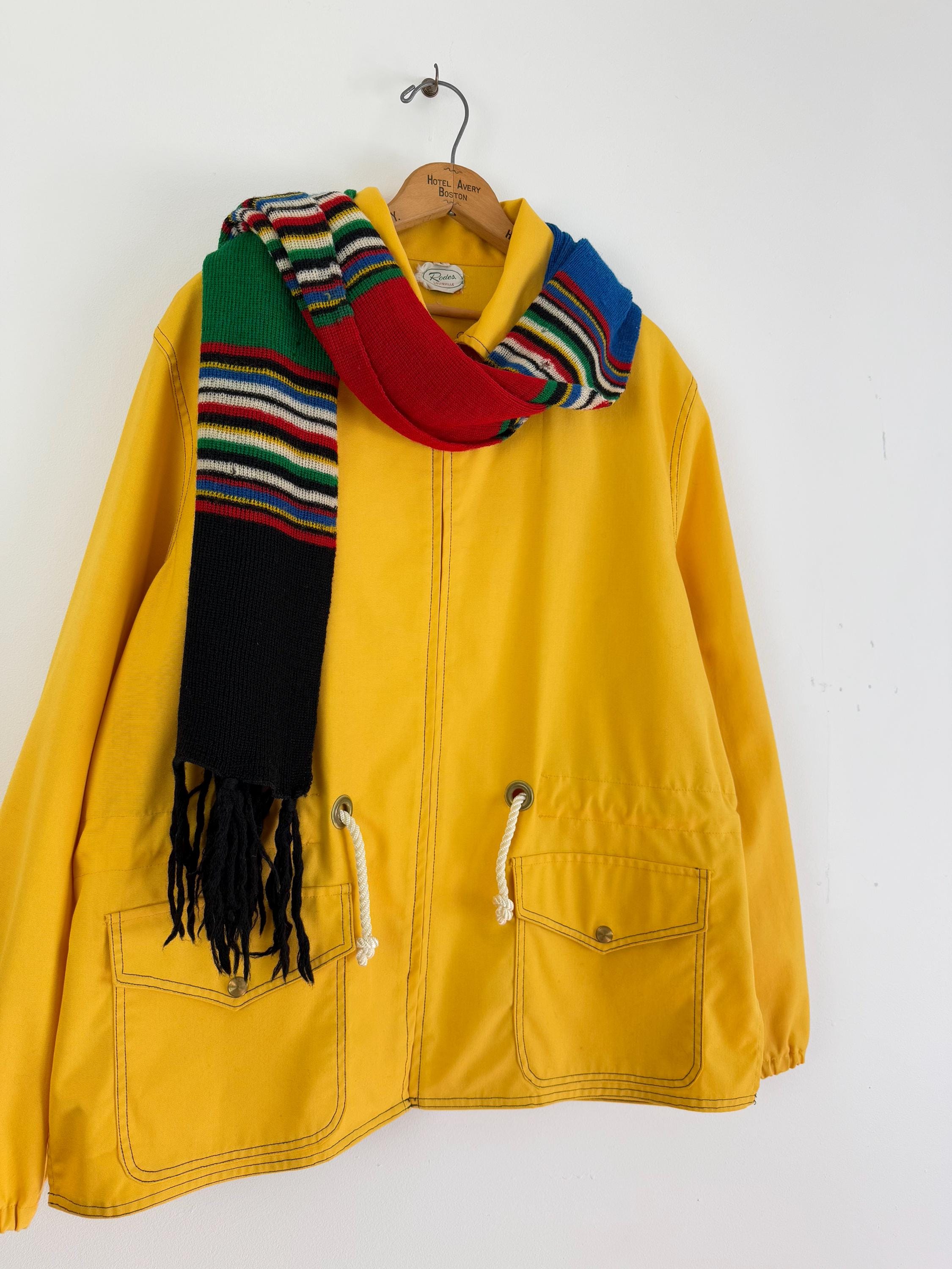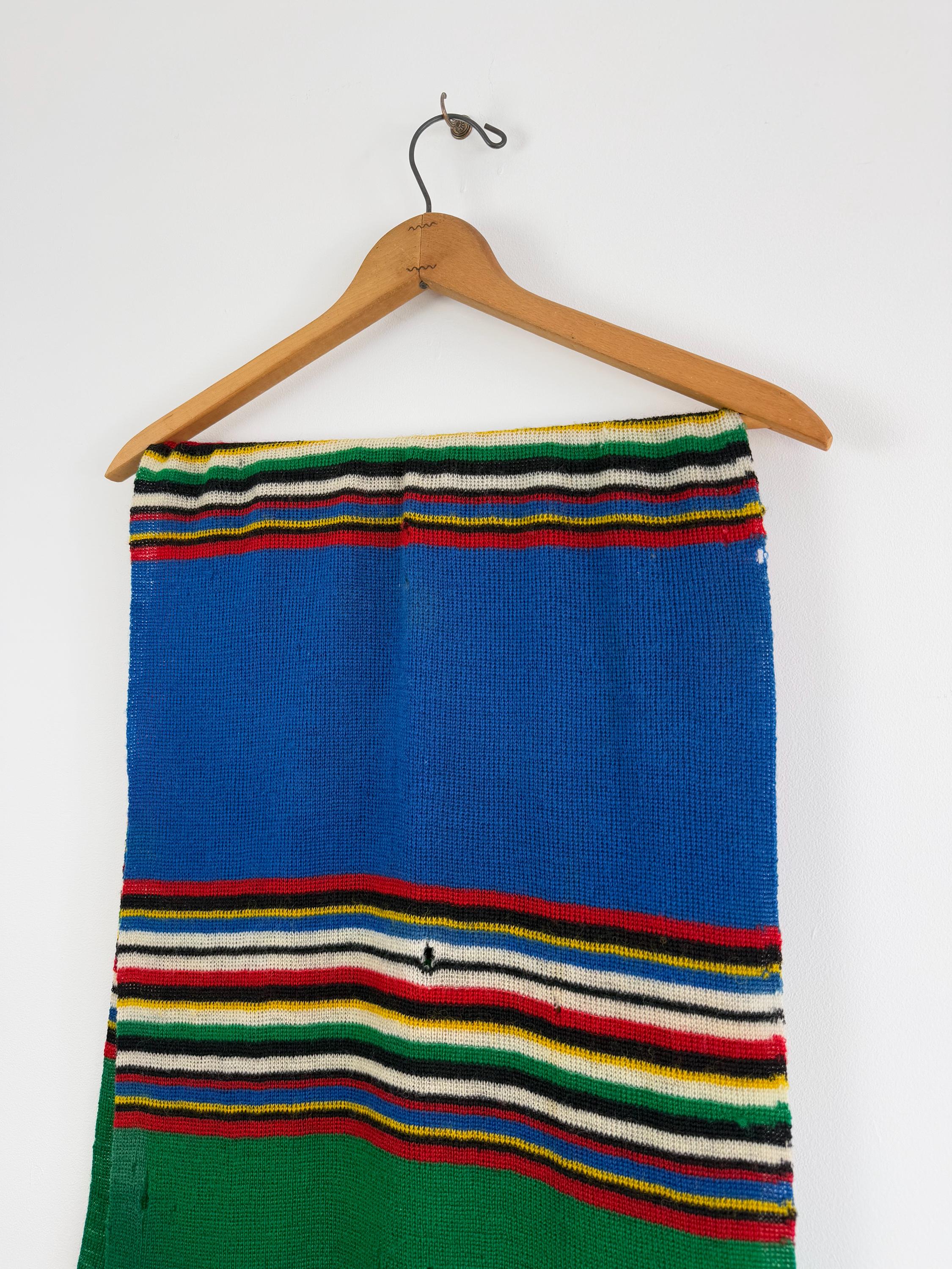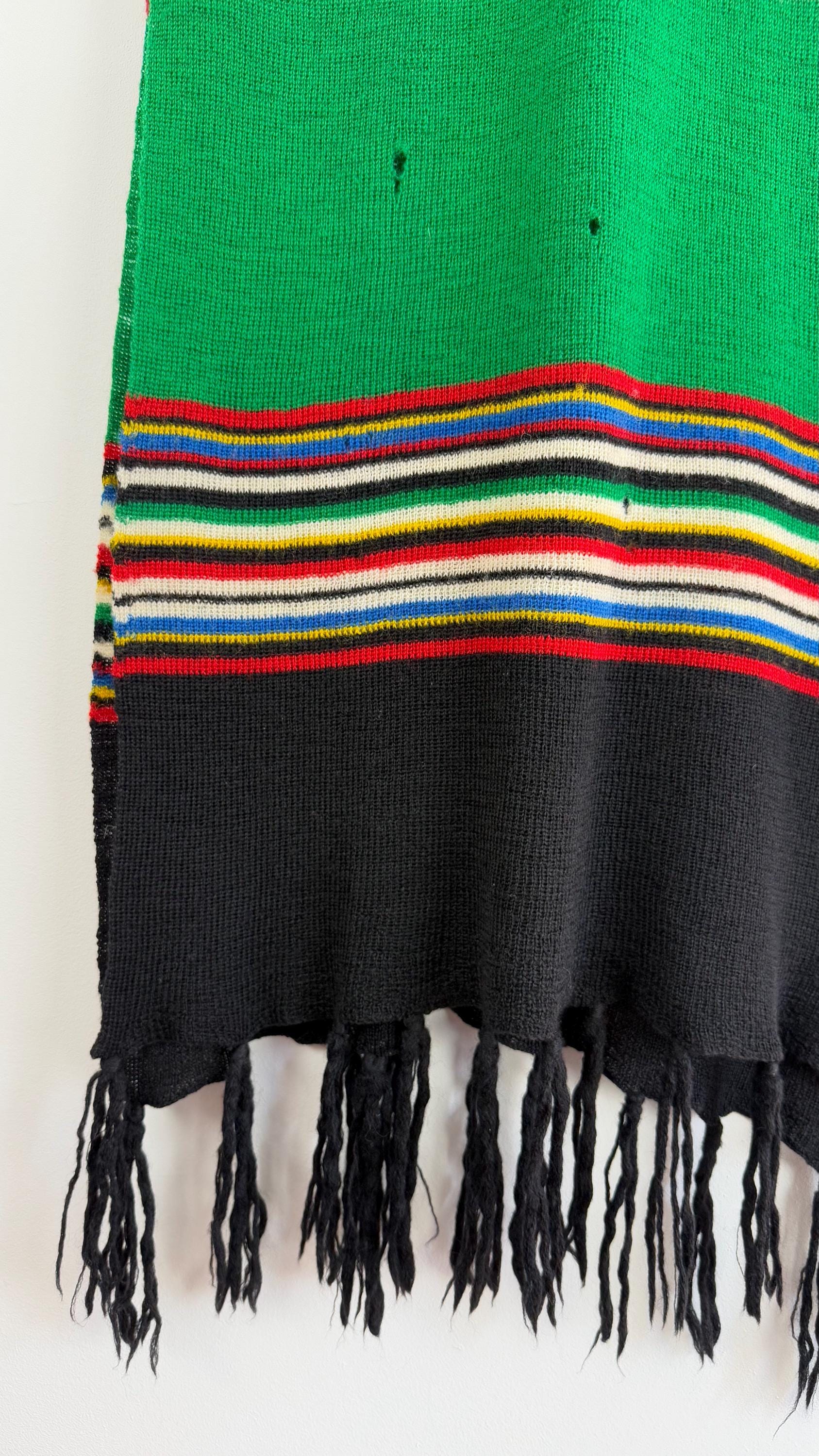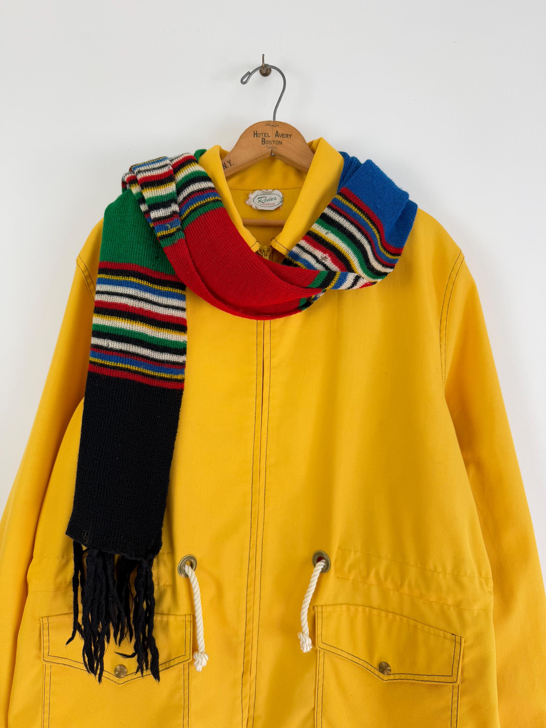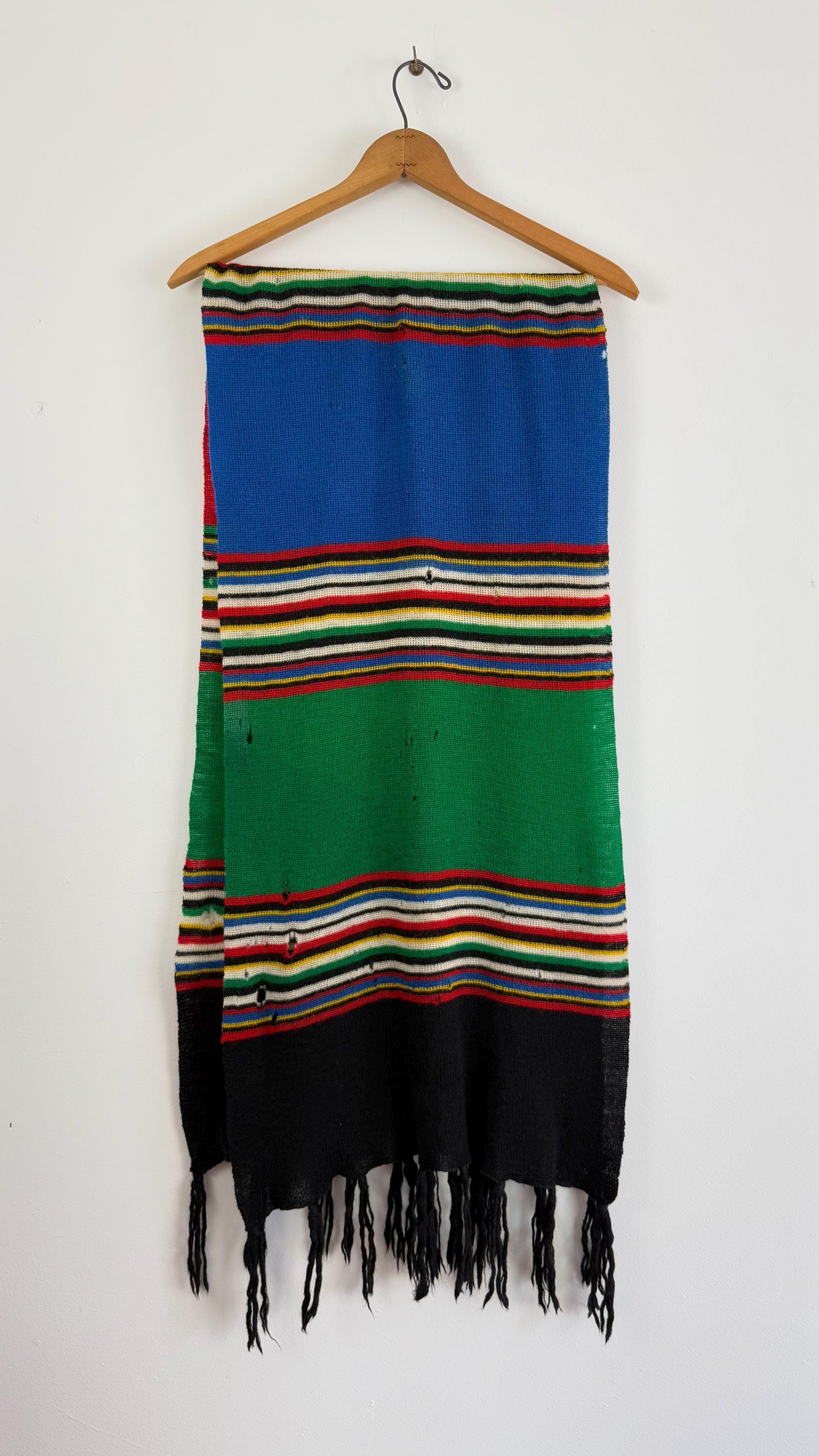 An authentic vintage knitted winter scarf in a multicolor stripe pattern. soft fine yarns. extra long length with fringe. very old knitwear aged to perfection with natural distressing.