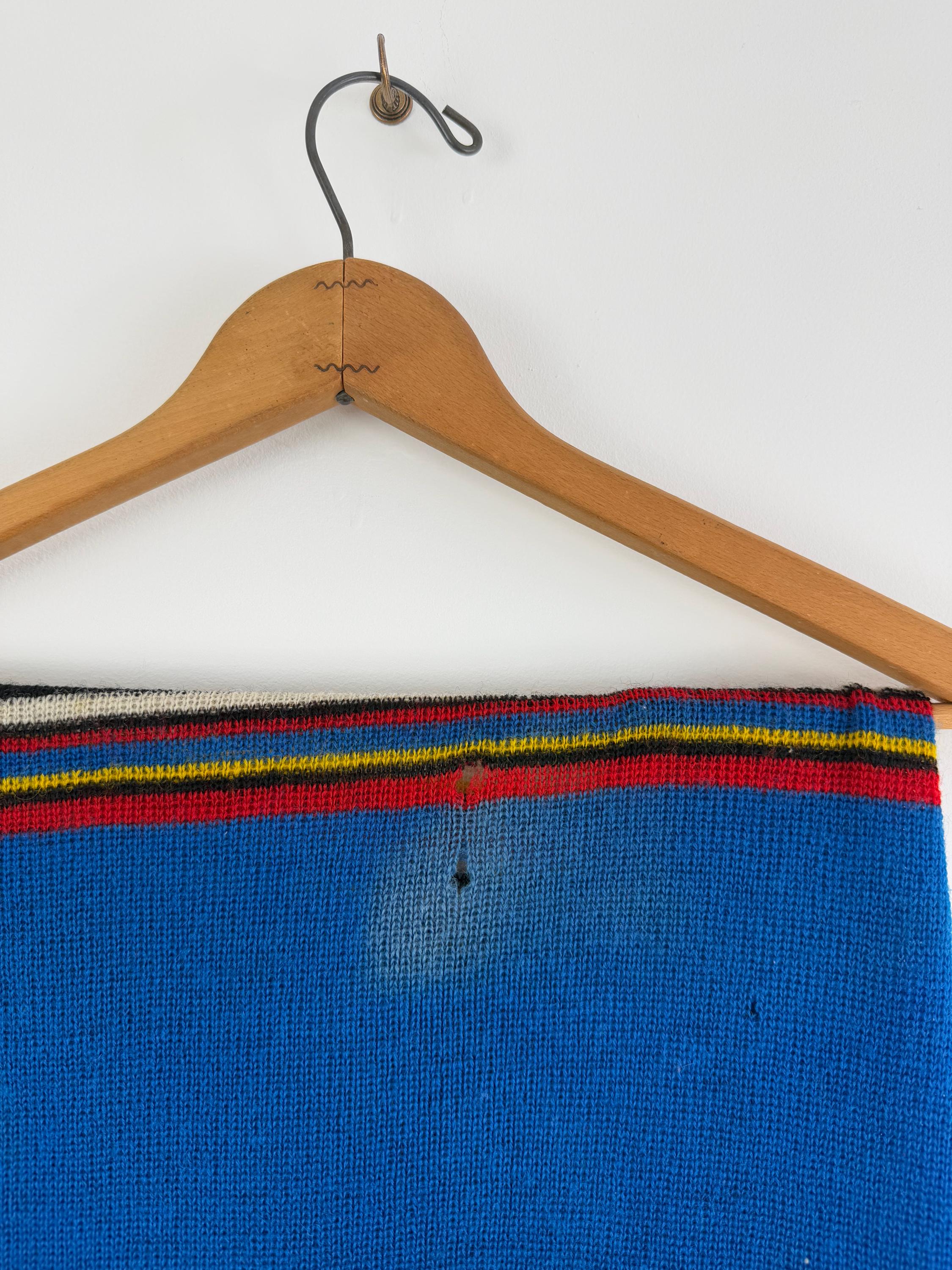condition : distressed, visible signs of age and wear as seen in photos including lots of holes, a faded spot one one side (against the blue), but completely wearable as is