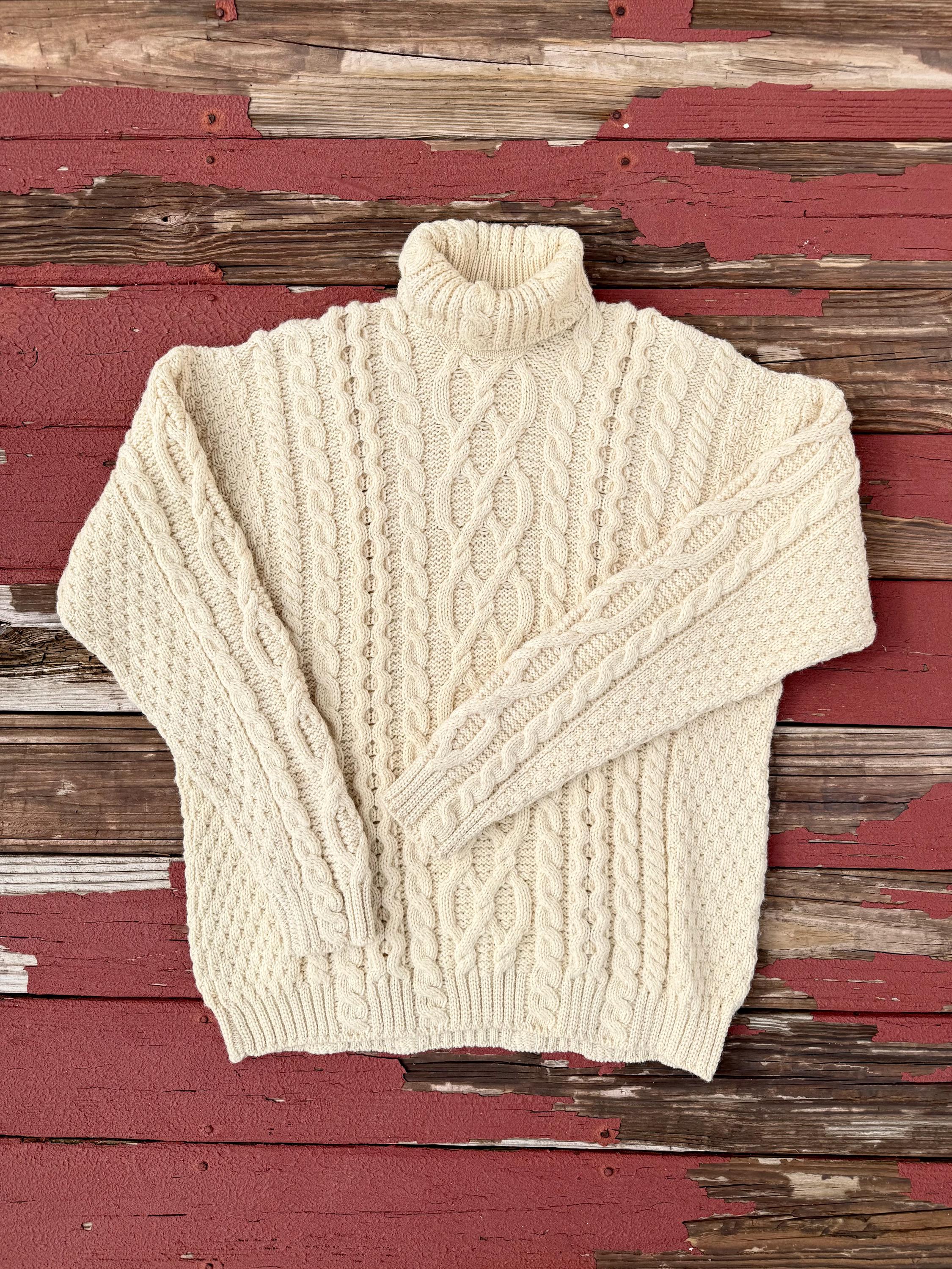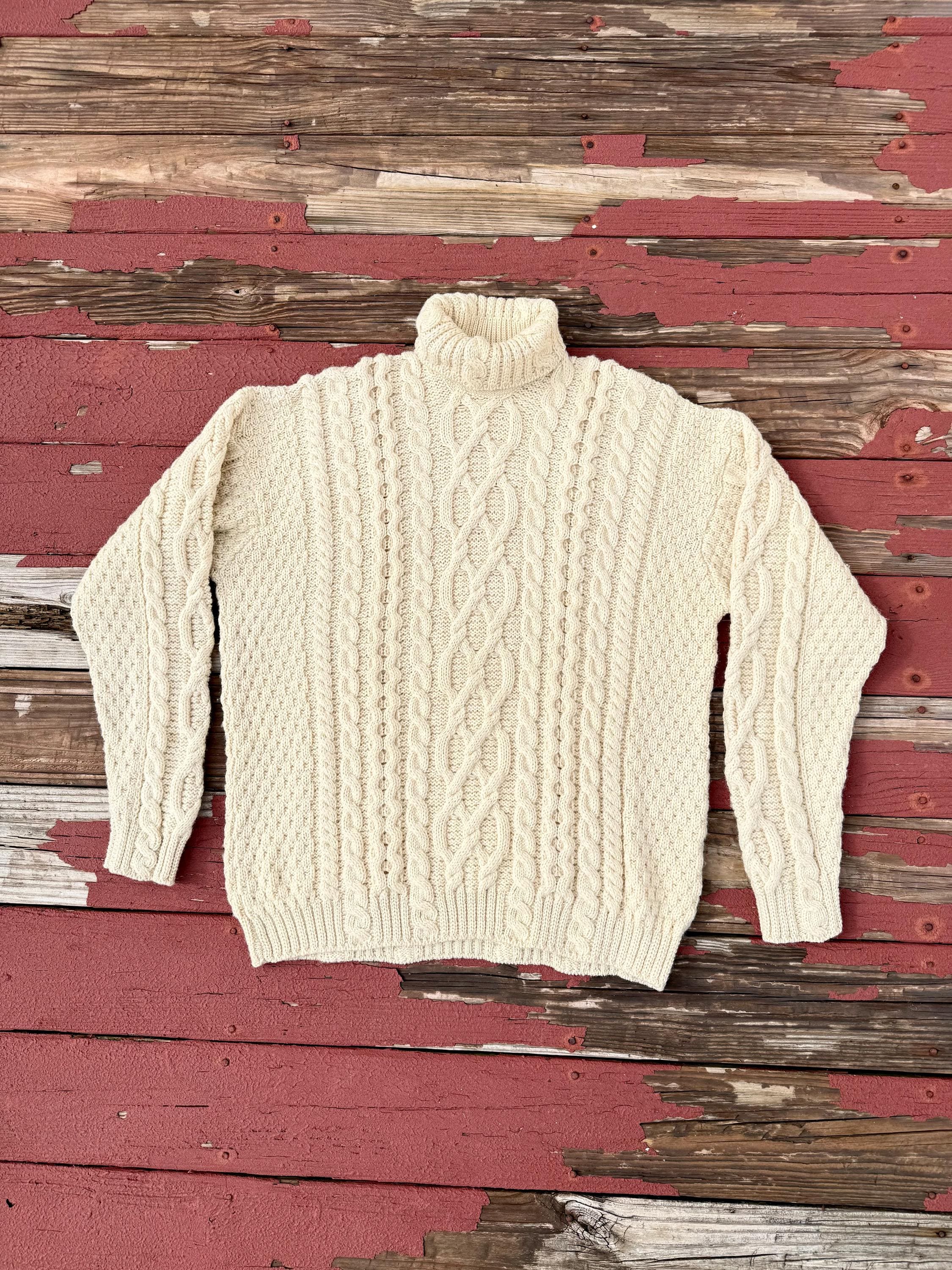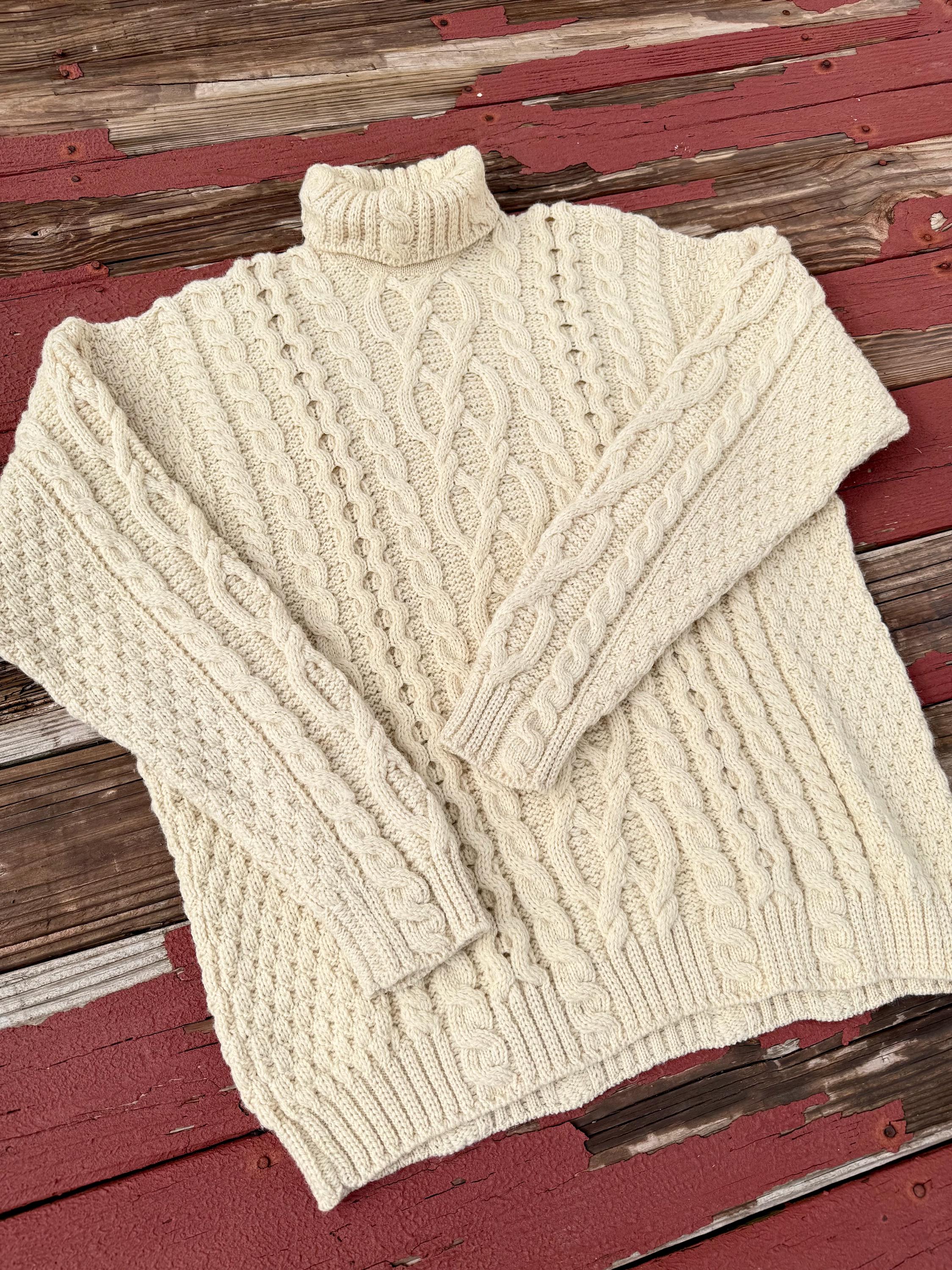 An authentic vintage traditional Irish wool fisherman pullover sweater. turtleneck collar. intricate cable knit pattern. softer & less itchy natural fiber yarns. made in Ireland.