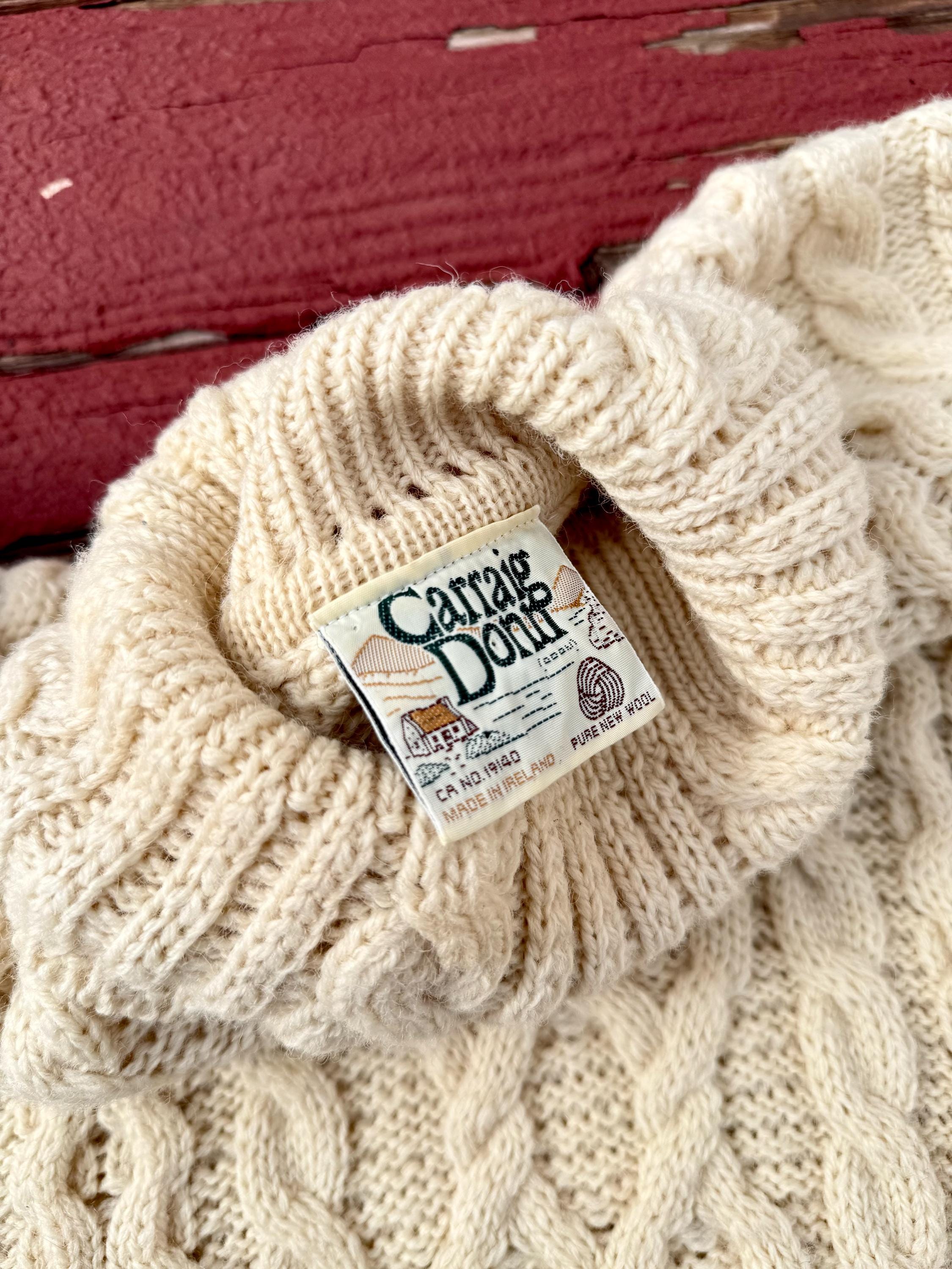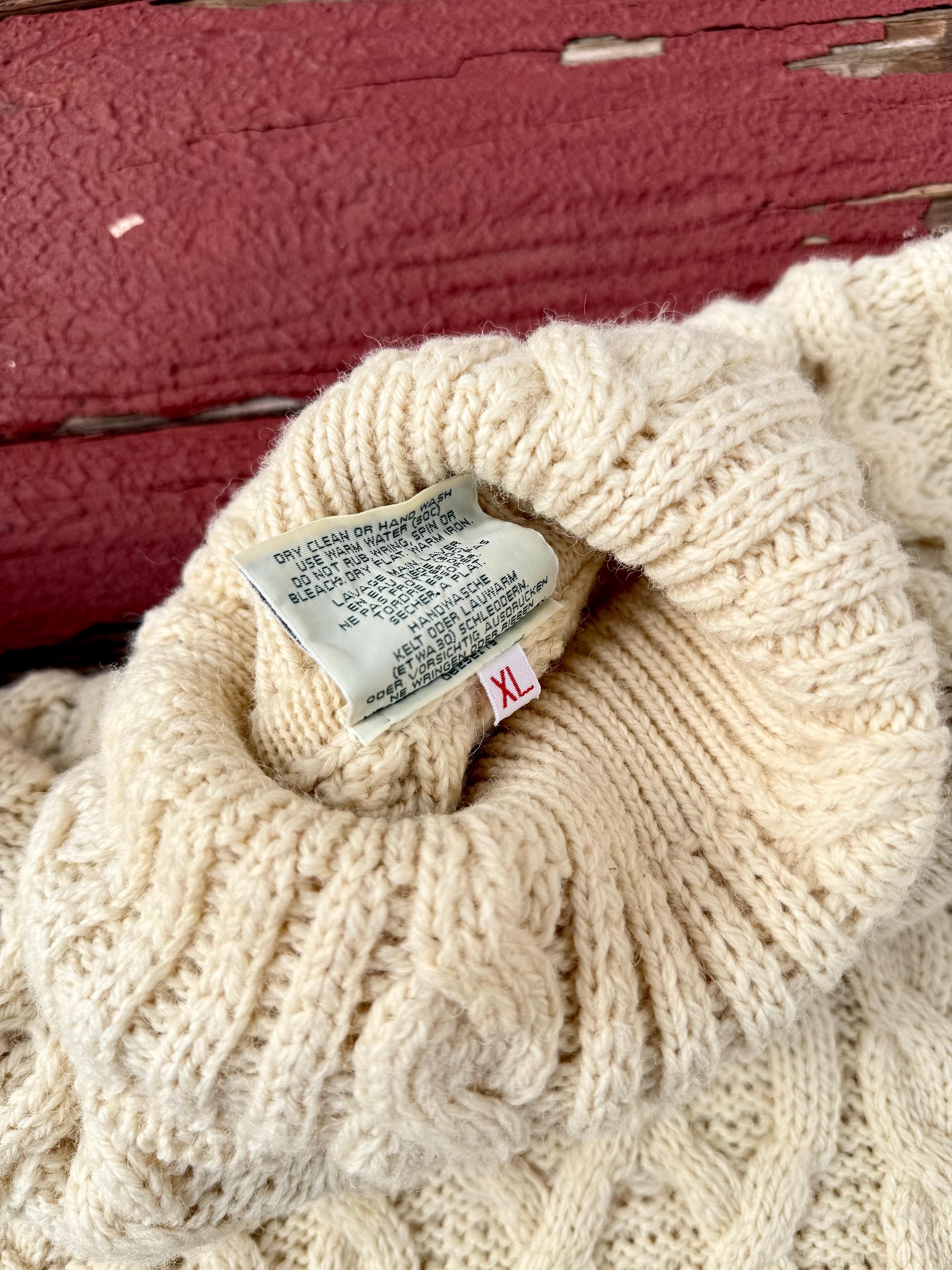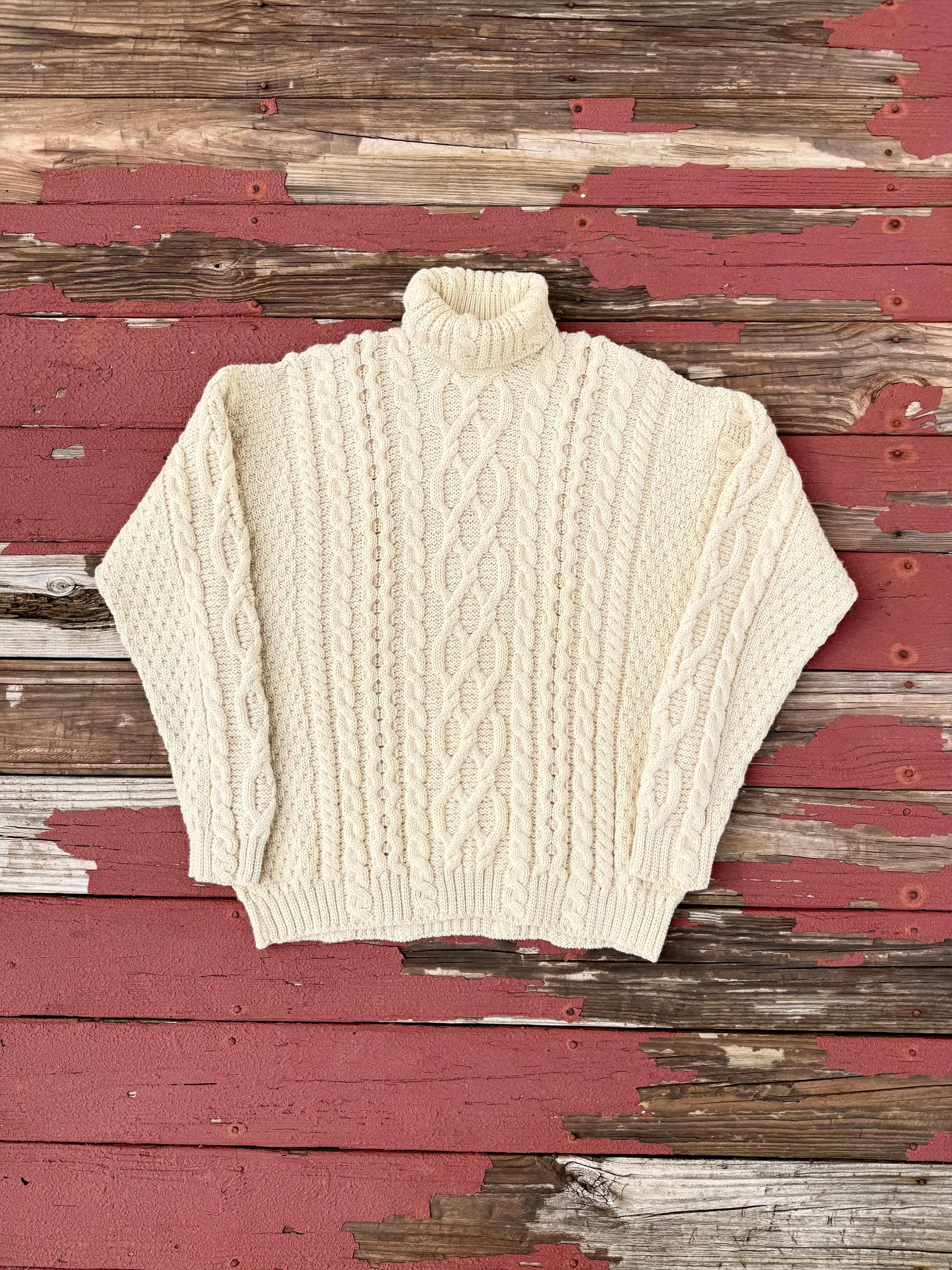 An authentic vintage traditional Irish wool fisherman pullover sweater. turtleneck collar. intricate cable knit pattern. softer & less itchy natural fiber yarns. made in Ireland.