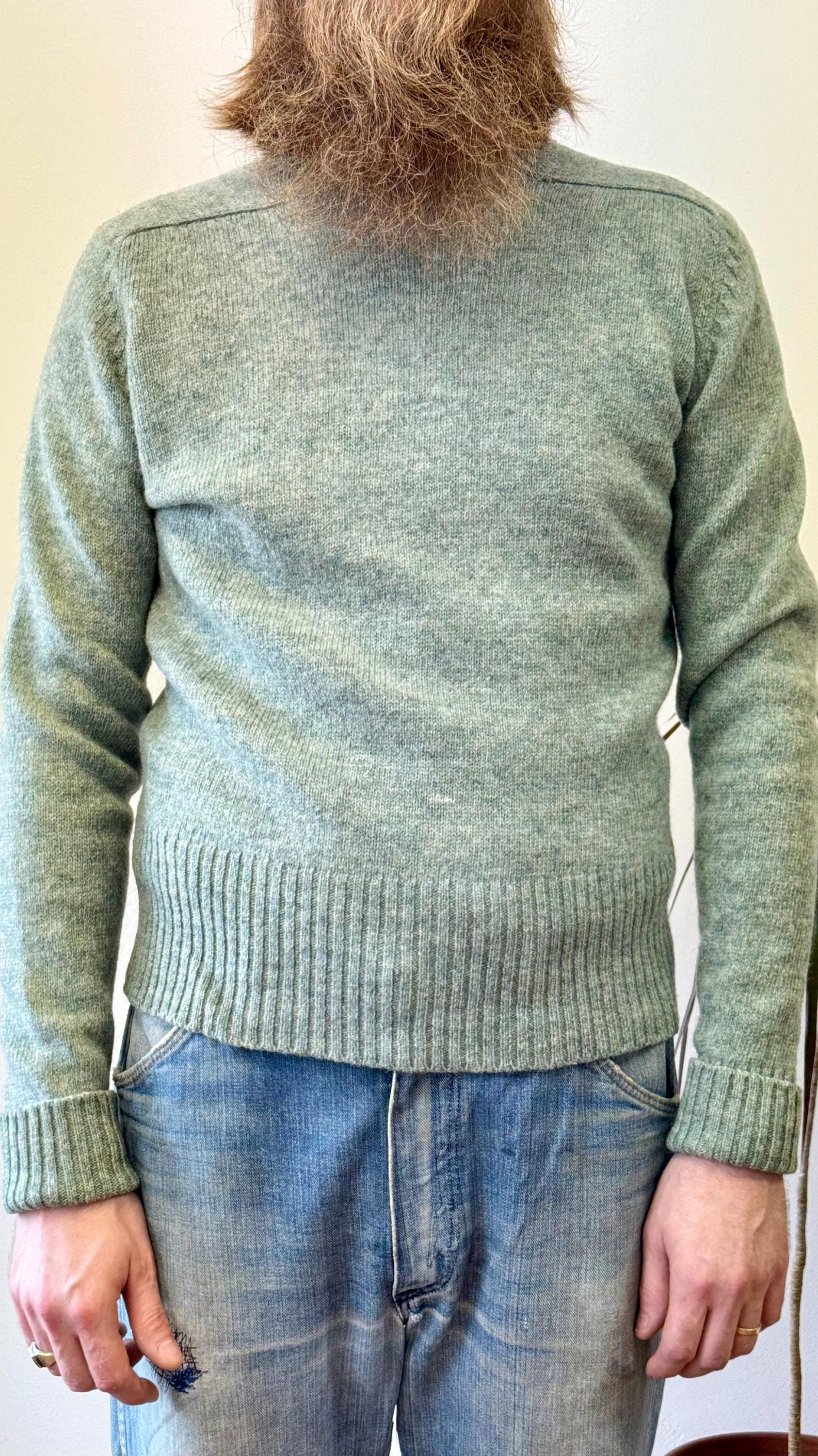 An authentic vintage pullover sweater knit from a shetland wool yarn in a soft green hue. classic crew neckline. long sleeve with folded cuffs. imported. great gender neutral style!