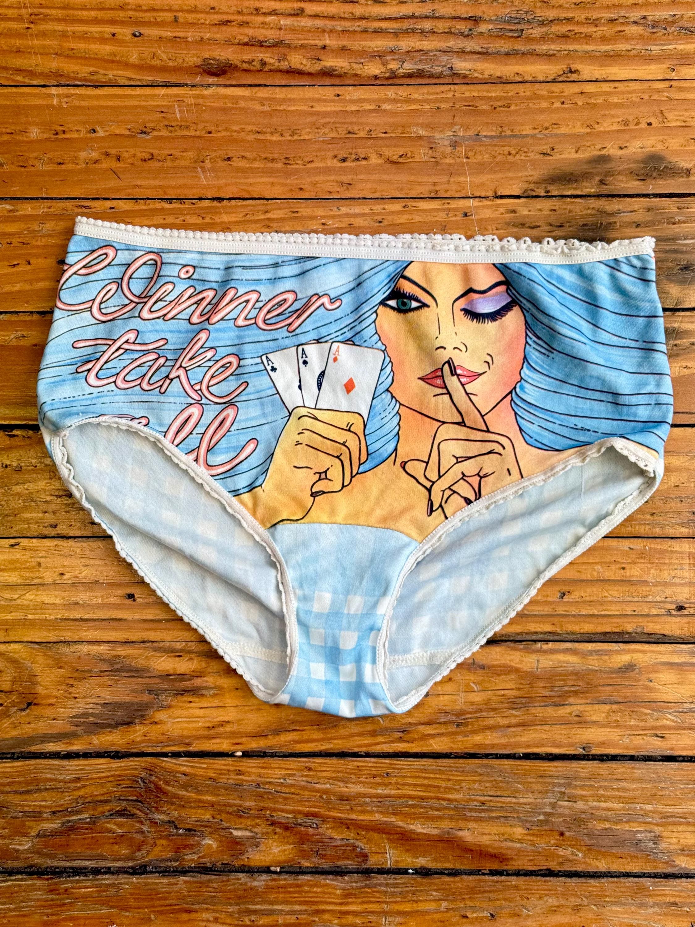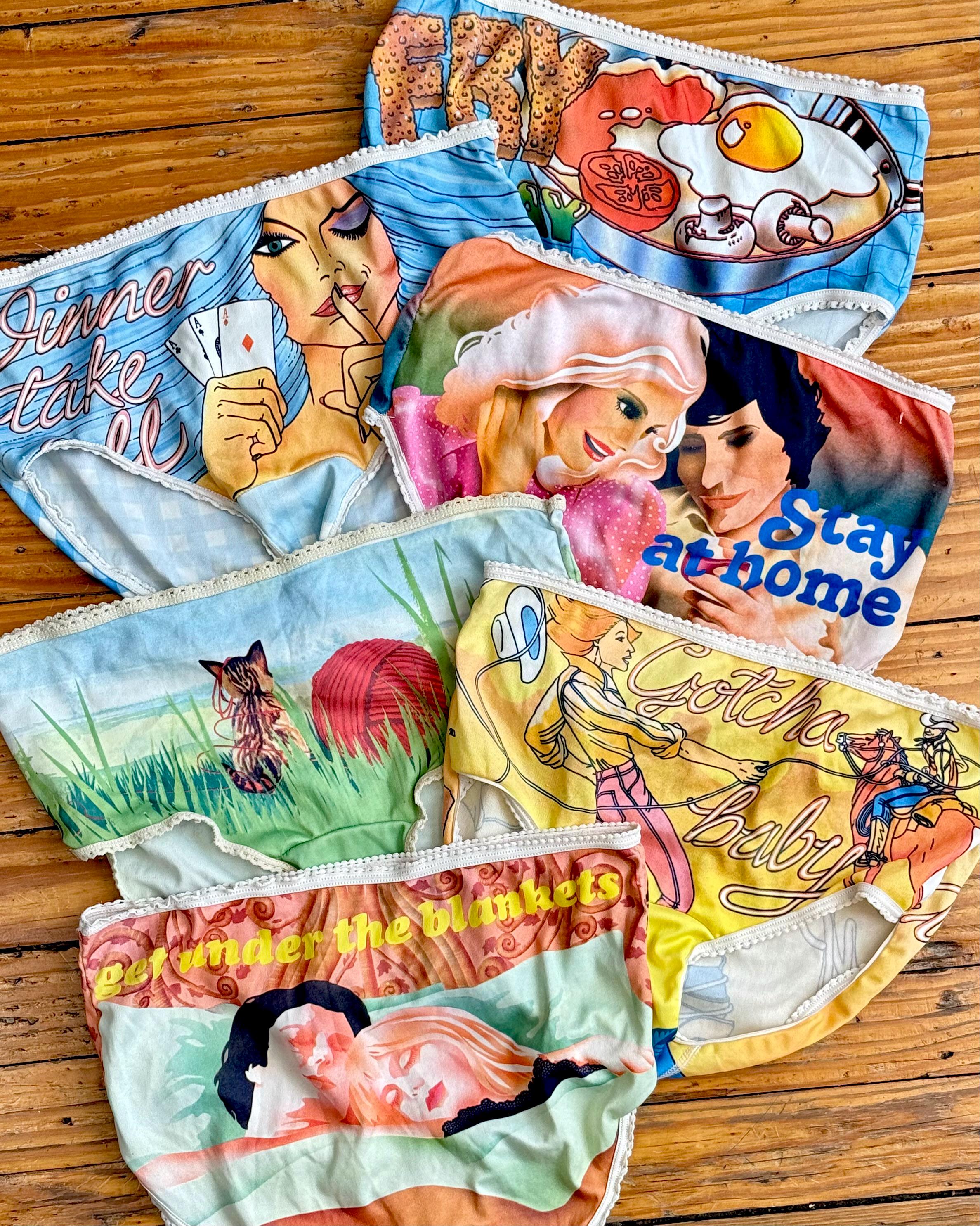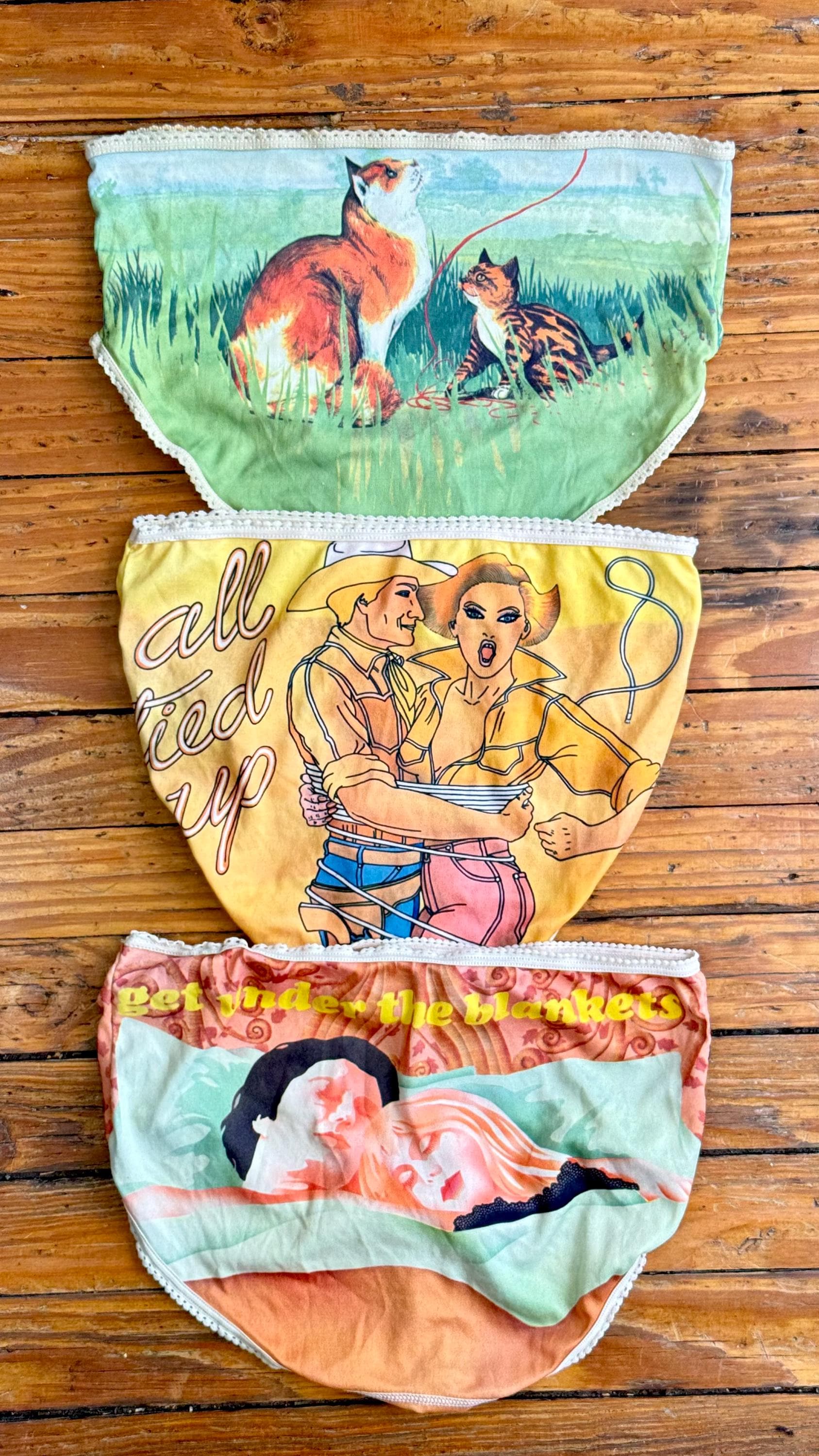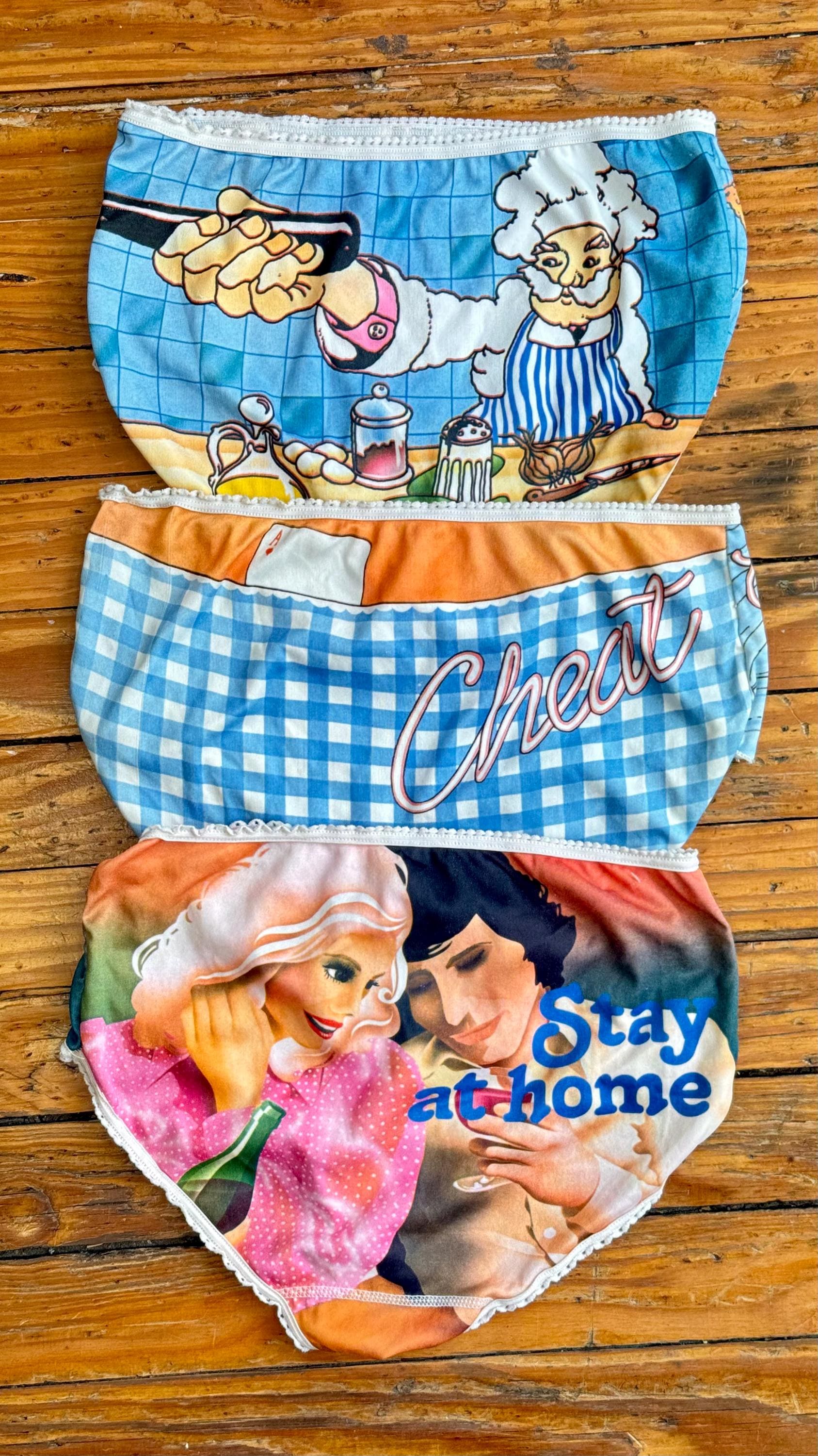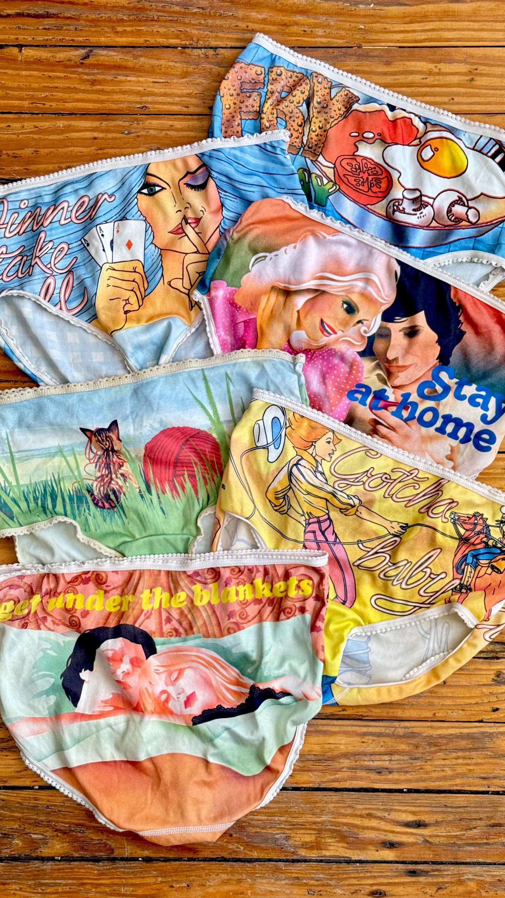 A selection of authentic vintage novelty panties with risqué and funny printed graphics on the front and the back. hipster brief style. stretch fabric with scalloped lace trim.