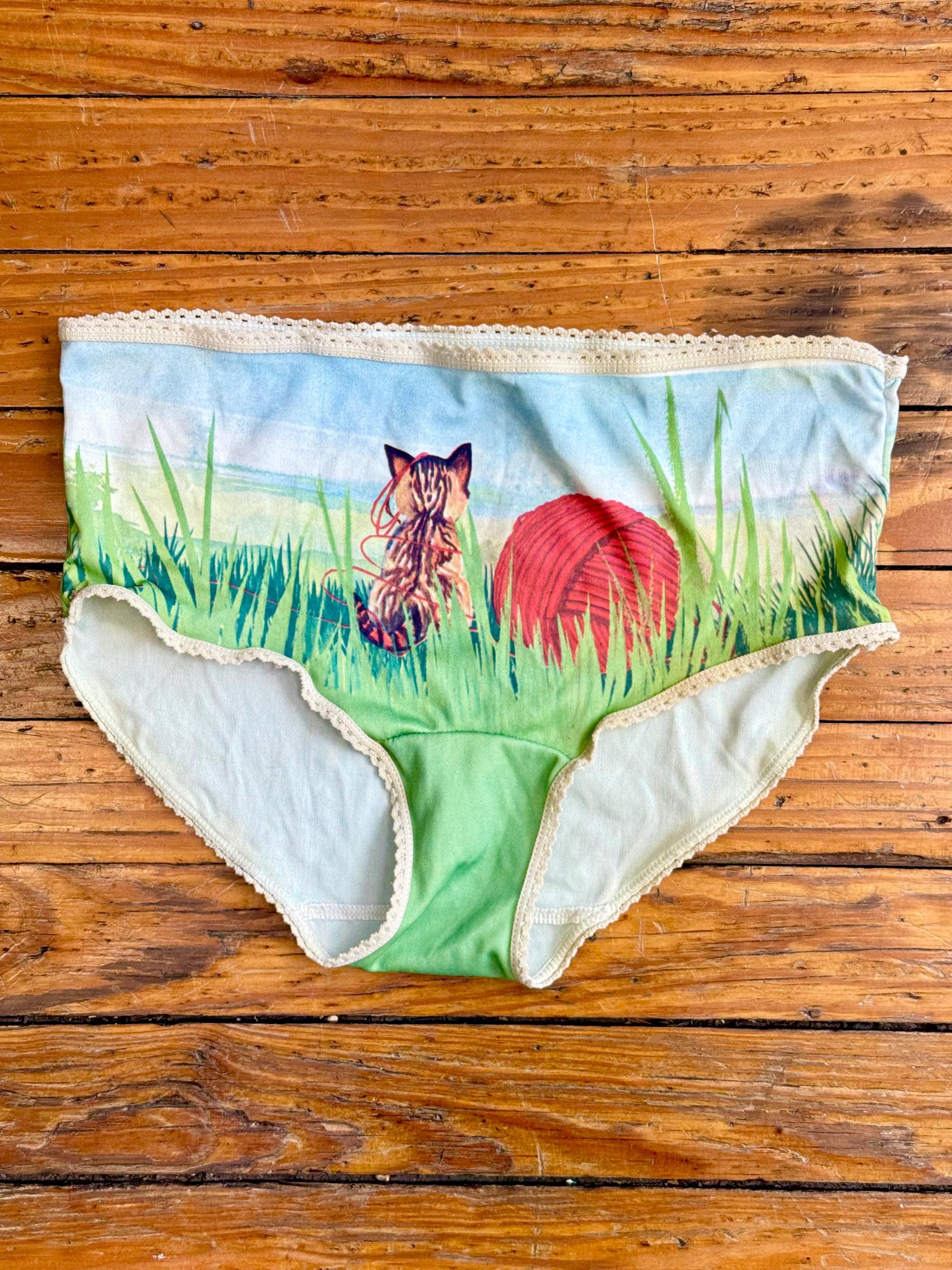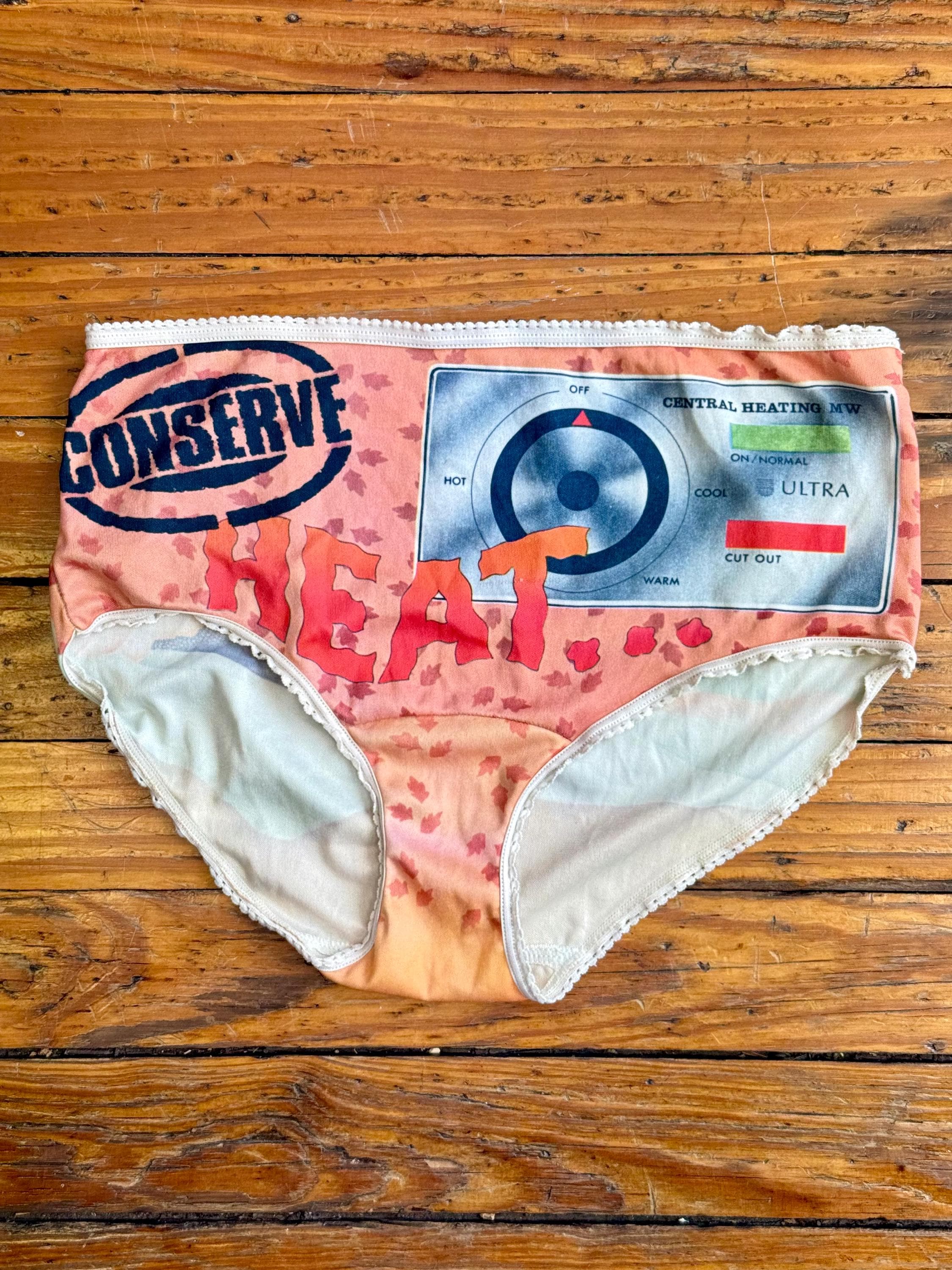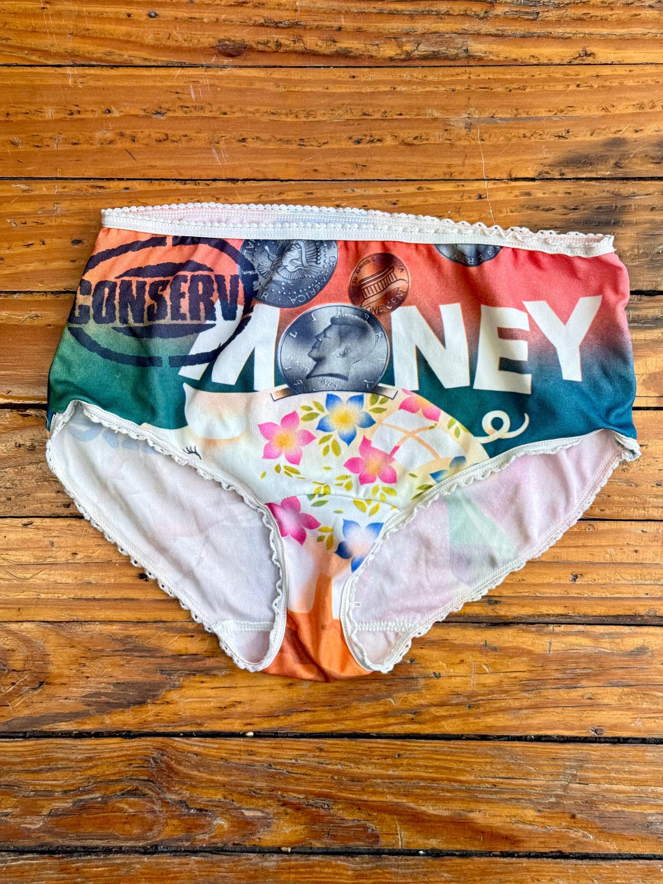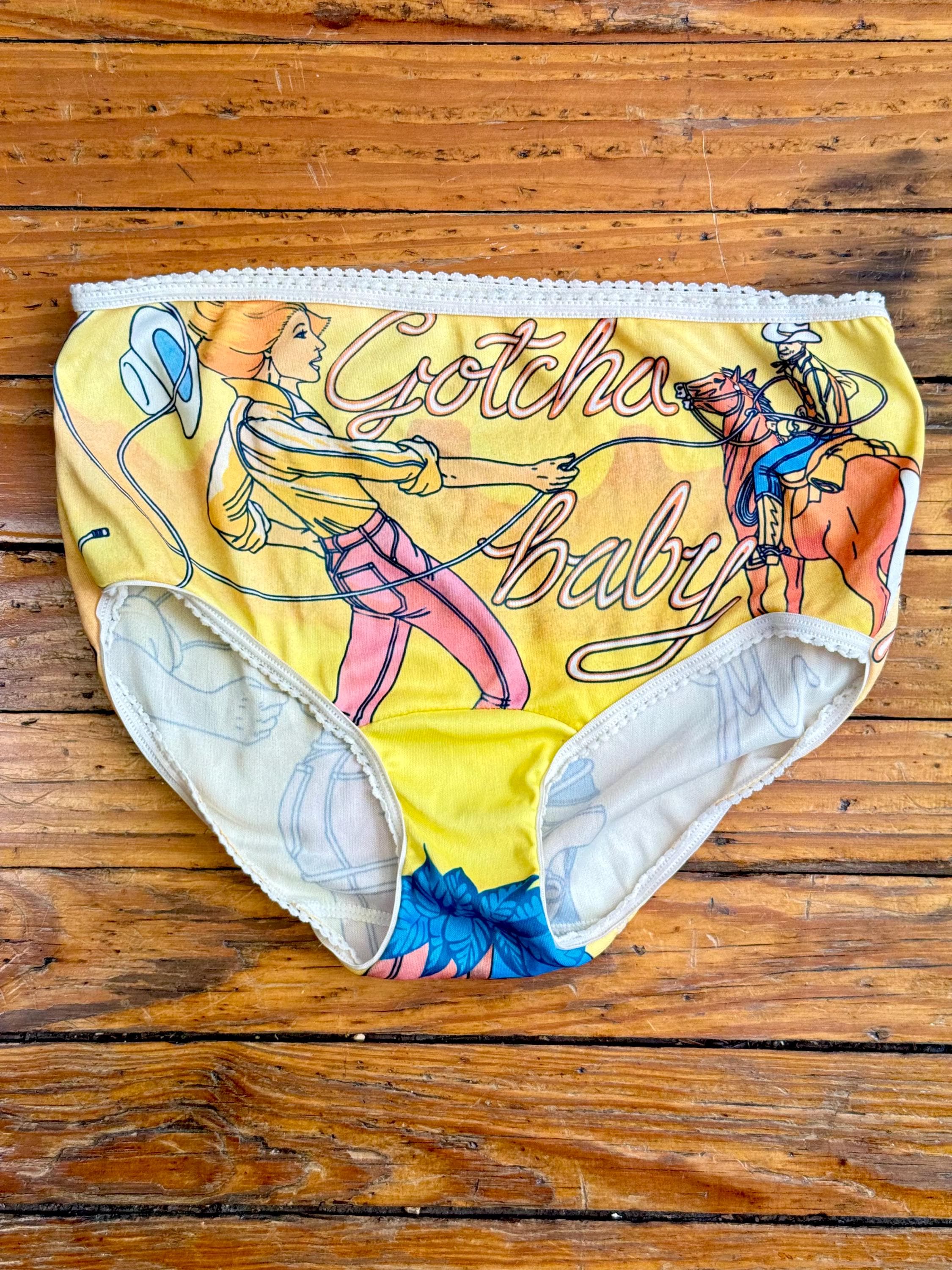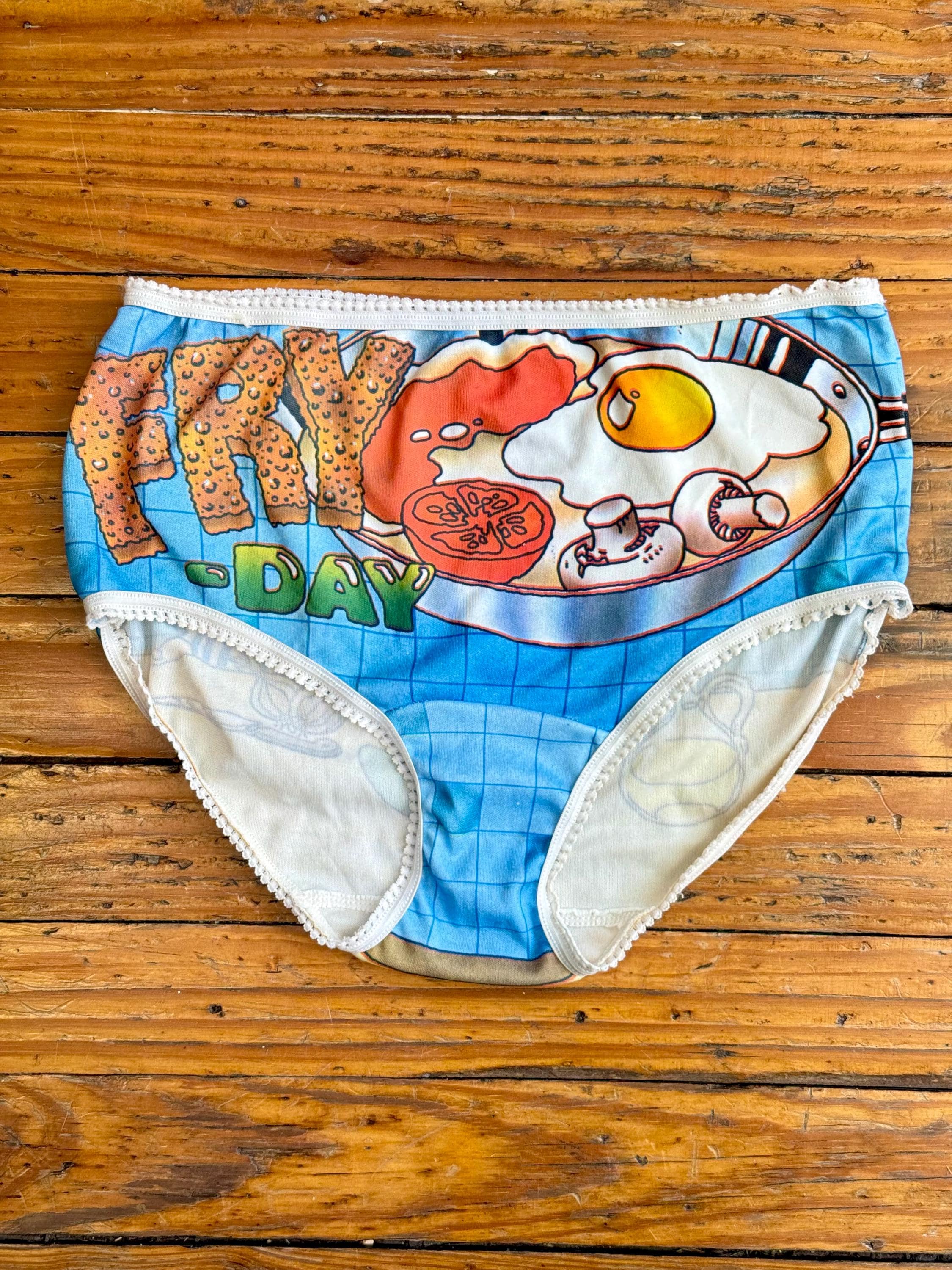 A selection of authentic vintage novelty panties with risqué and funny printed graphics on the front and the back. hipster brief style. stretch fabric with scalloped lace trim.