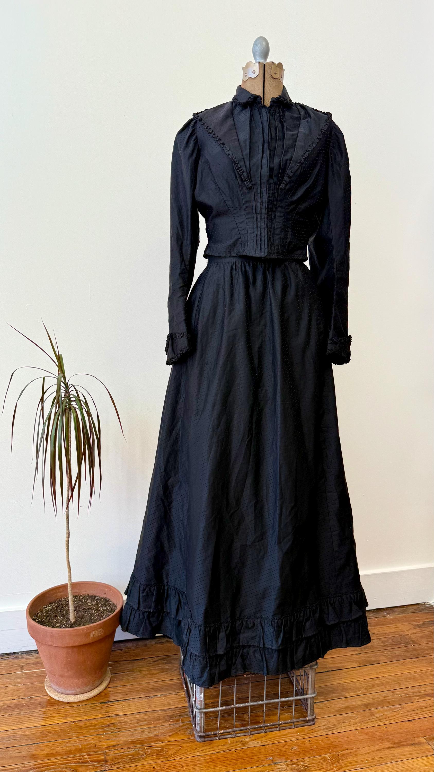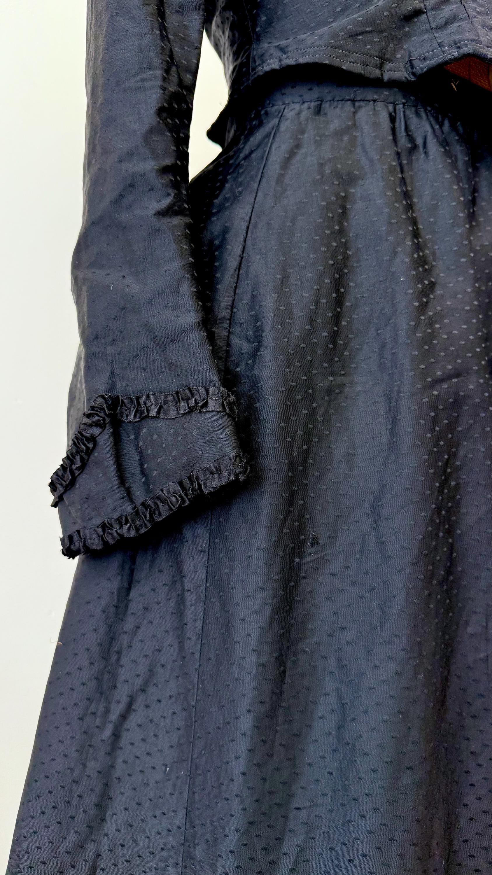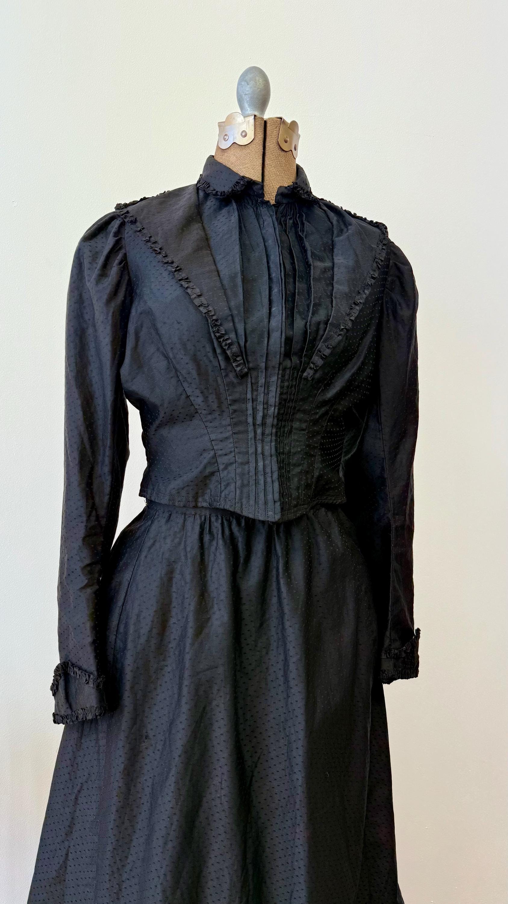 An authentic antique blouse and skirt set in all black, usually worn when mourning. it has a beautiful design made with a luxurious dotted cotton sateen “dobby” woven fabric with ruffled ribbon trim. the blouse fastens up the front with hook and eye fasteners. the full skirt with heavy lining hooks at the waist.