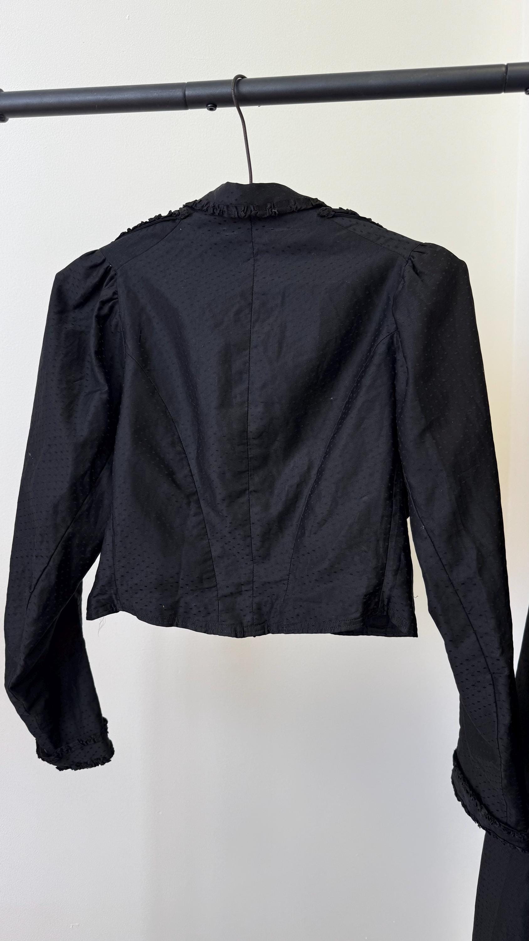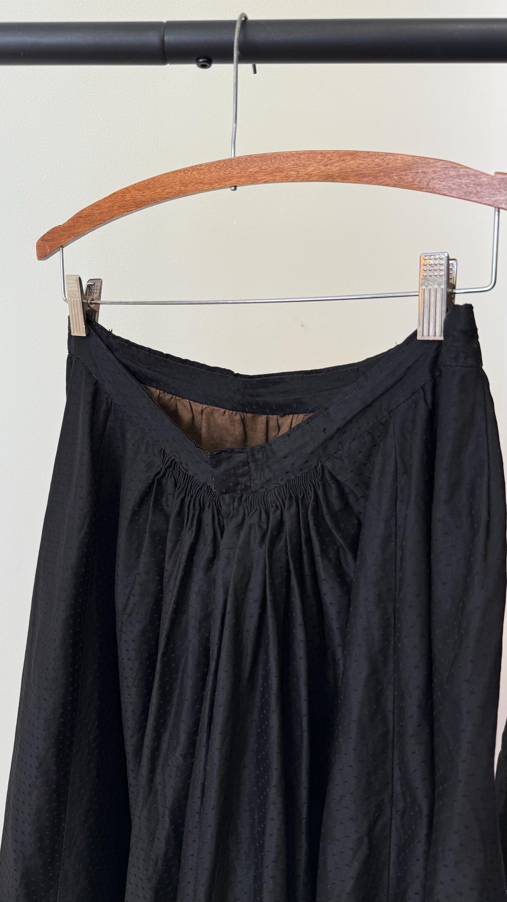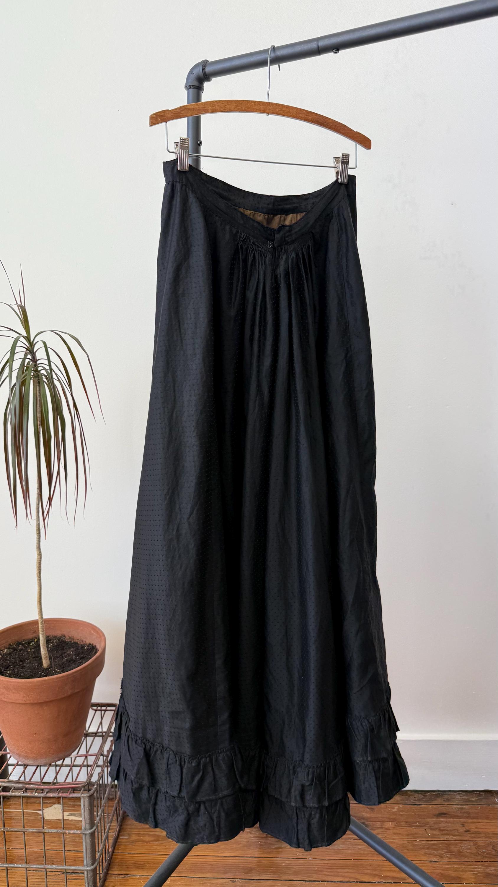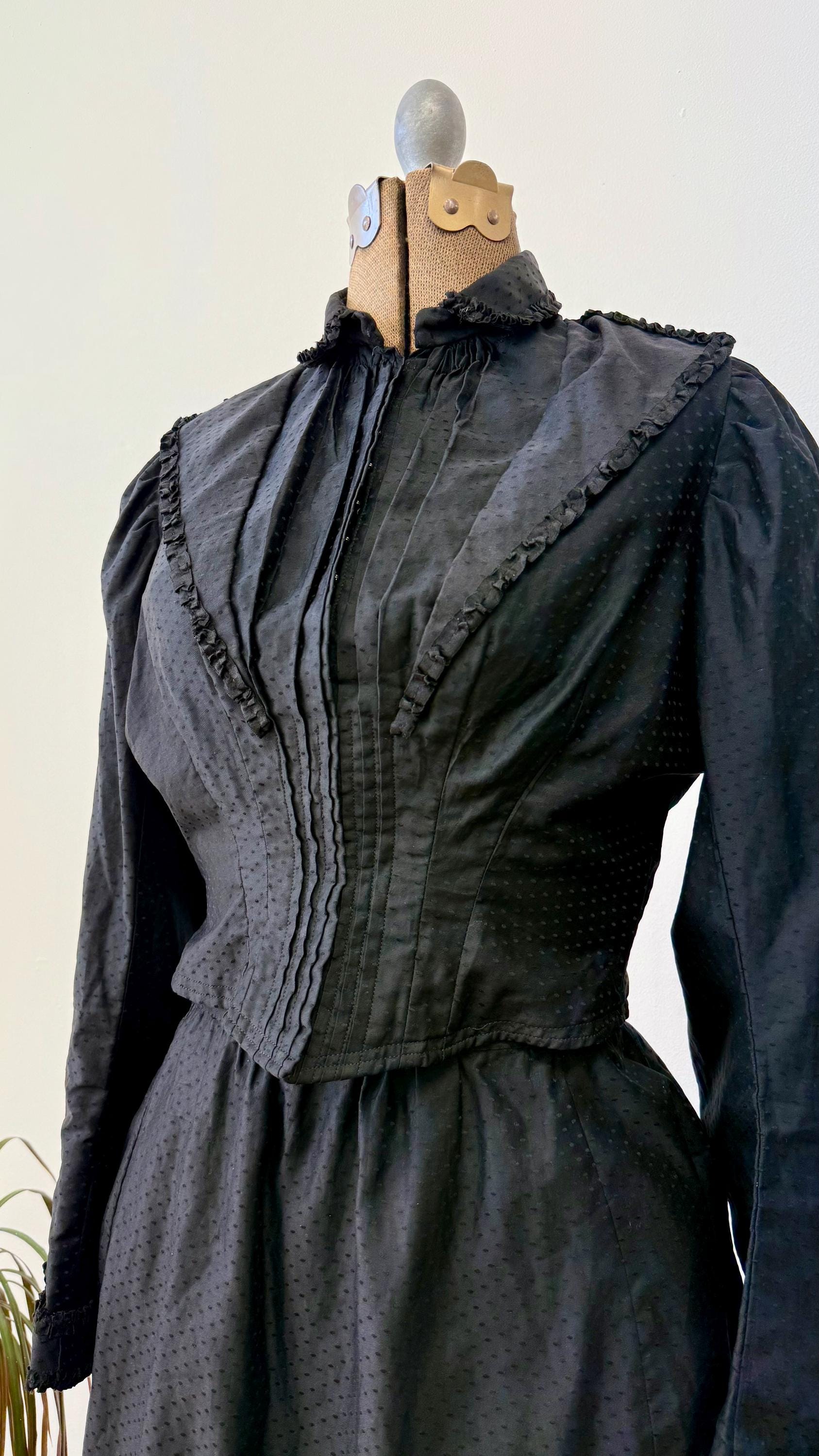 An authentic antique blouse and skirt set in all black, usually worn when mourning. it has a beautiful design made with a luxurious dotted cotton sateen “dobby” woven fabric with ruffled ribbon trim. the blouse fastens up the front with hook and eye fasteners. the full skirt with heavy lining hooks at the waist.