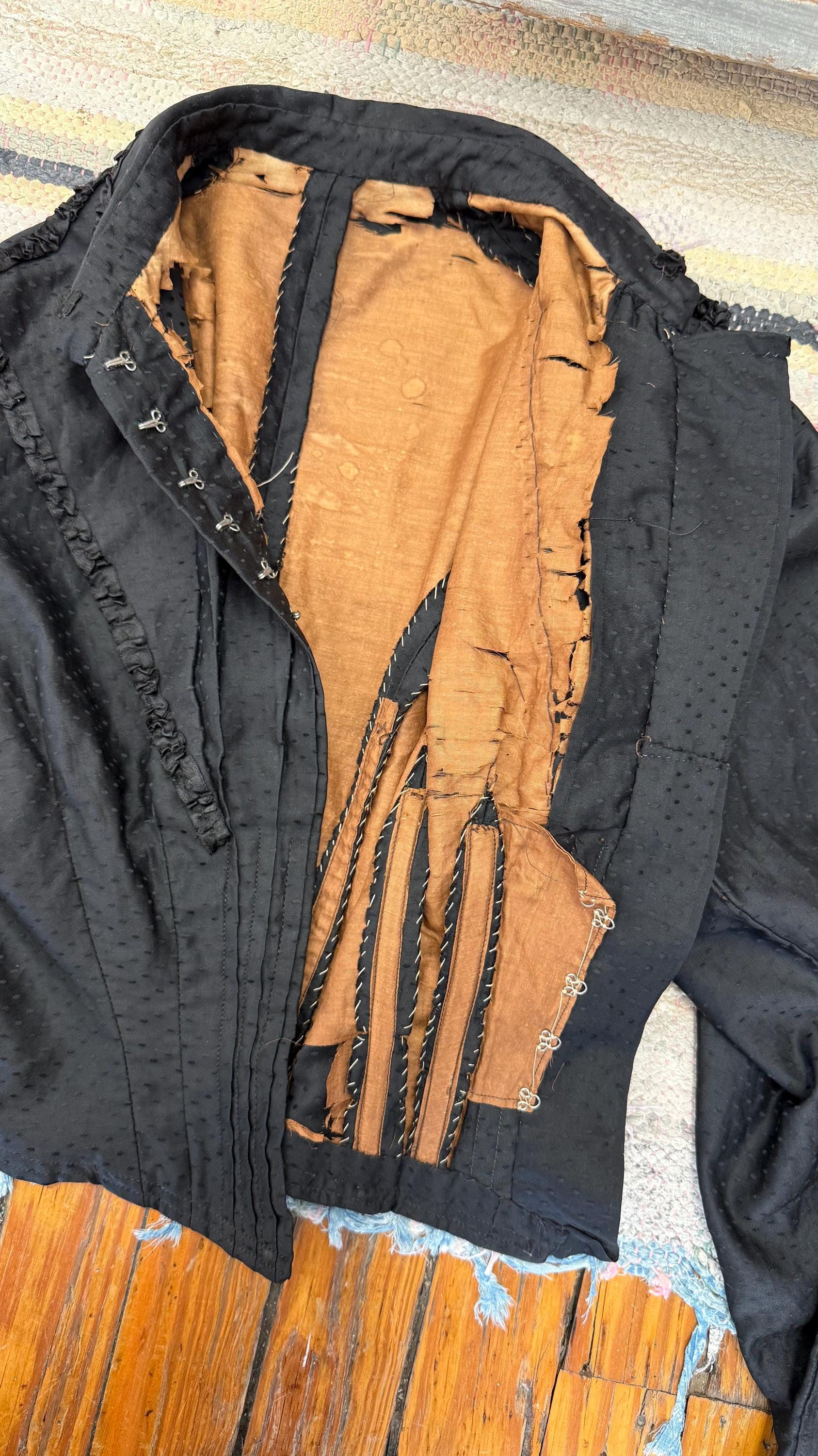 condition : AS FOUND with imperfections. garment overall is in great shape for over 100 years old but does shows some common signs of aging and storage wear such as the blouses lining is completely shattered and deteriorating as shown in photos with most of the boning missing, we would recommend removing the lining completely as it really isn’t structurally necessary anymore (we decided to leave it in case the buyer wanted to review its construction for any future possible restoration). garment has been steam cleaned but a light odor may remain. there is few other small original repairs also pictured.