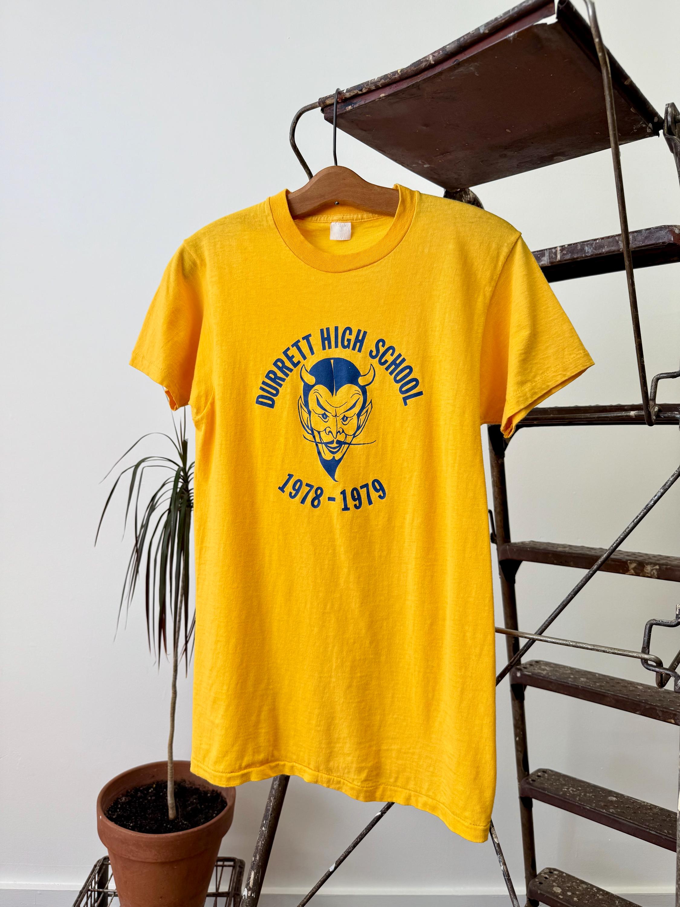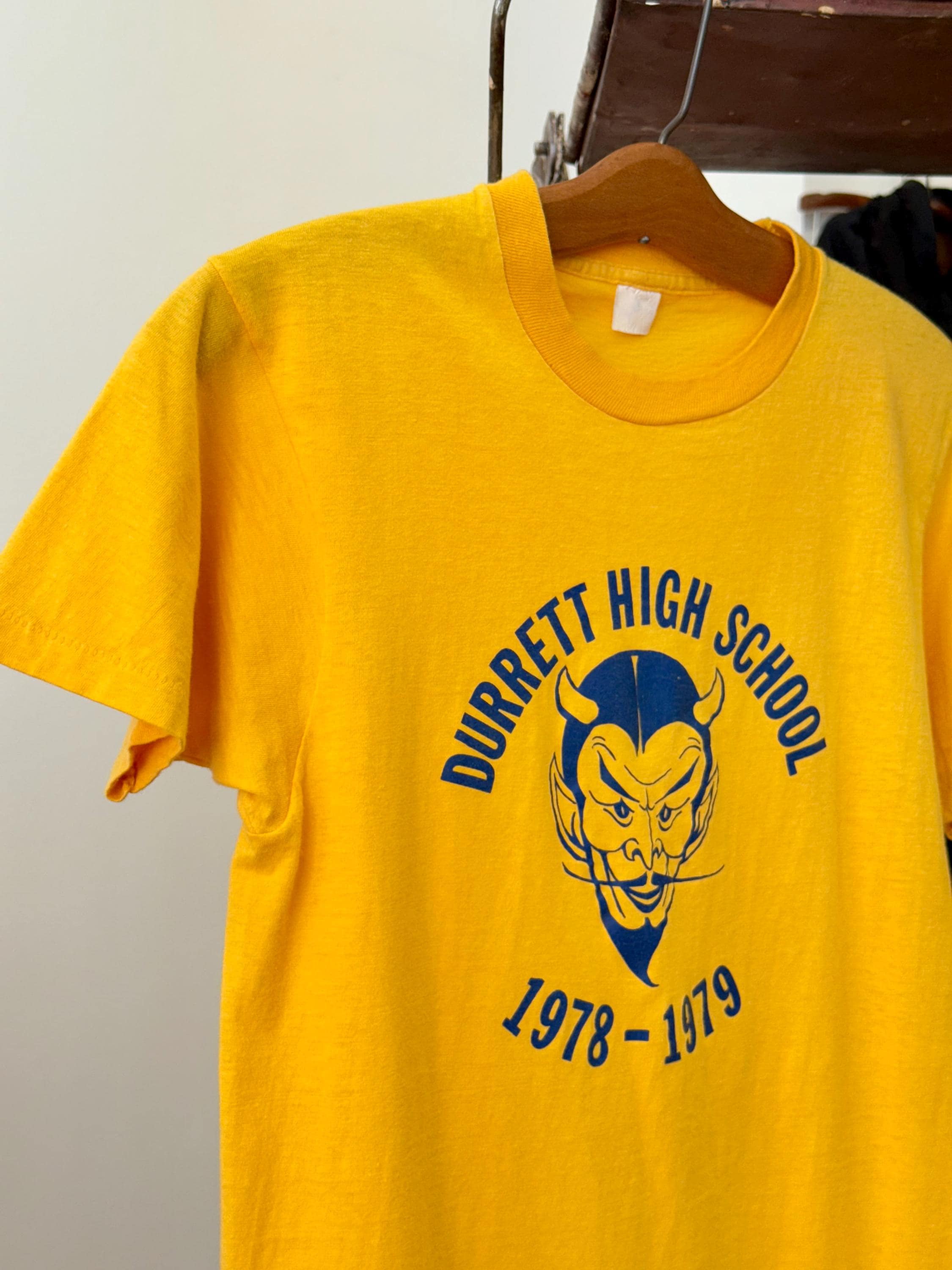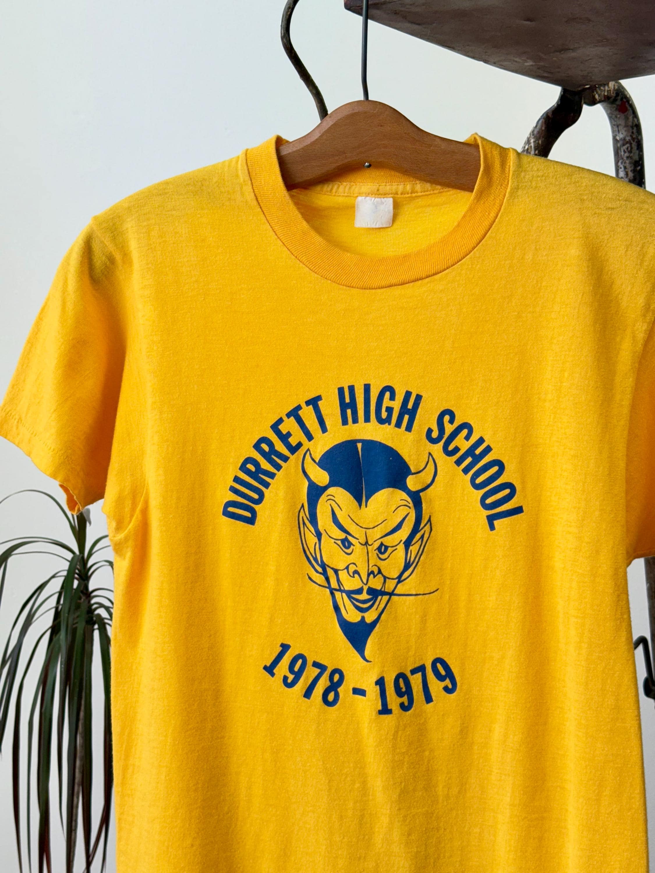 An authentic vintage t shirt featuring a Blue Devil mascot graphic from Durrett High School of Louisville, KY (they were actually the Blue Demons but this phil gives more of a devilish vibe). a soft and gently worn tee. label is no longer legible. made in USA
