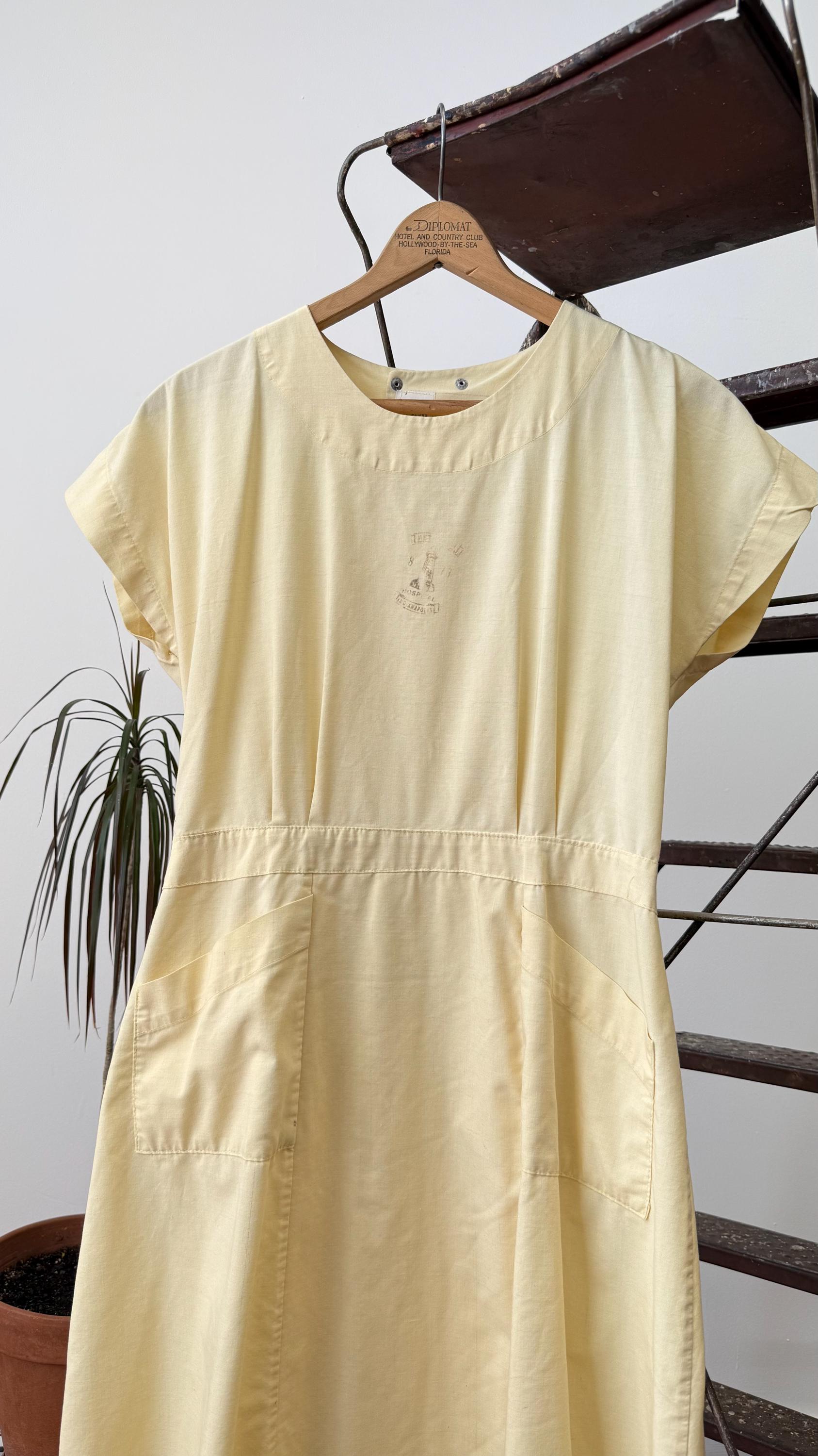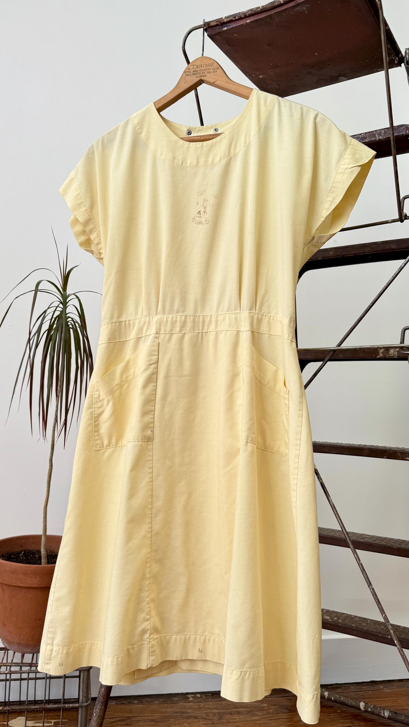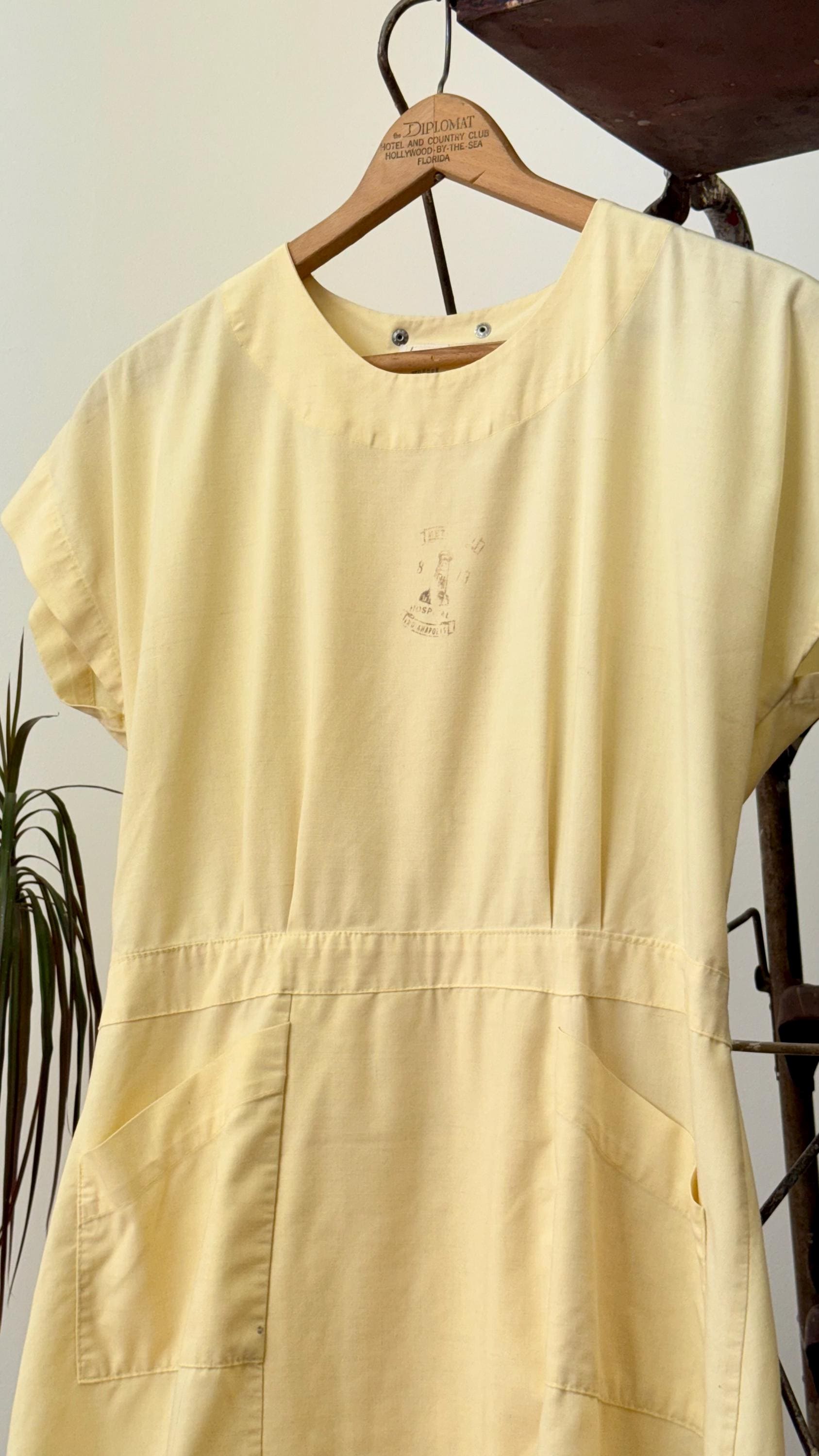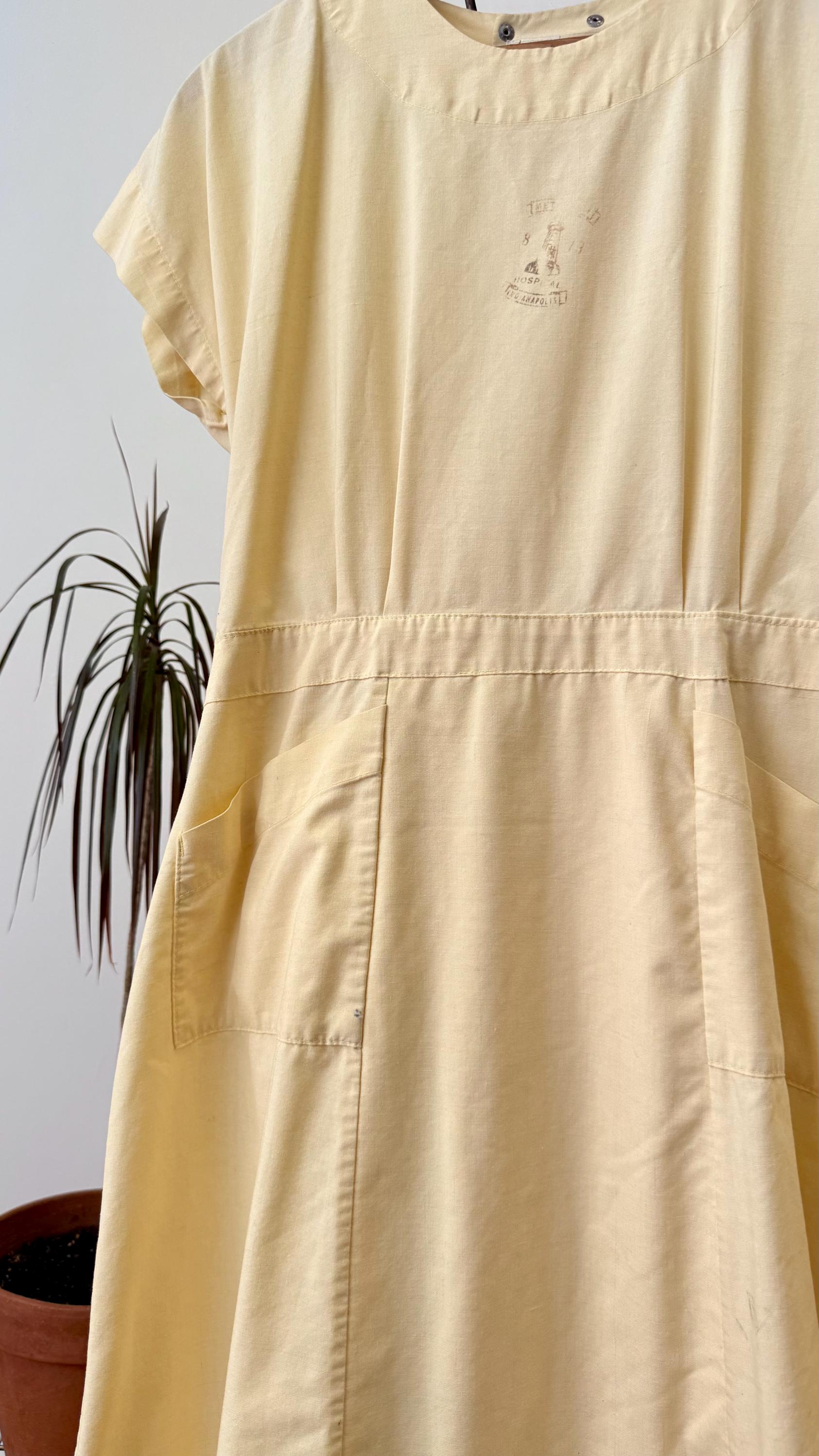 An authentic vintage dress. Originally a nurse’s smock that wraps and snaps around the back. The design has a fitted waistline and an A-line skirt with pockets. a small graphic for Indianapolis Hospital is centered on the chest. made by Angelica, a women’s workwear label.
