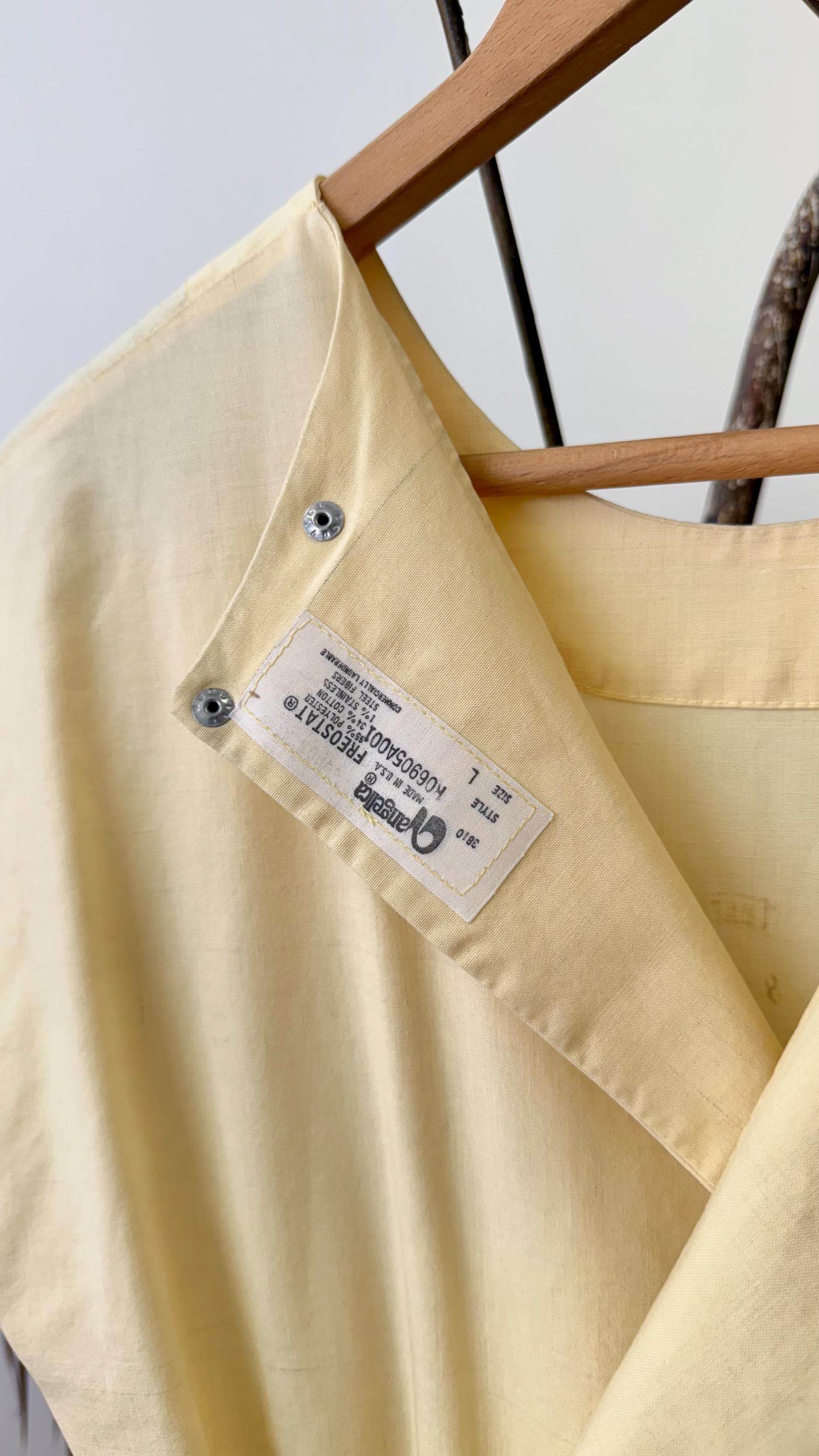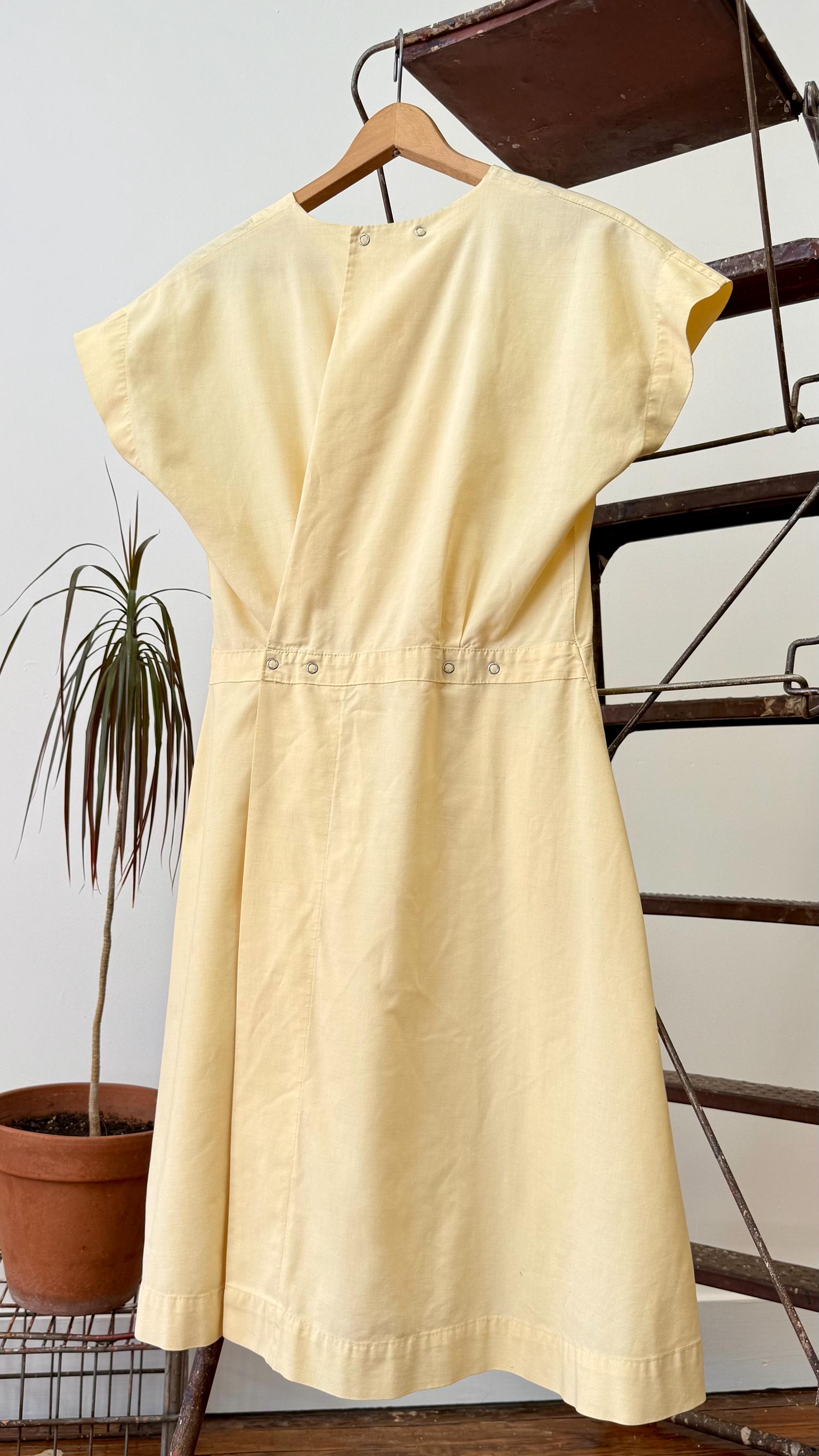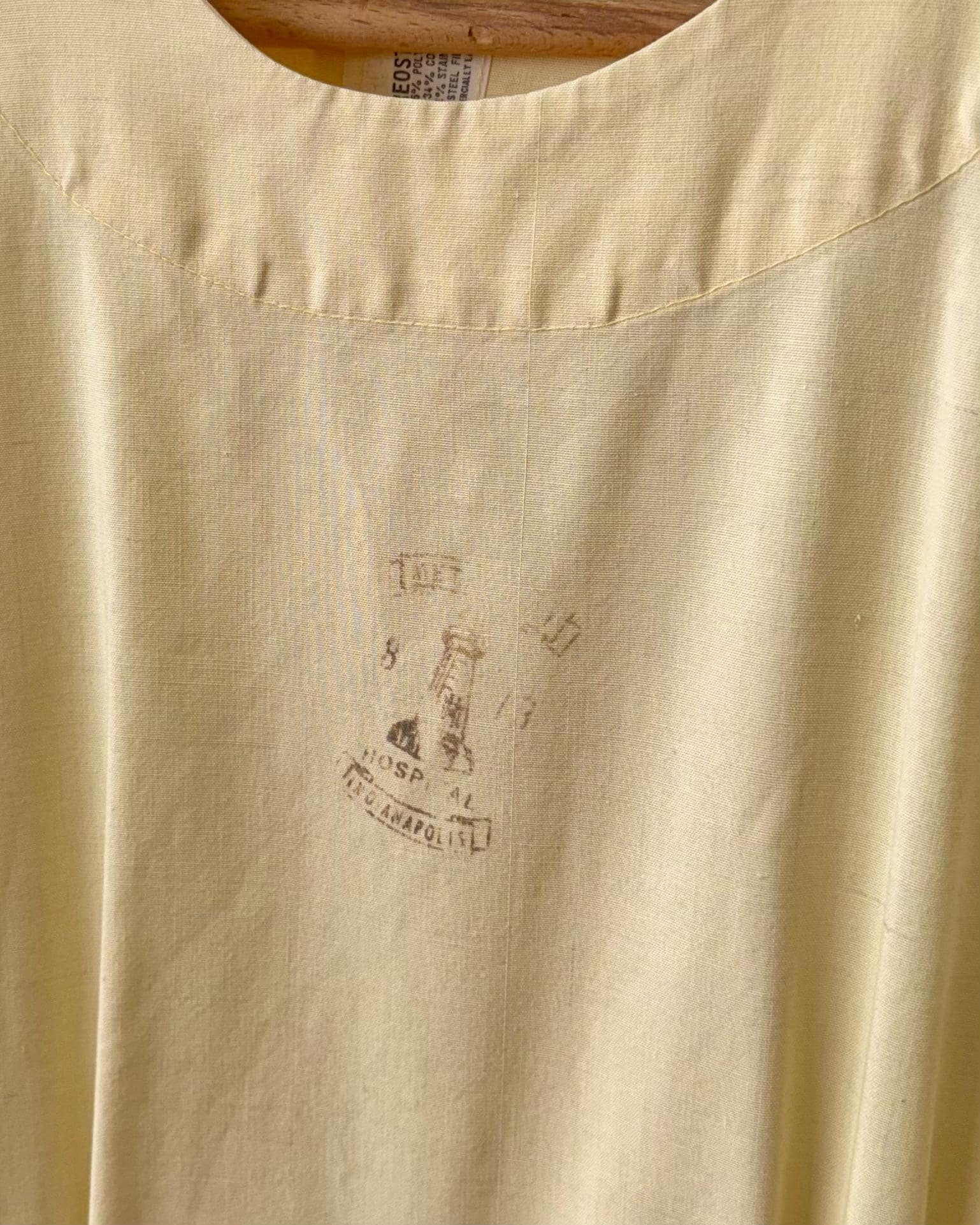 An authentic vintage dress. Originally a nurse’s smock that wraps and snaps around the back. The design has a fitted waistline and an A-line skirt with pockets. a small graphic for Indianapolis Hospital is centered on the chest. made by Angelica, a women’s workwear label.