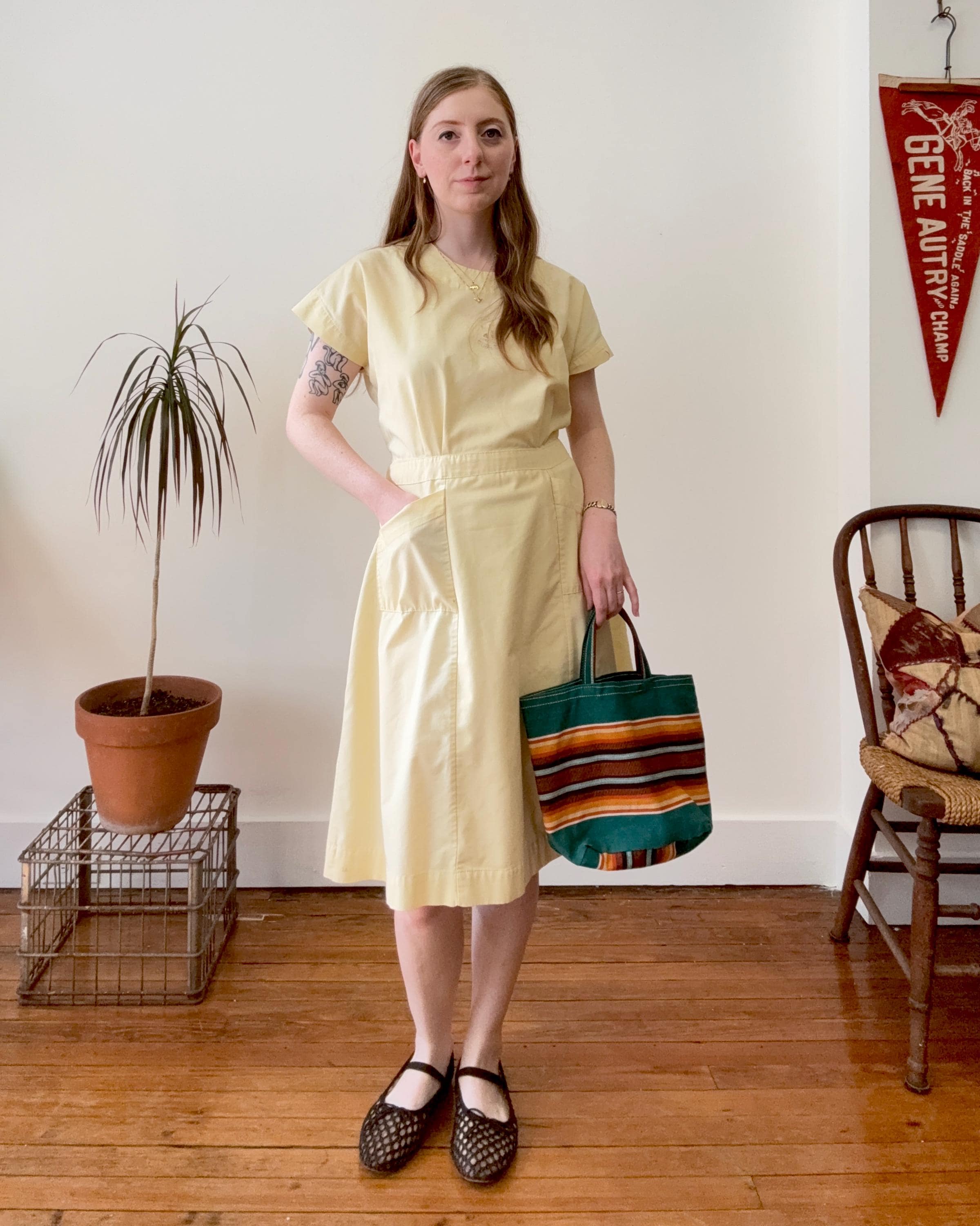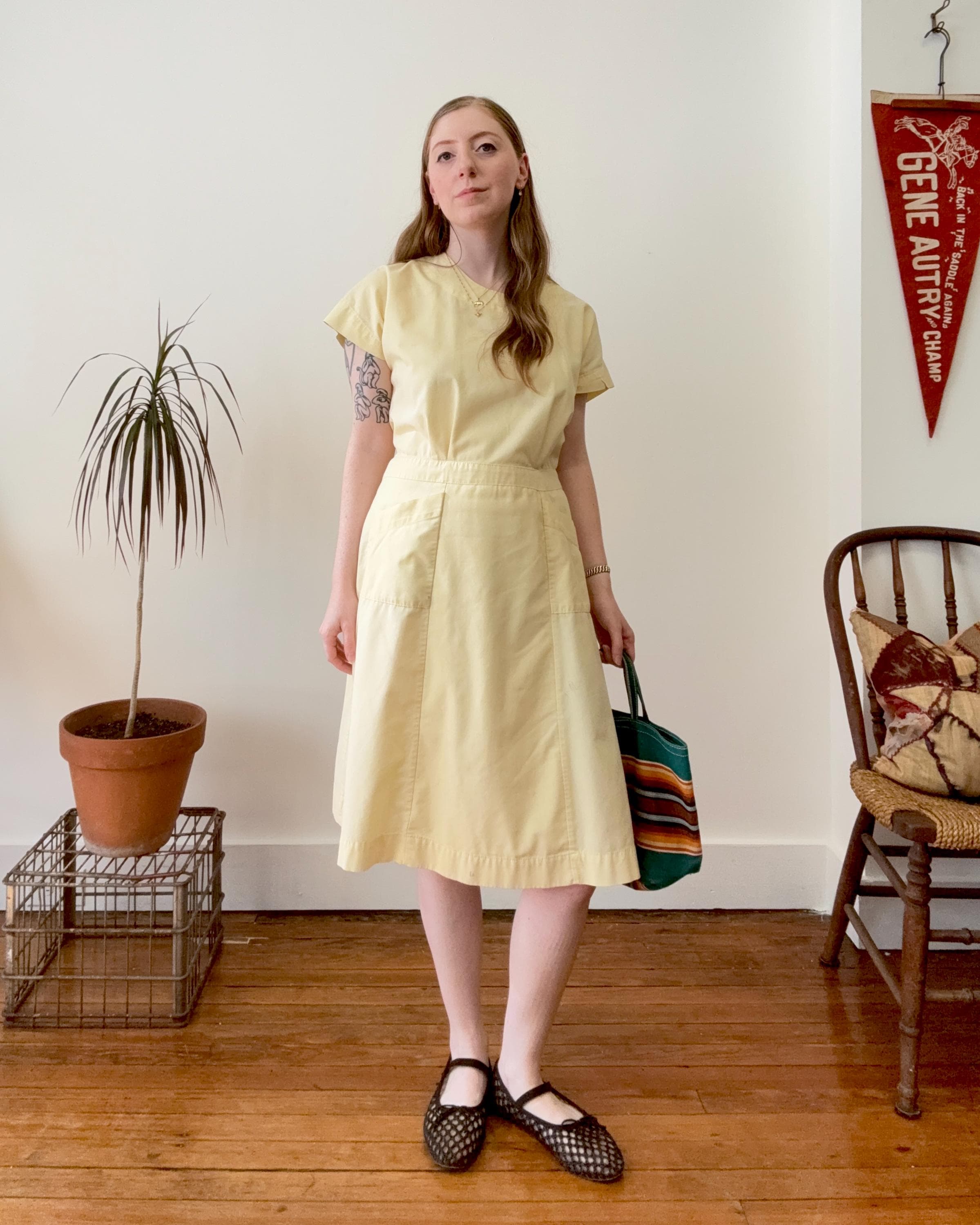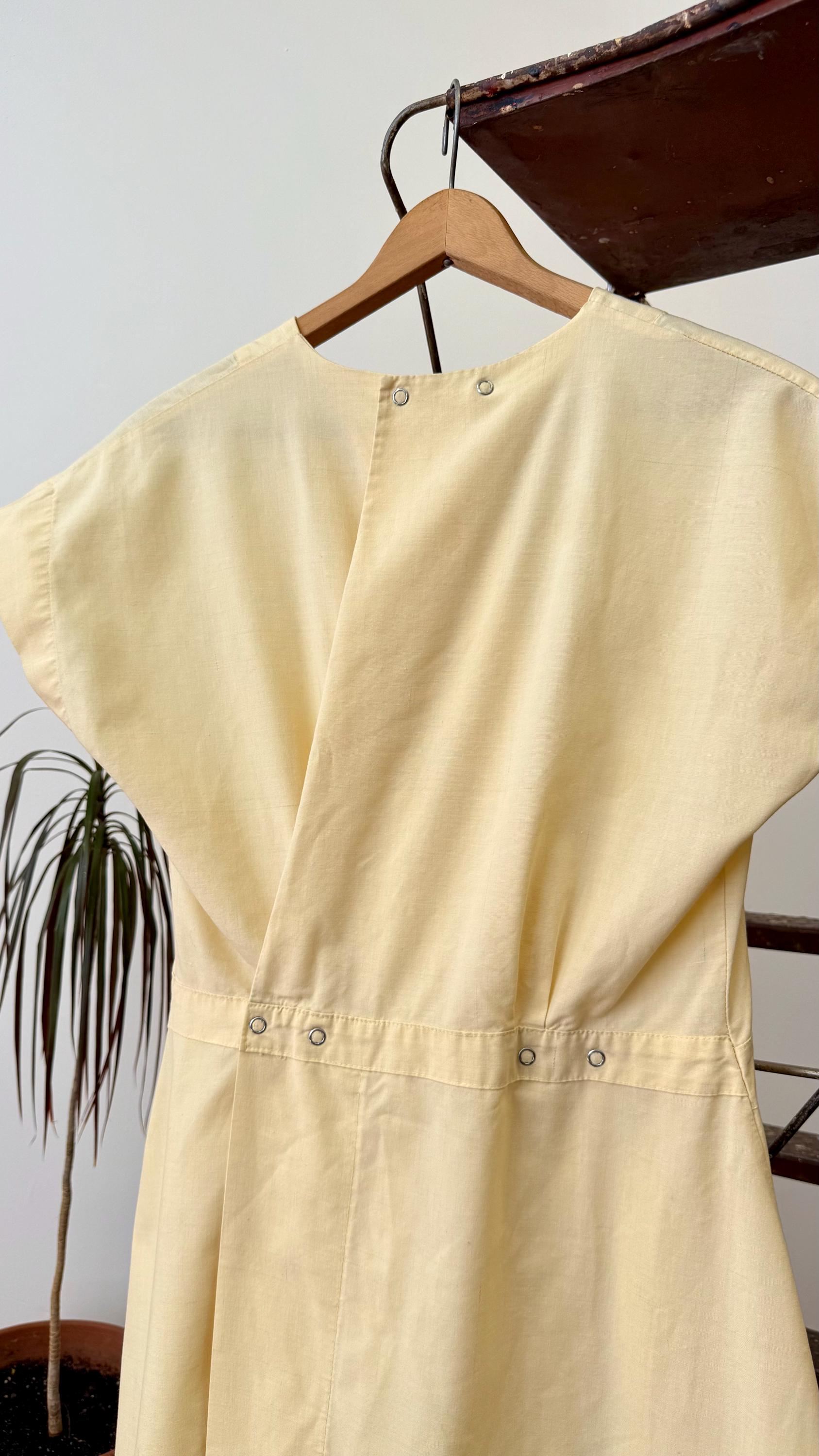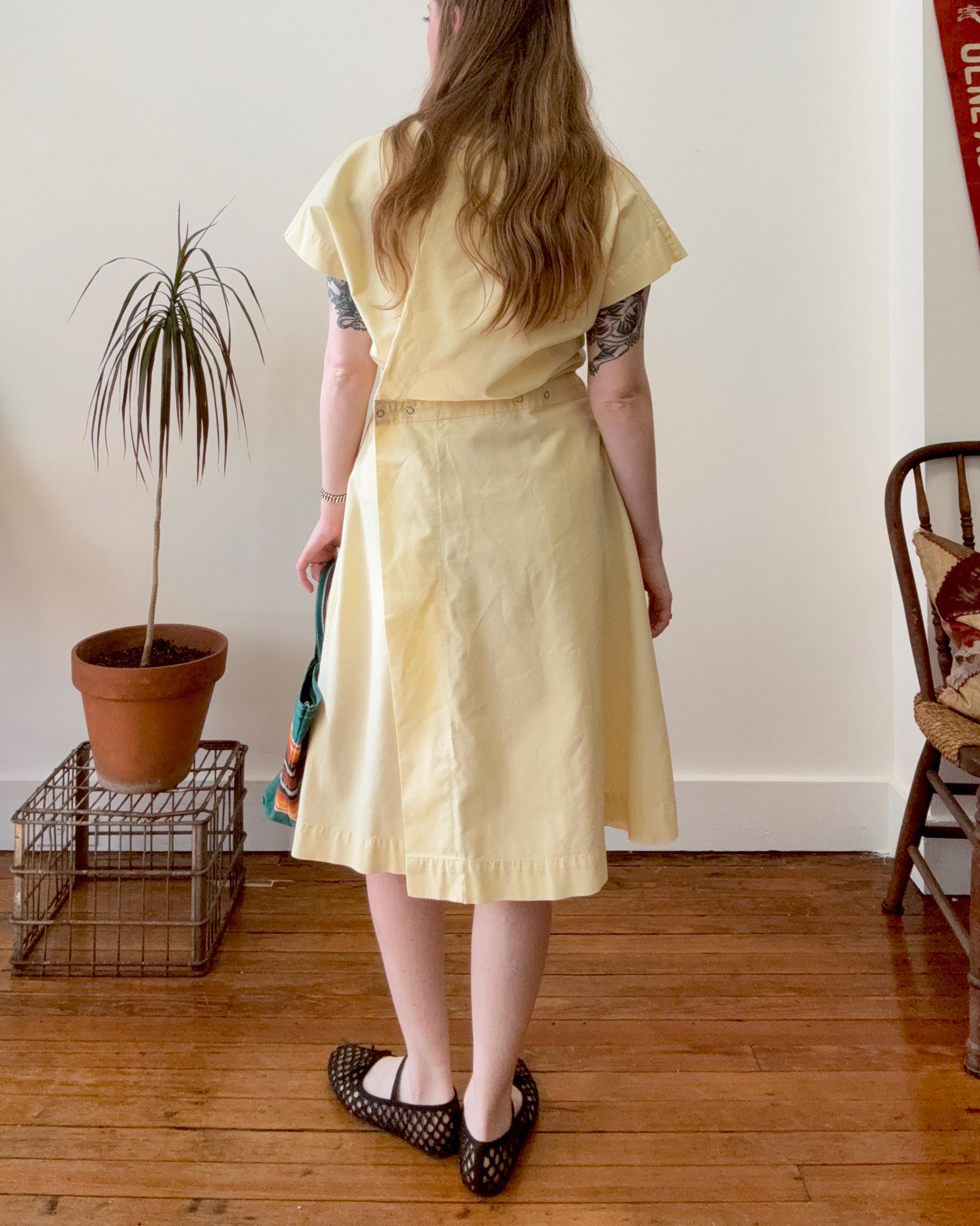 An authentic vintage dress. Originally a nurse’s smock that wraps and snaps around the back. The design has a fitted waistline and an A-line skirt with pockets. a small graphic for Indianapolis Hospital is centered on the chest. made by Angelica, a women’s workwear label.