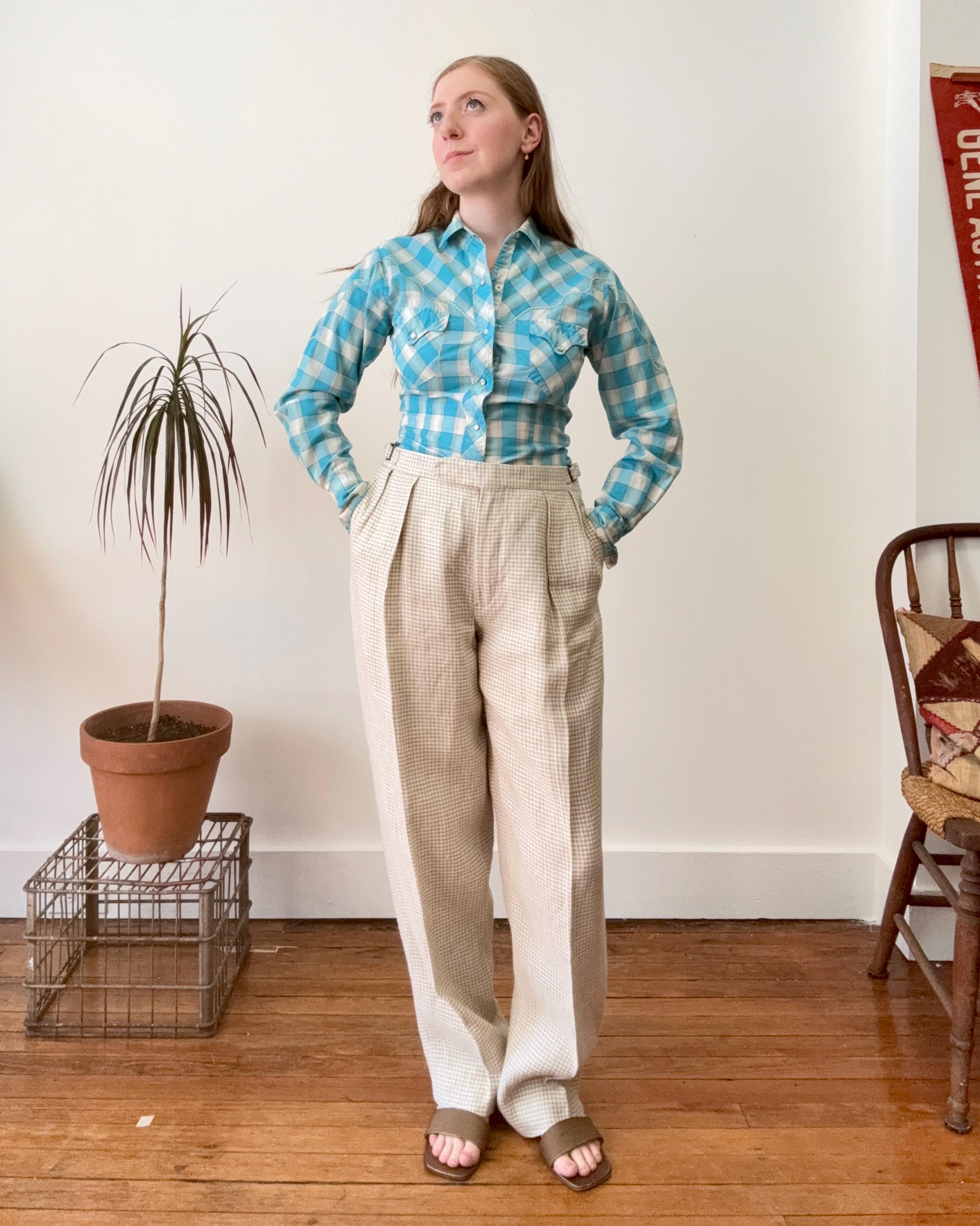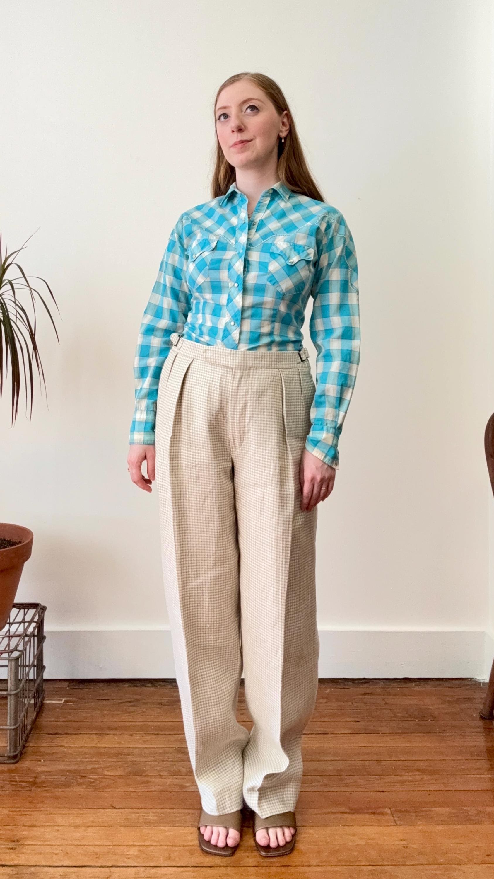 An authentic vintage western shirt blouse by Tem-Tex sportswear. a women’s cut designed to have a tailored fit and darted bustline. features pearlsnap fasteners and a metallic woven trim yoke detail.