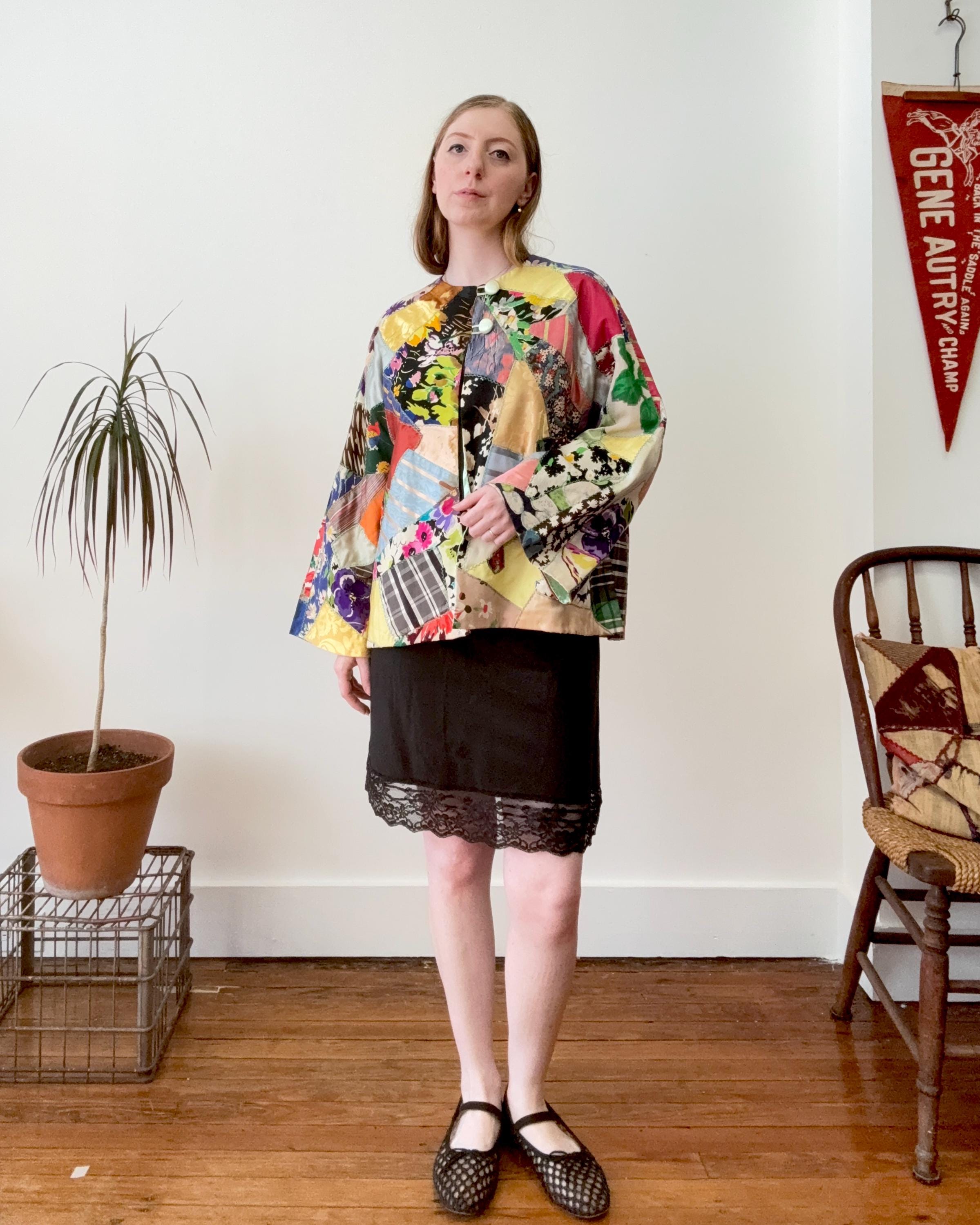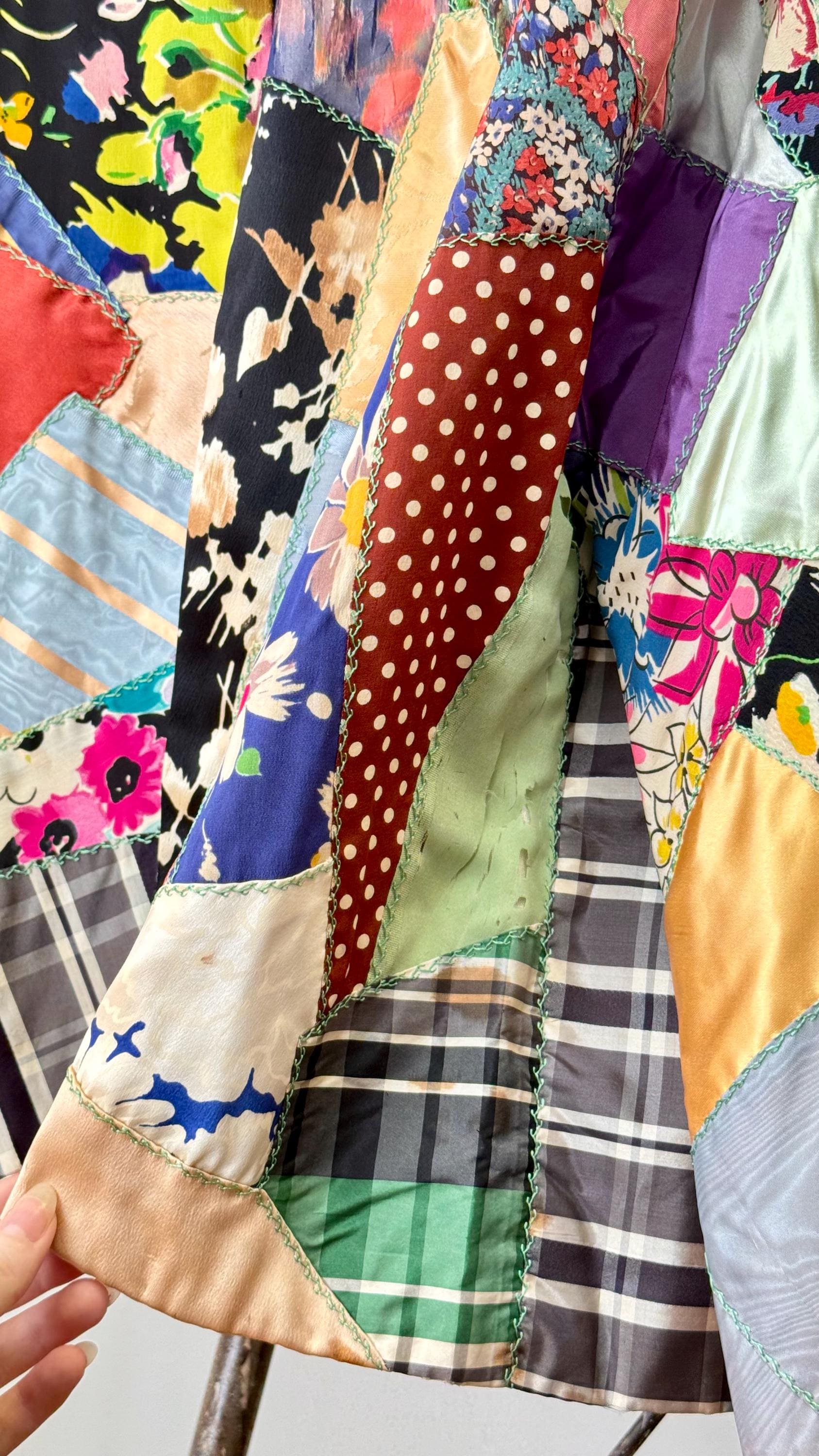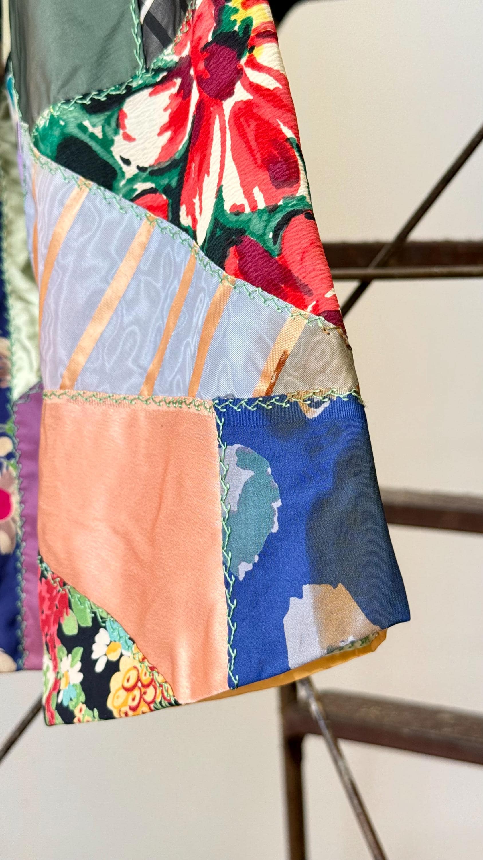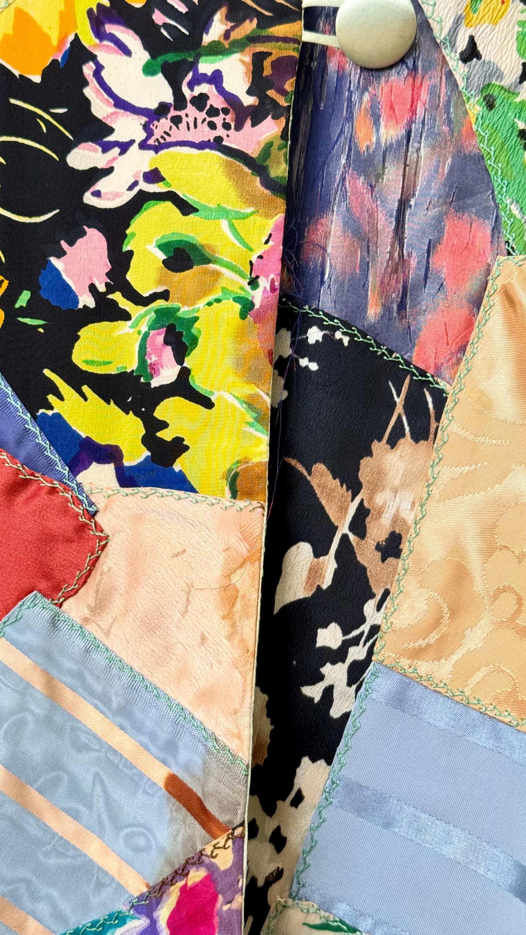 condition : good with imperfections, visible (yet subtle) signs of age and wear as seen in photos. structurally in great shape but some of the finer crepe fabrics in the patchwork has begun to naturally shatter from age. It looks like there are some rust water stains on the front and sleeve as pictured, luckily because of the business of all the prints this damage is somewhat disguised in the patterns and presents well overall! other than that, garment doesn’t appear dingy and any loose dirt or grime. gently steam cleaned and ready to wear!