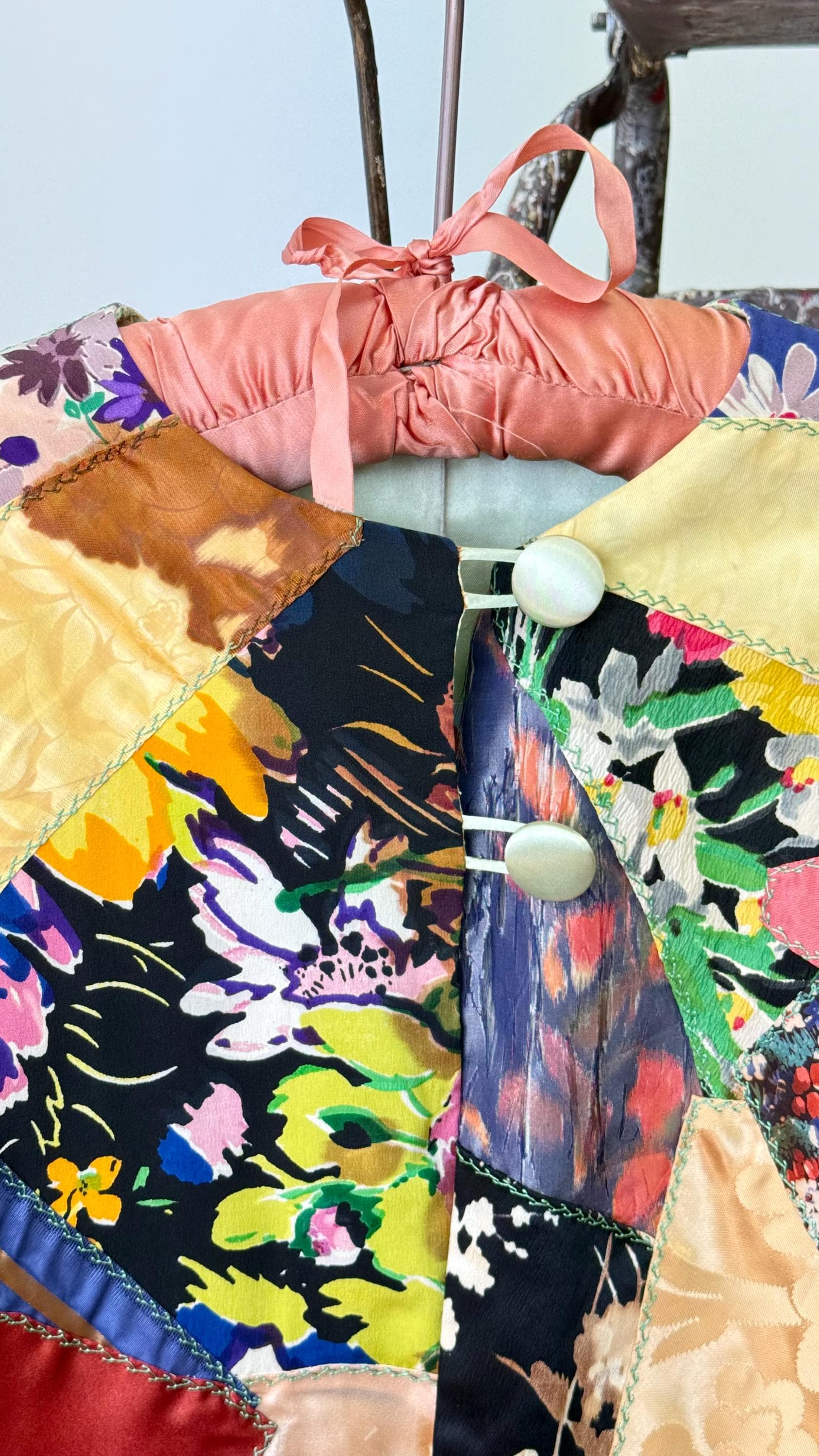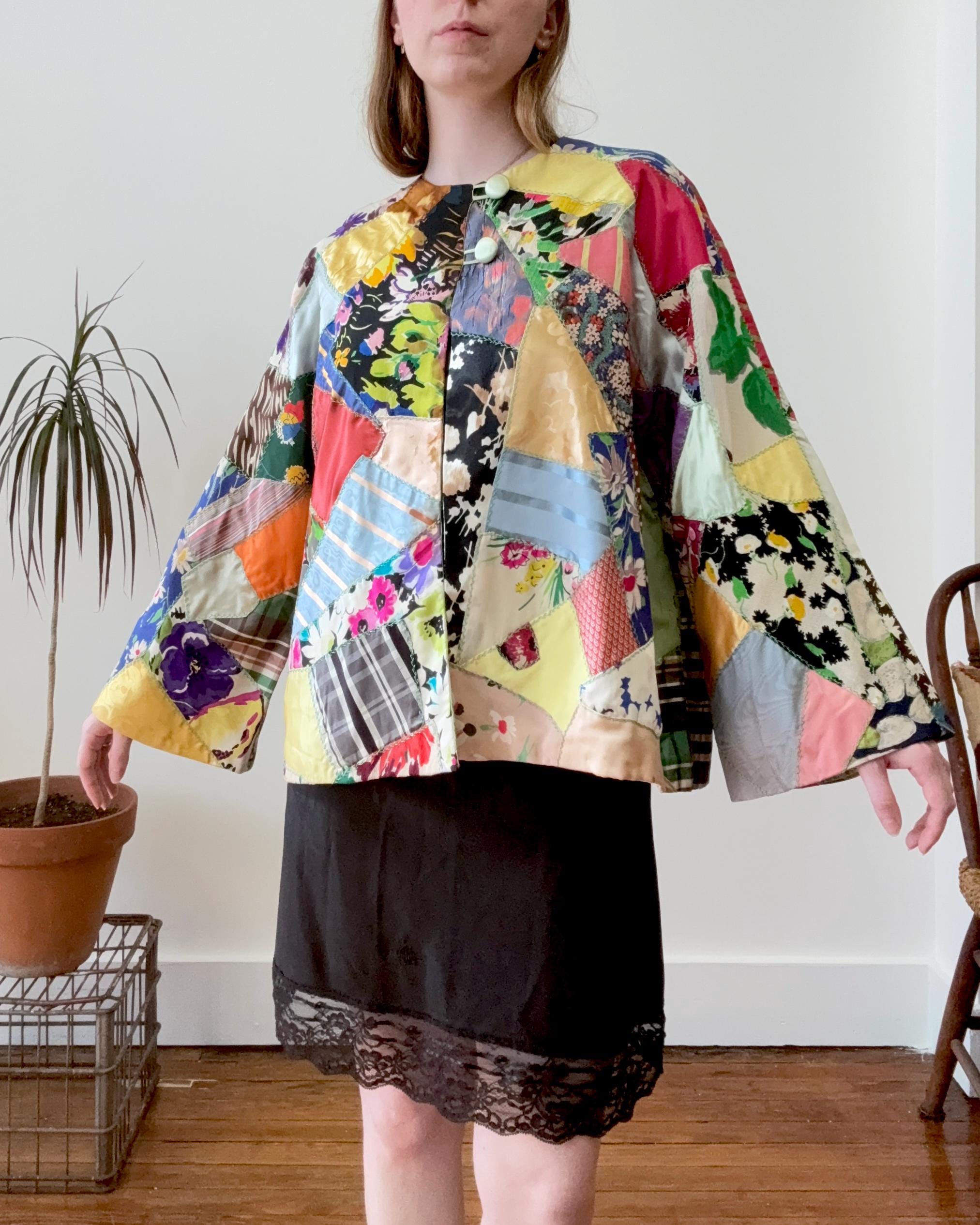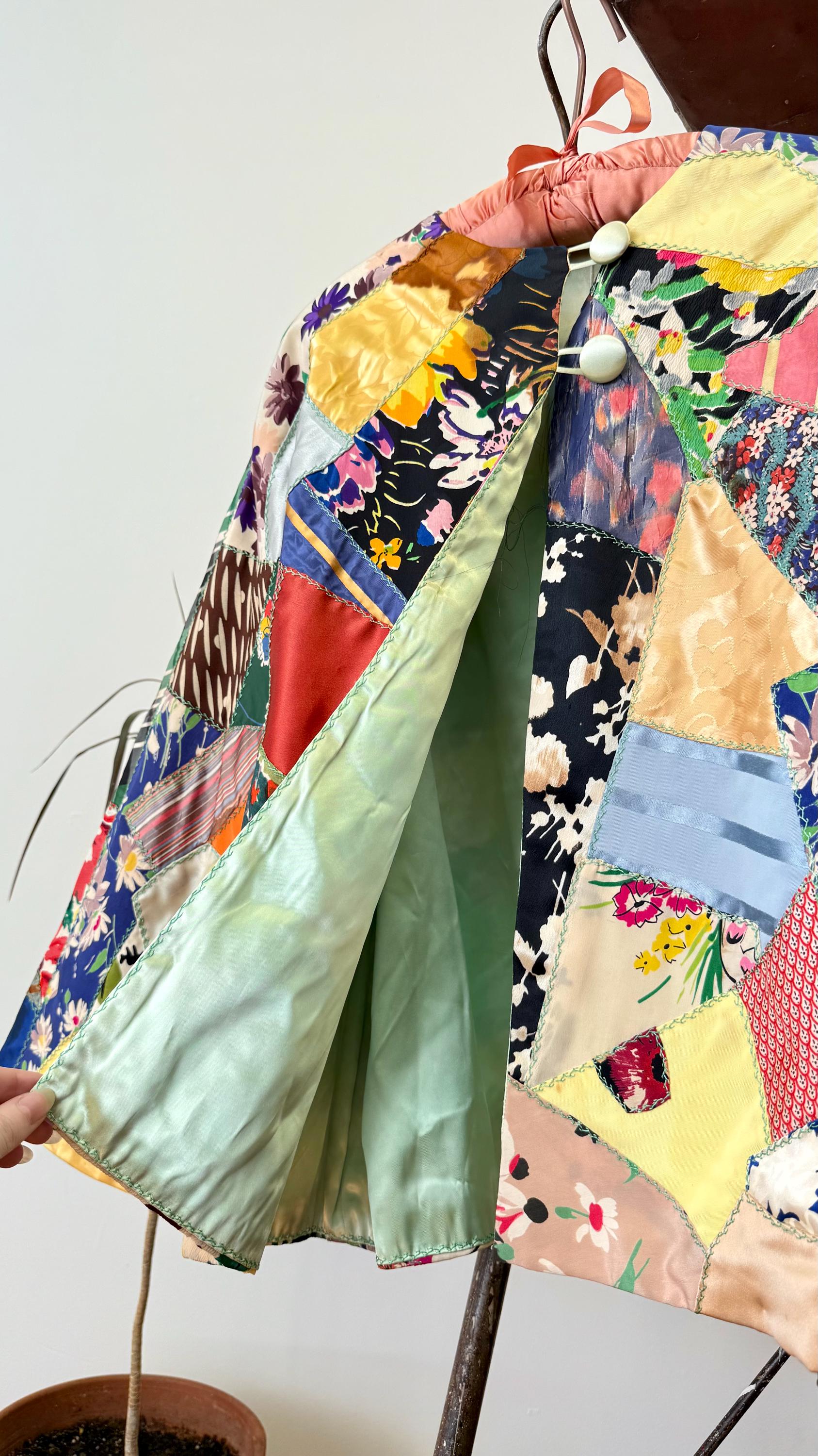 An authentic vintage swing jacket. an antique loungewear piece made in the style of a “crazy quilt” features a pistachio satin lining and fabric covered buttons. its loose fit across the chest and wide sleeve allows for a free size that looks great on many!
