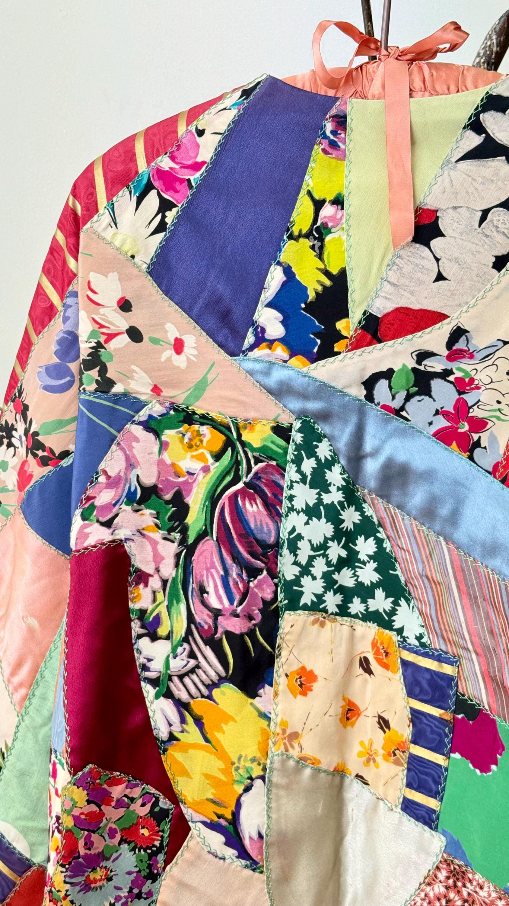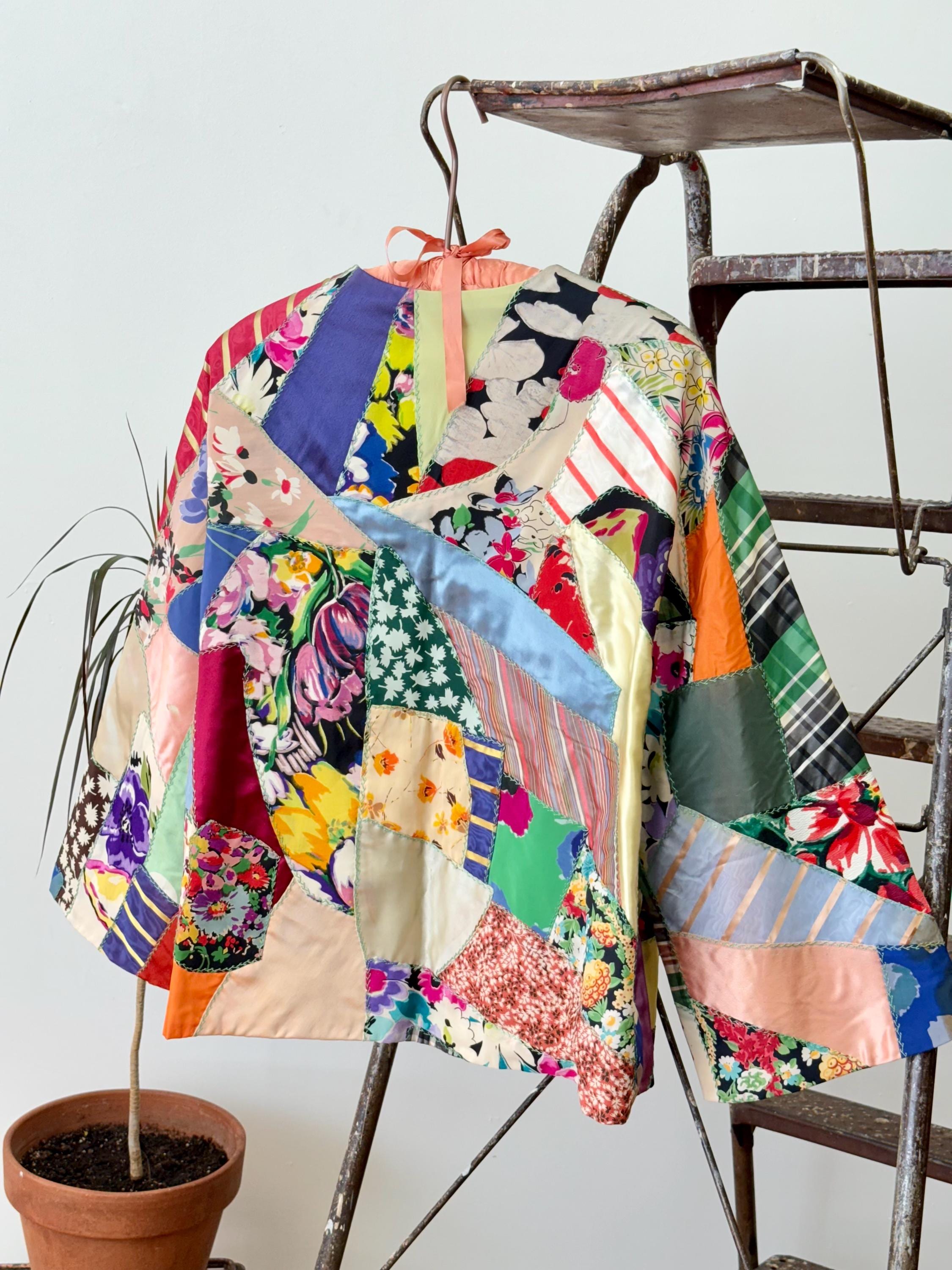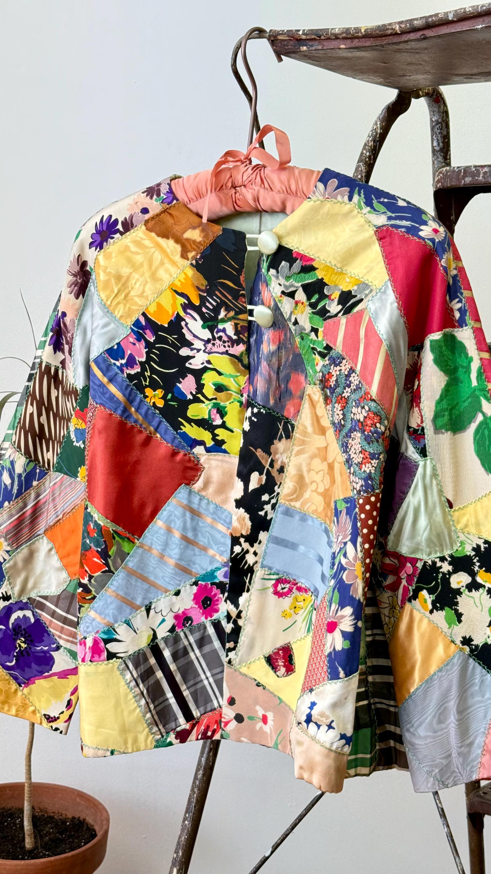 An authentic vintage swing jacket. an antique loungewear piece made in the style of a “crazy quilt” features a pistachio satin lining and fabric covered buttons. its loose fit across the chest and wide sleeve allows for a free size that looks great on many!