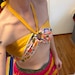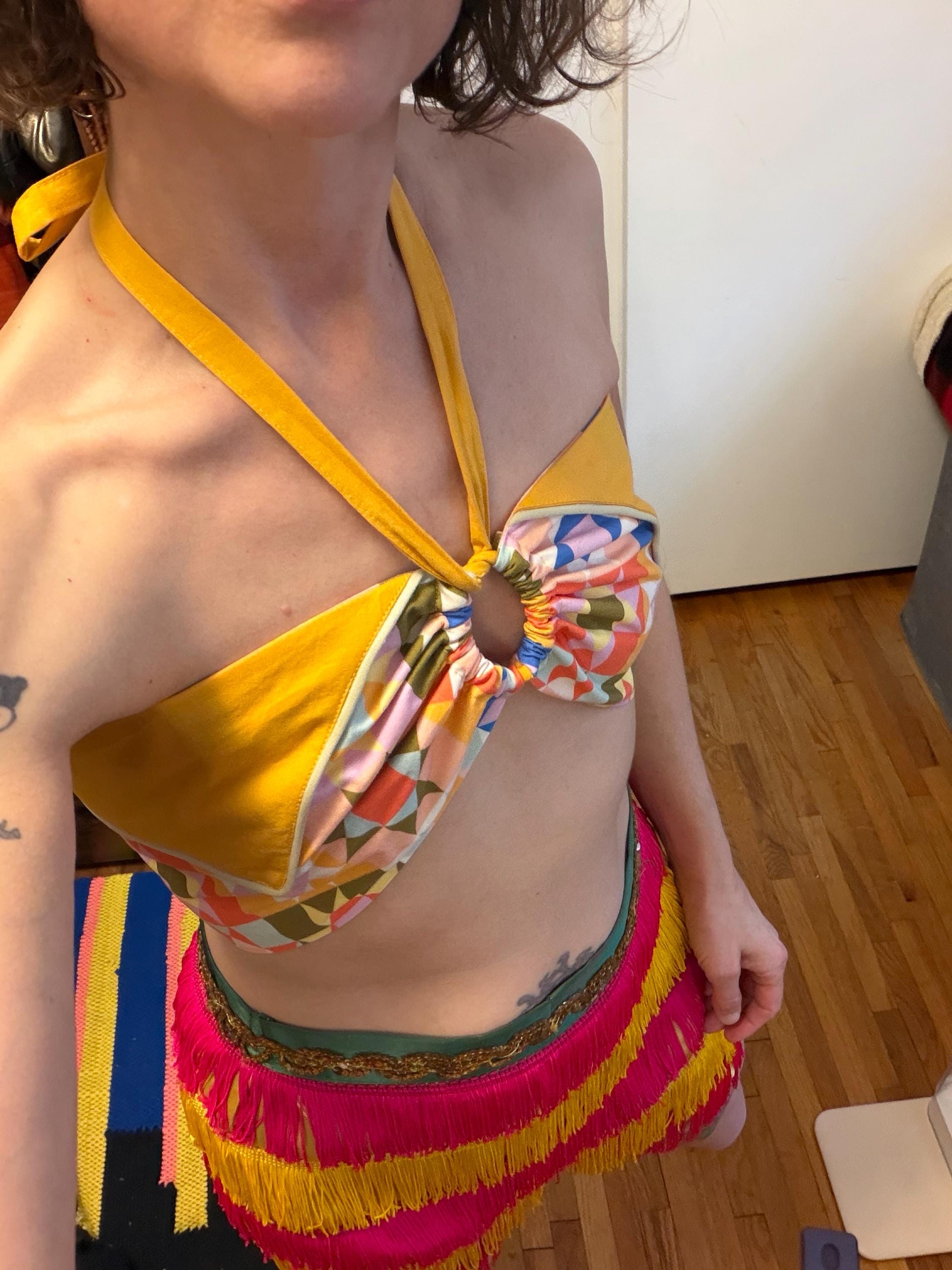 An authentic vintage costume piece. a micro mini skirt design with attached elastic bloomers inside. features 5 layers of hot pink and gold “Day Glo” hues that almost appears florescent in person! (camera doesn’t quite pickup how bright it really is!) the base fabric is a shiny gold satin with a green satin waistband decorated with a metallic sequin trim. garment fastens up the back with a metal zipper and hooks.