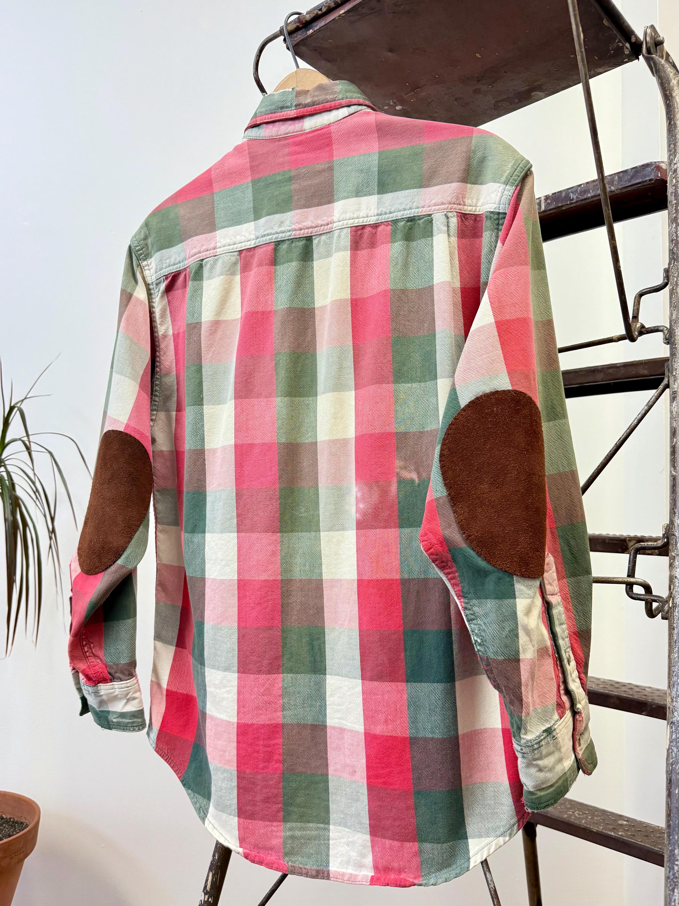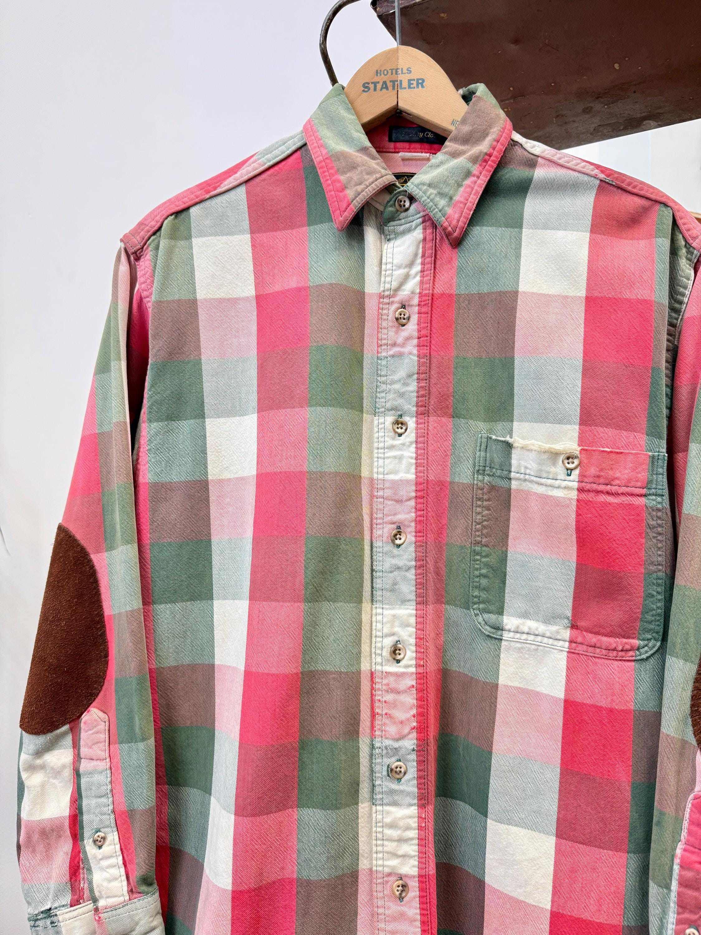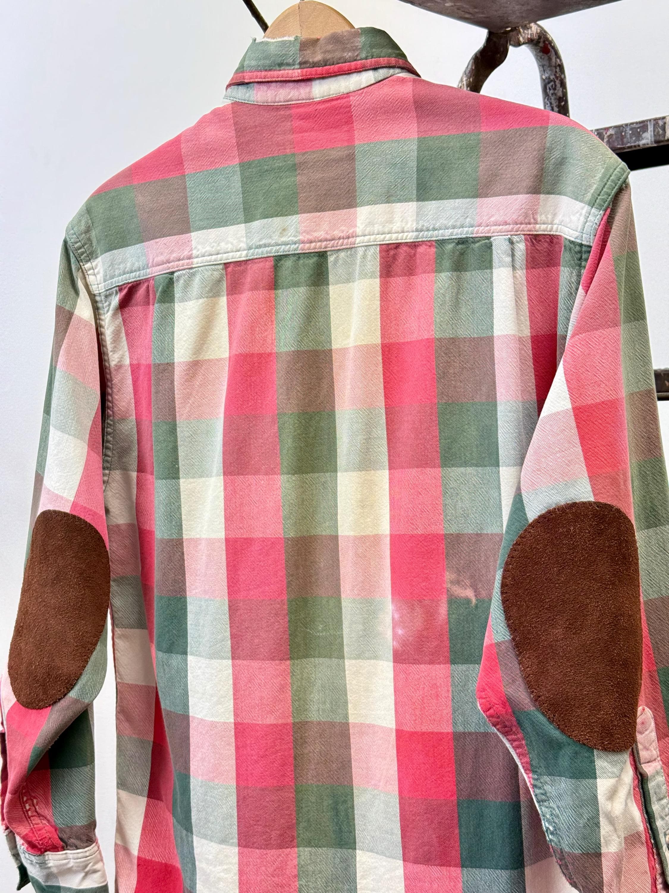 An authentic vintage flannel shirt by Eddie Bauer. reworked by us at Craft Union, adding suede leather elbow patches over previous holes, a practical repair that gives the shirt an all new look! the shirt itself is made from EB “McKinley Cloth” a fine medium-weight woven plaid cotton fabric. It has been well worn adding extra softness, smooth texture, and other distressed details.