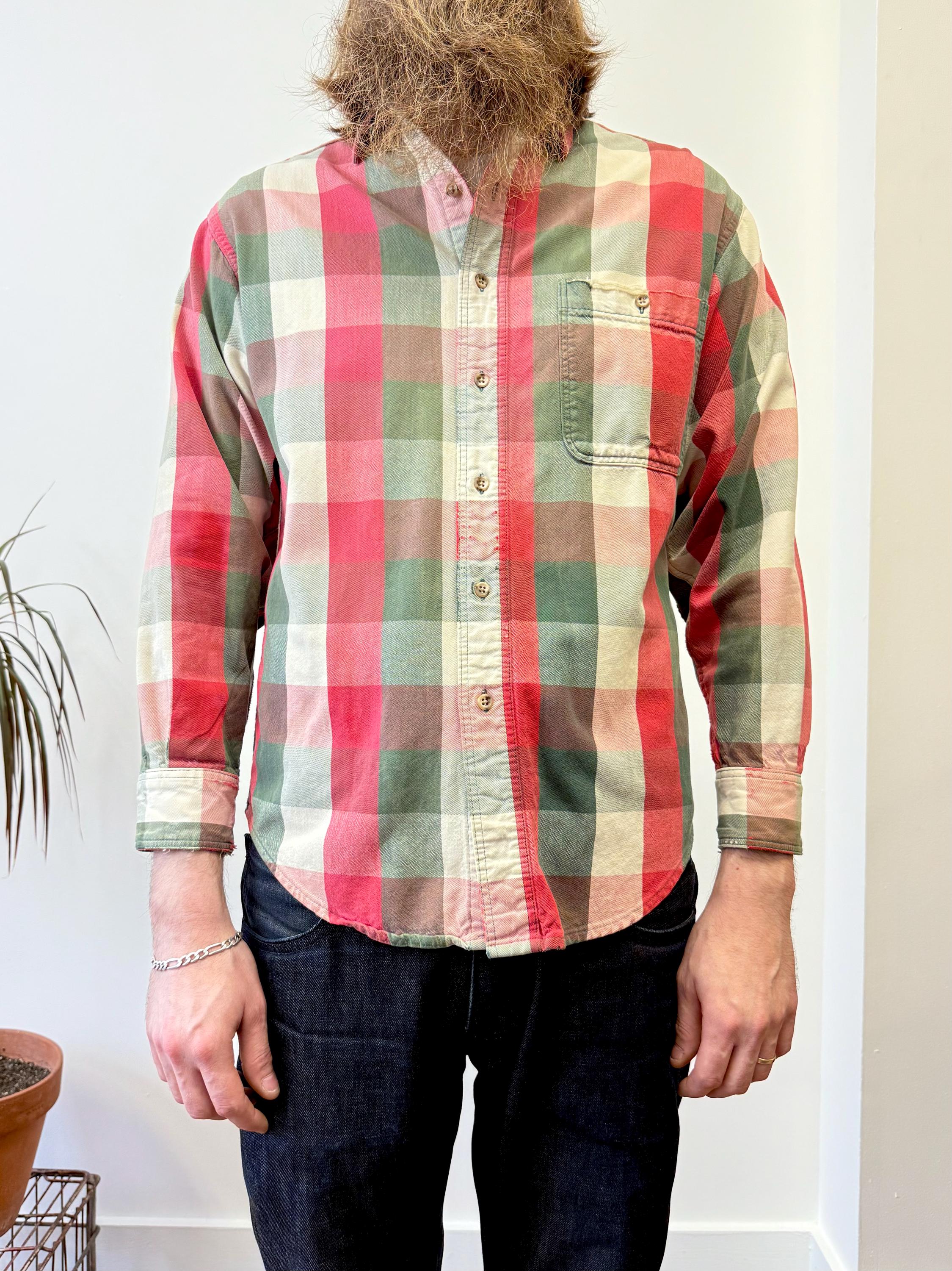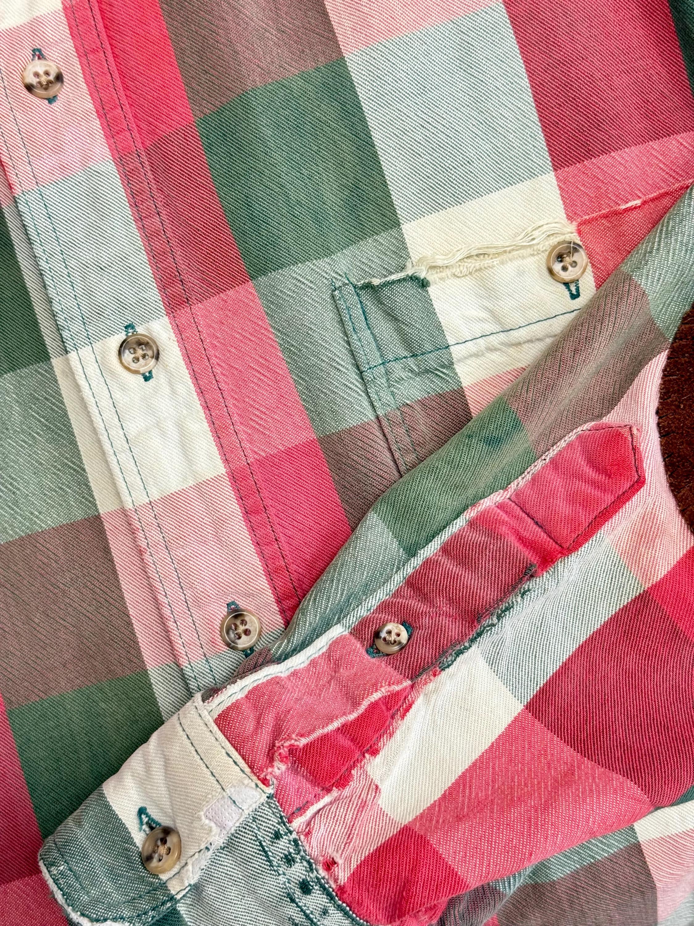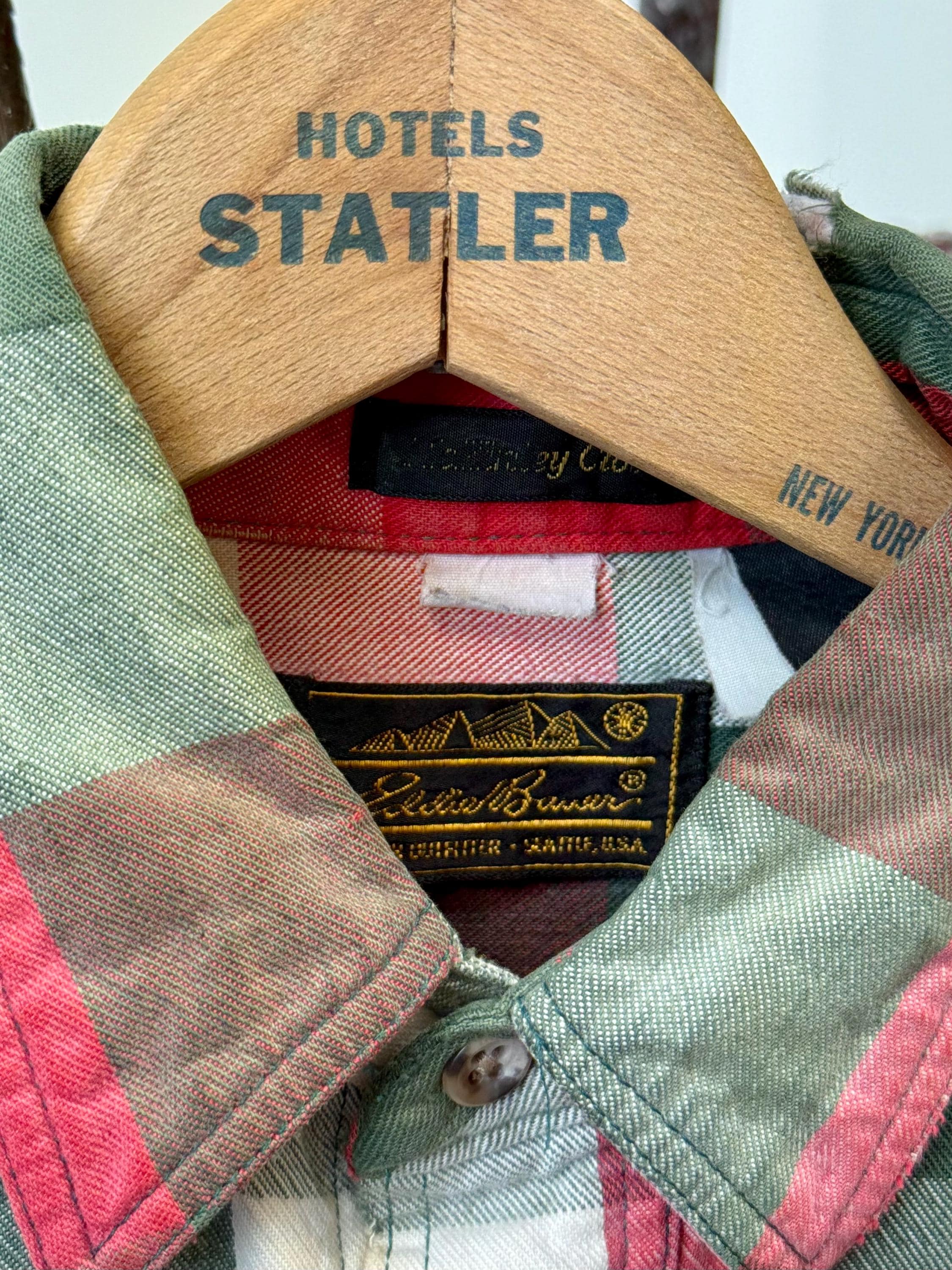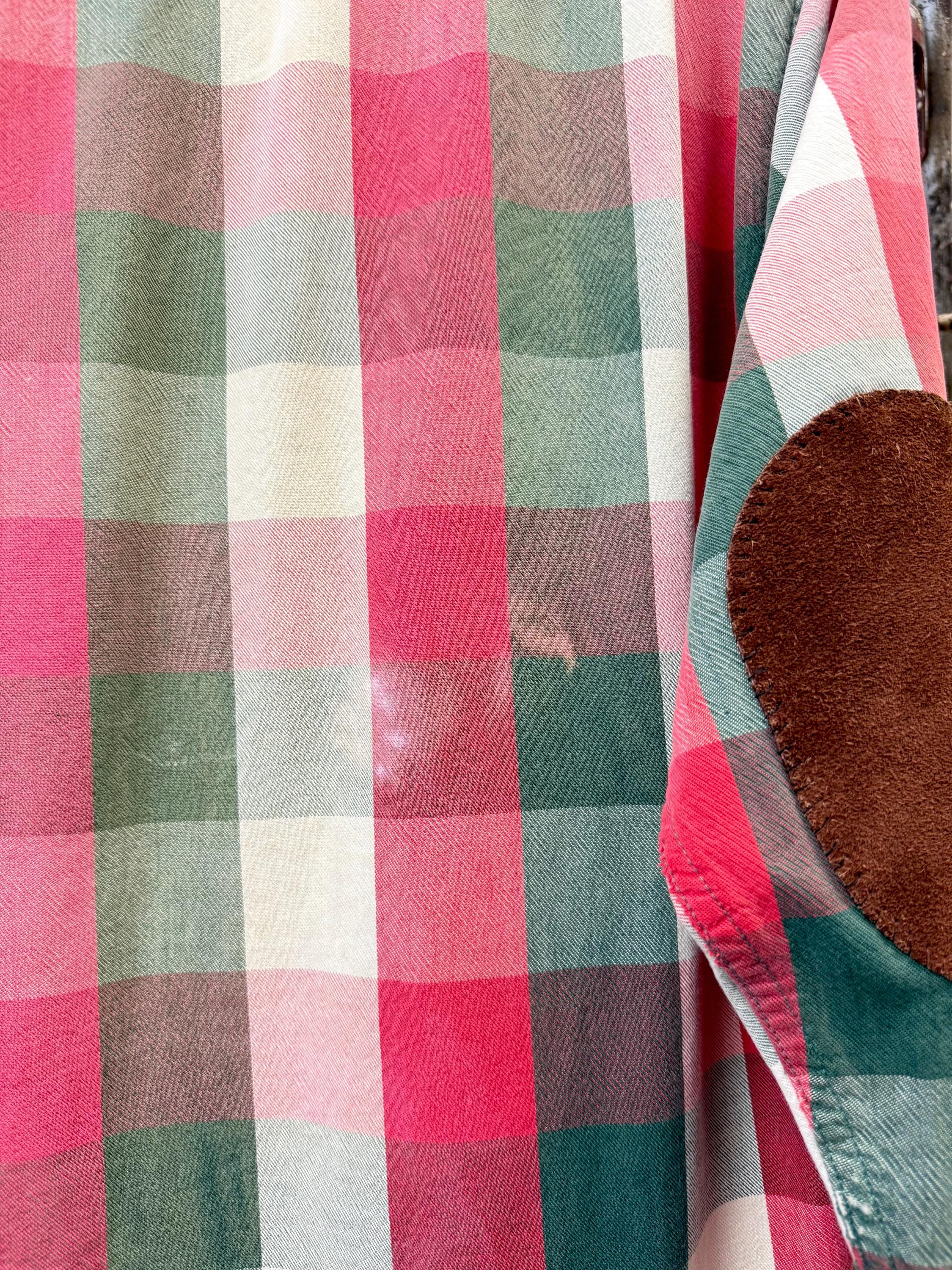 An authentic vintage flannel shirt by Eddie Bauer. reworked by us at Craft Union, adding suede leather elbow patches over previous holes, a practical repair that gives the shirt an all new look! the shirt itself is made from EB “McKinley Cloth” a fine medium-weight woven plaid cotton fabric. It has been well worn adding extra softness, smooth texture, and other distressed details.