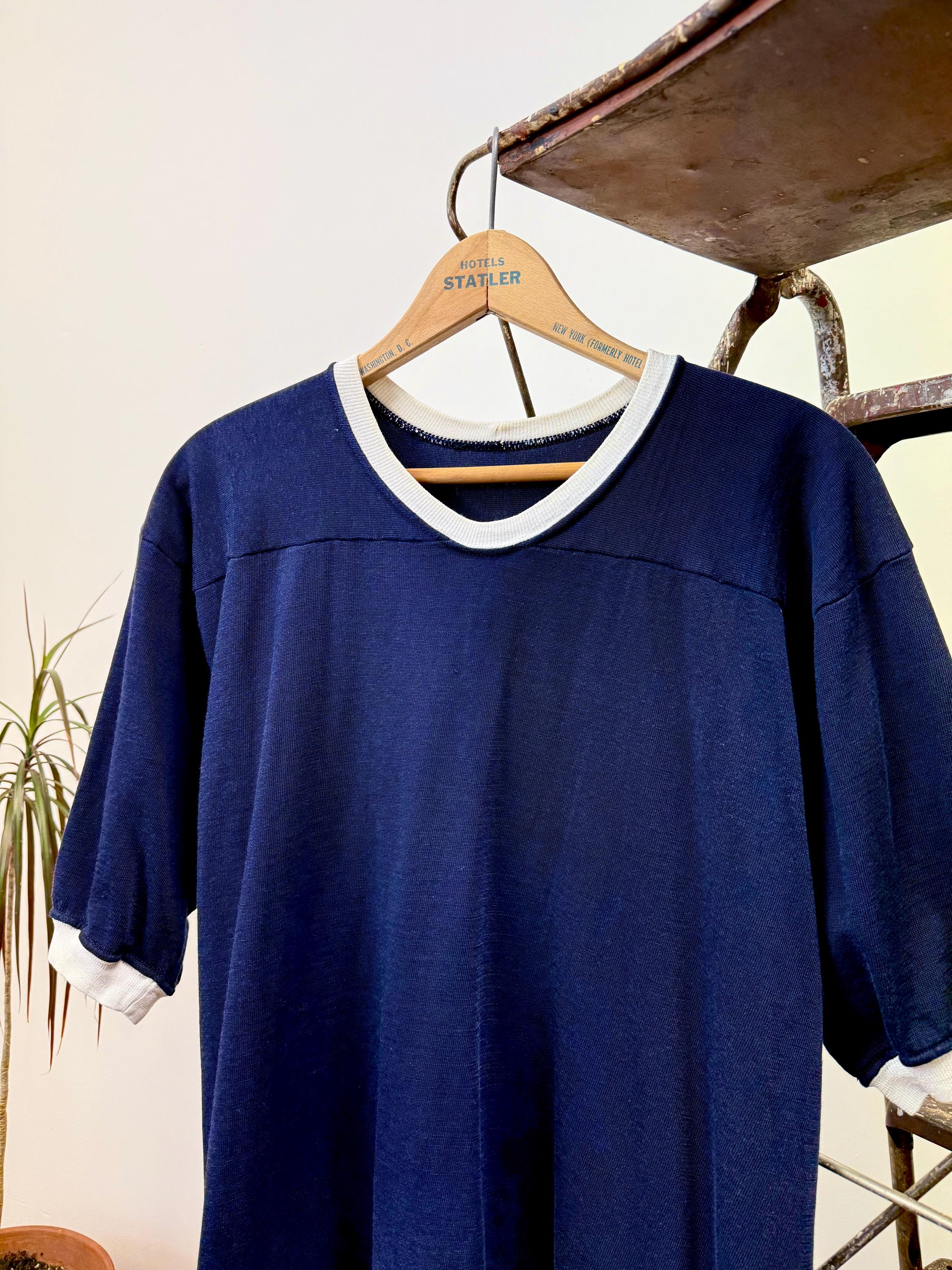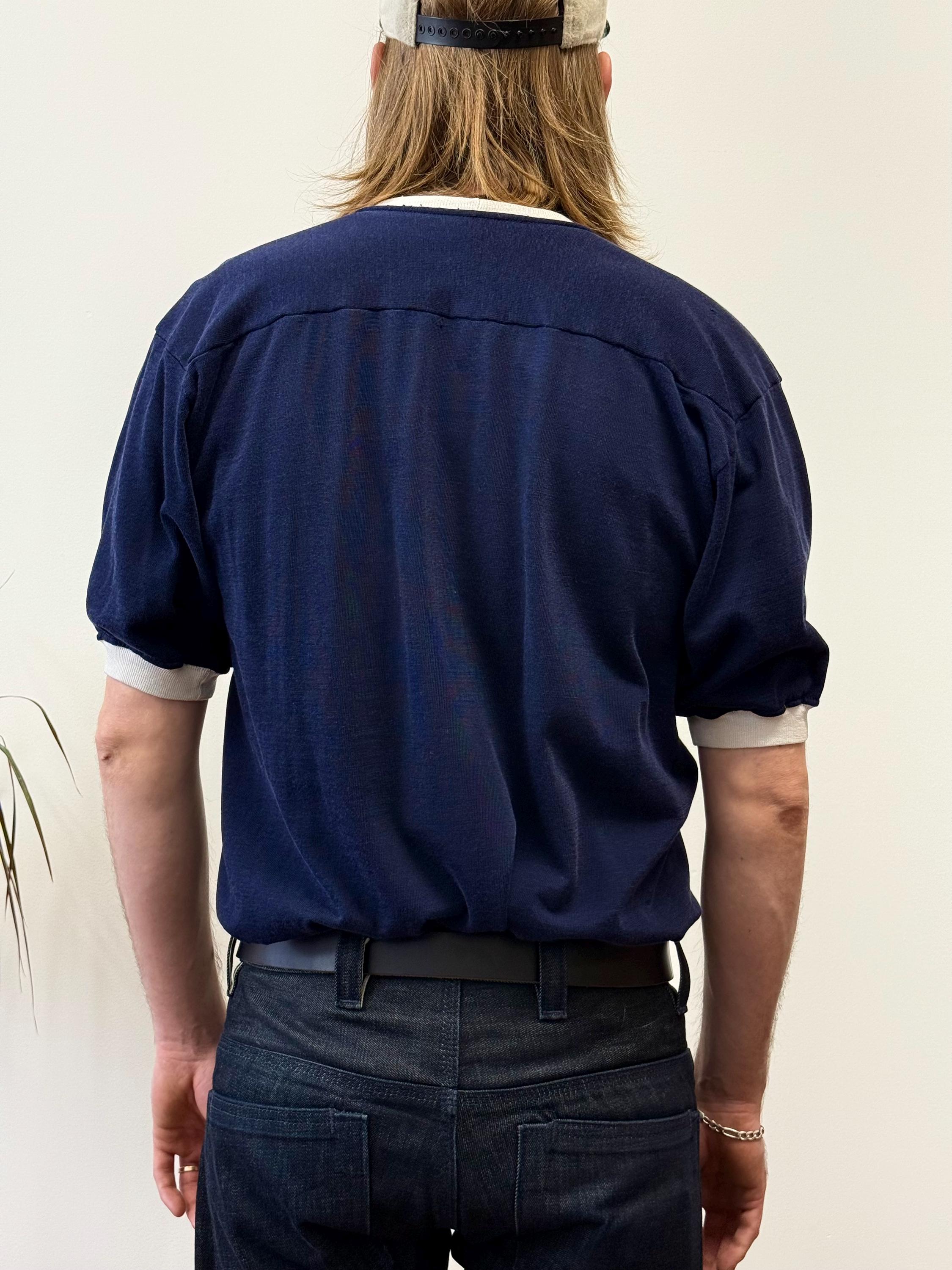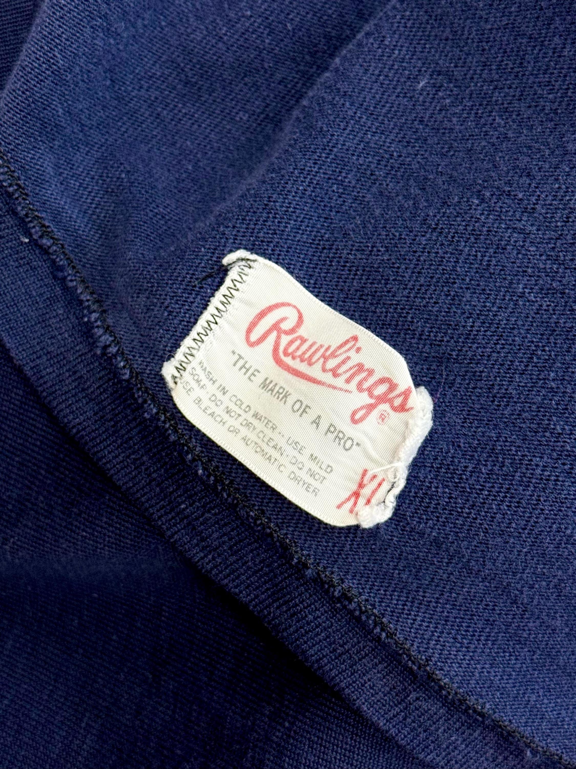 An authentic vintage sportswear jersey t shirt by Rawlings. features a ringer tee style neckline and sleeve trim. a cut similar to a football jersey such as a drop shoulder yoke. label sewn into the inside hem. fabric is a heavier slubby knit.