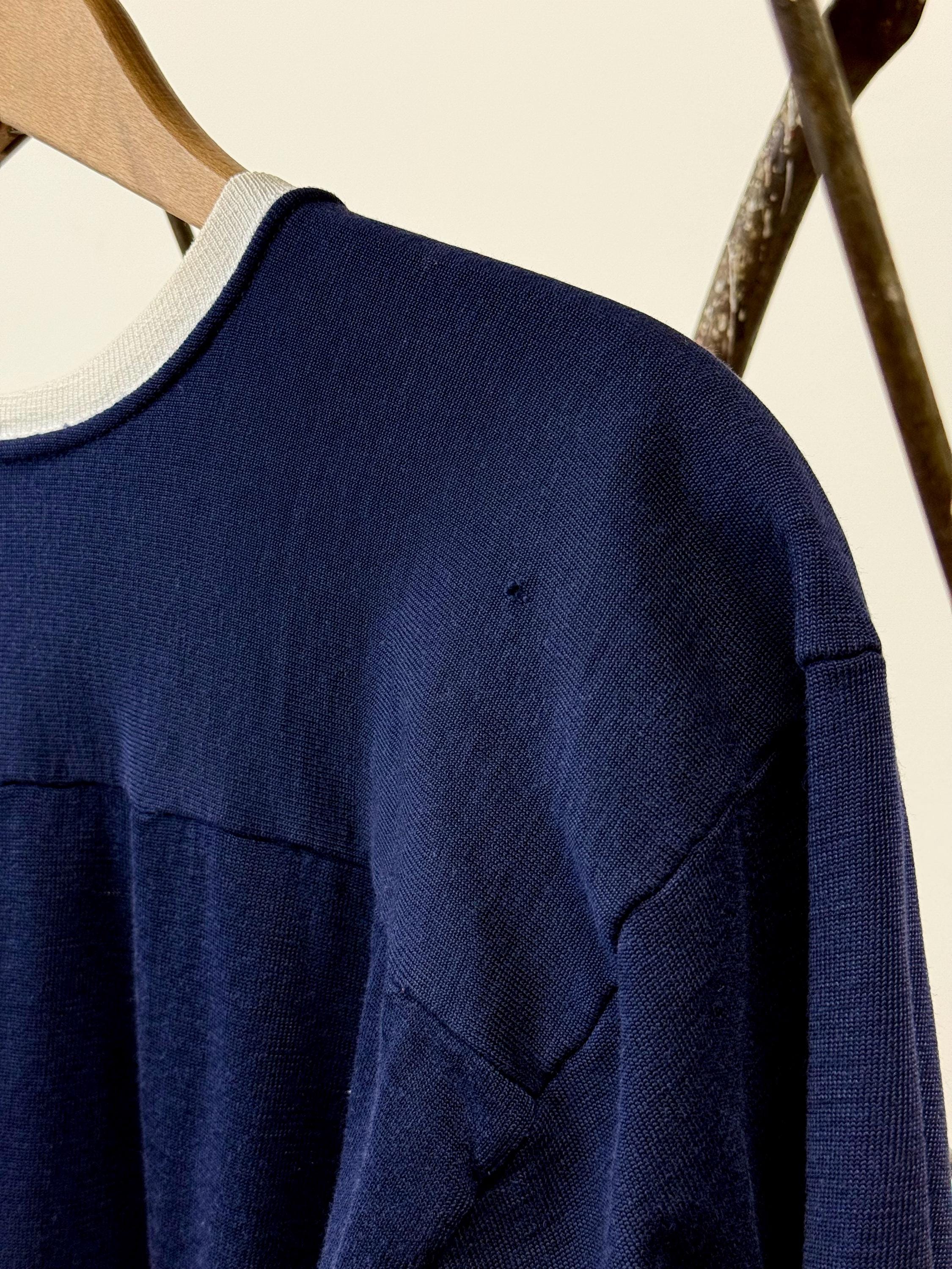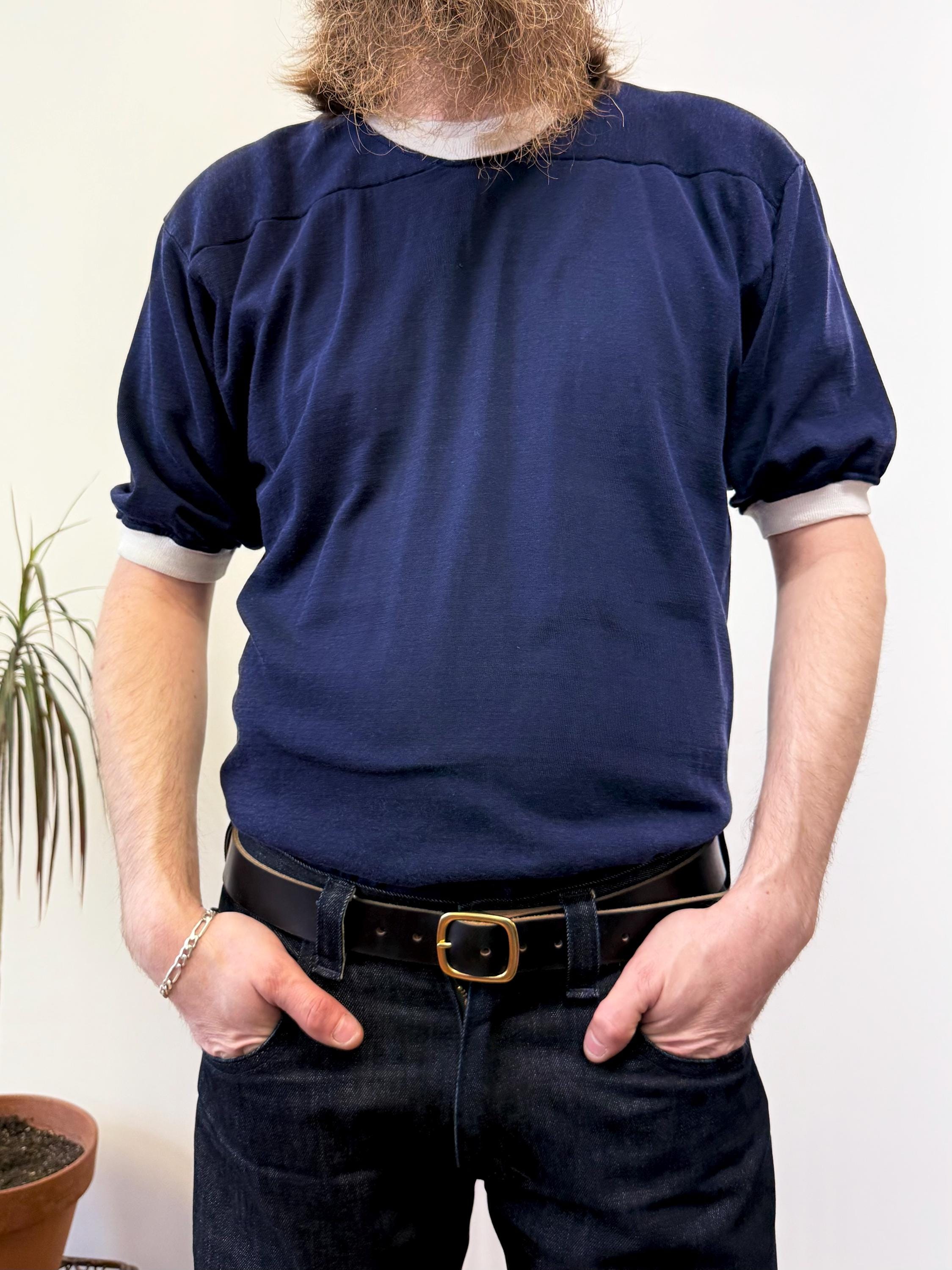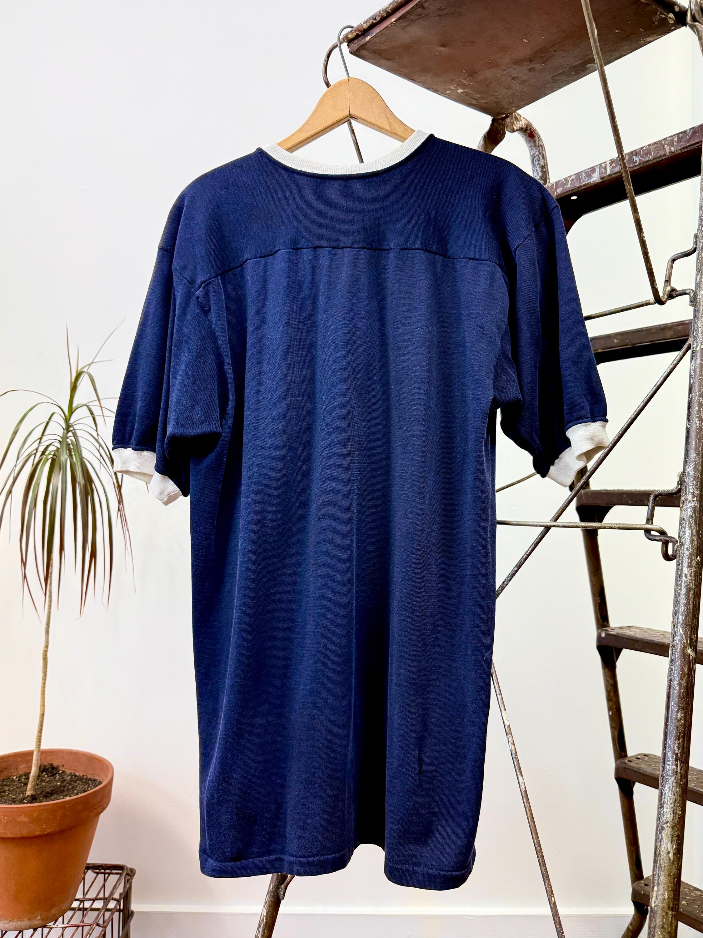 An authentic vintage sportswear jersey t shirt by Rawlings. features a ringer tee style neckline and sleeve trim. a cut similar to a football jersey such as a drop shoulder yoke. label sewn into the inside hem. fabric is a heavier slubby knit.