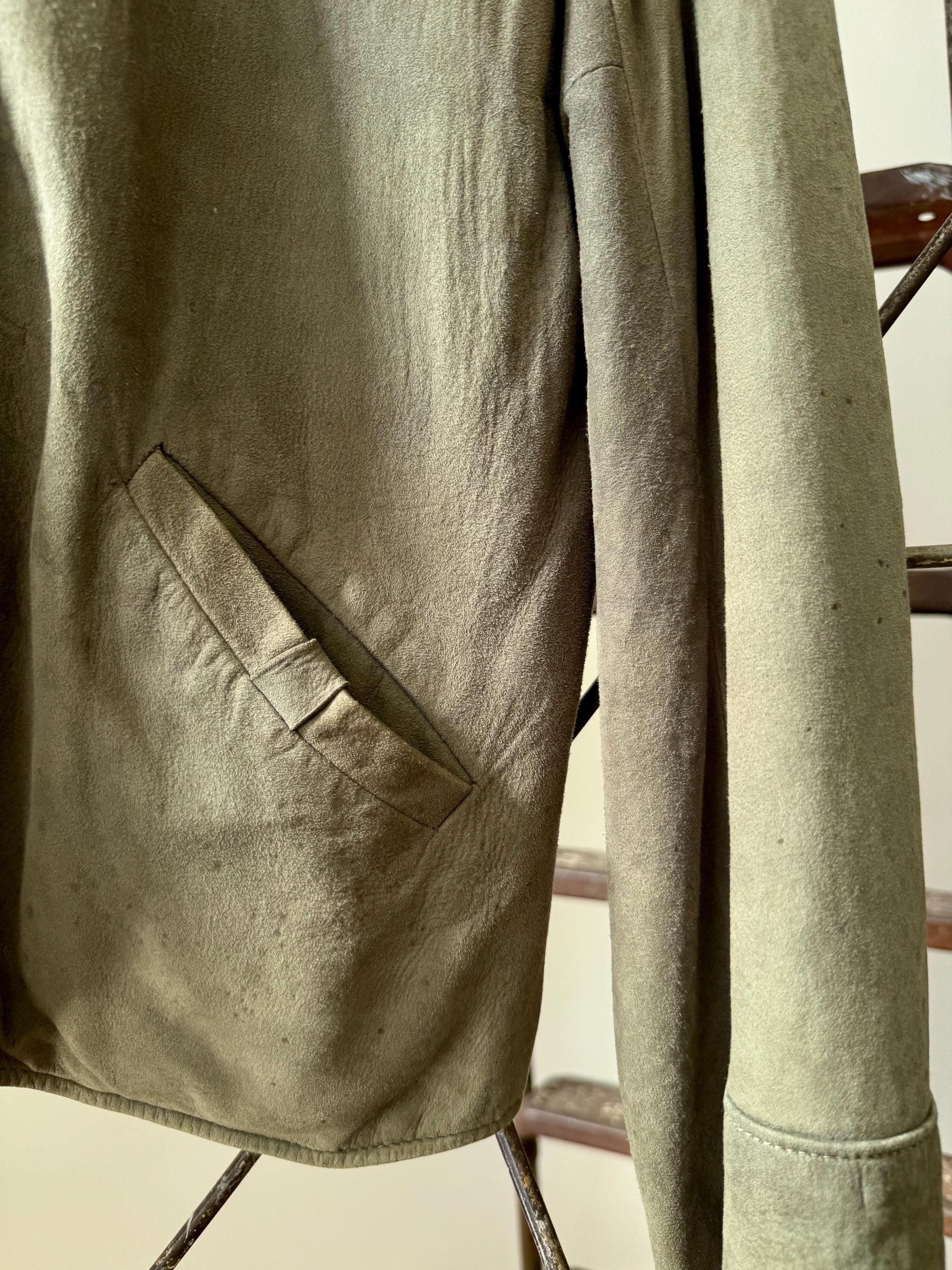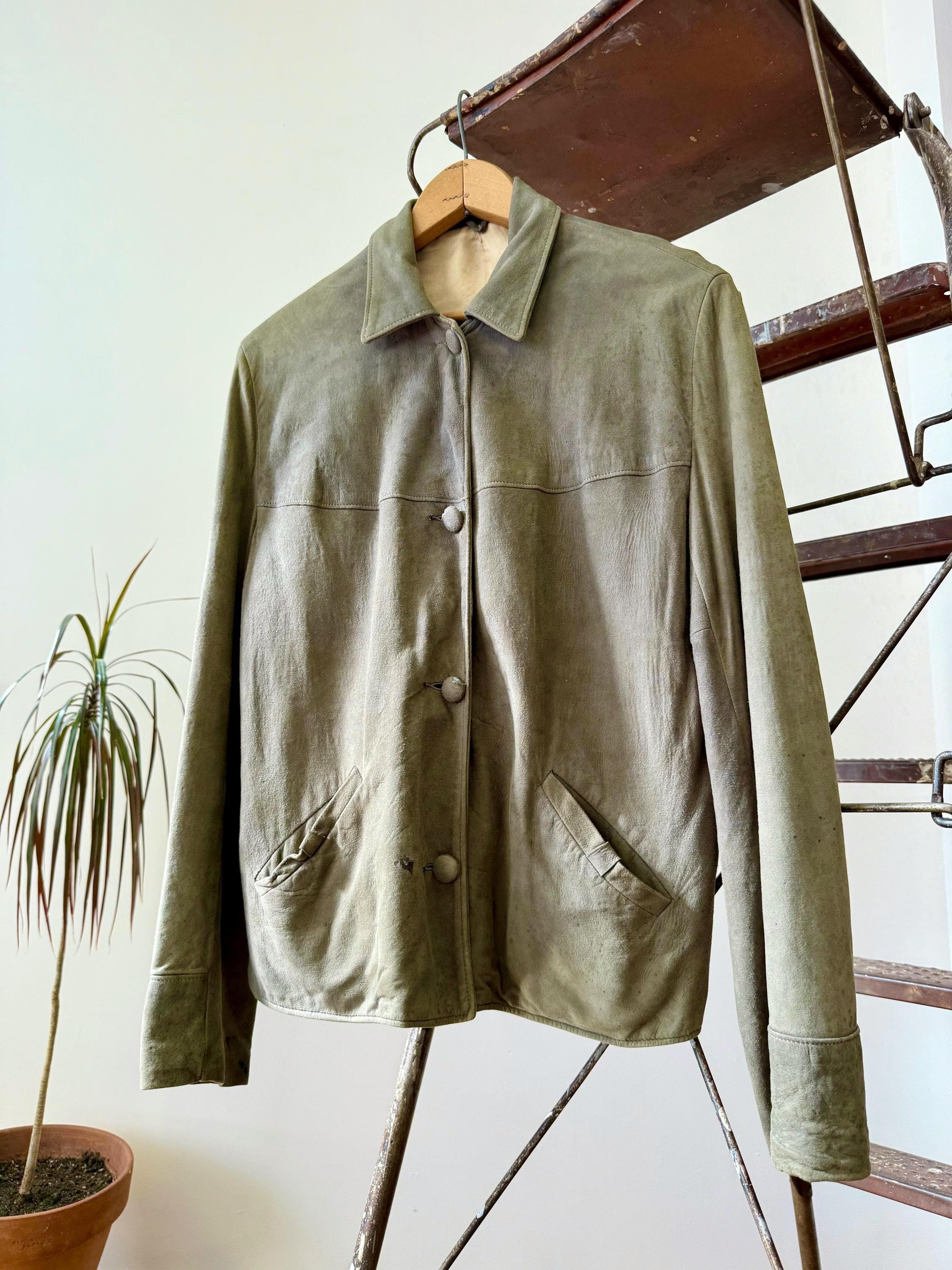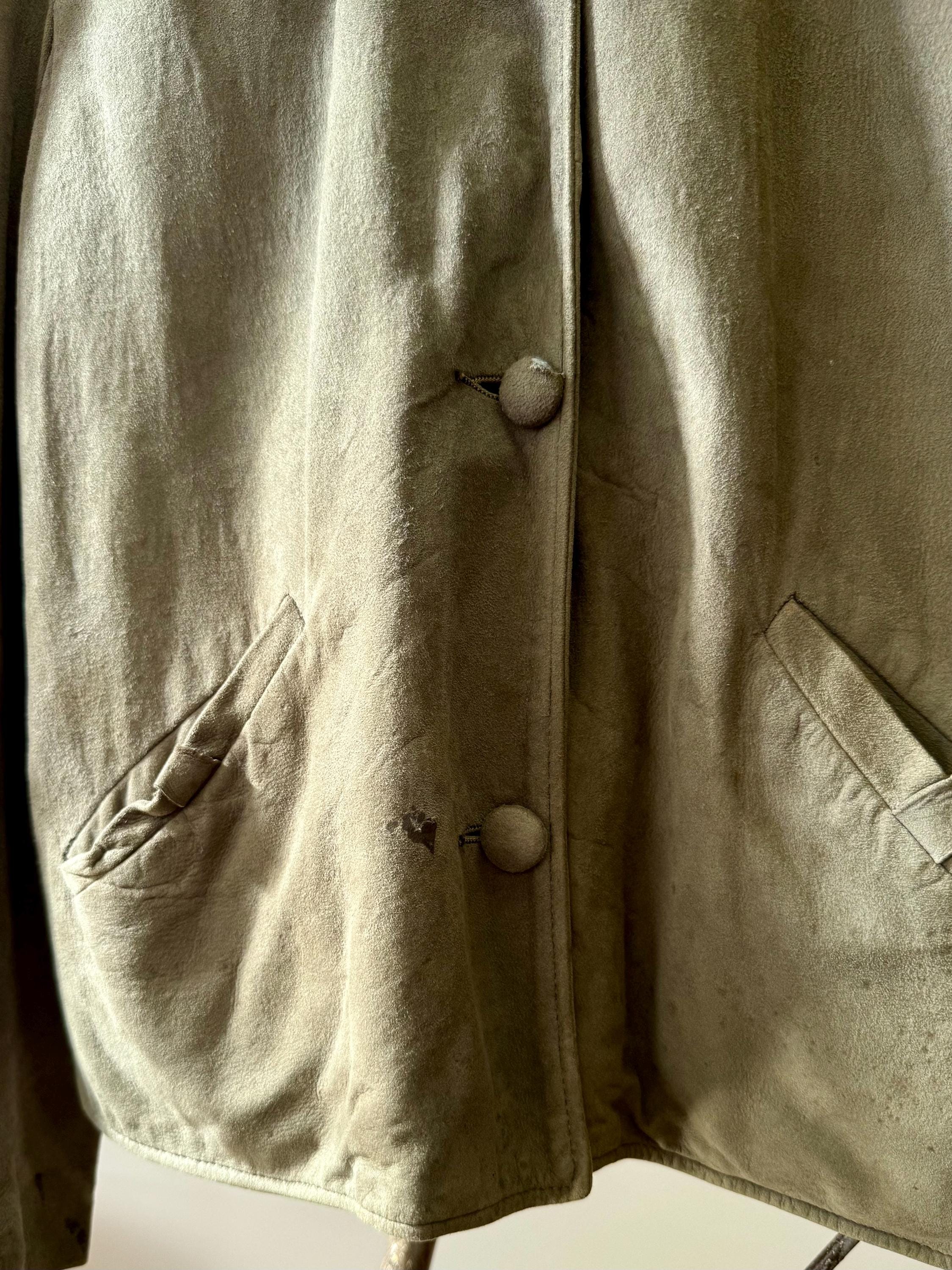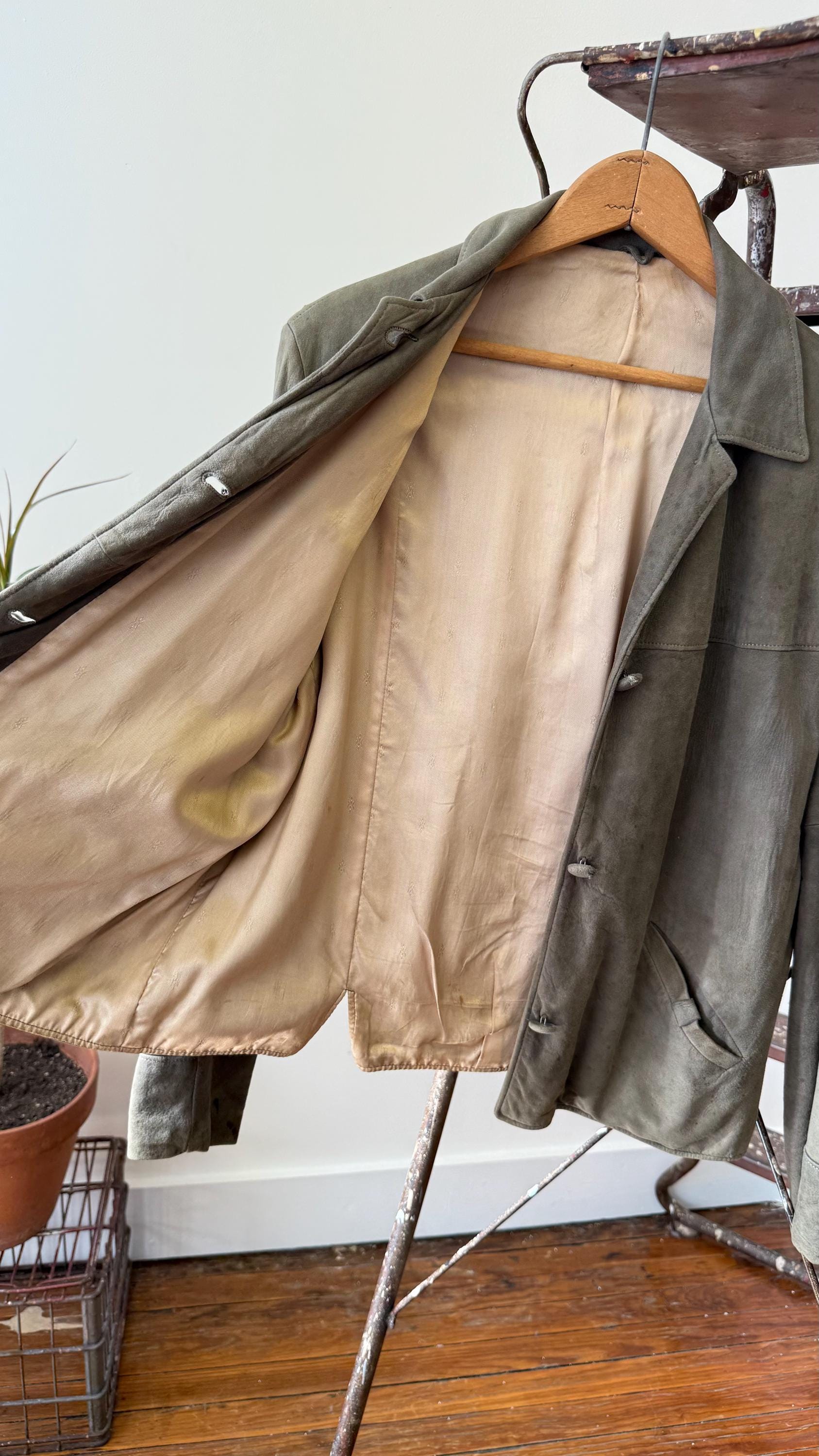 An authentic vintage suede leather jacket. made of a a super soft fine suede leather such as deerskin. features a collared neckline, matching leather covered buttons, and pockets at the waist. fully lined. no makers label. natural patina for a lived in look!