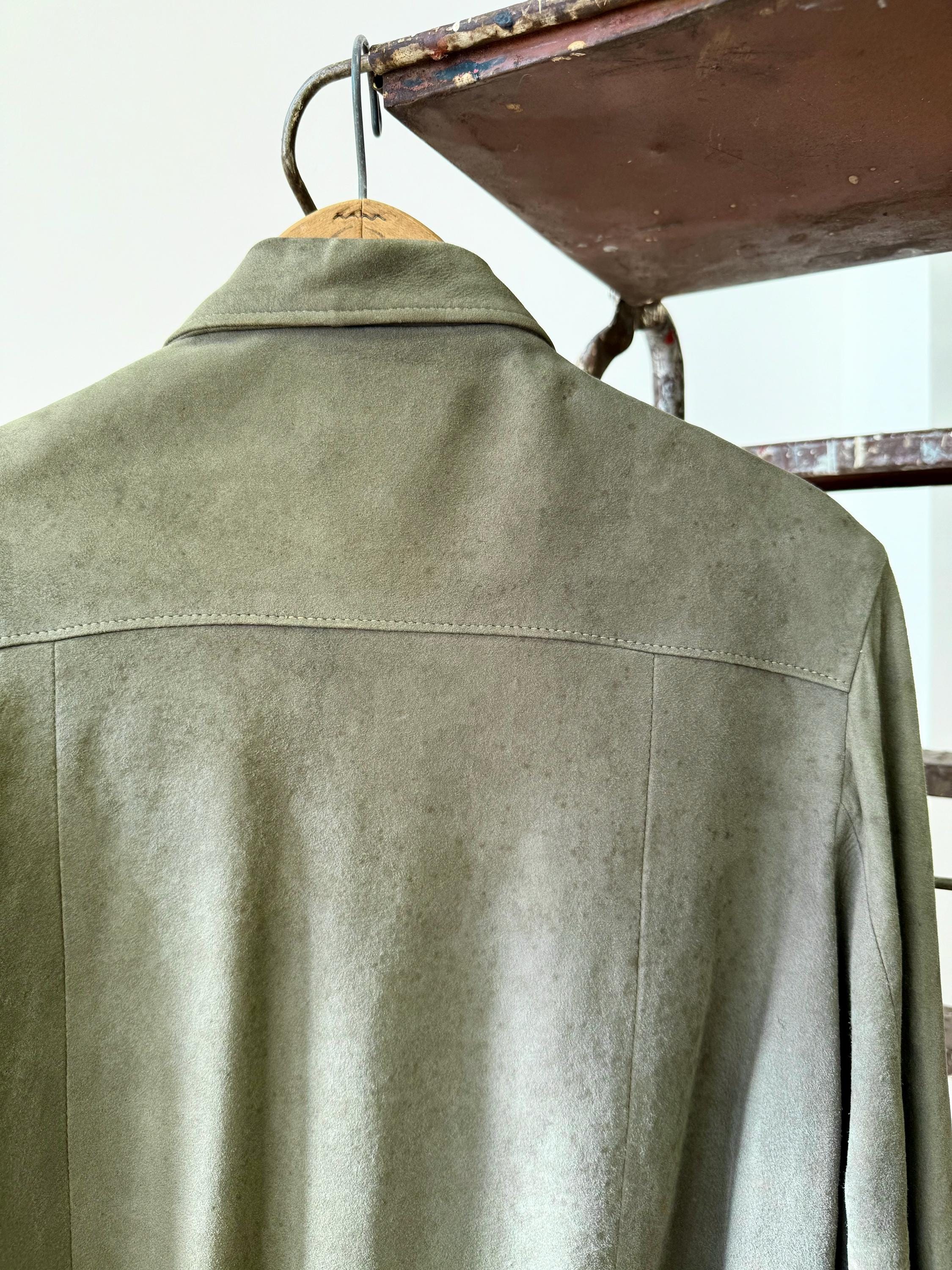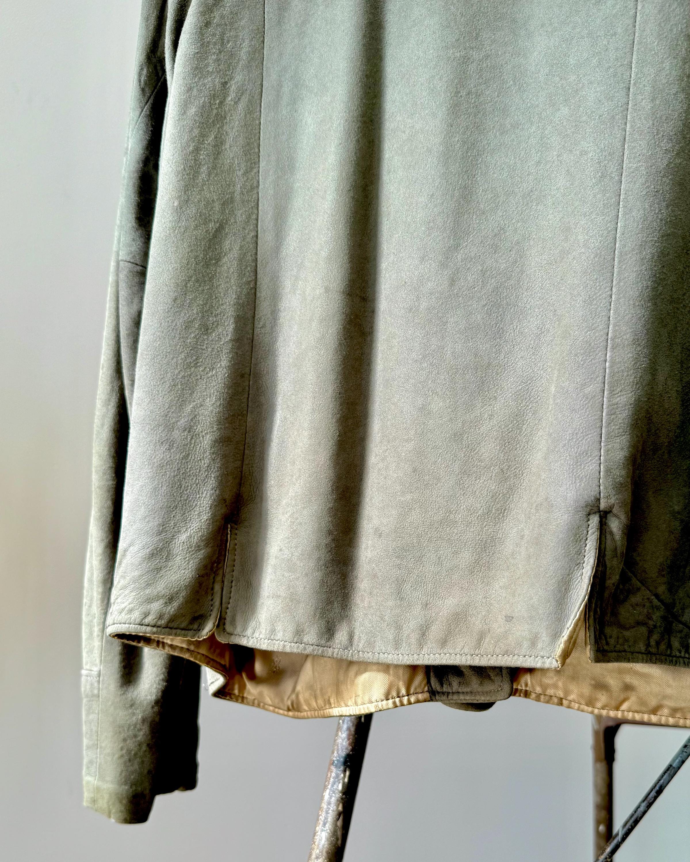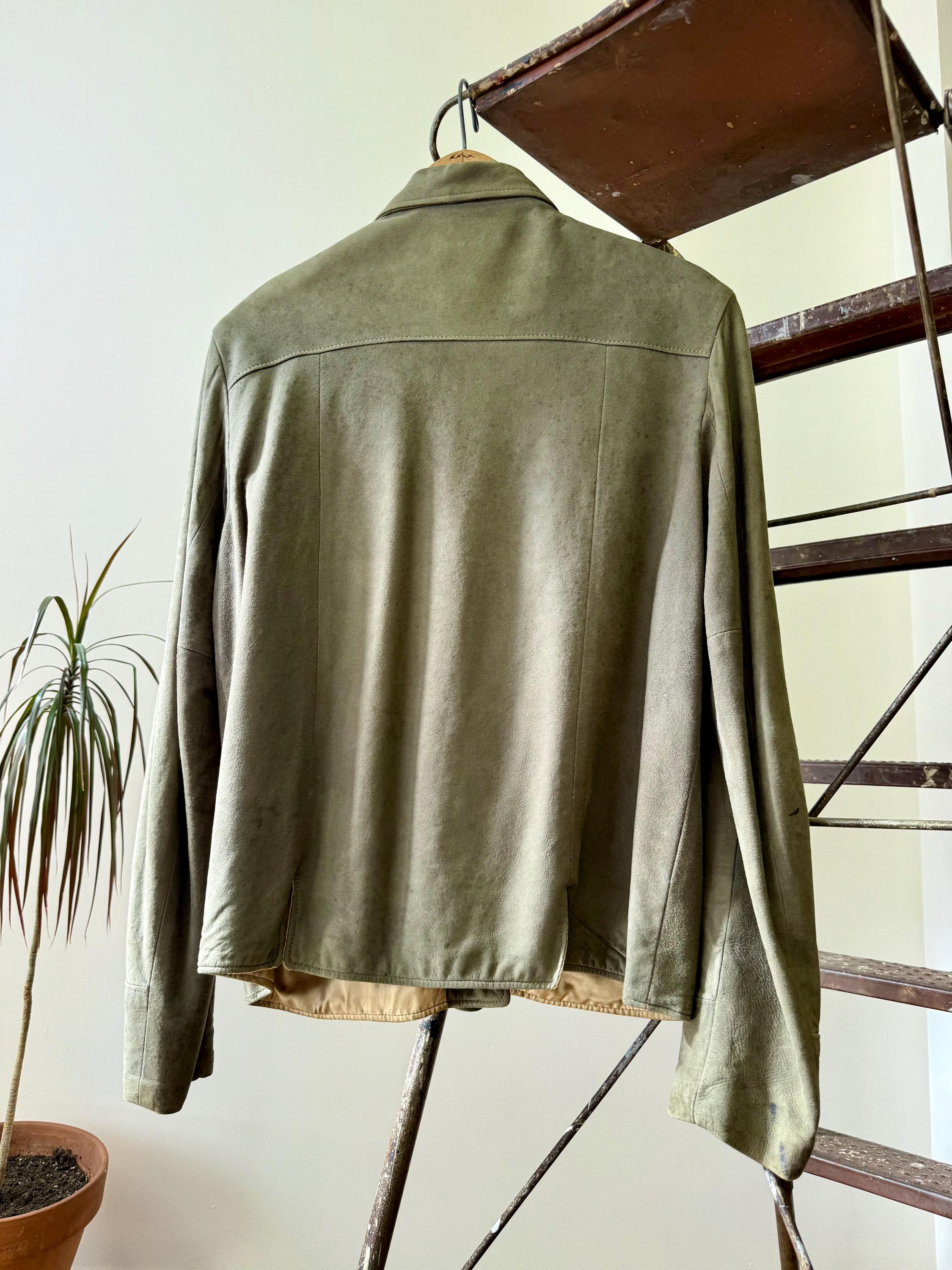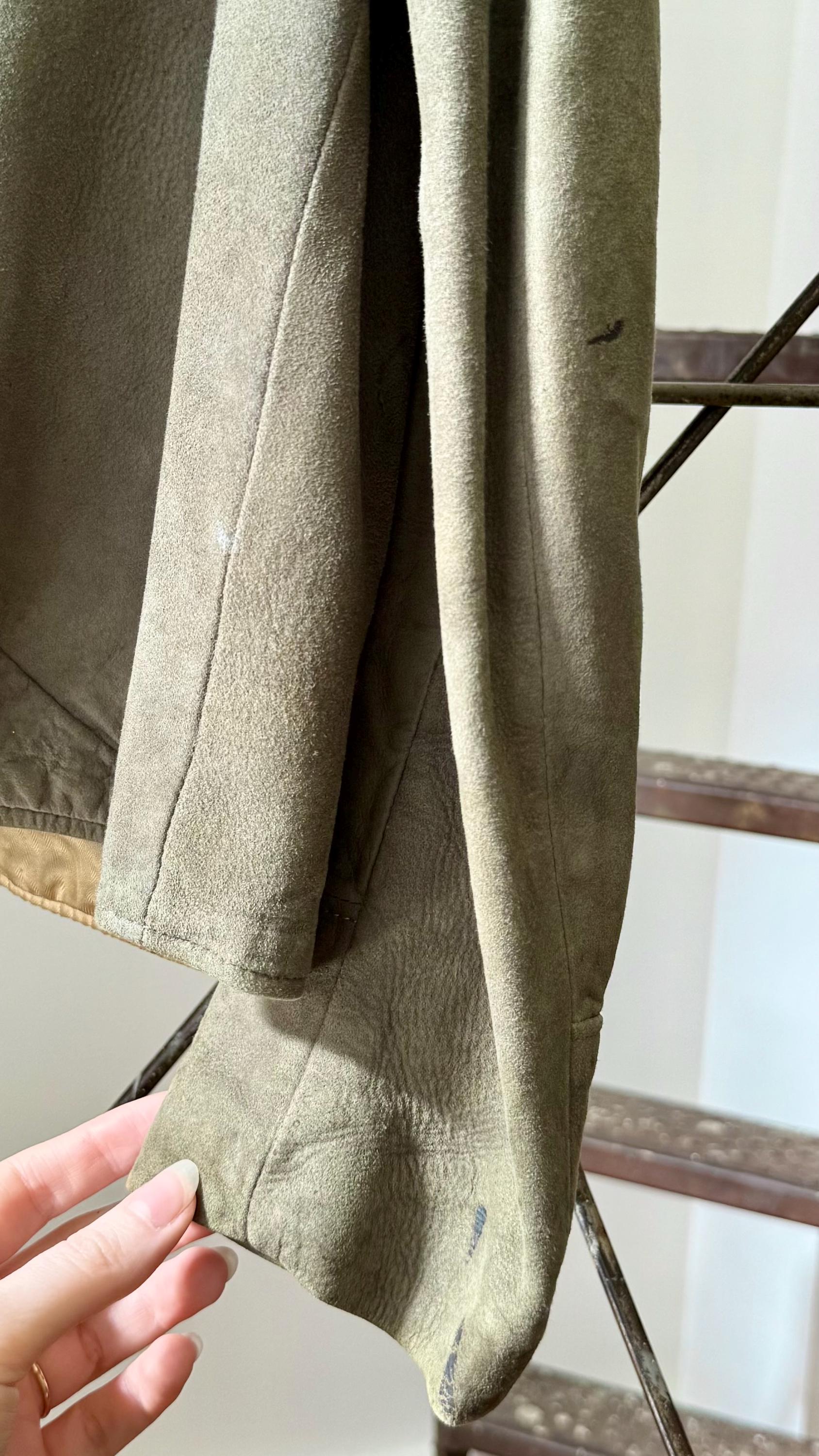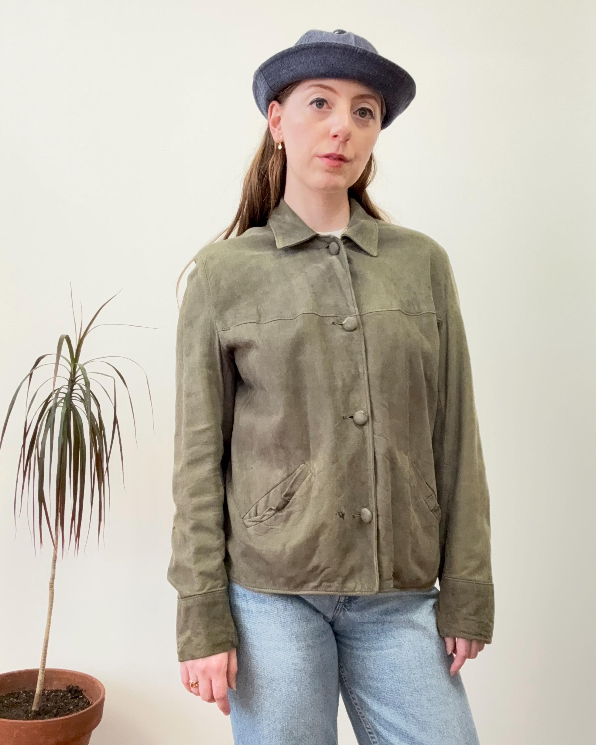 An authentic vintage suede leather jacket. made of a a super soft fine suede leather such as deerskin. features a collared neckline, matching leather covered buttons, and pockets at the waist. fully lined. no makers label. natural patina for a lived in look!