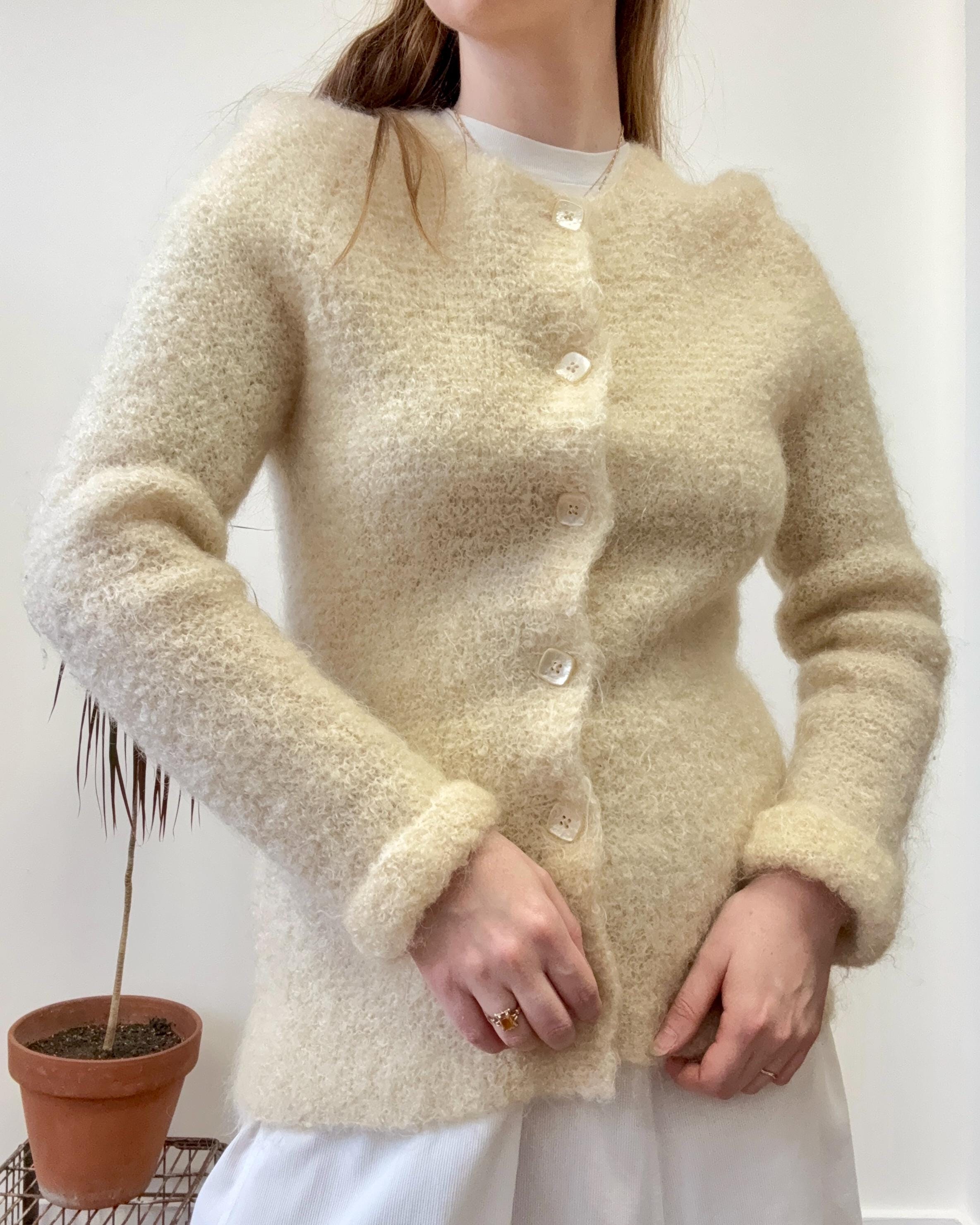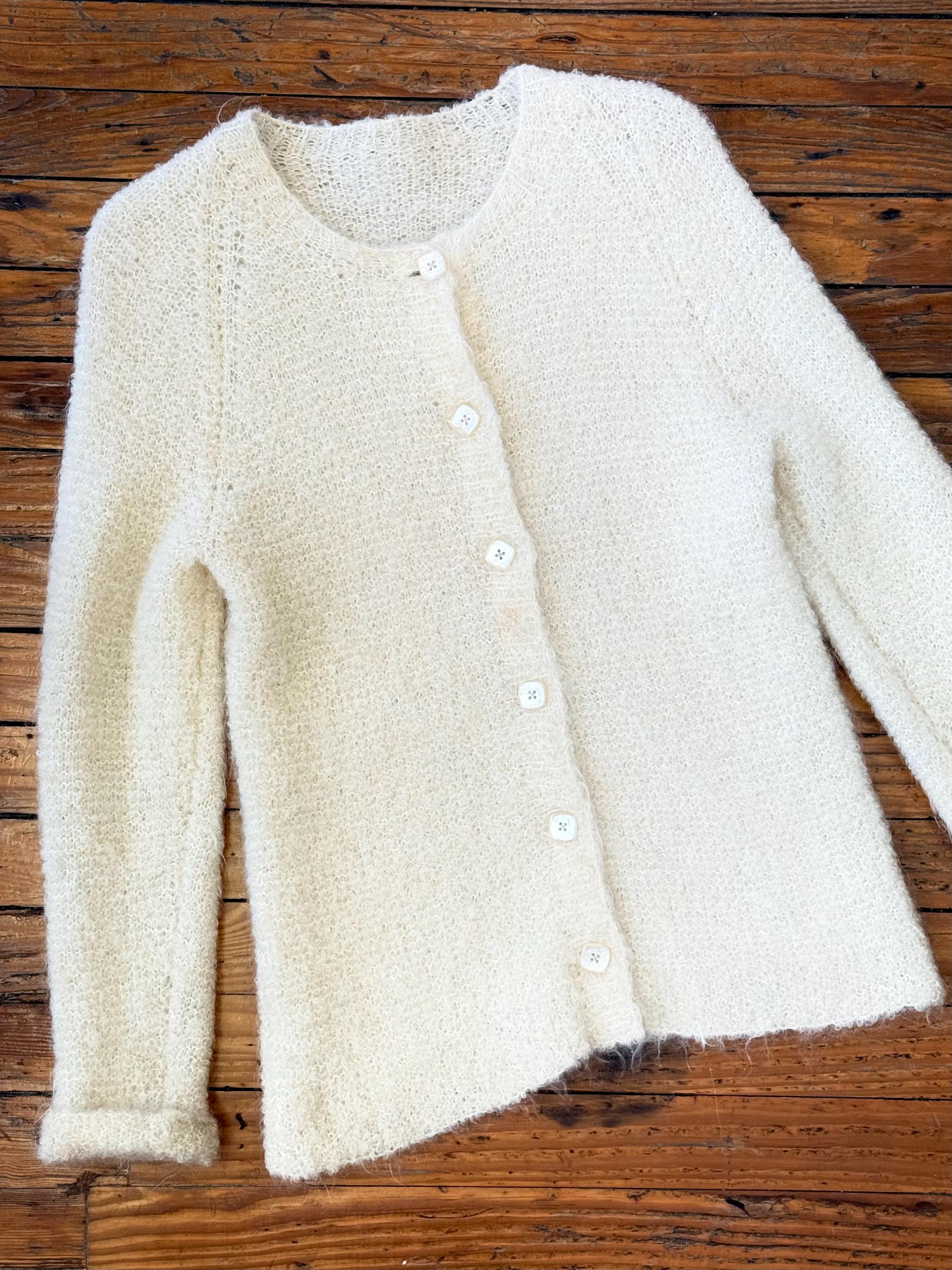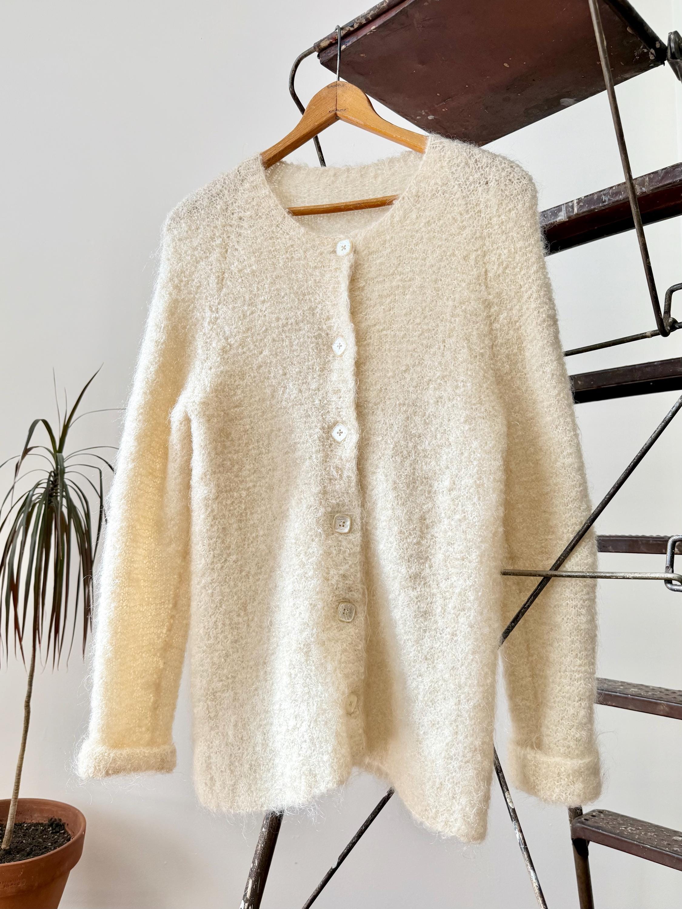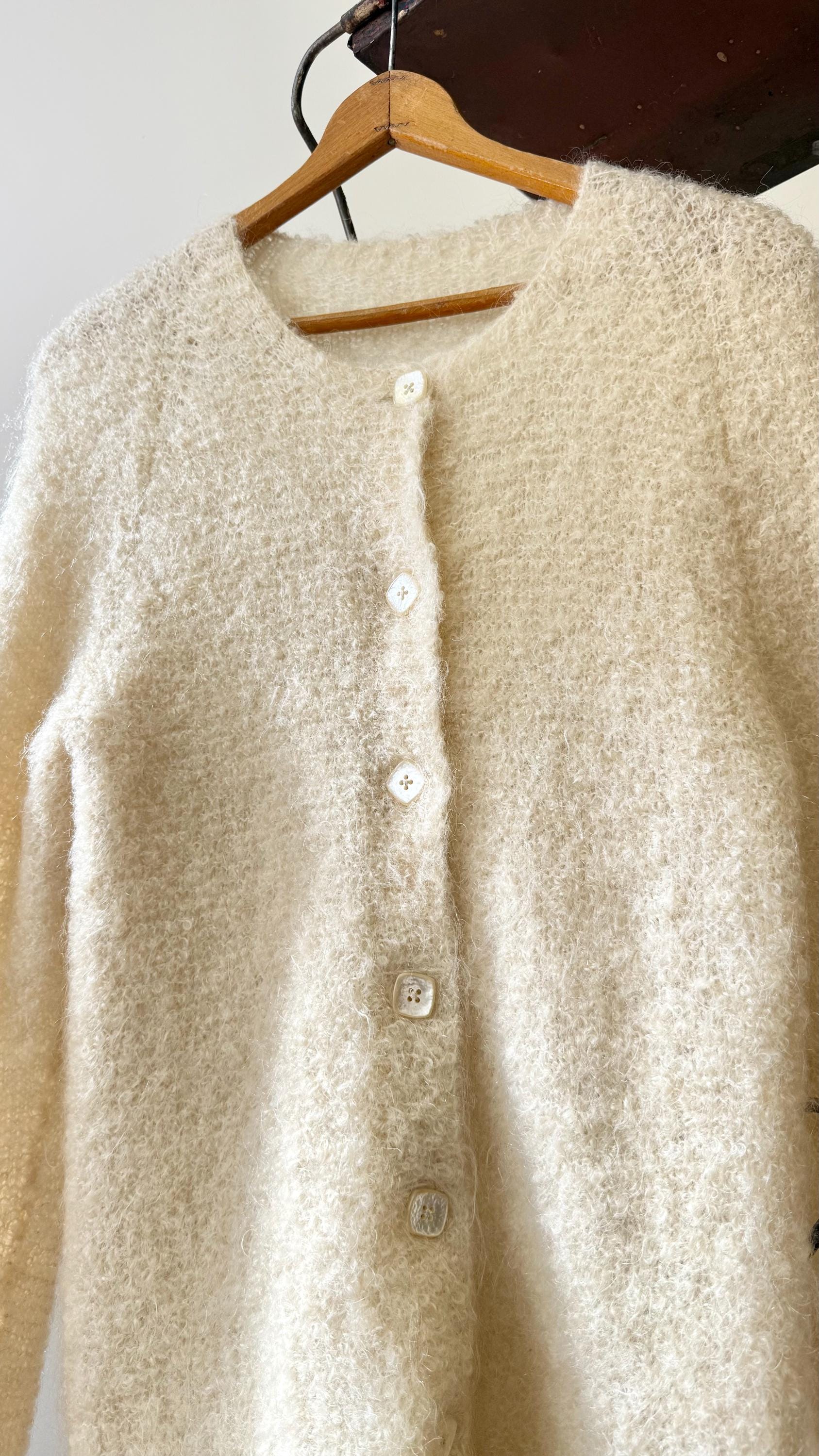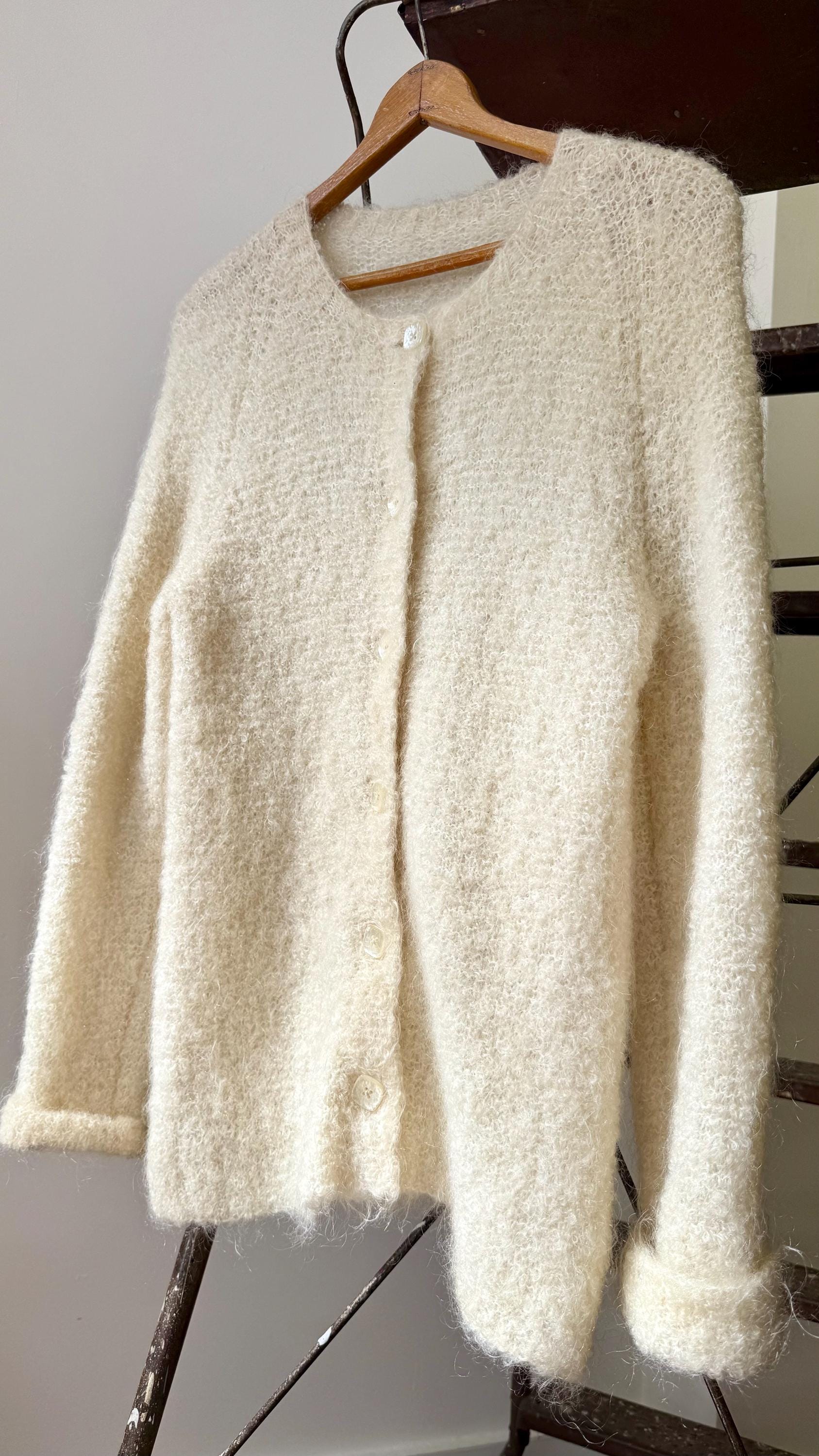 An authentic vintage cardigan sweater. an almost tailored look designed to be somewhat fitted and longer in the sleeves and total length. fastens with some really gorgeous lucite square buttons. hand knit from a natural fiber mohair yarn into a textured looped boucle pattern.