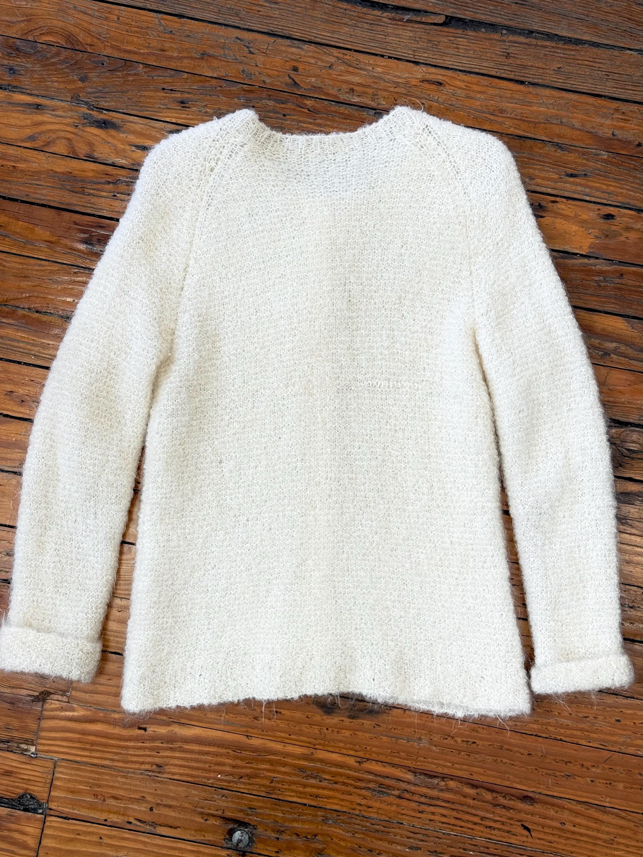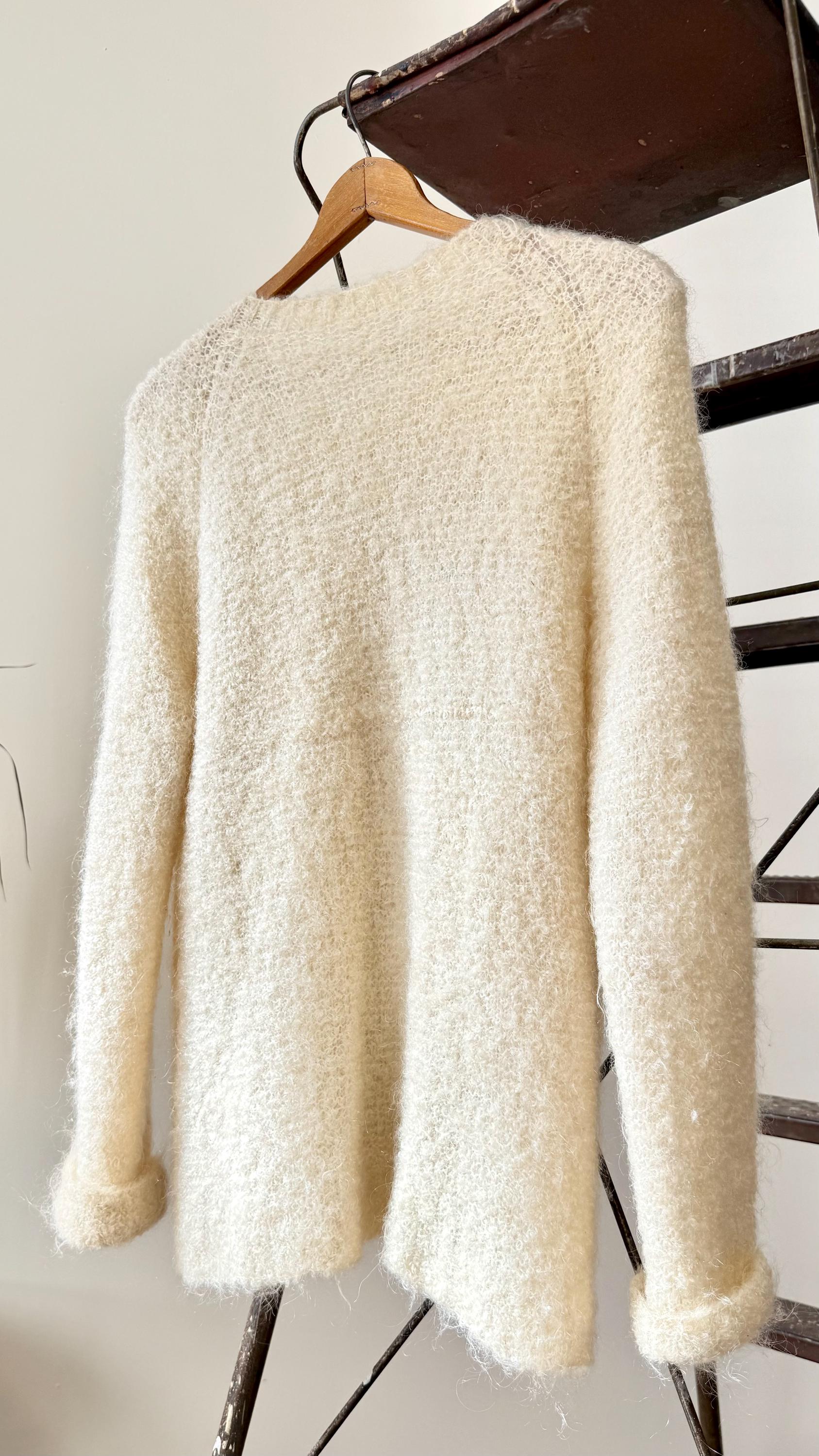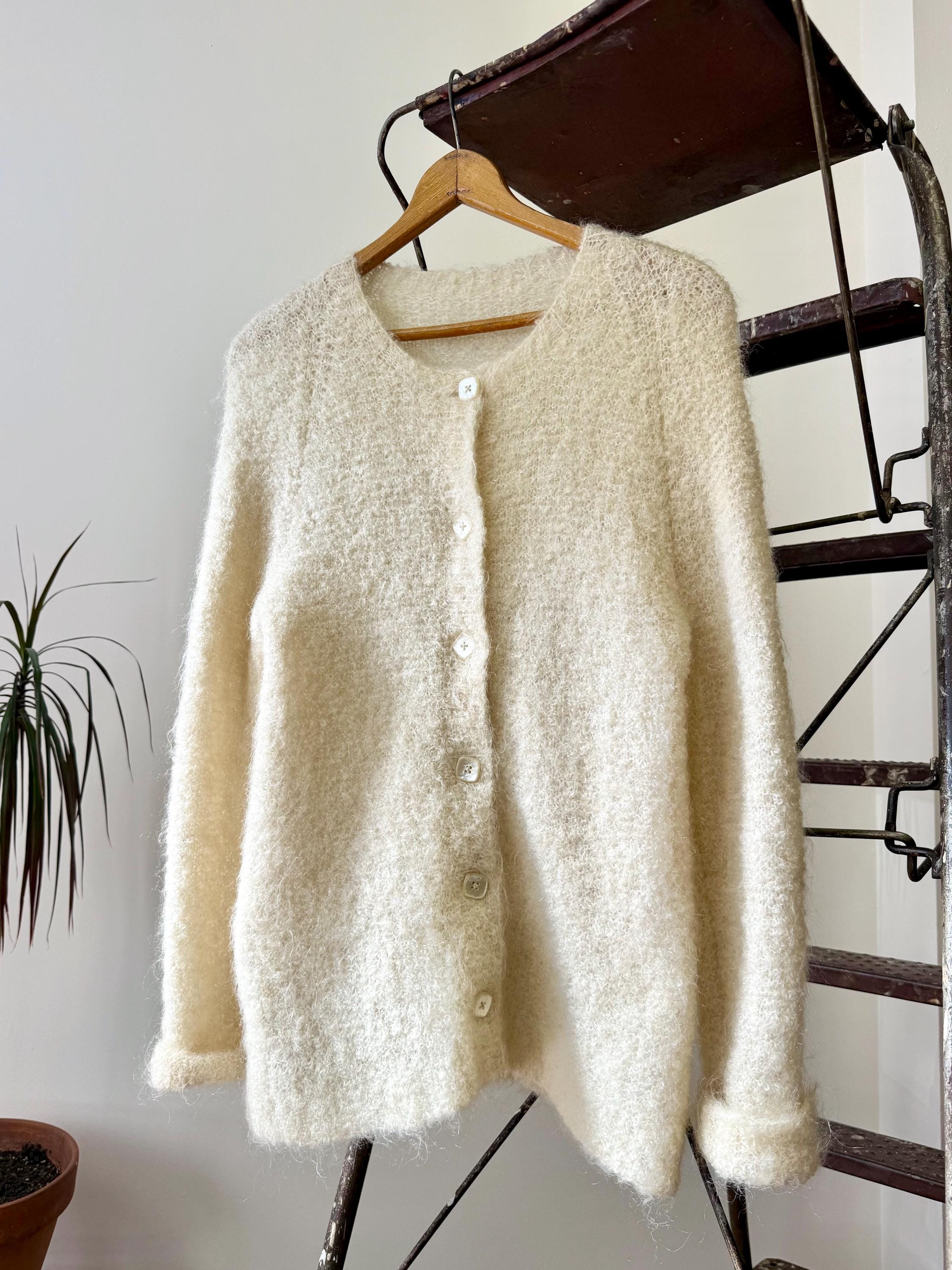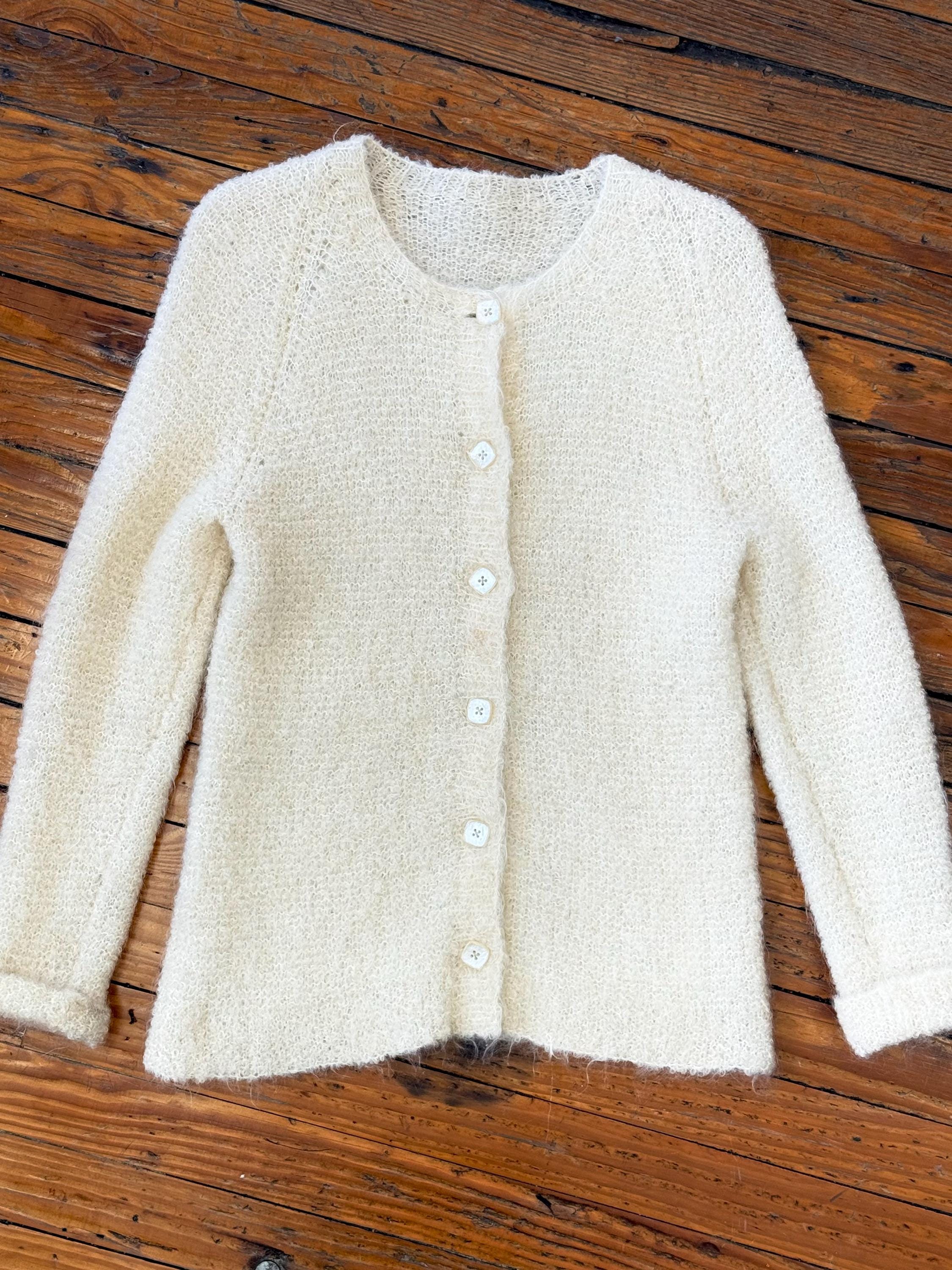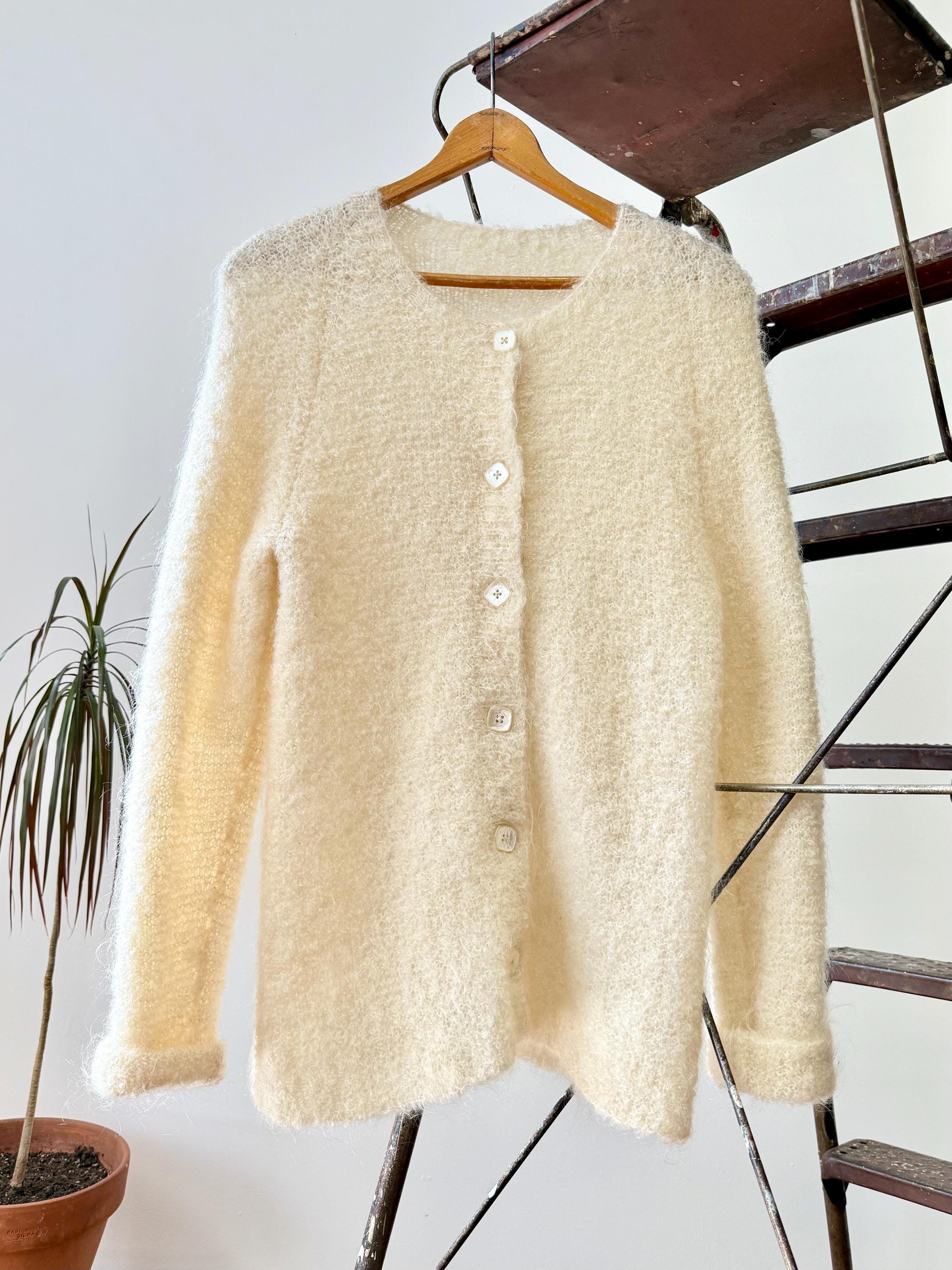 An authentic vintage cardigan sweater. an almost tailored look designed to be somewhat fitted and longer in the sleeves and total length. fastens with some really gorgeous lucite square buttons. hand knit from a natural fiber mohair yarn into a textured looped boucle pattern.