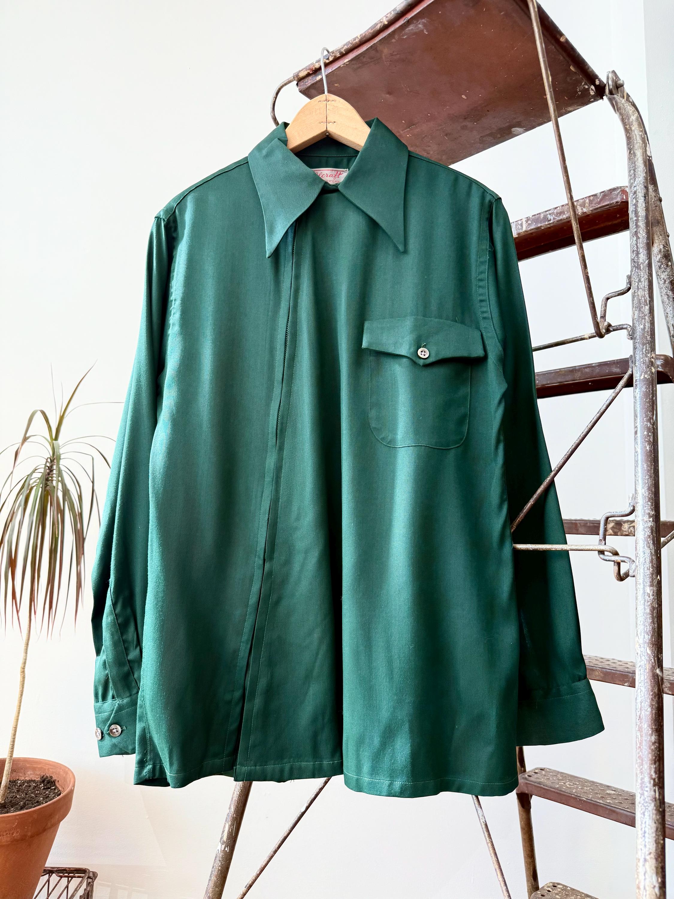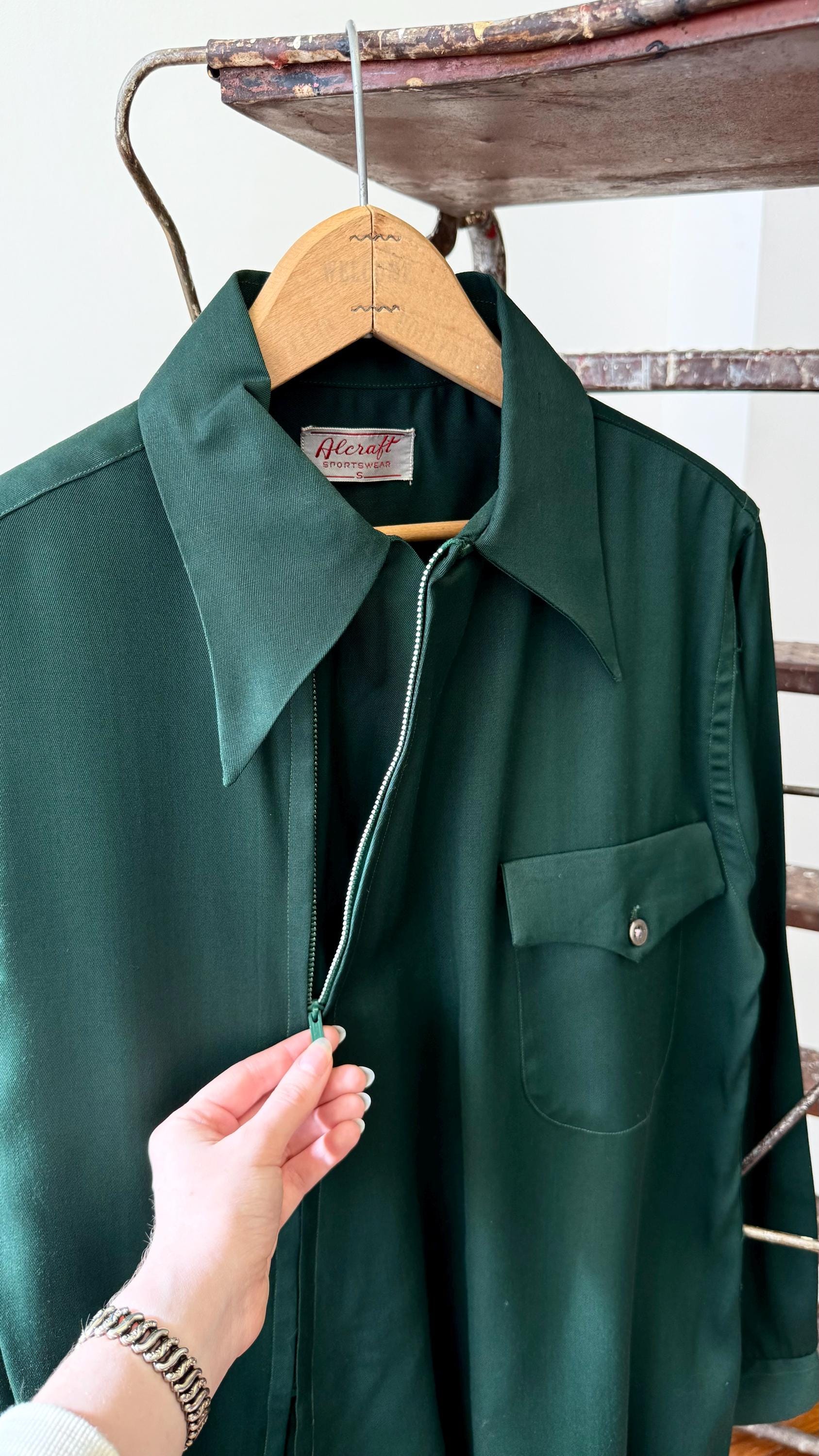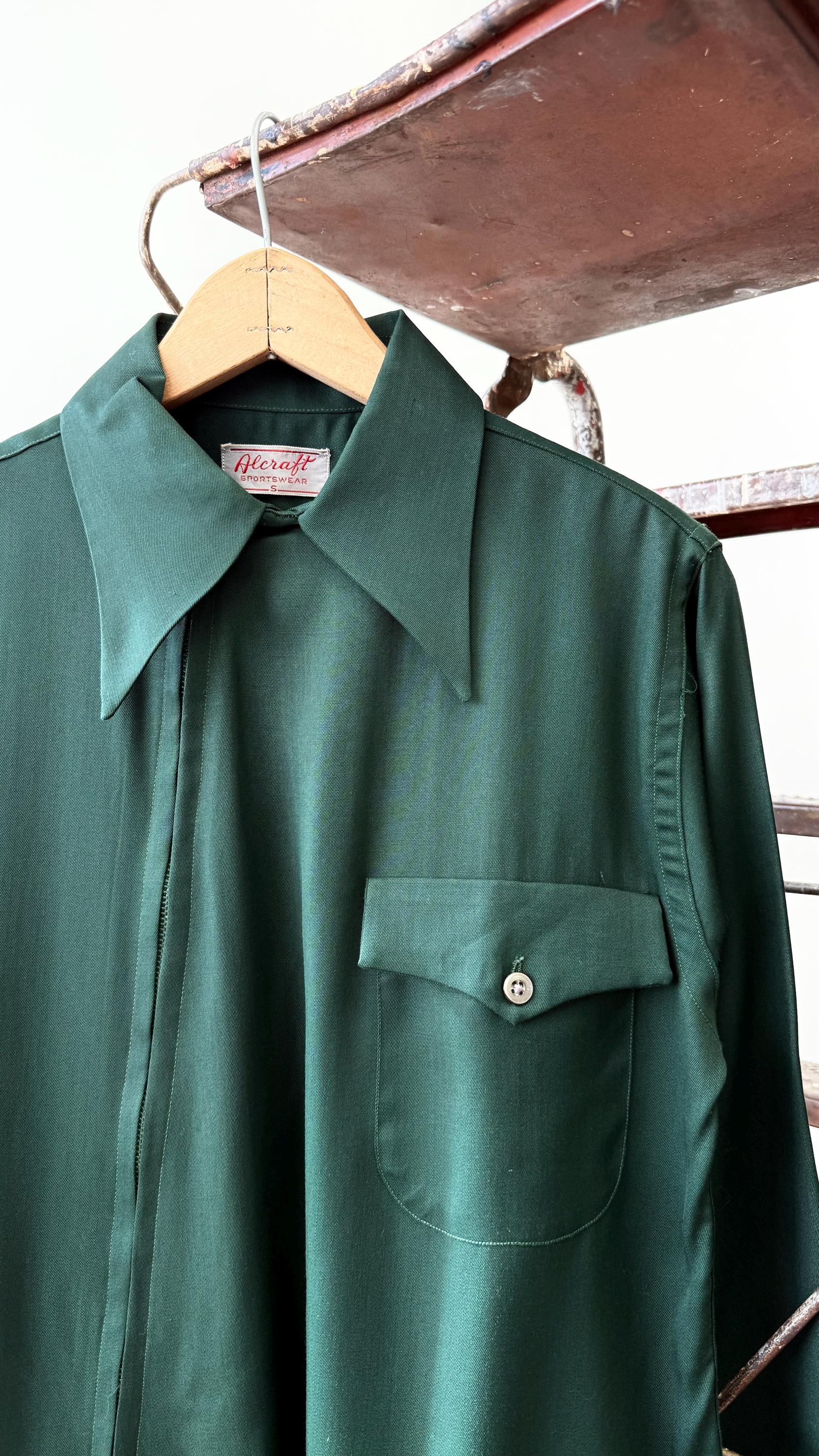 An authentic vintage mens gabardine shirt by Alcraft label. it is an unusual but fashionable design with metal zipper placed asymmetrically across the front. it also has a single chest flap pocket with button and deco style dagger collared neckline. the fabric is a fine woven twill gabardine in a rich pine green hue that drapes beautifully (one photo shows shirt with form inside to better show the width across chest). the fit is wide and loose, a popular early midcentury look. overall its a really incredible piece sure to elevate an outfit!