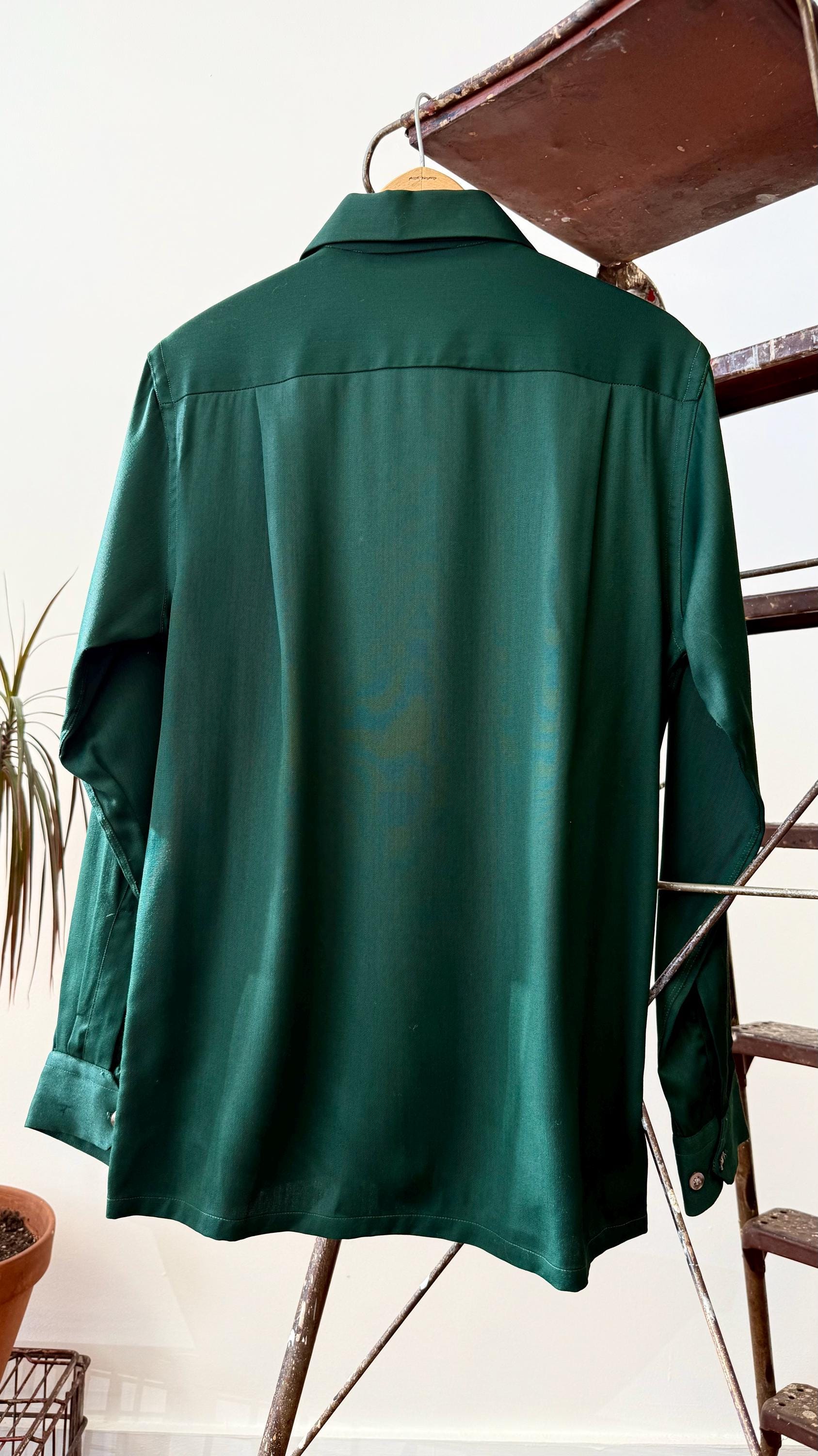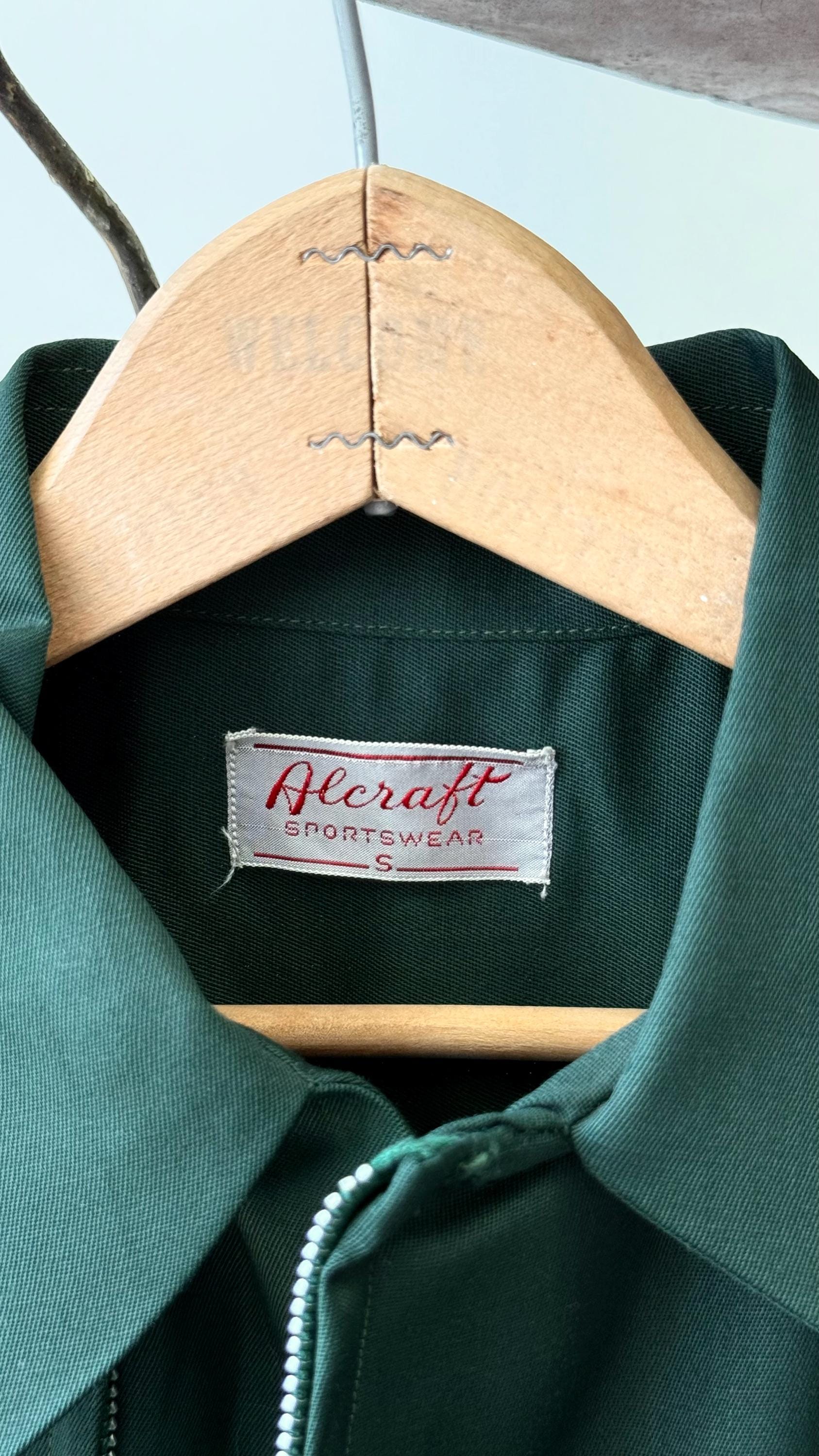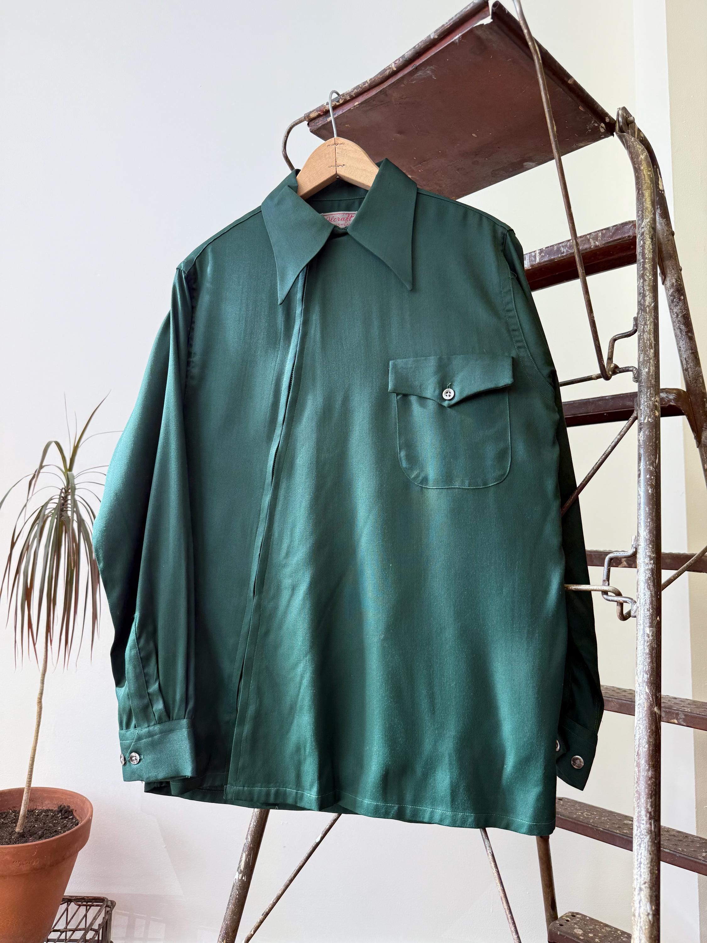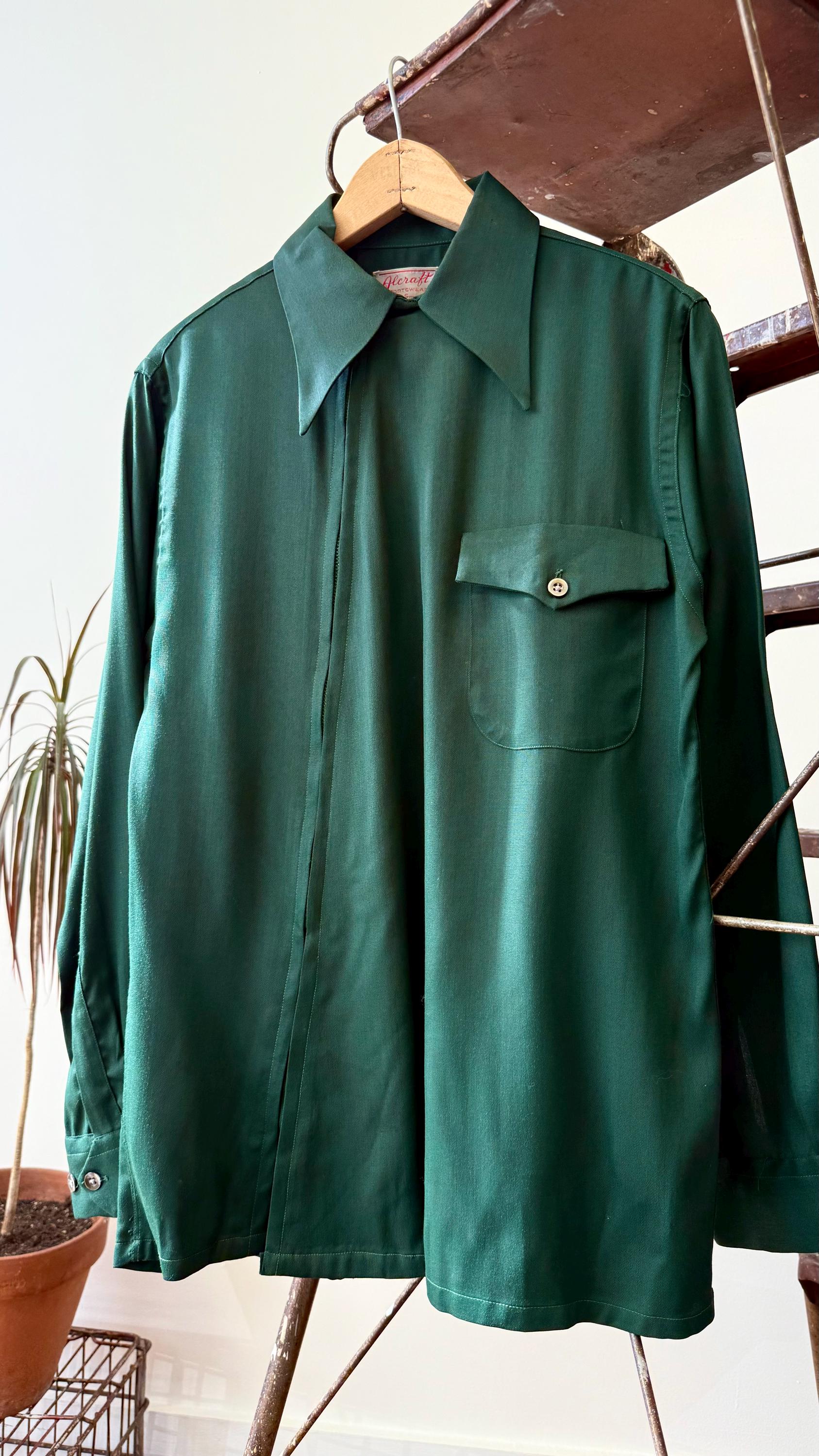 An authentic vintage mens gabardine shirt by Alcraft label. it is an unusual but fashionable design with metal zipper placed asymmetrically across the front. it also has a single chest flap pocket with button and deco style dagger collared neckline. the fabric is a fine woven twill gabardine in a rich pine green hue that drapes beautifully (one photo shows shirt with form inside to better show the width across chest). the fit is wide and loose, a popular early midcentury look. overall its a really incredible piece sure to elevate an outfit!