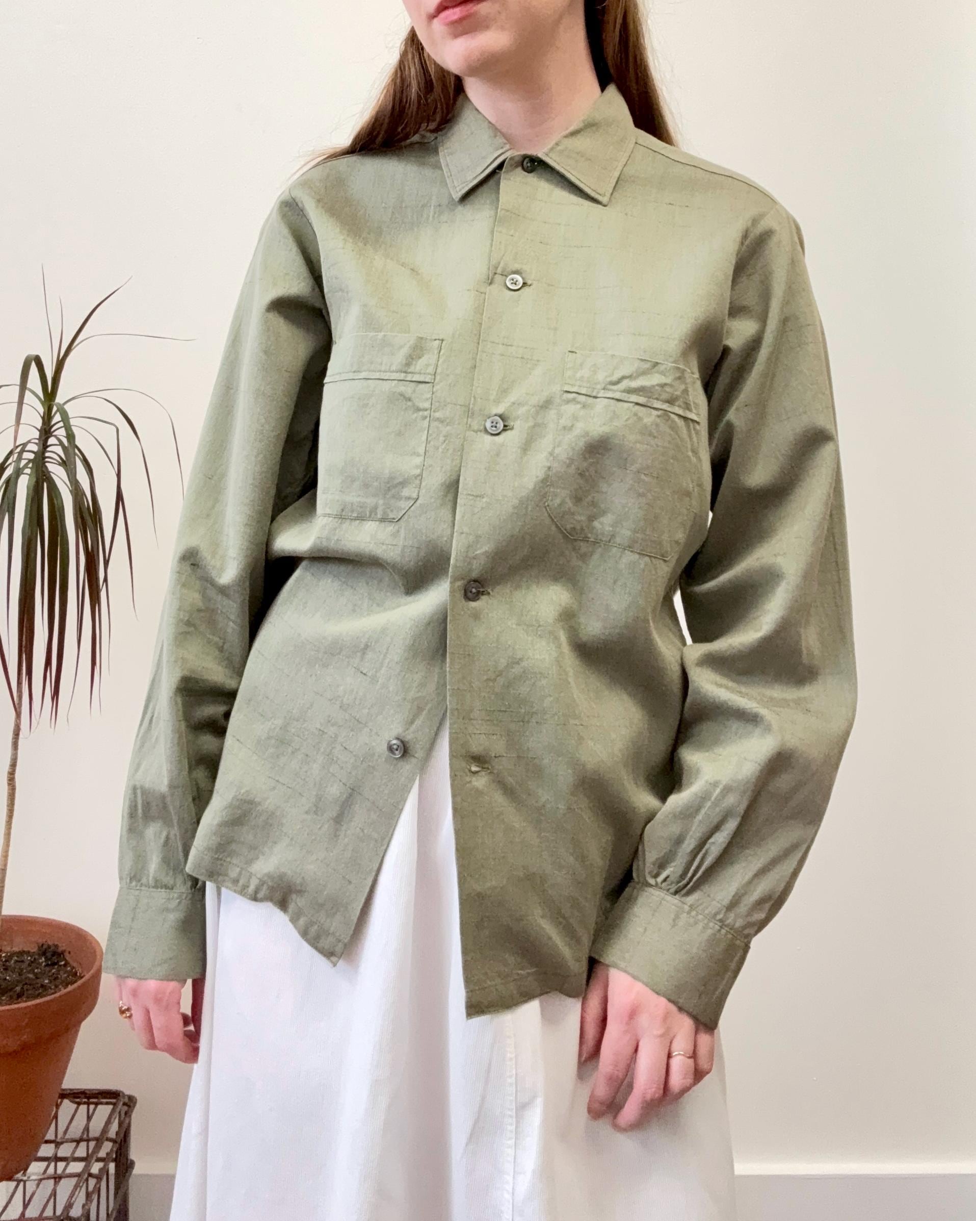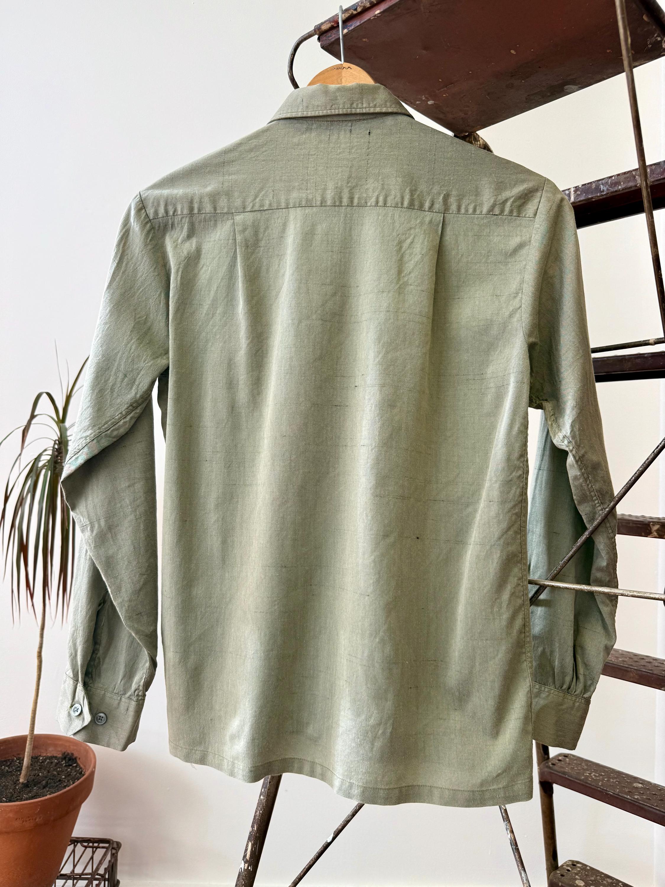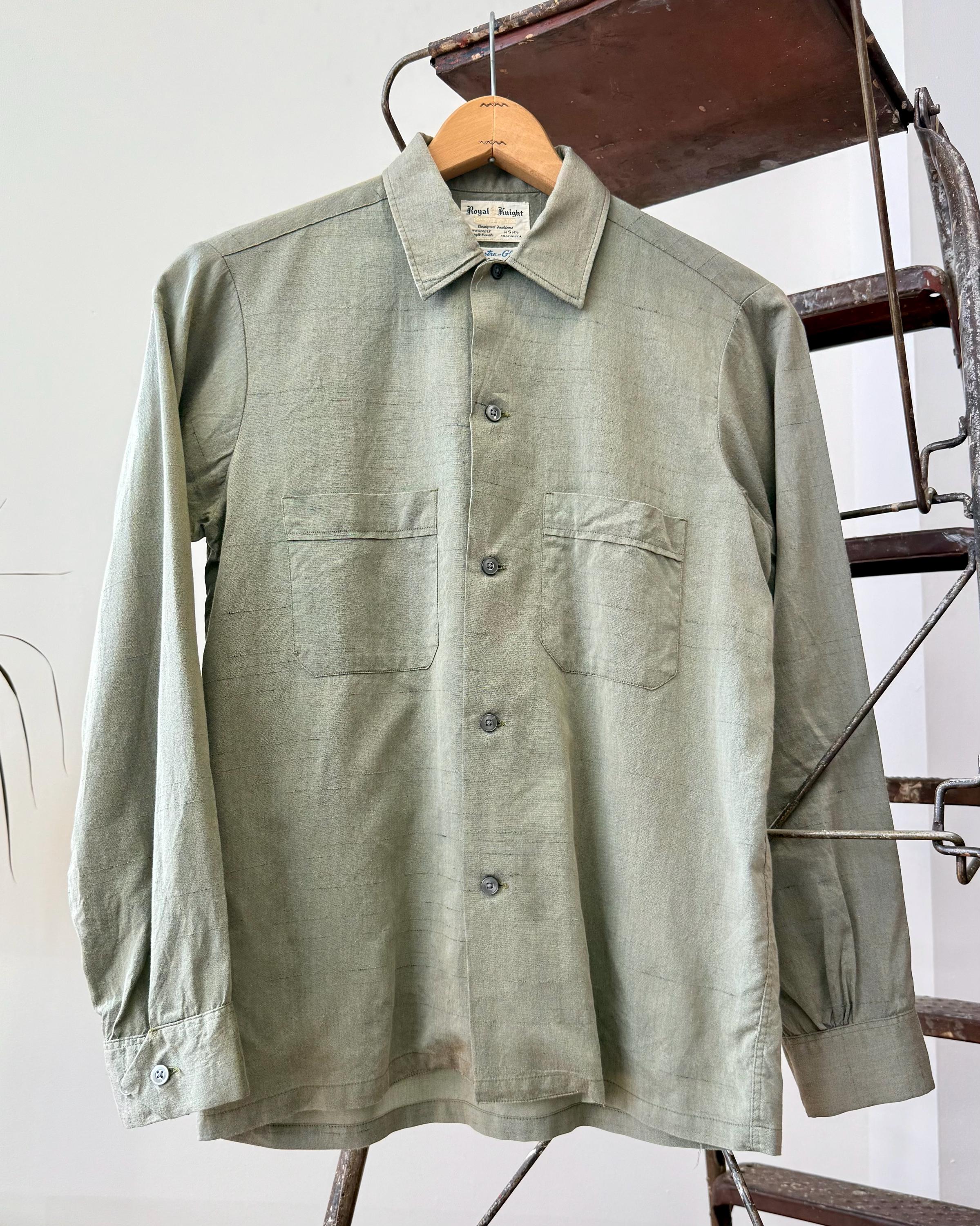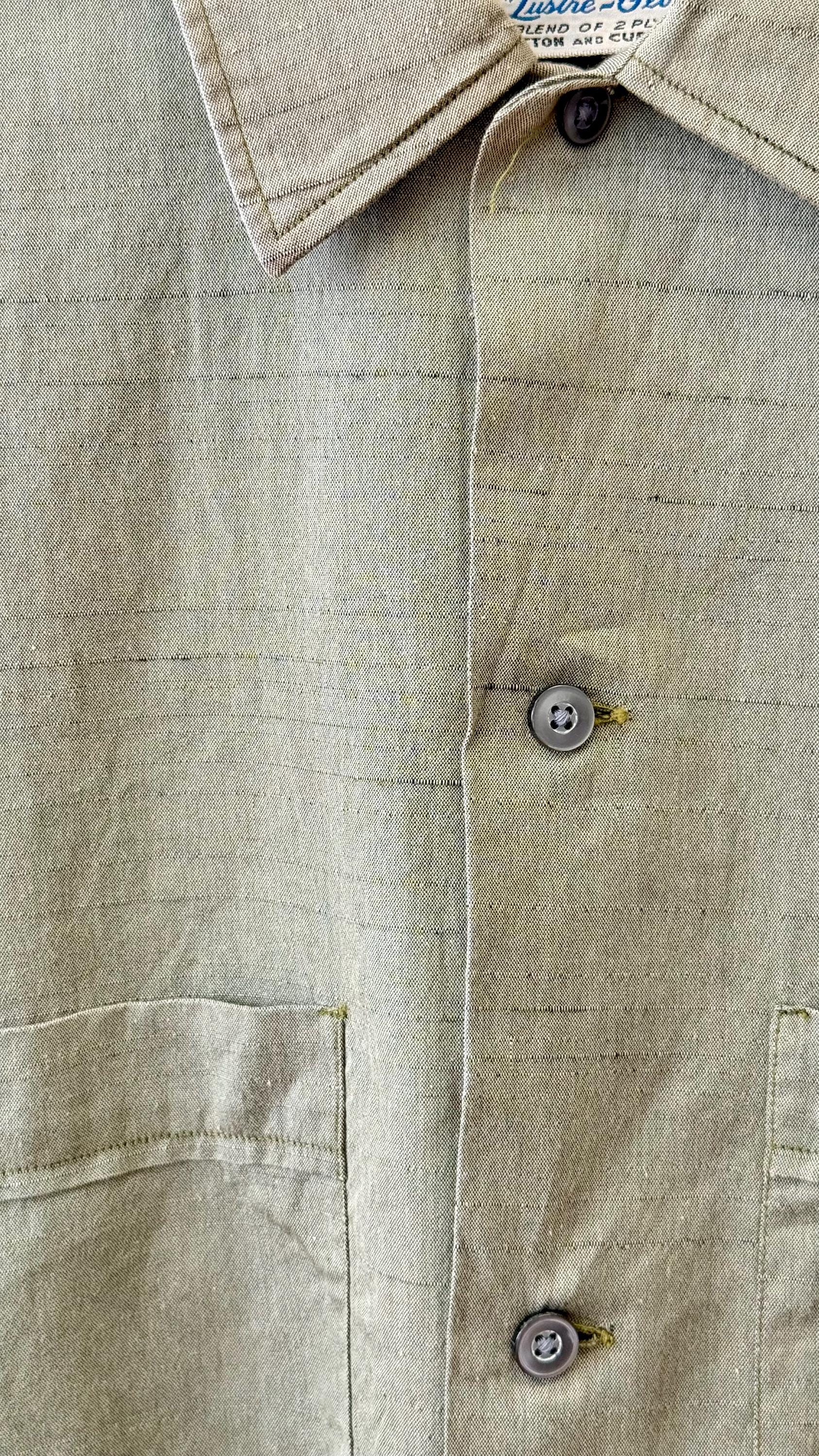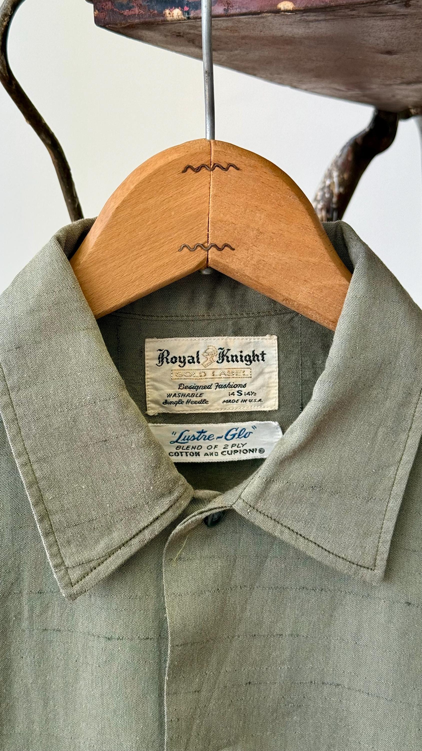 An authentic vintage mens shirt by Royal Knit label. crafted from a fine Lustre-Glo fabric, a blend of cotton and “Cupioni” (rayon) that and a slight texture and shimmer that almost looks metallic! a classic straight fit button front shirt that is a great gender neutral style!