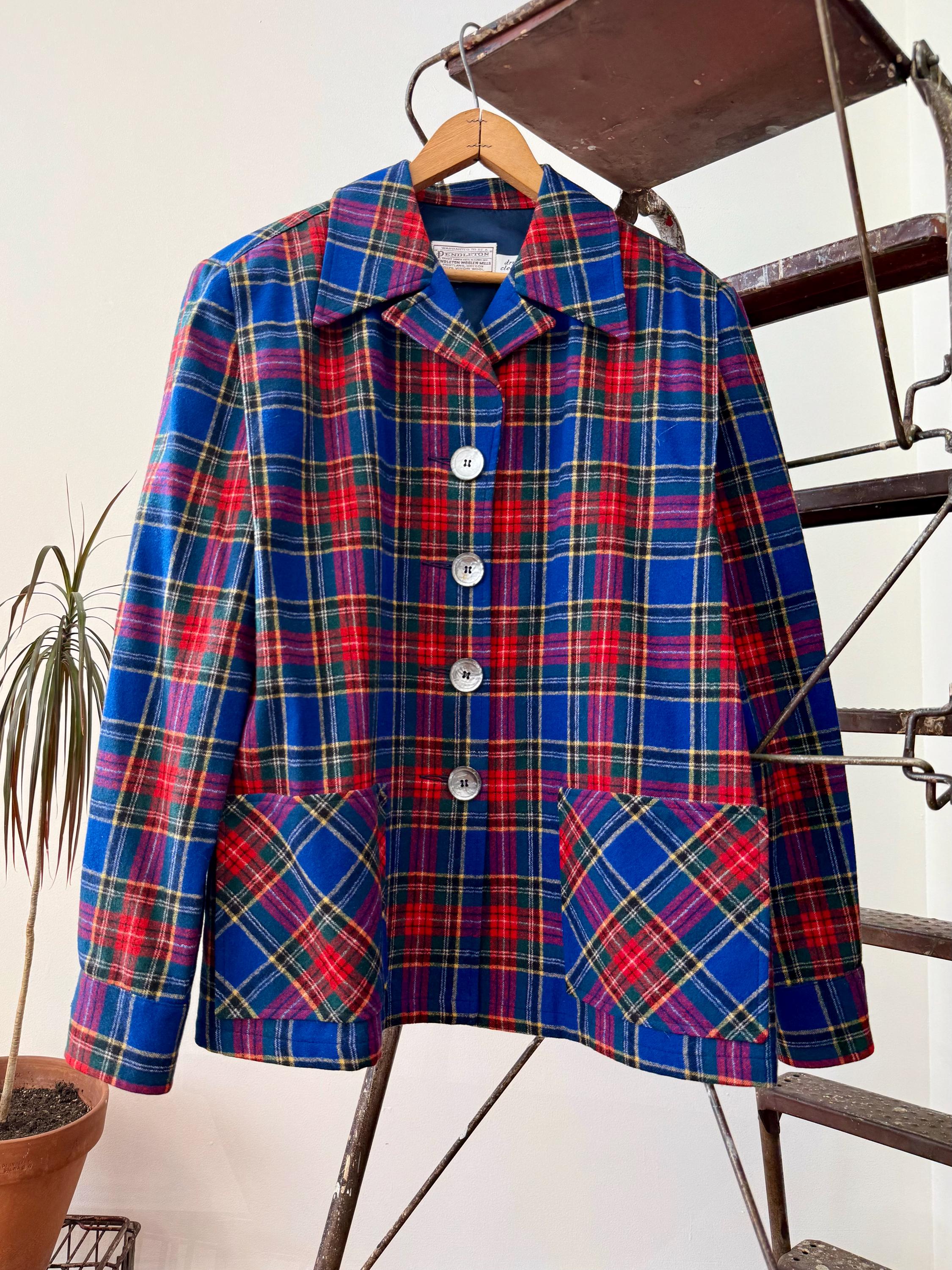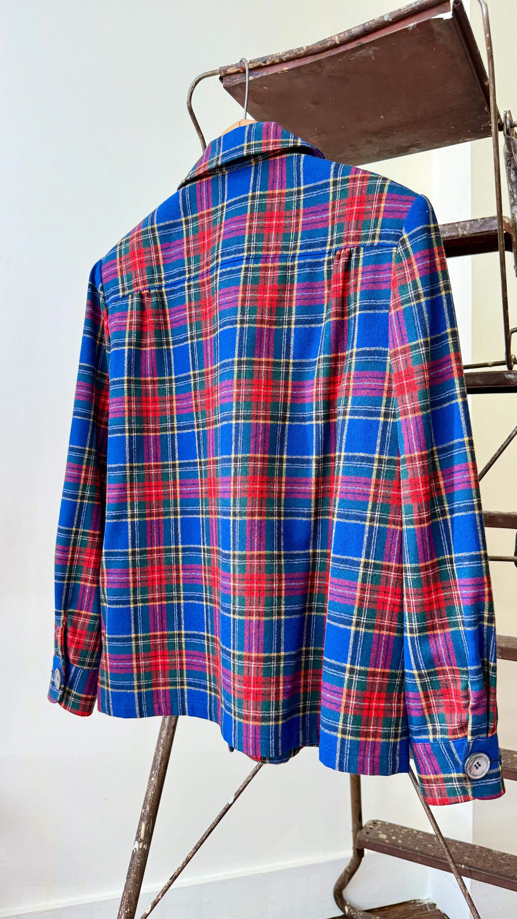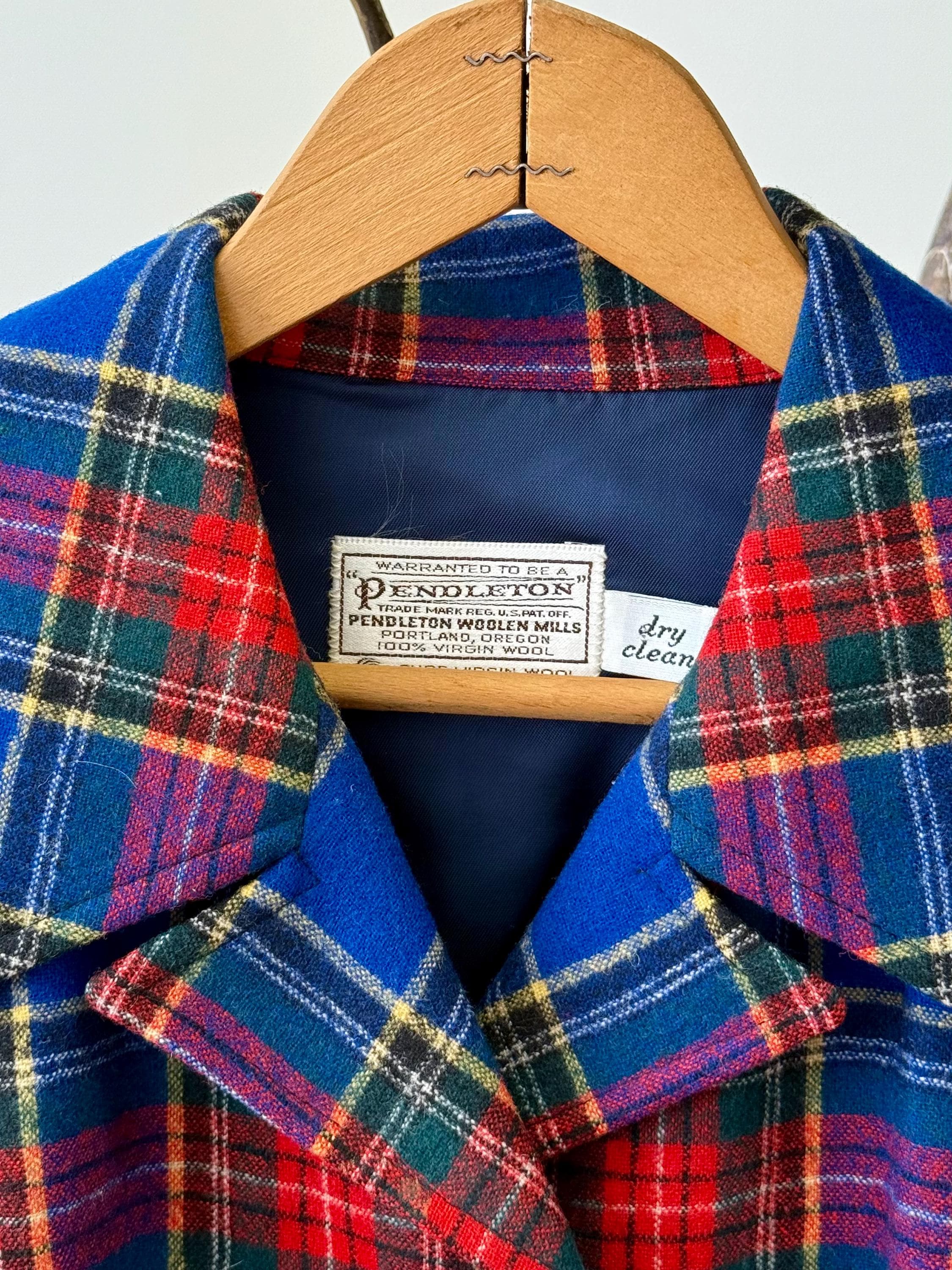 An authentic vintage Pendleton 49er jacket. a later version styled after the original midcentury design. this one has a bright primary colored plaid pattern. a classic!