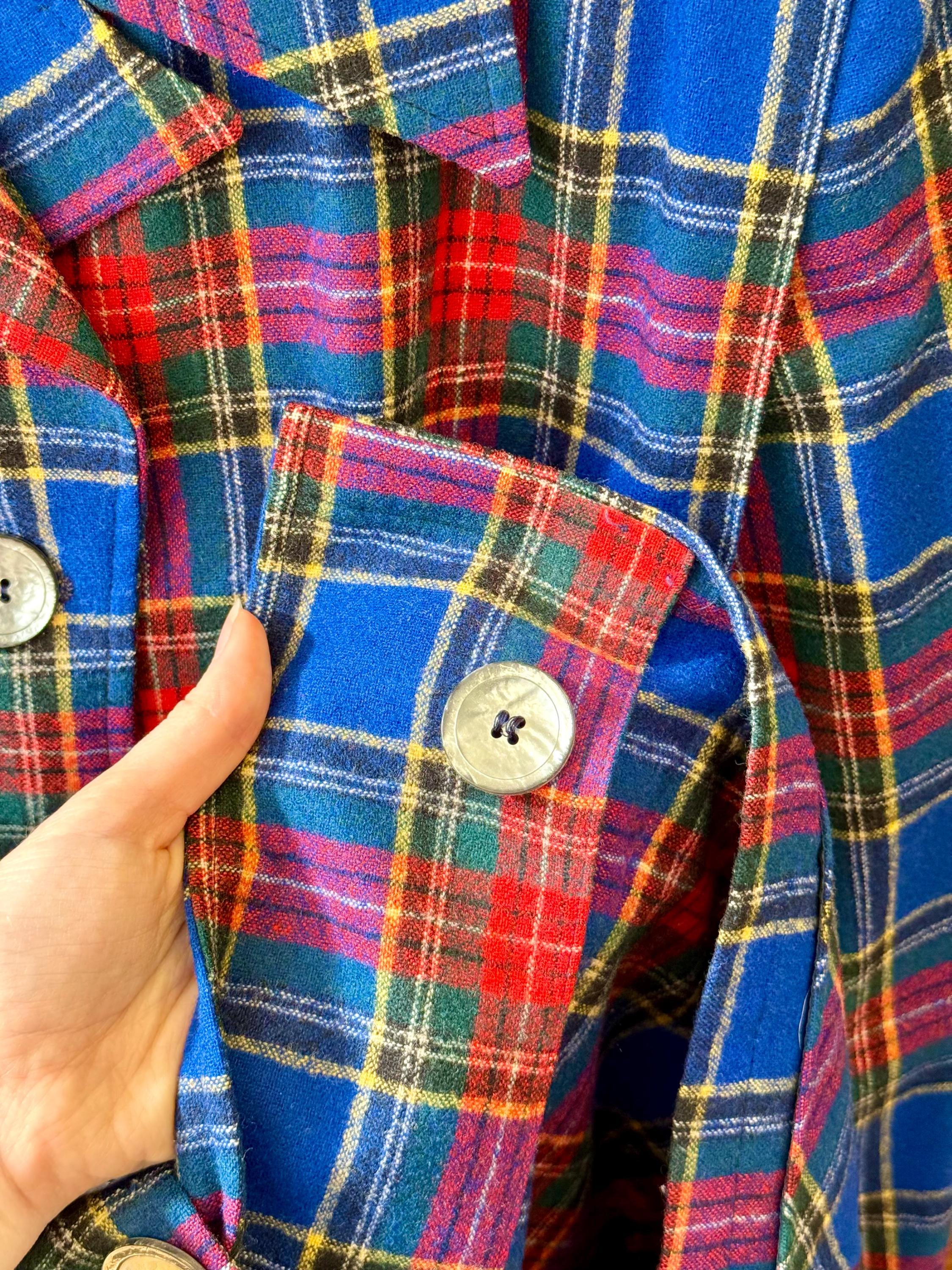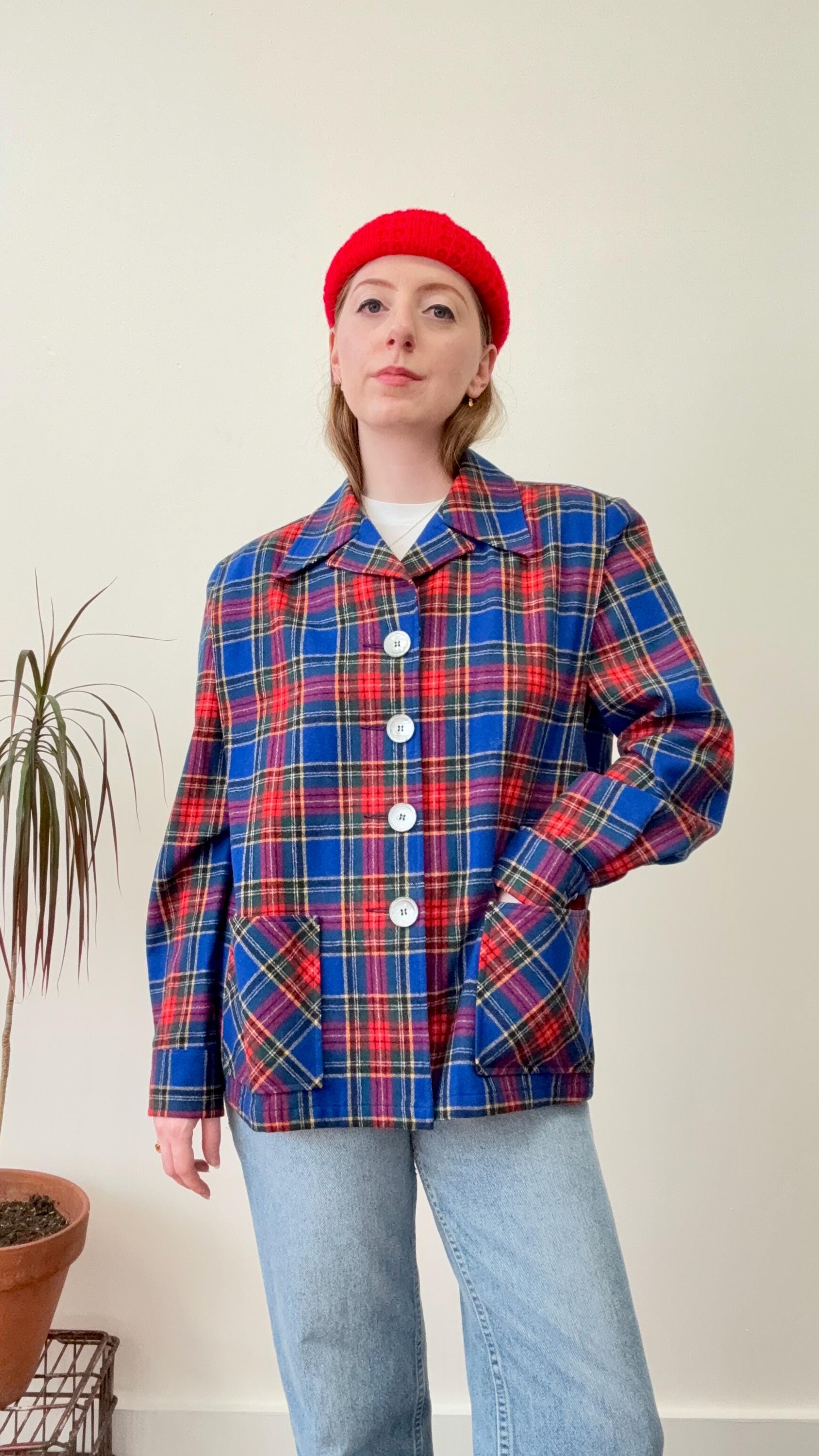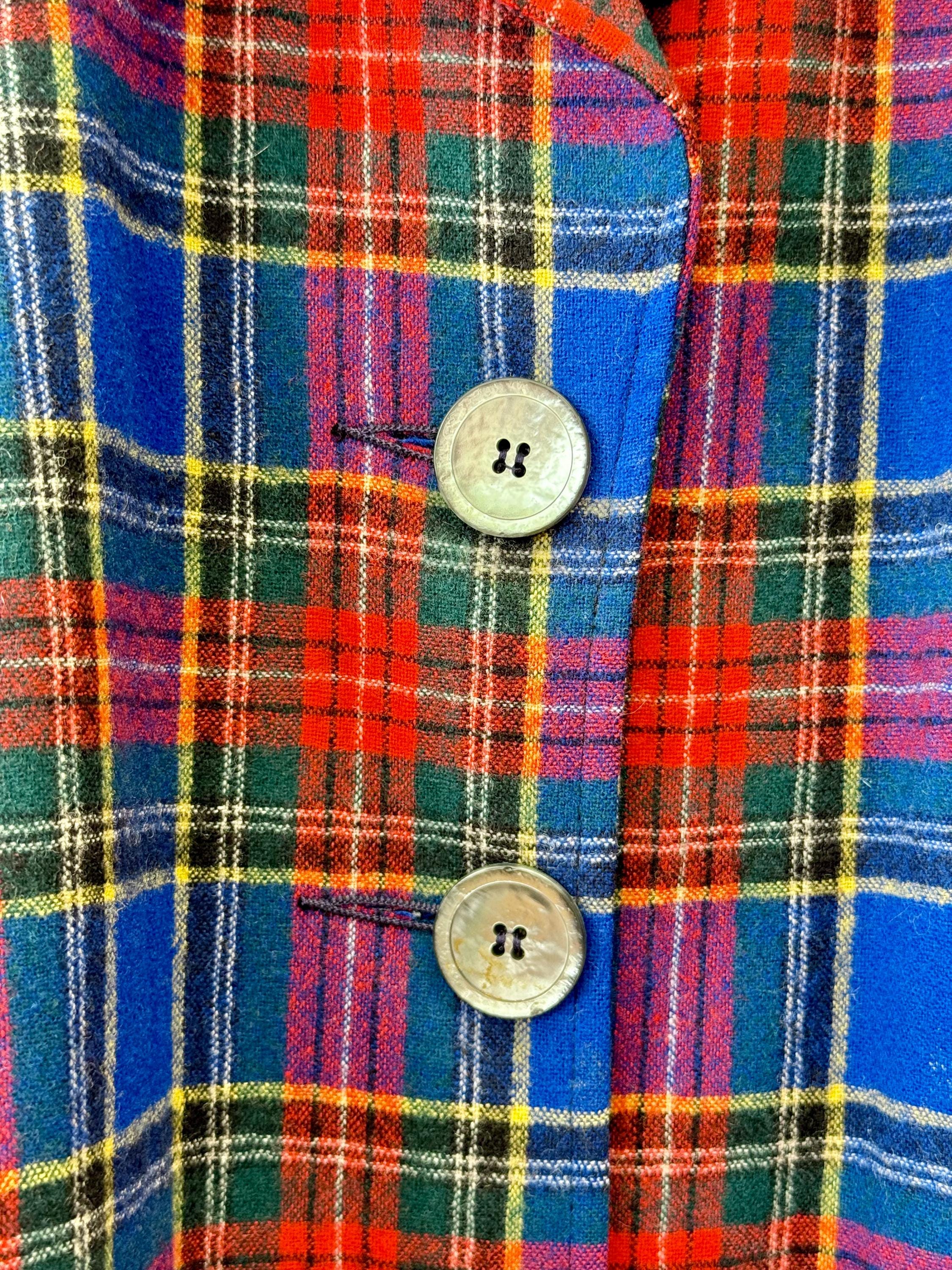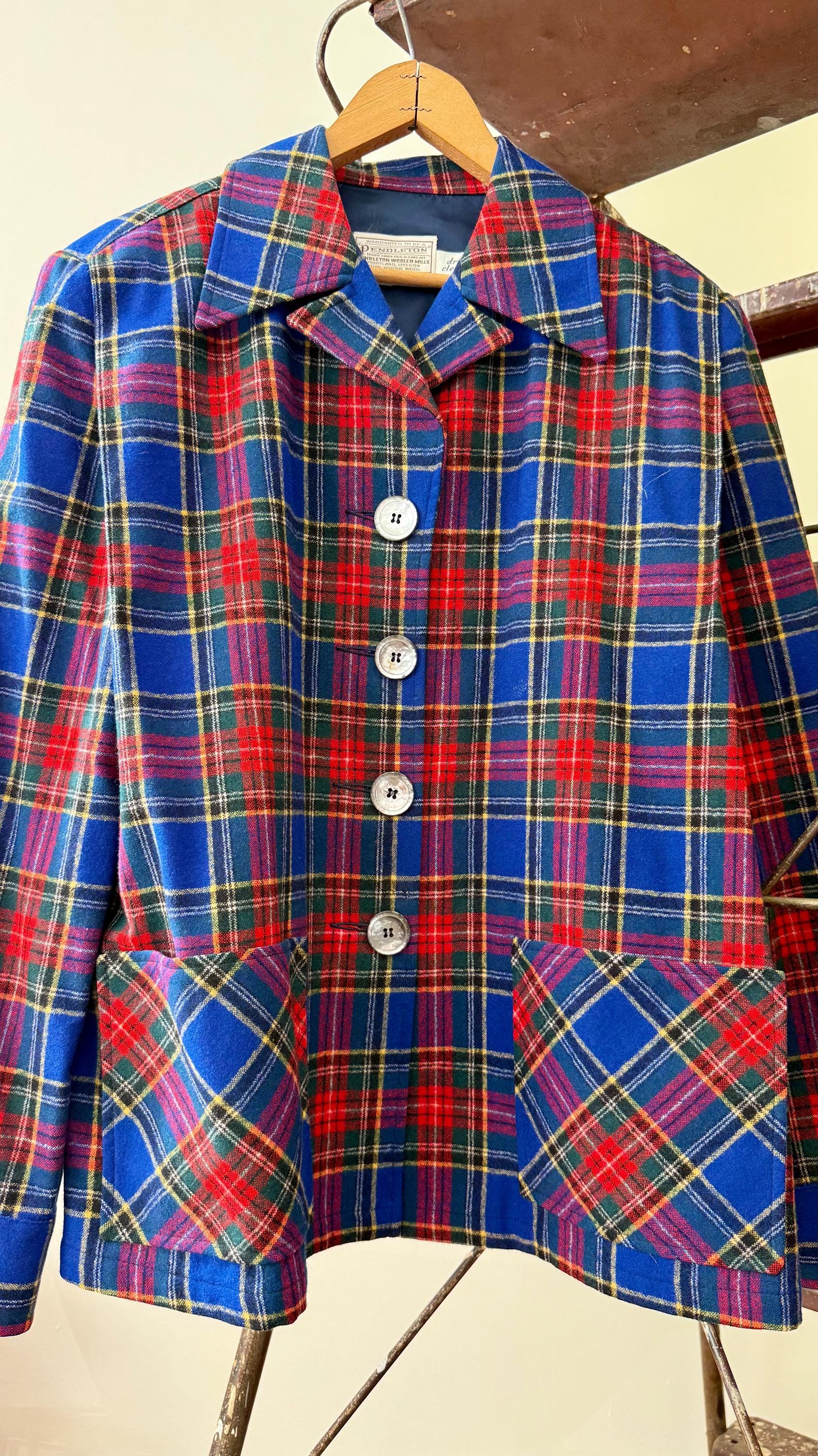 An authentic vintage Pendleton 49er jacket. a later version styled after the original midcentury design. this one has a bright primary colored plaid pattern. a classic!