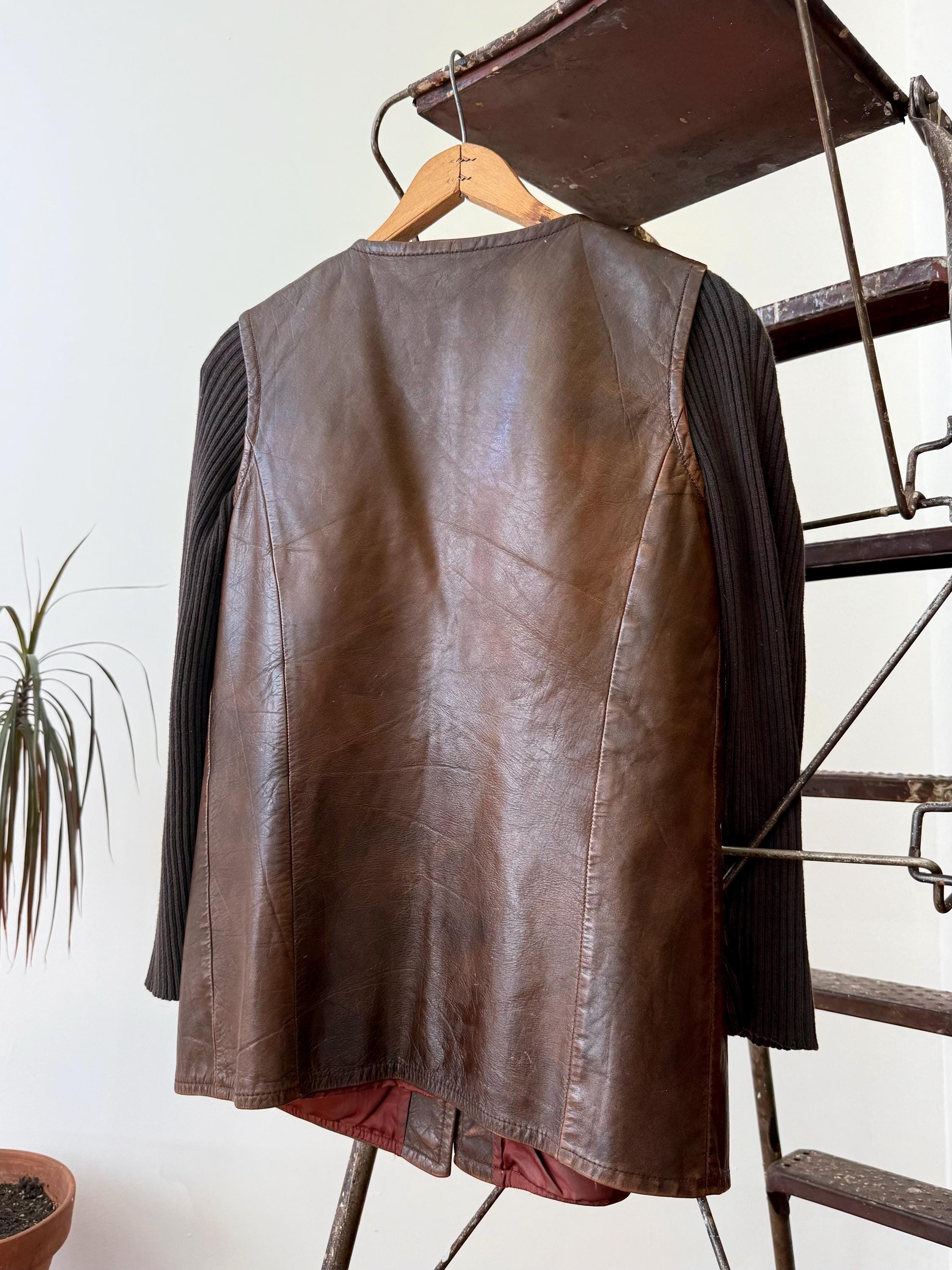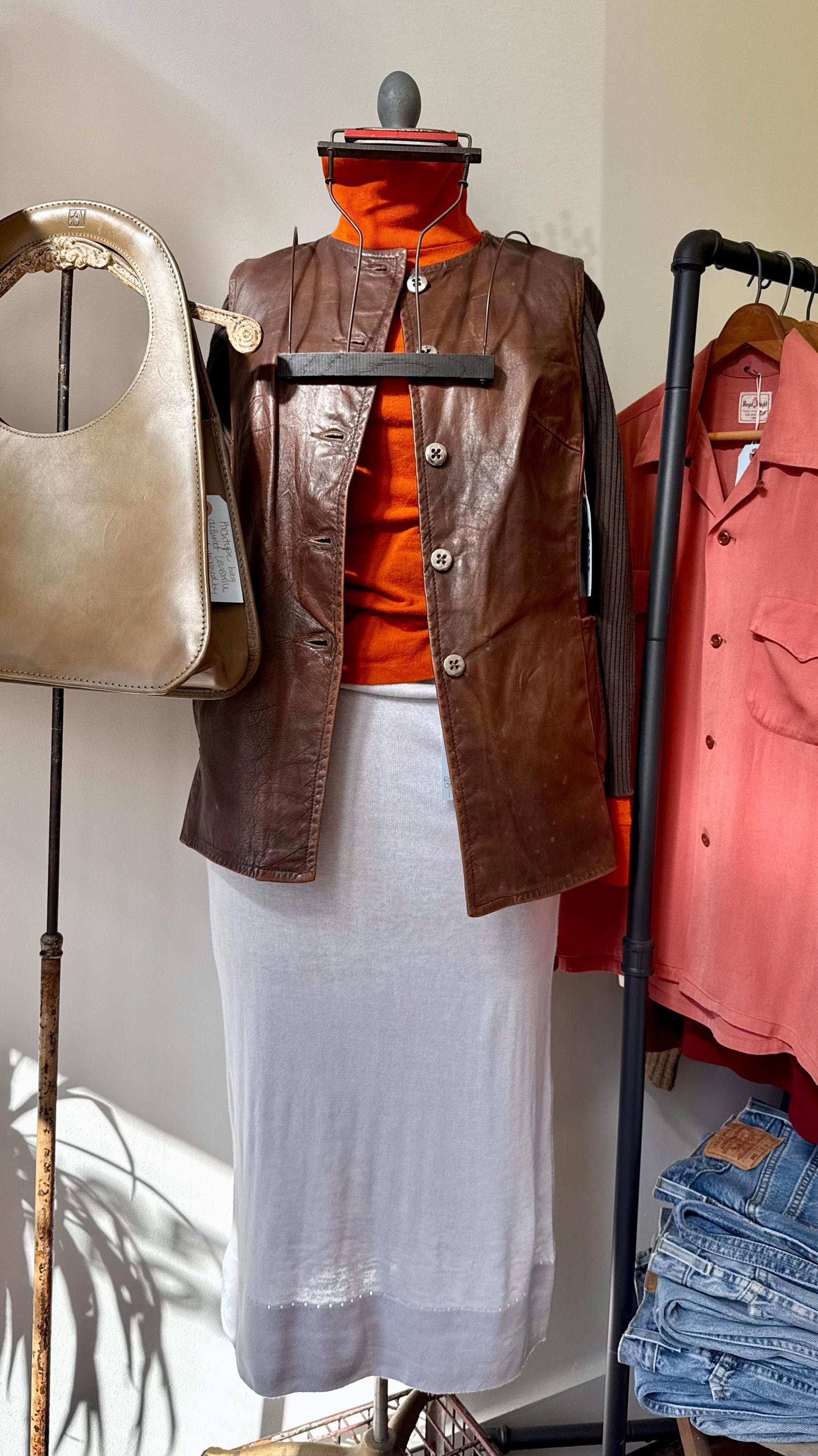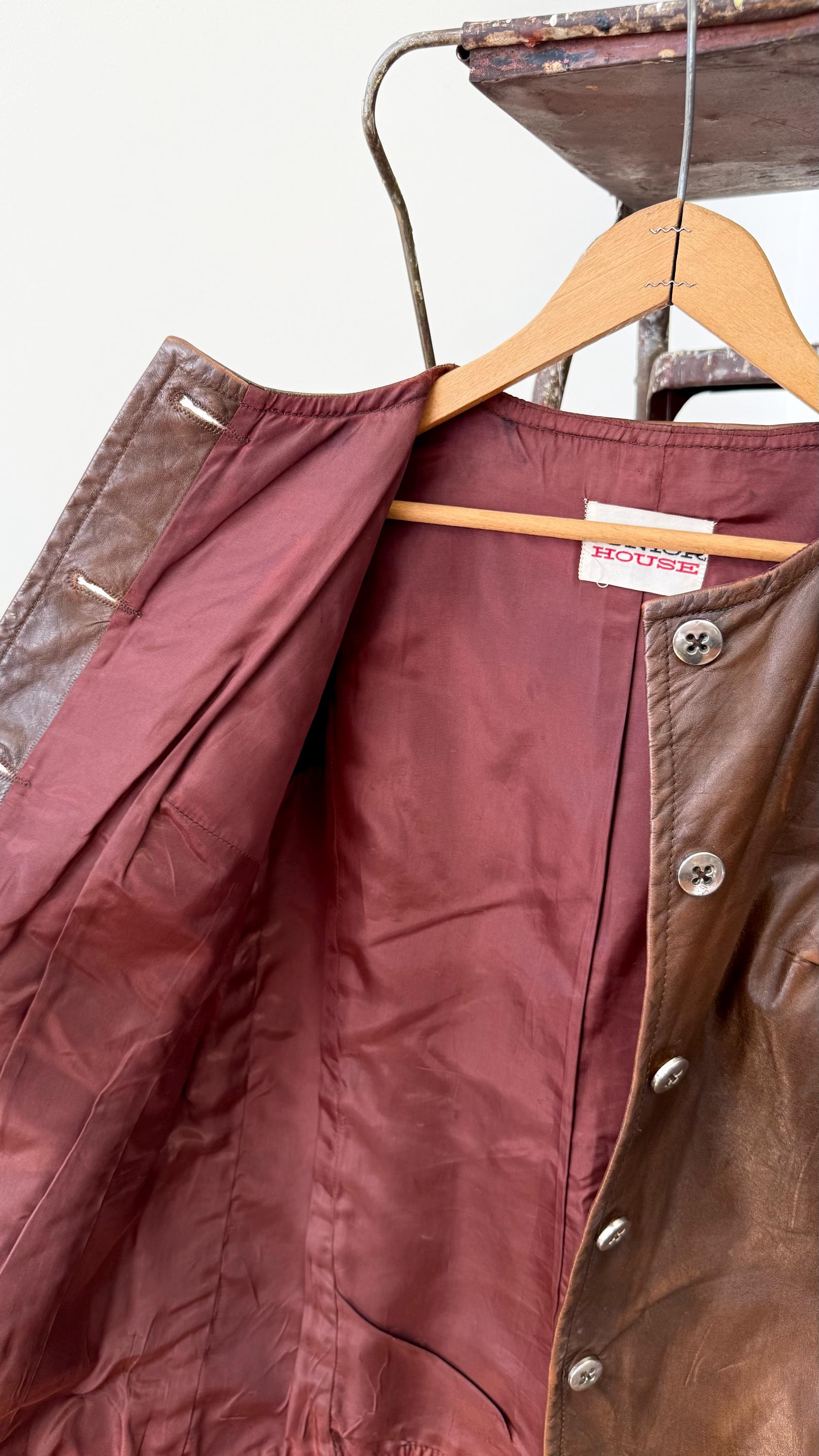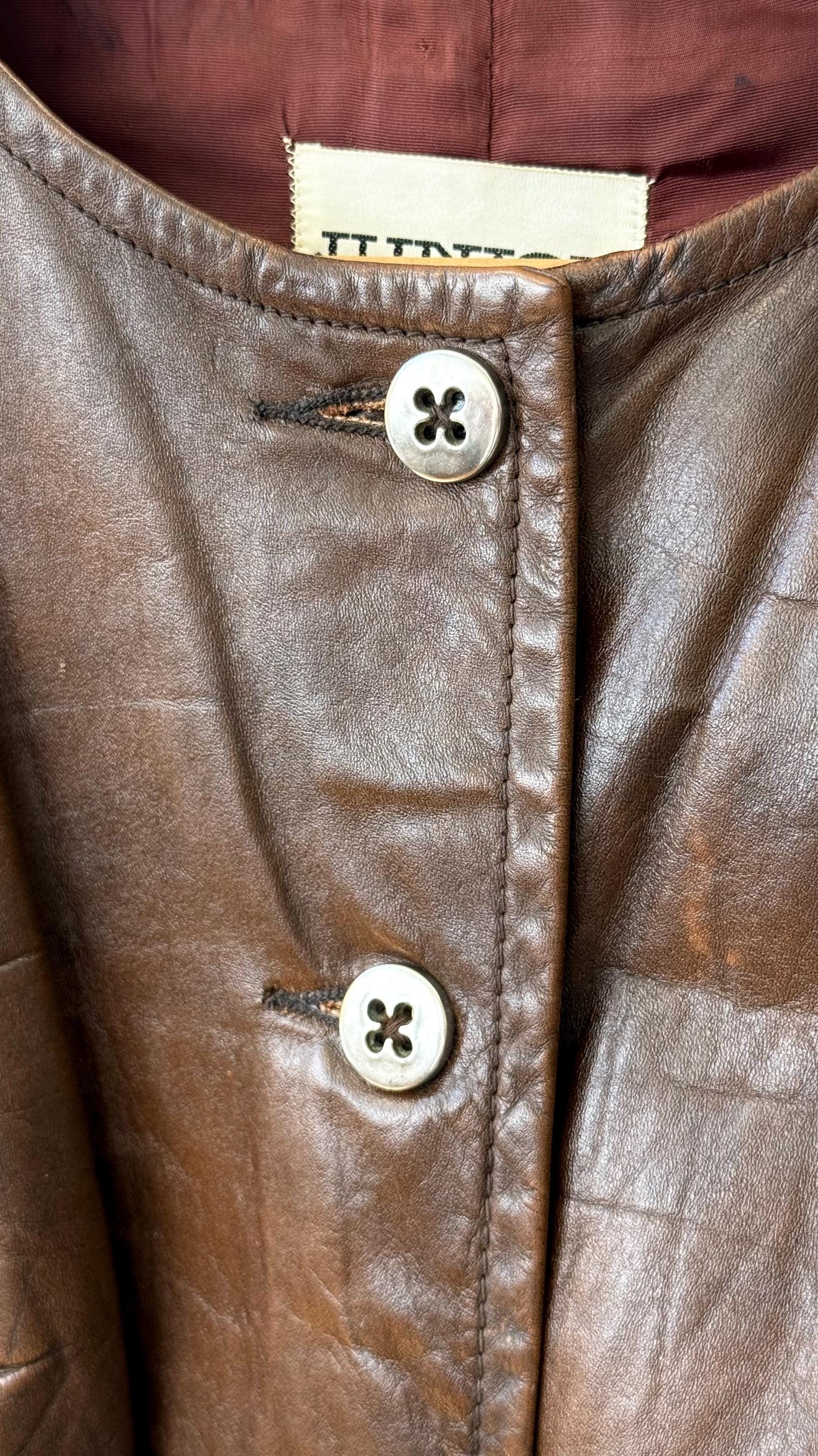 An authentic vintage jacket. a collarless leather style with fitted rib knit sleeves that give the look of wearing a layered vest over long sleeve sweater. the body has an a line shape and darted bust. also features aluminum buttons and waist pockets. overall a very chic mod look.