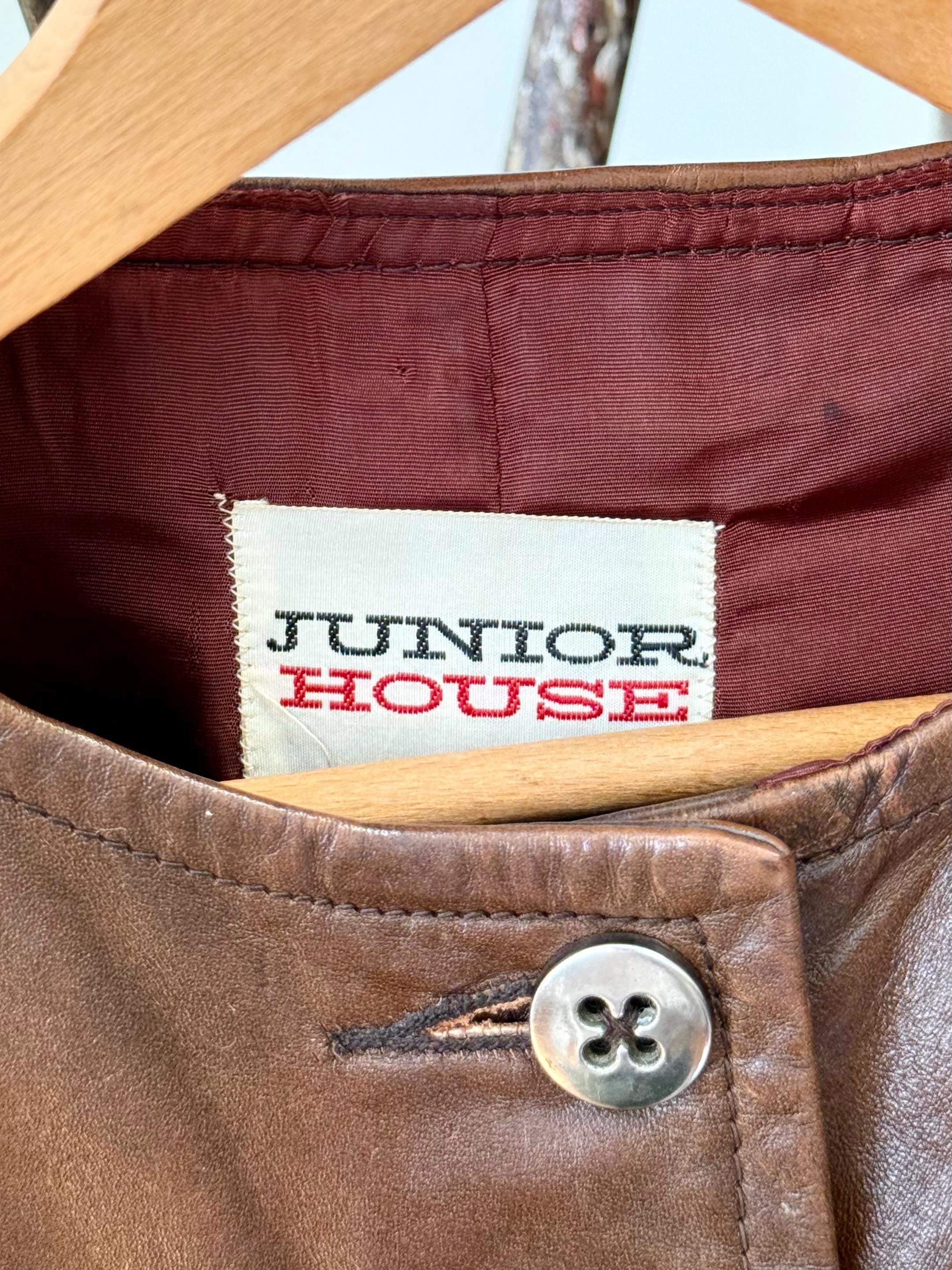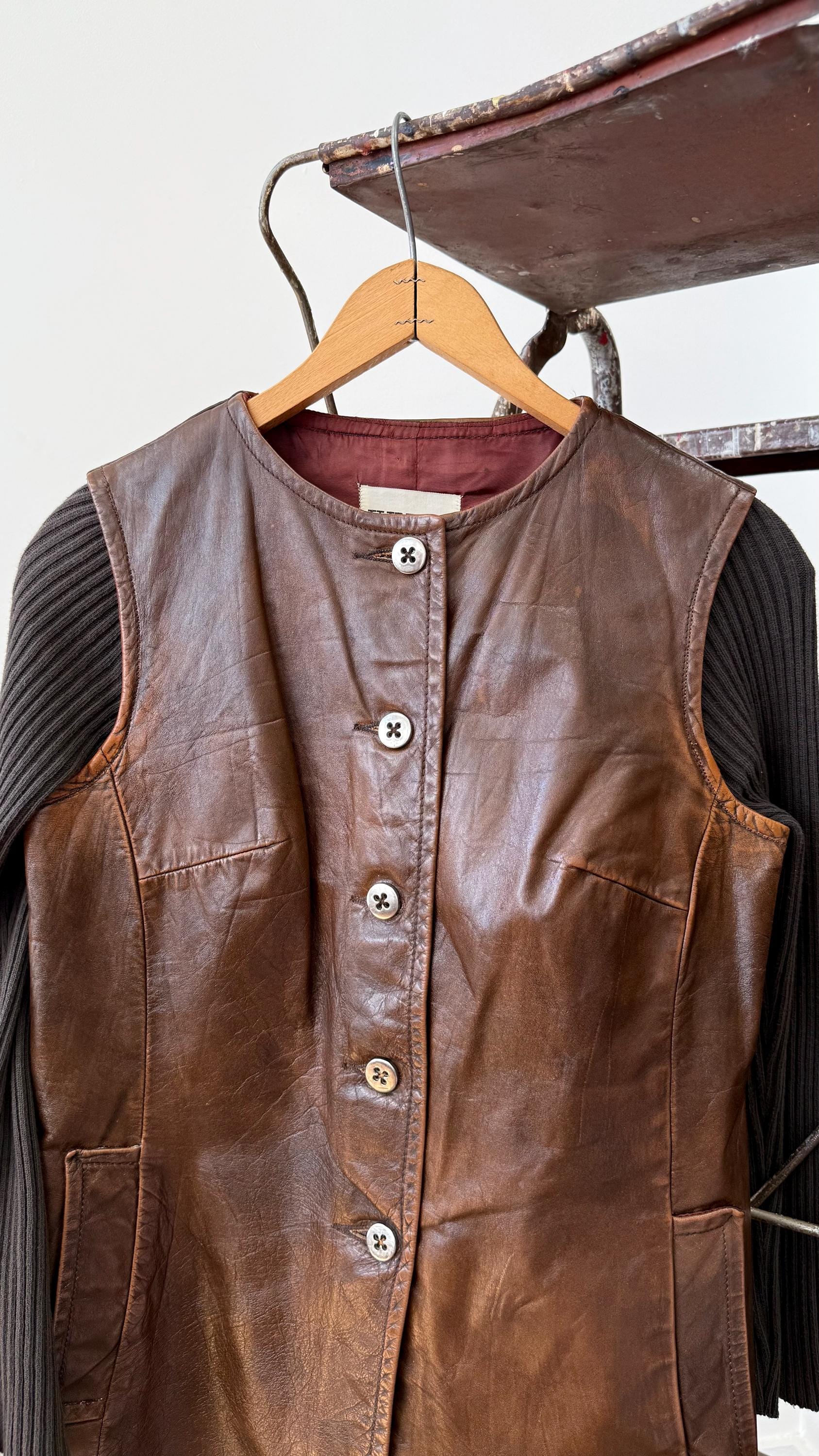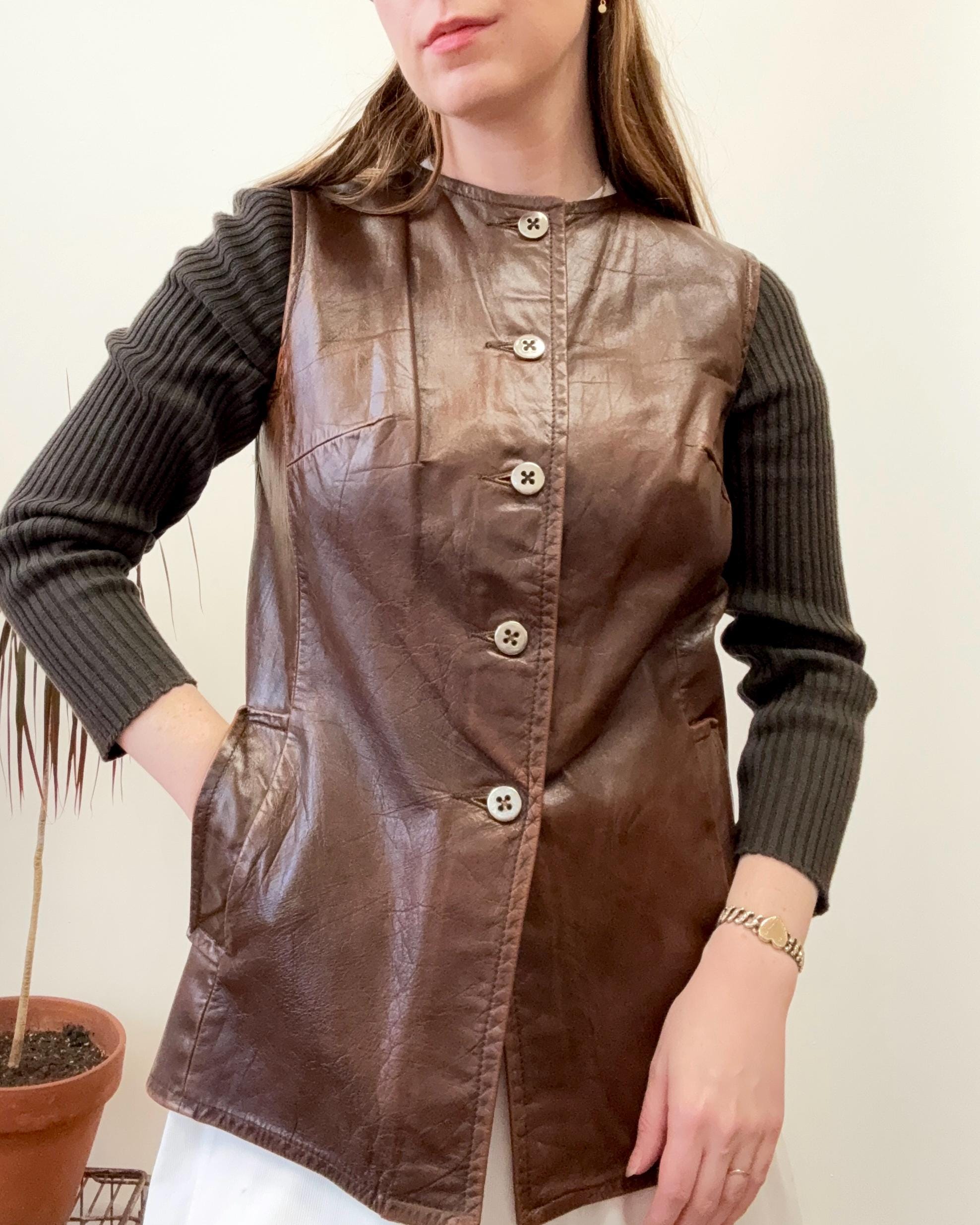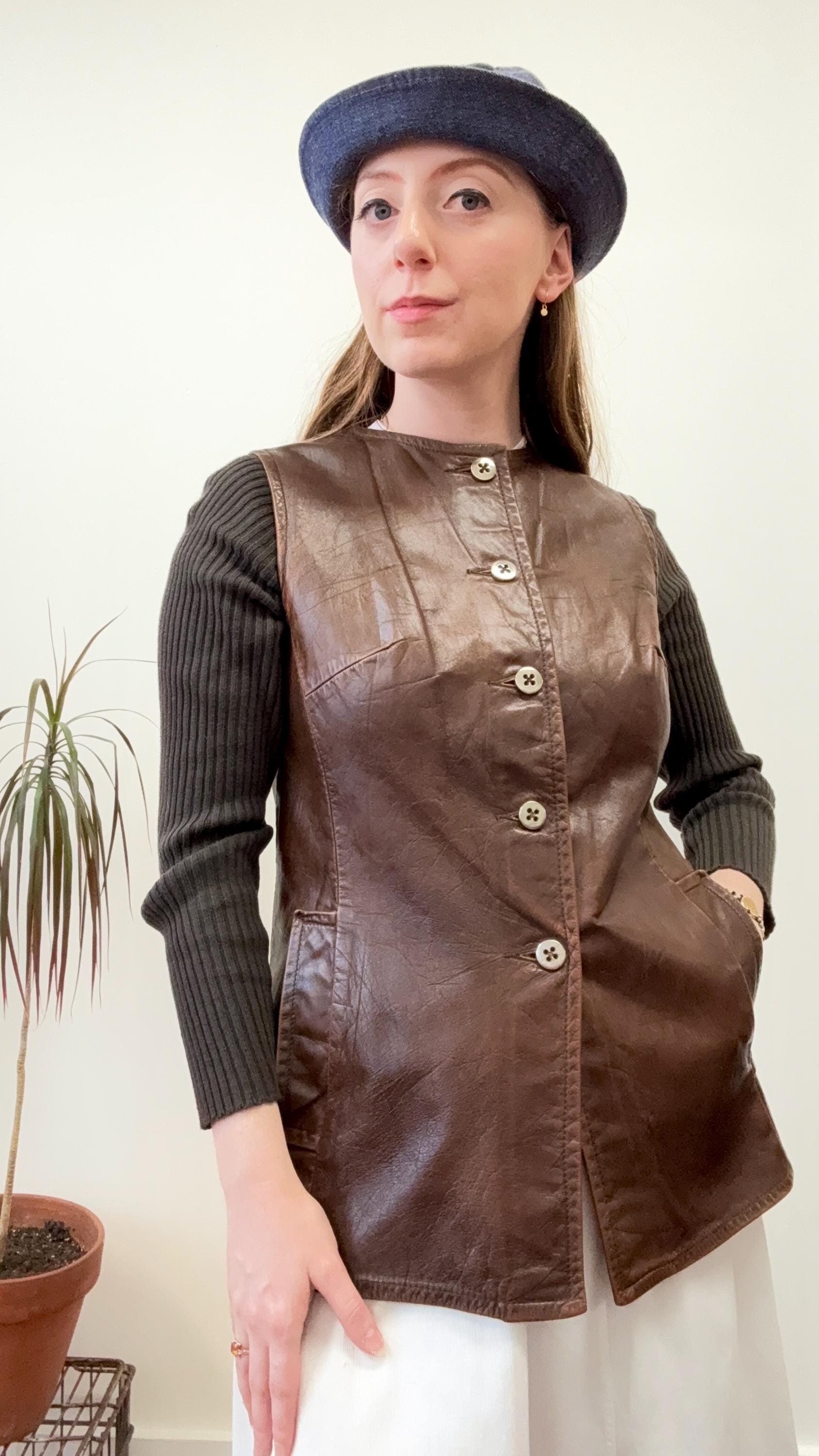 An authentic vintage jacket. a collarless leather style with fitted rib knit sleeves that give the look of wearing a layered vest over long sleeve sweater. the body has an a line shape and darted bust. also features aluminum buttons and waist pockets. overall a very chic mod look.