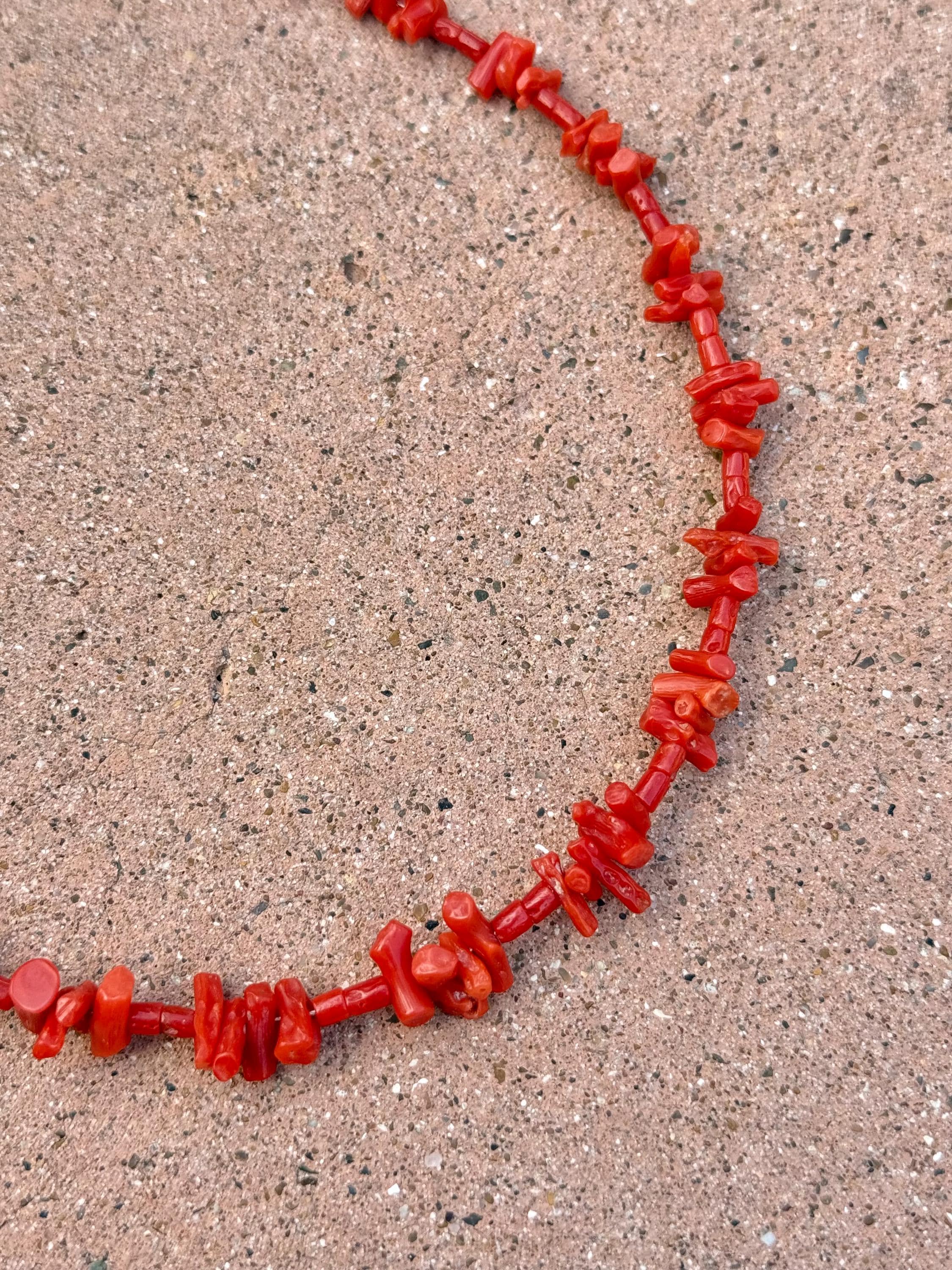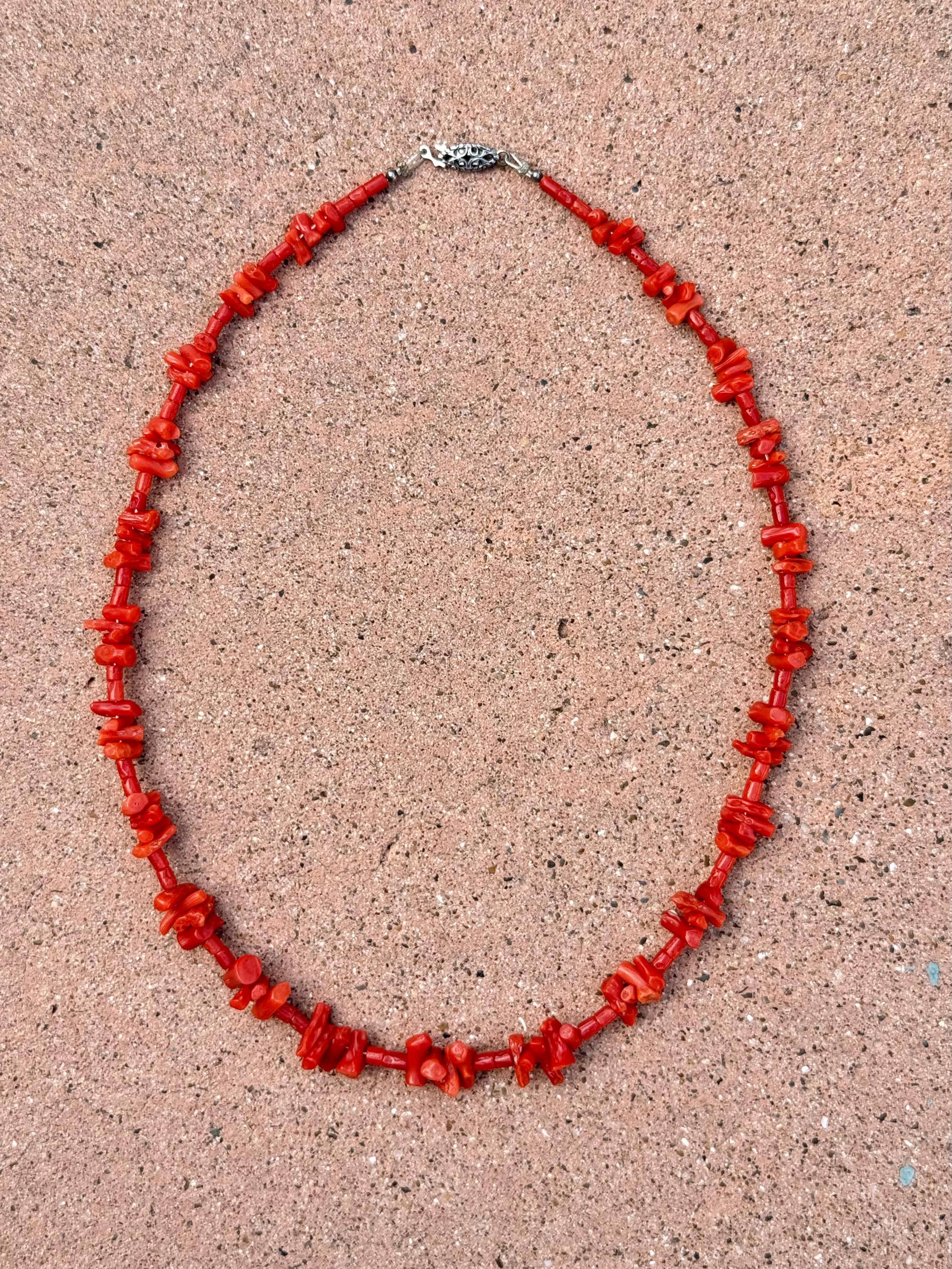 An authentic vintage natural coral necklace. a simple single stand design beaded into a pattern of alternating sizes of chip and shorter branch beads - an interesting and elegant look! includes a marked sterling fish hook fastener.