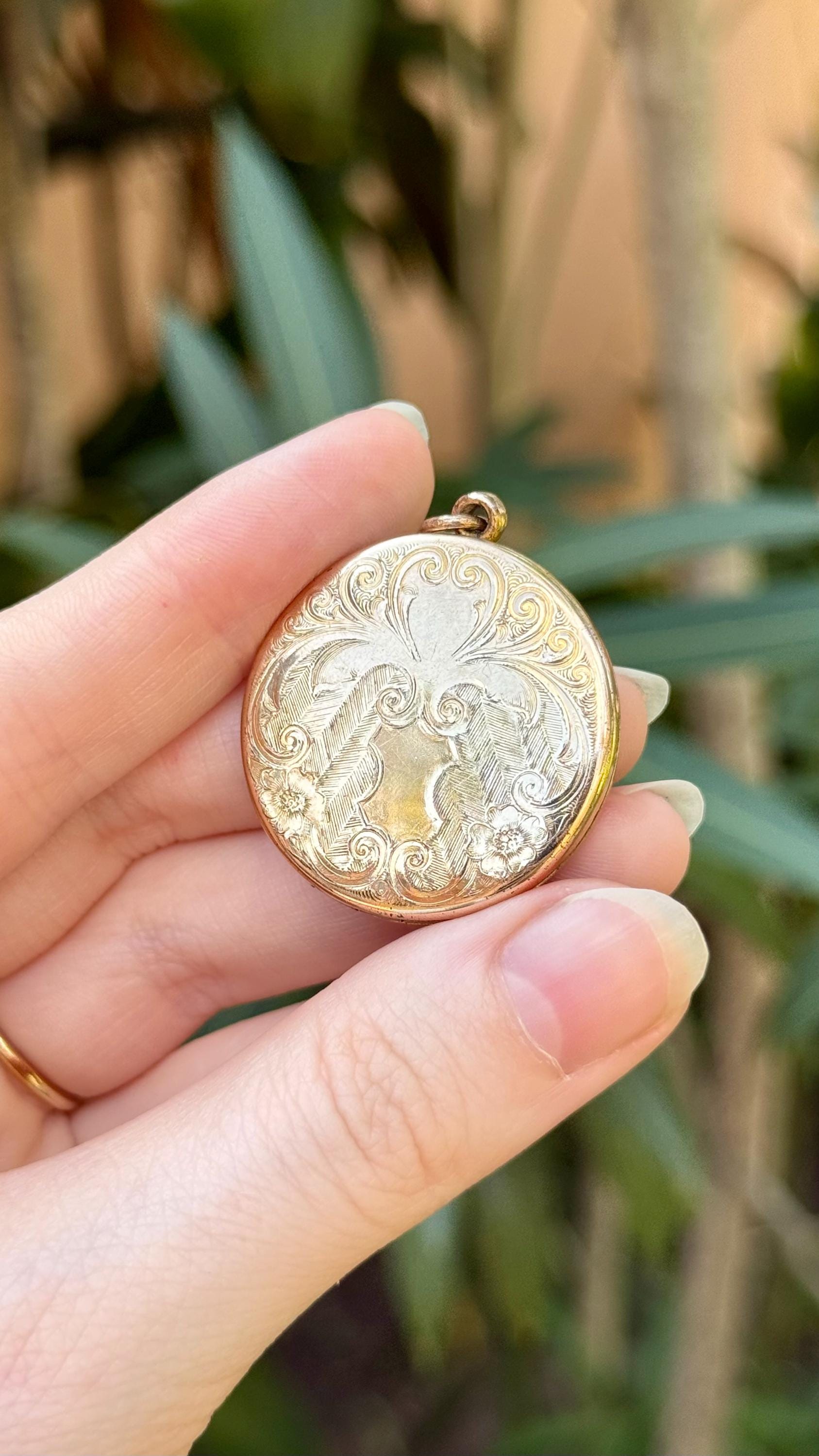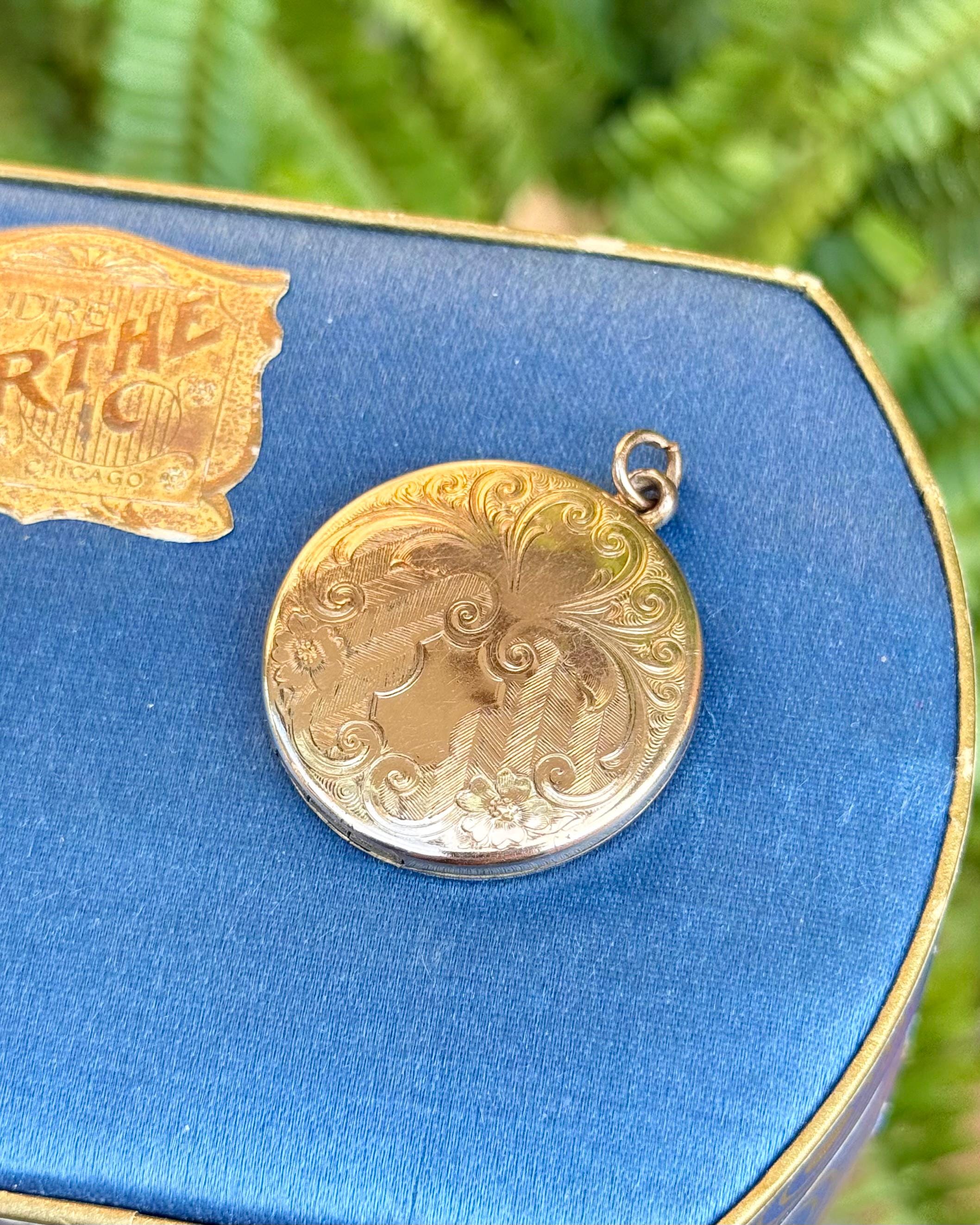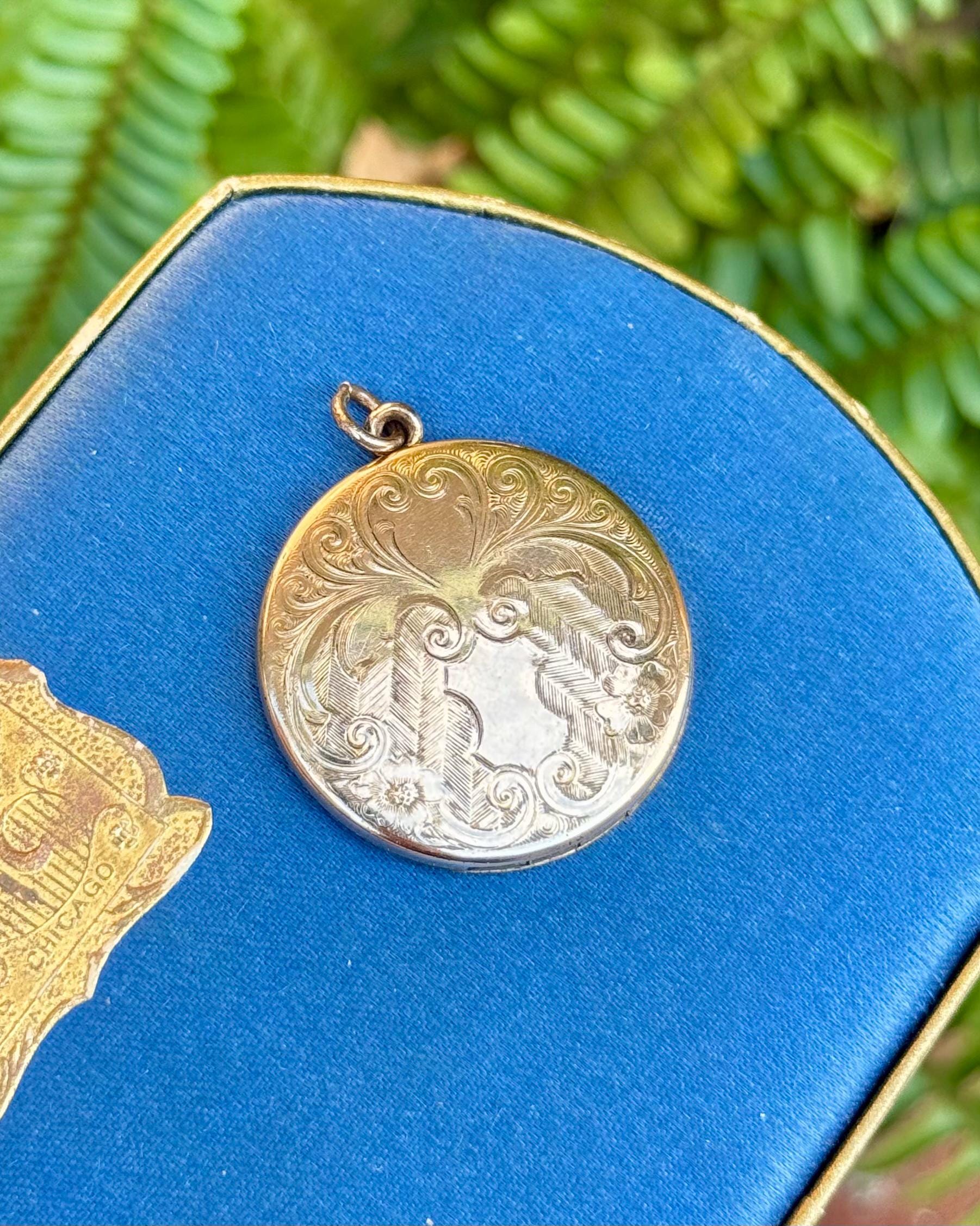 An authentic antique locket pendant. features a feathered floral filigree design on the front with a high shine finish in a cool yellow tone. marked RBM “Bee” Atrice 1874 inside, which is better known as Little Beatrice by R B MacDonald. photo frames press in and hold tightly. beautiful natural patina!