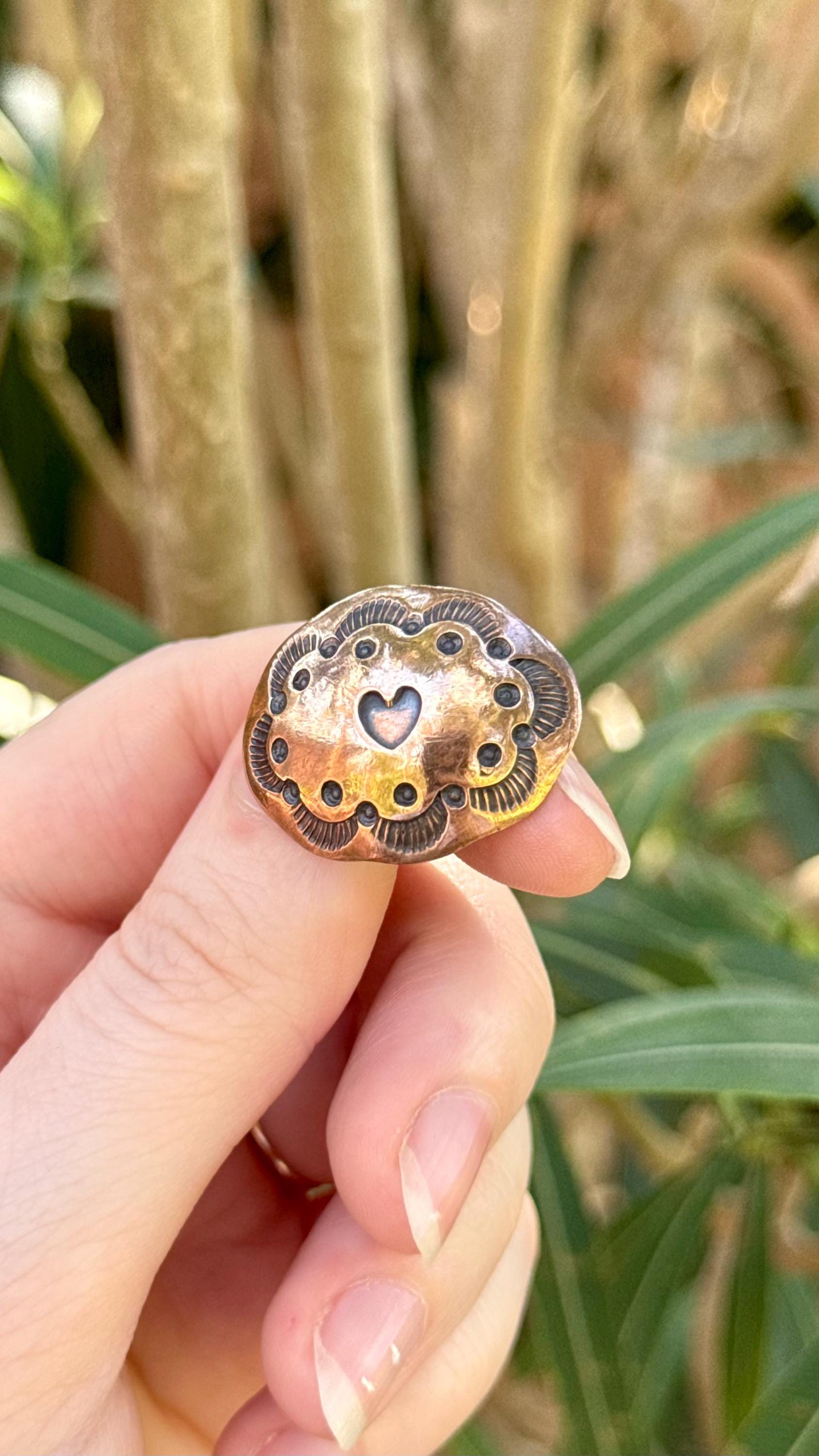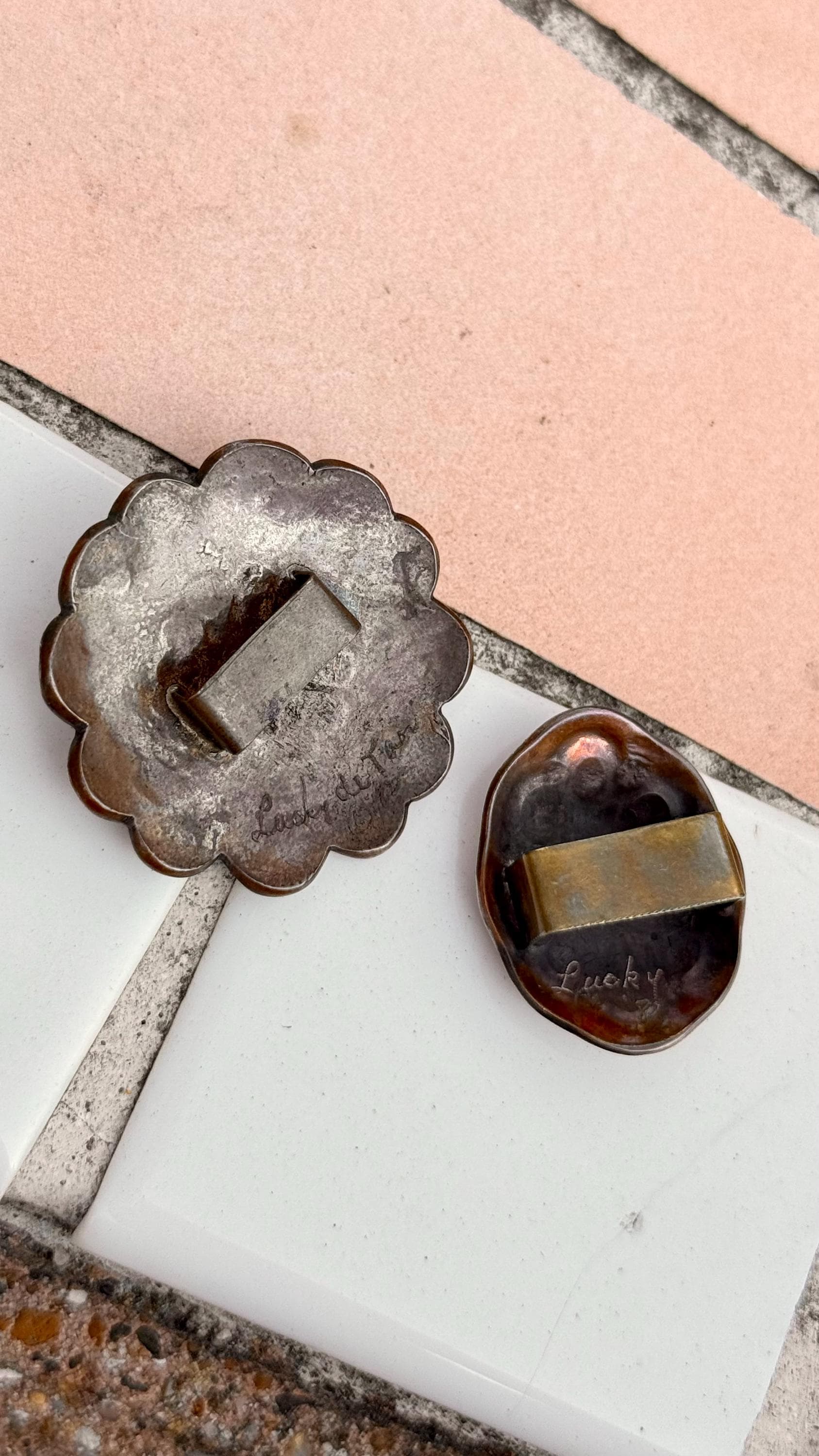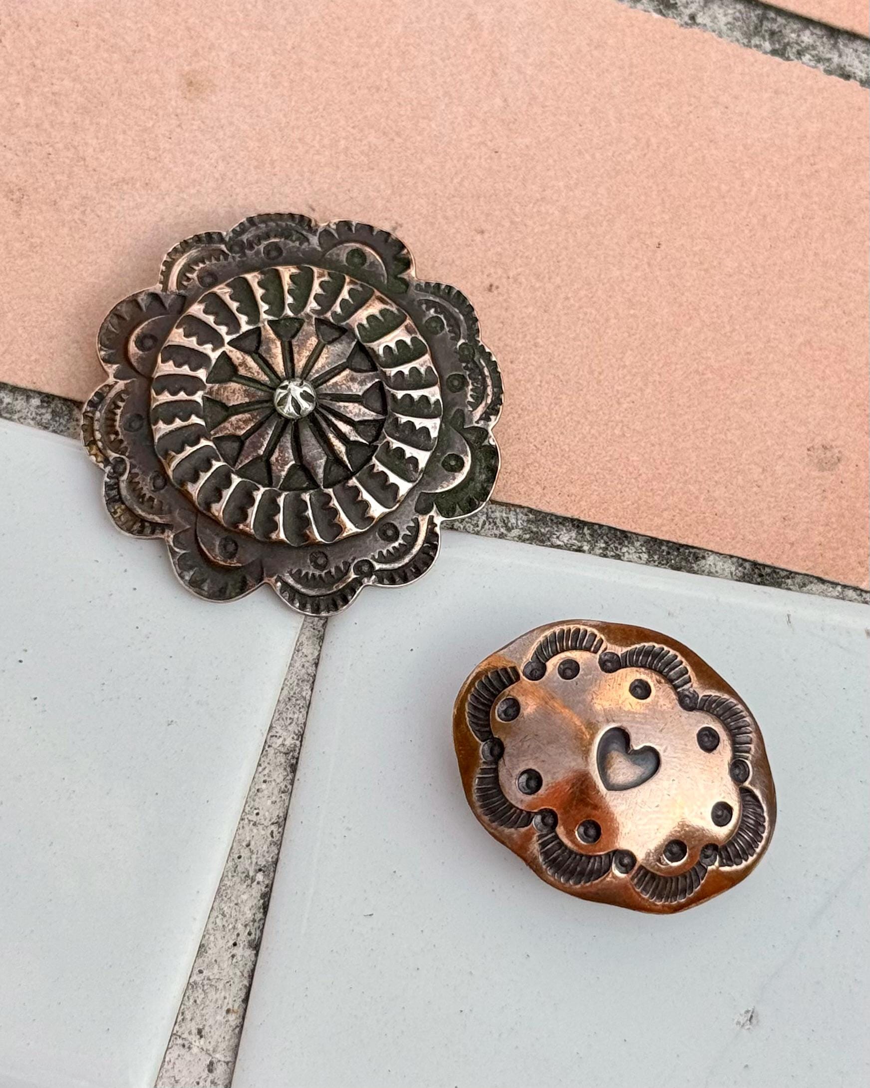 An authentic vintage western concho slide accessory for a scarf, belt, or hat band. these beautifully handcrafted pieces are solid copper with the perfect amount of natural patina. signed by silversmith “Lucky” and the year they were made - ‘80 something? they have been cleaned and polished by us at Craft Union. only these two pieces to choose from, select style at checkout.