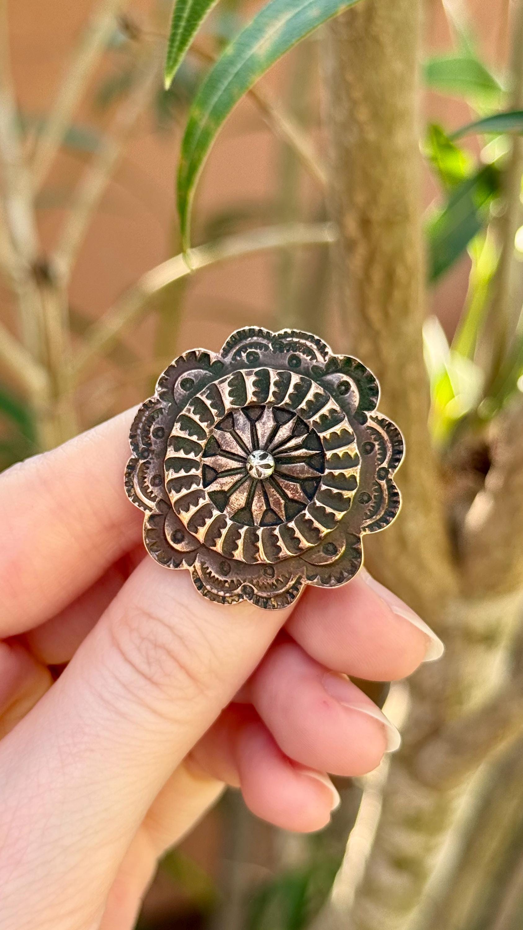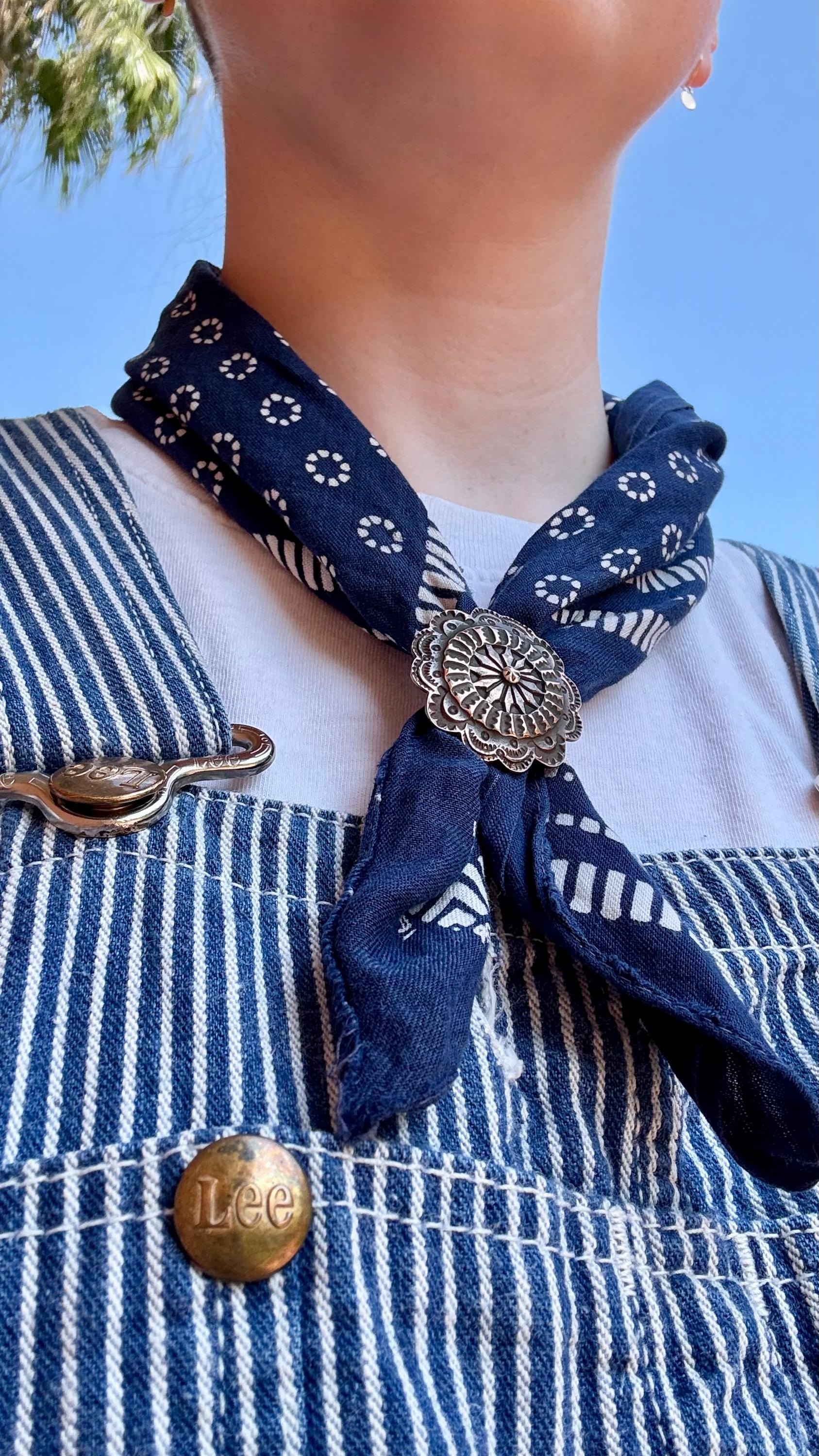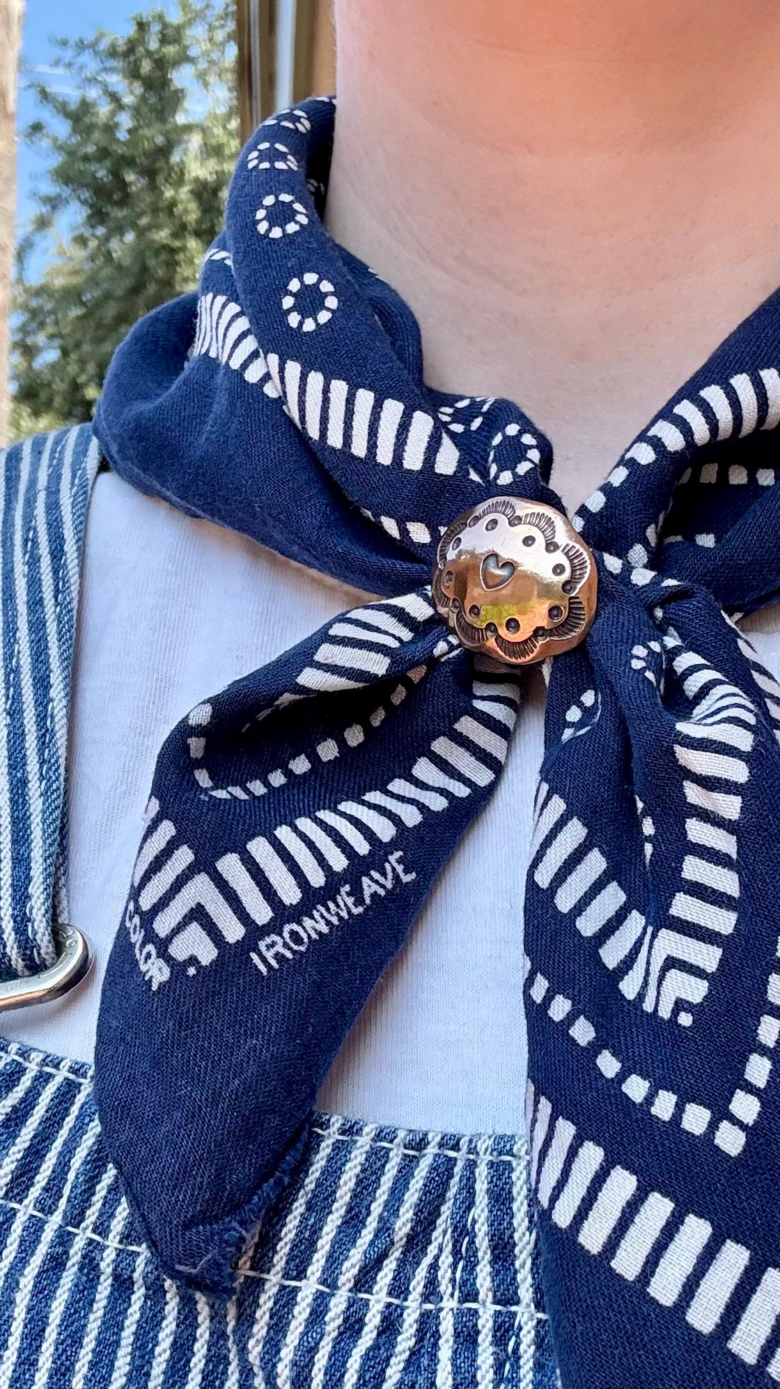 An authentic vintage western concho slide accessory for a scarf, belt, or hat band. these beautifully handcrafted pieces are solid copper with the perfect amount of natural patina. signed by silversmith “Lucky” and the year they were made - ‘80 something? they have been cleaned and polished by us at Craft Union. only these two pieces to choose from, select style at checkout.