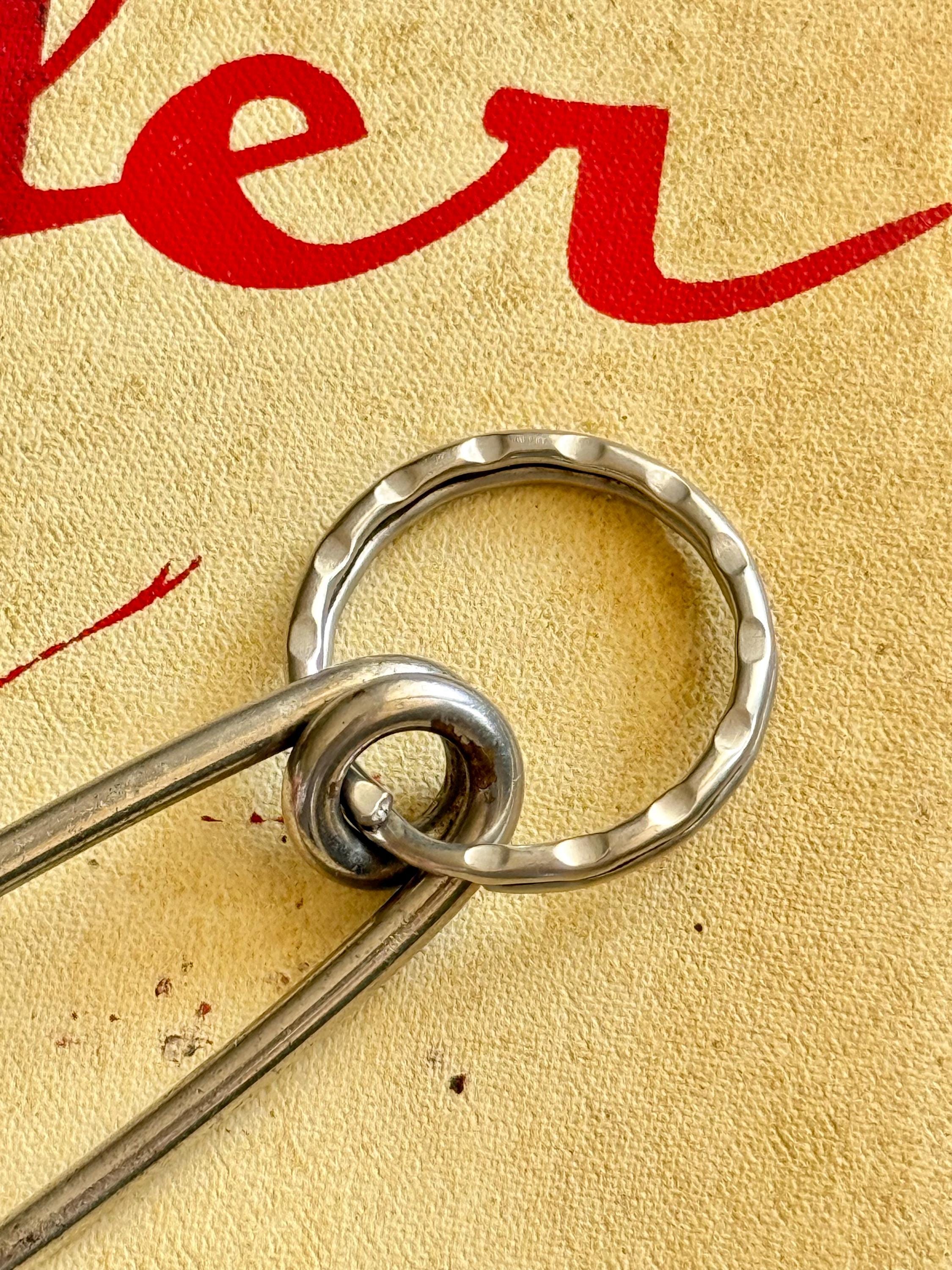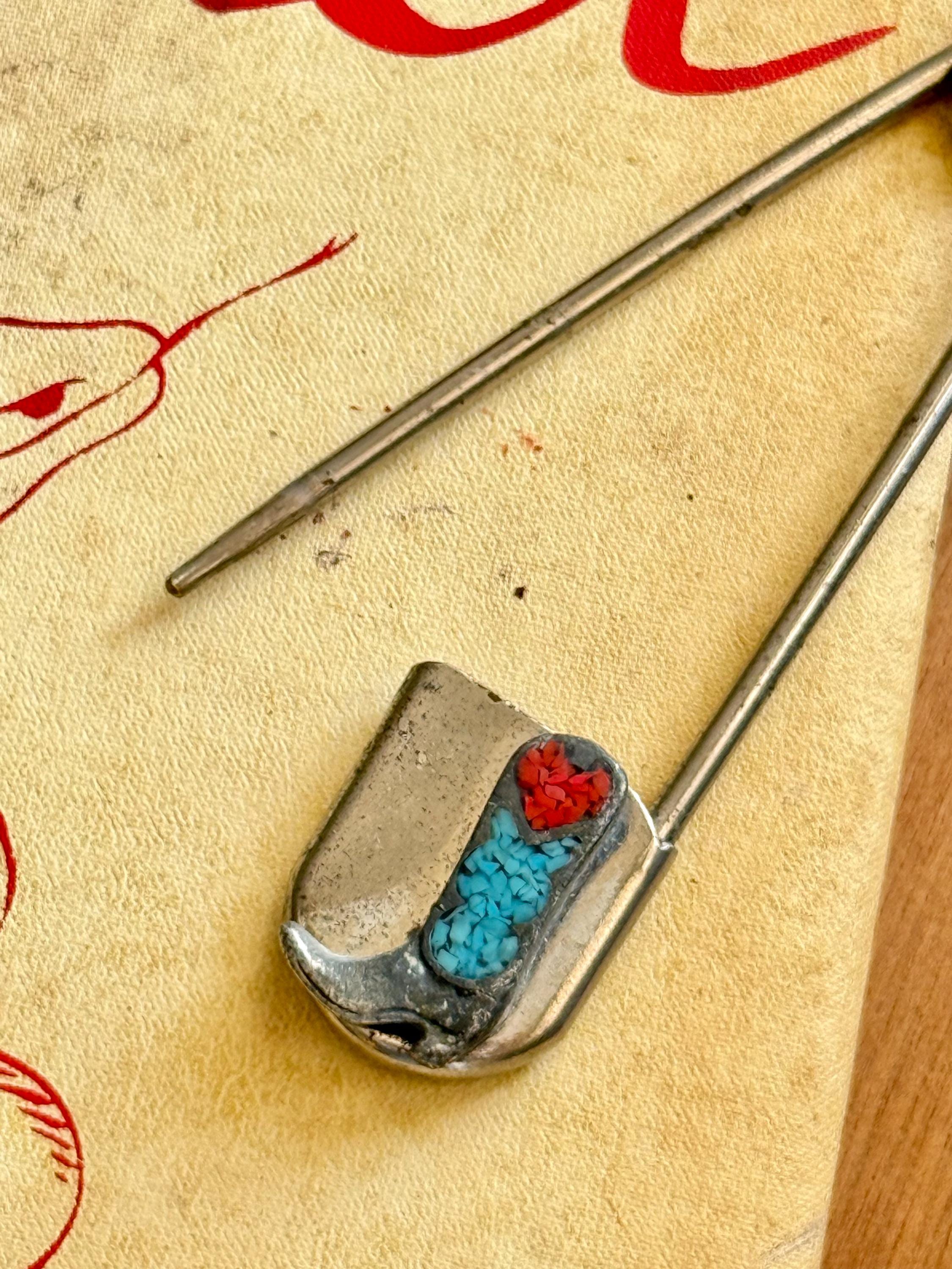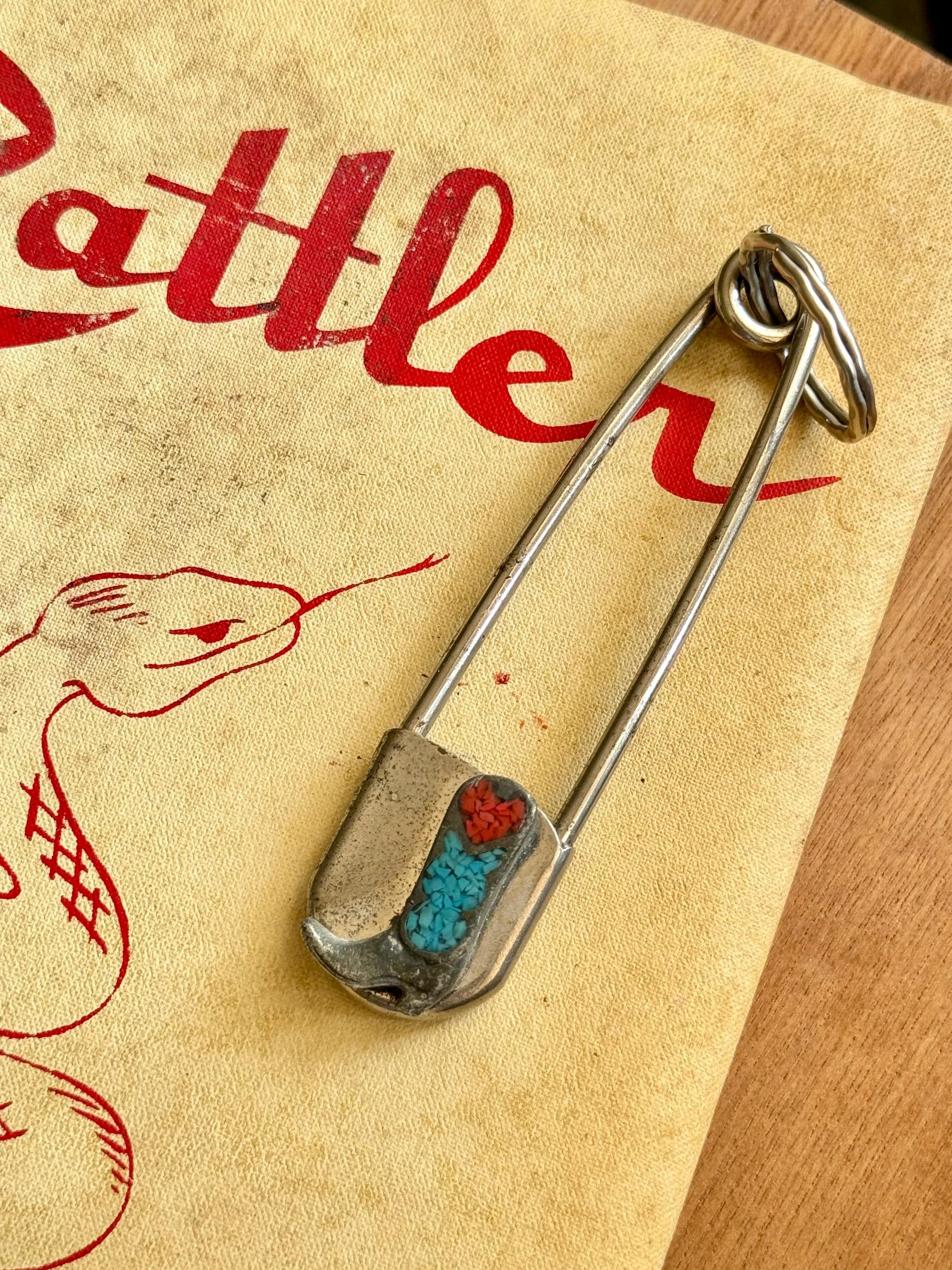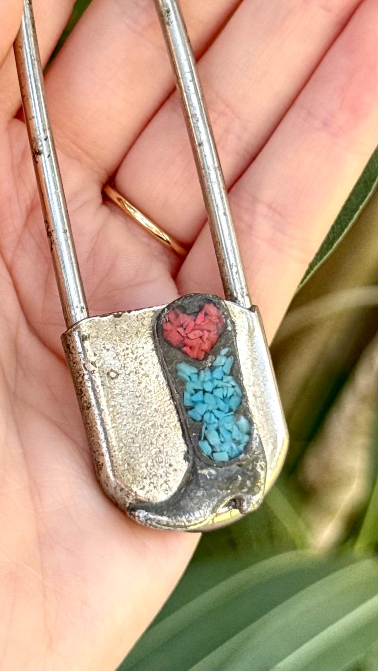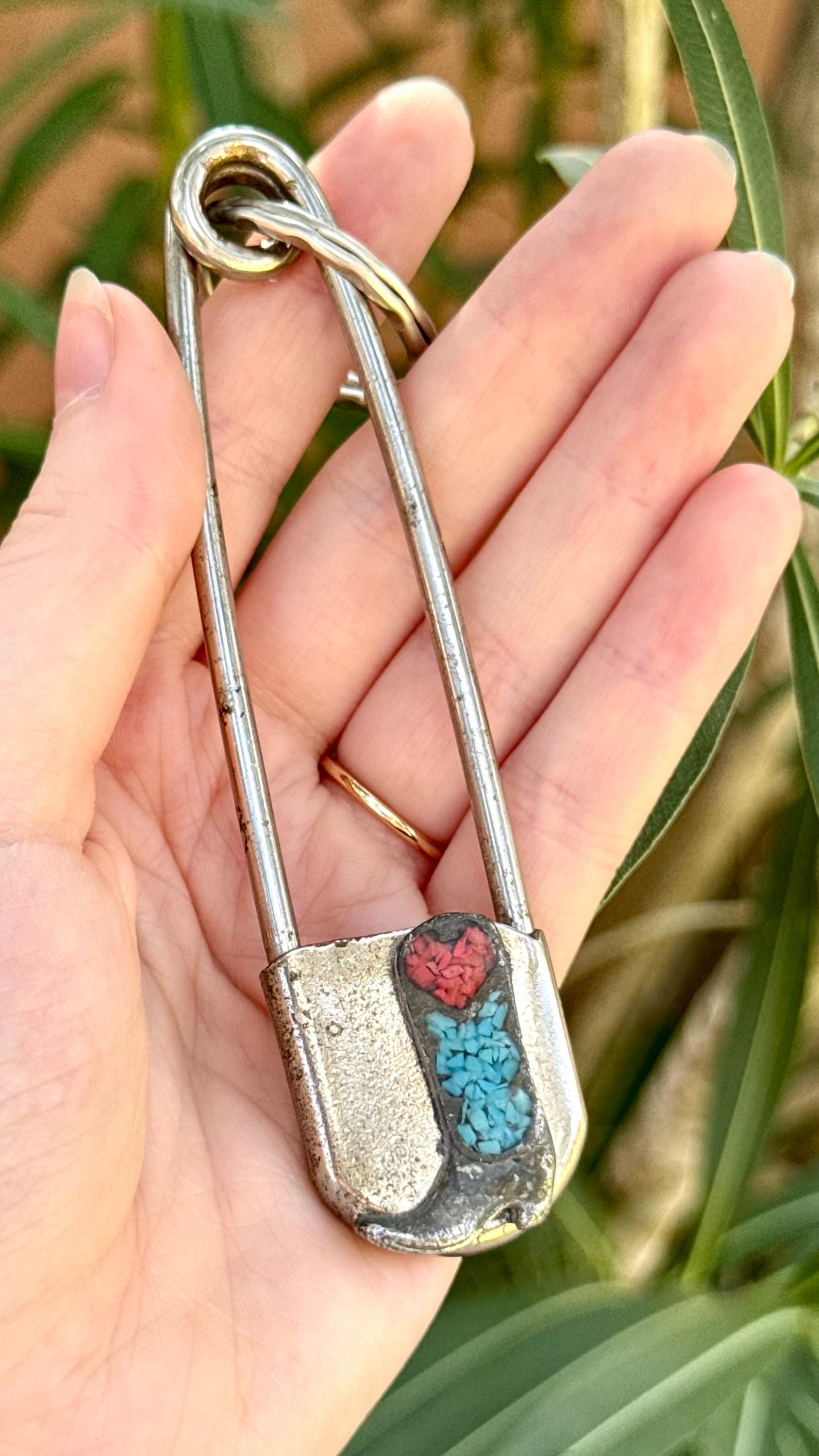 An authentic vintage jumbo safety pin accessory. features an added cowboy boot with crushed coral and turquoise inlay. the coral detail is in the shape of a heart! we included a keychain for your keys but can easily be removed if you wanted to use it another way such as pinning to a sweater or knit scarf.