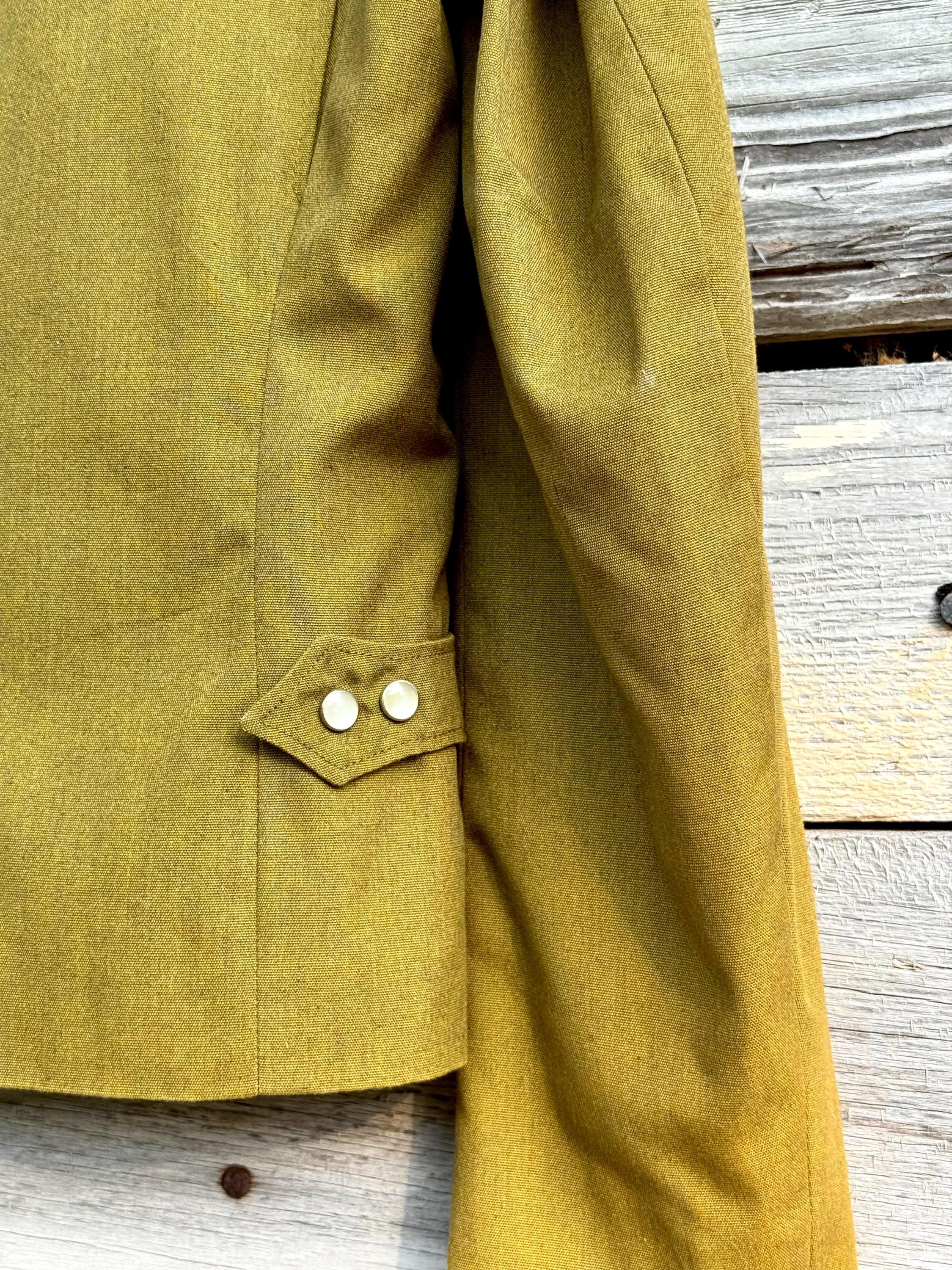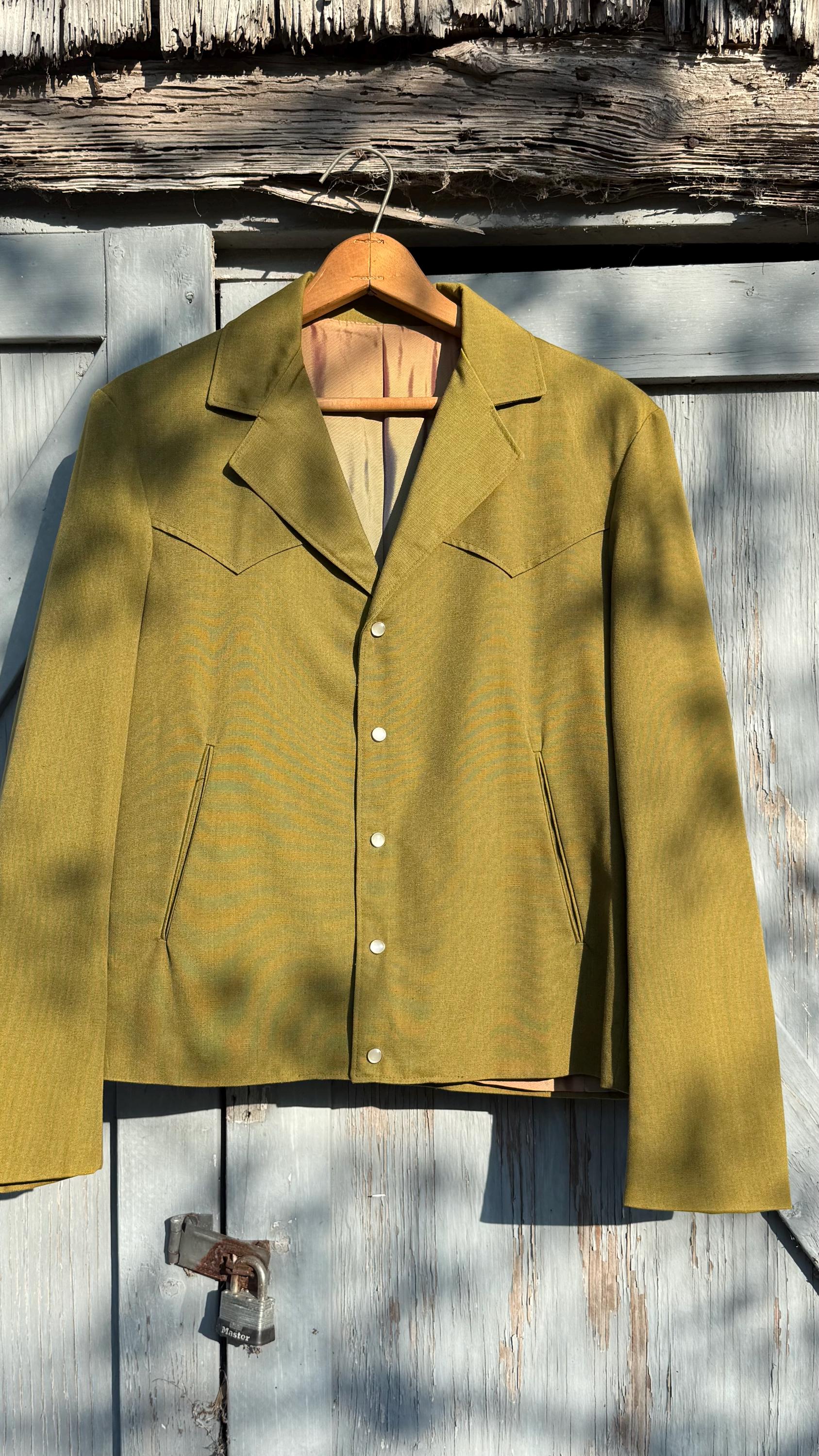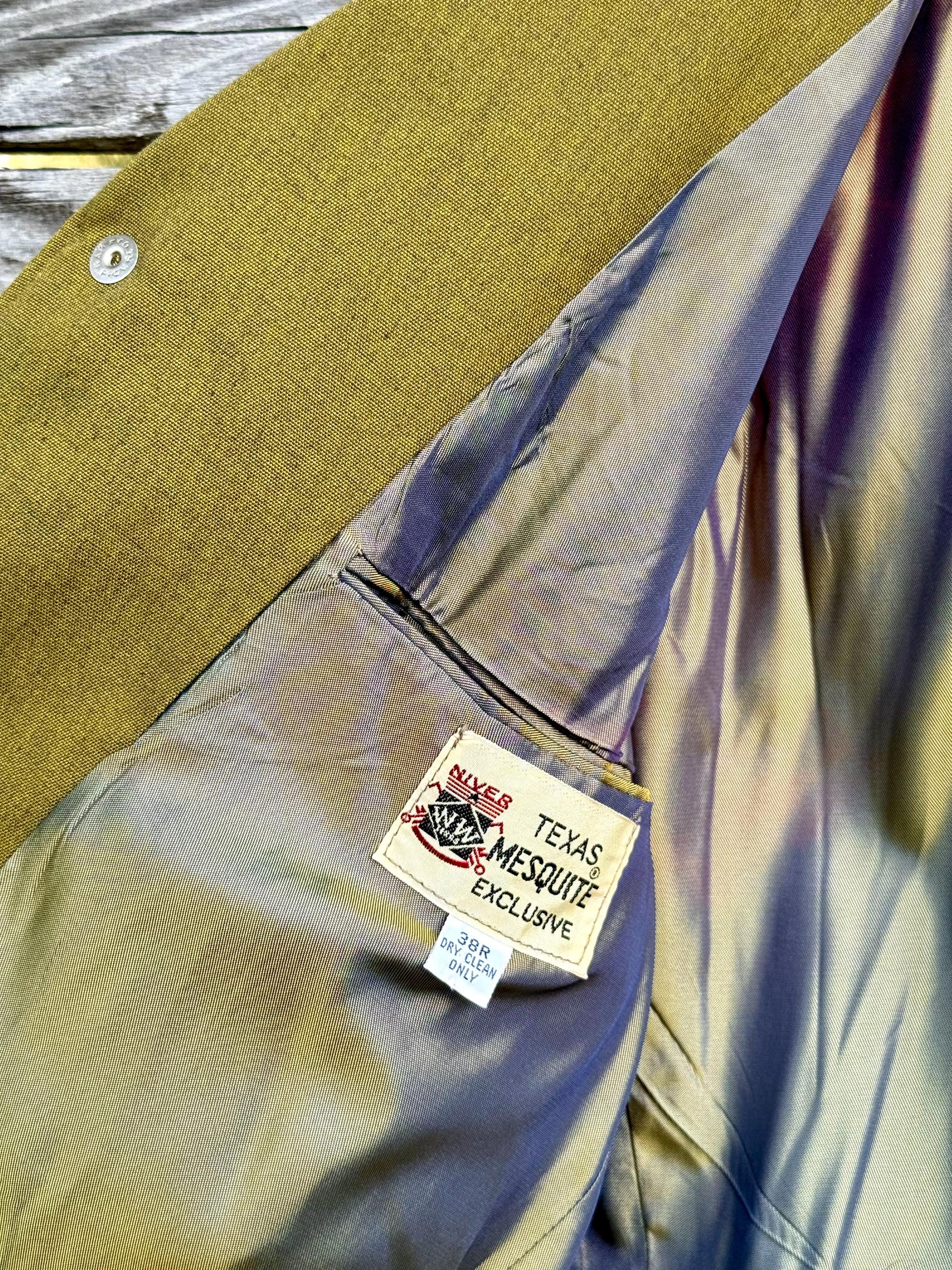 An authentic vintage western “Busher” western jacket by Niver Mesquite label. It features a slight crop fit, pearl snap fasteners and adjustable waist tab snaps too! the combination of fabric and hue creates a subtle sheen giving an almost metallic effect. comes with extra fabric from when the pant legs were hemmed, but sadly we do not have the matching trousers.