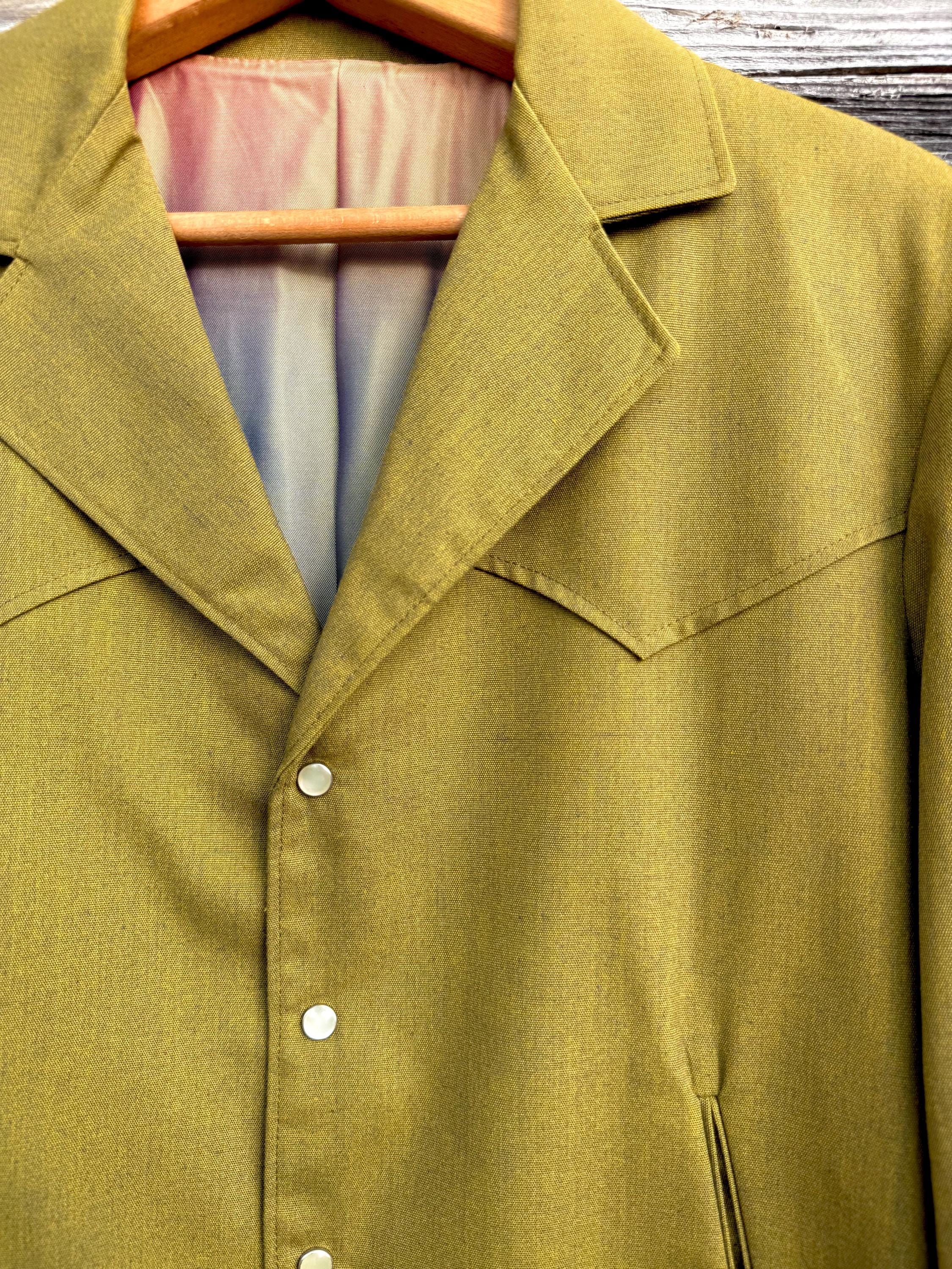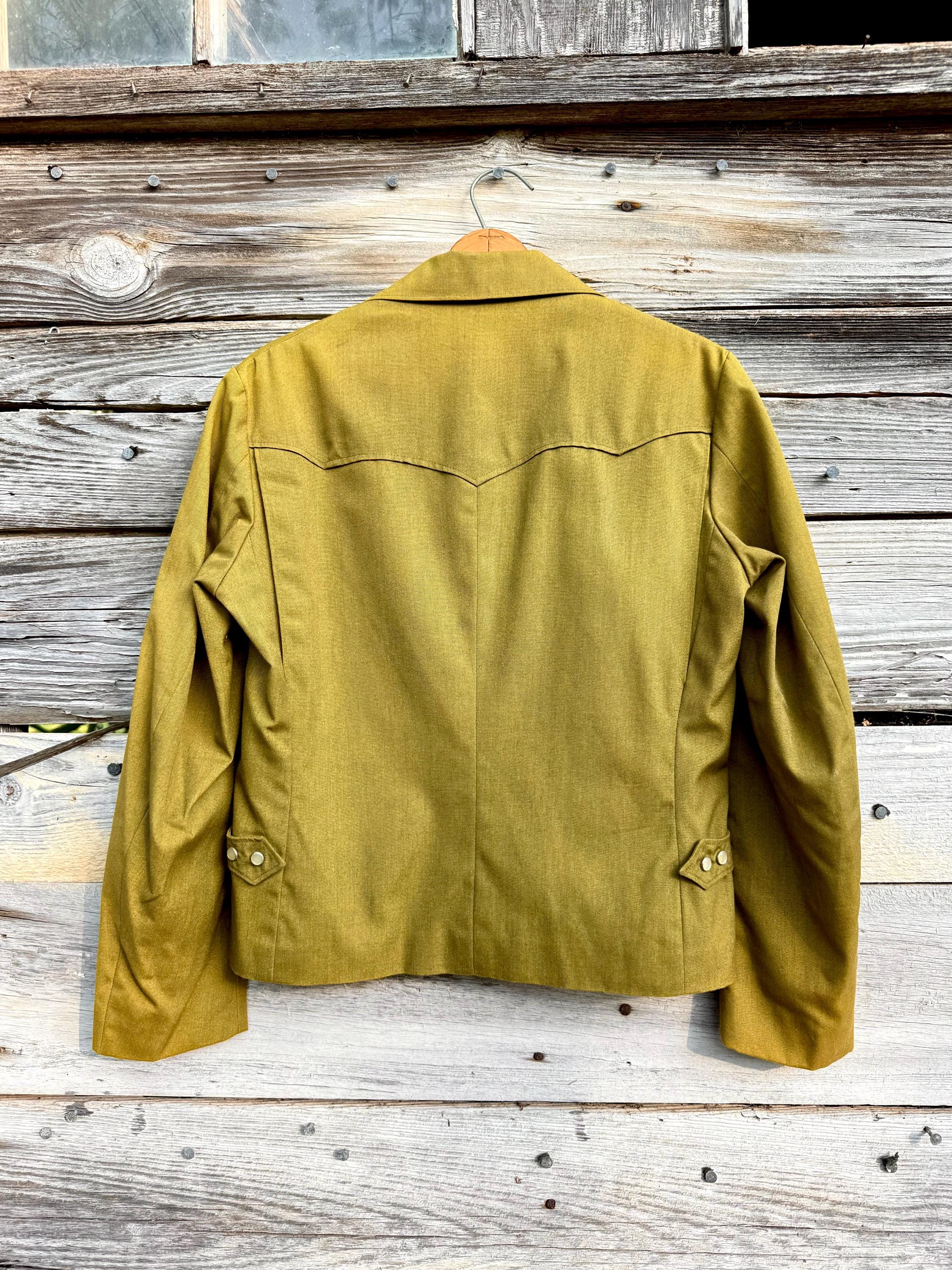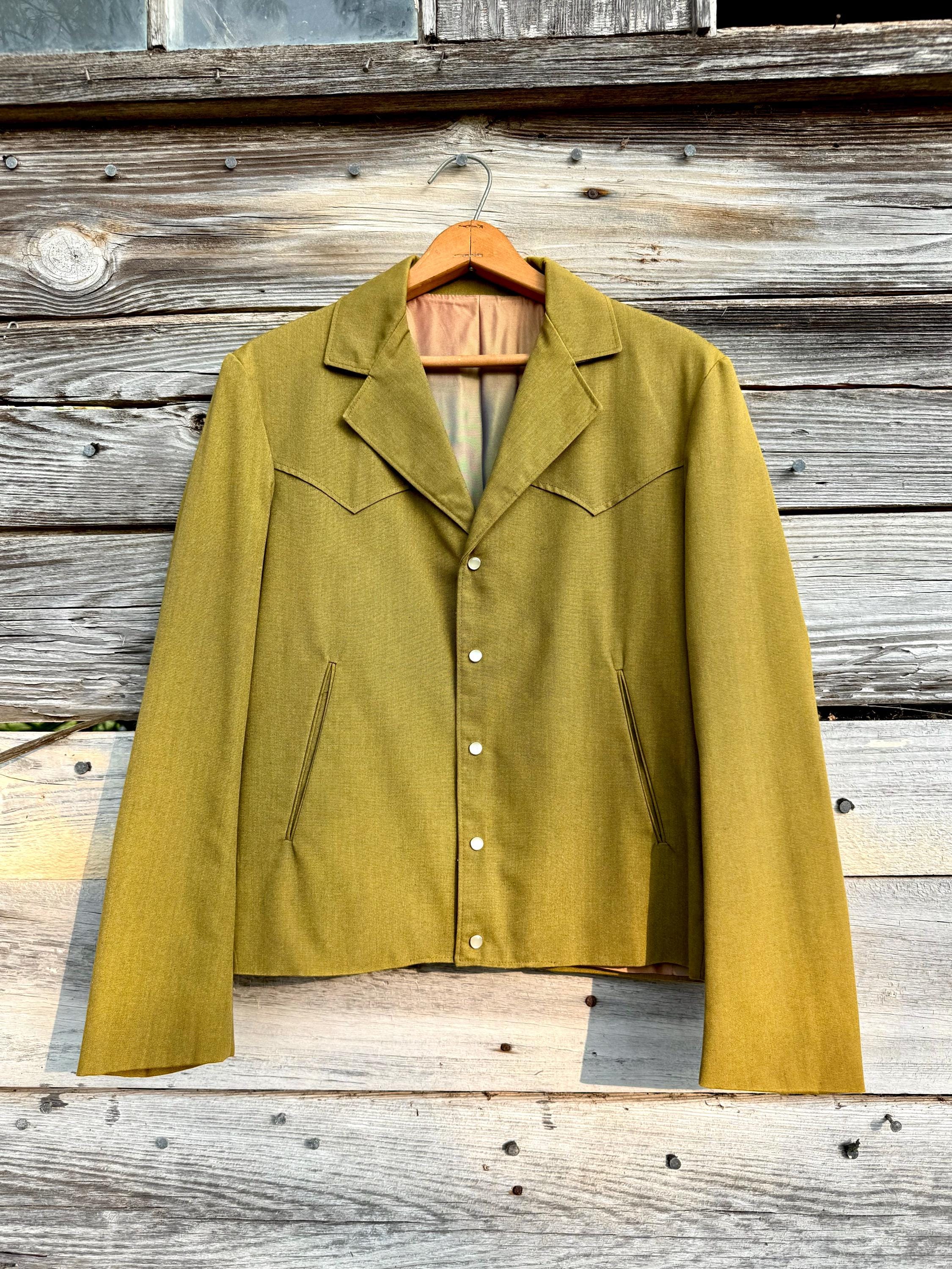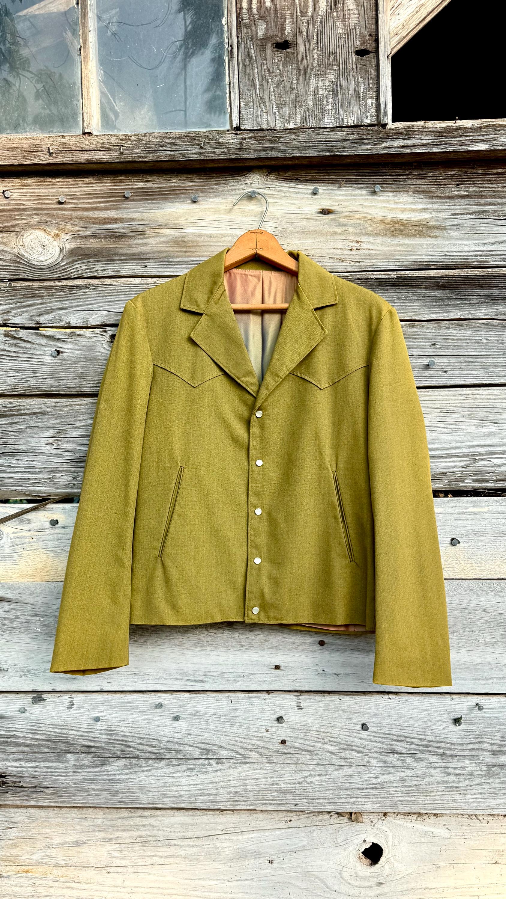 An authentic vintage western “Busher” western jacket by Niver Mesquite label. It features a slight crop fit, pearl snap fasteners and adjustable waist tab snaps too! the combination of fabric and hue creates a subtle sheen giving an almost metallic effect. comes with extra fabric from when the pant legs were hemmed, but sadly we do not have the matching trousers.
