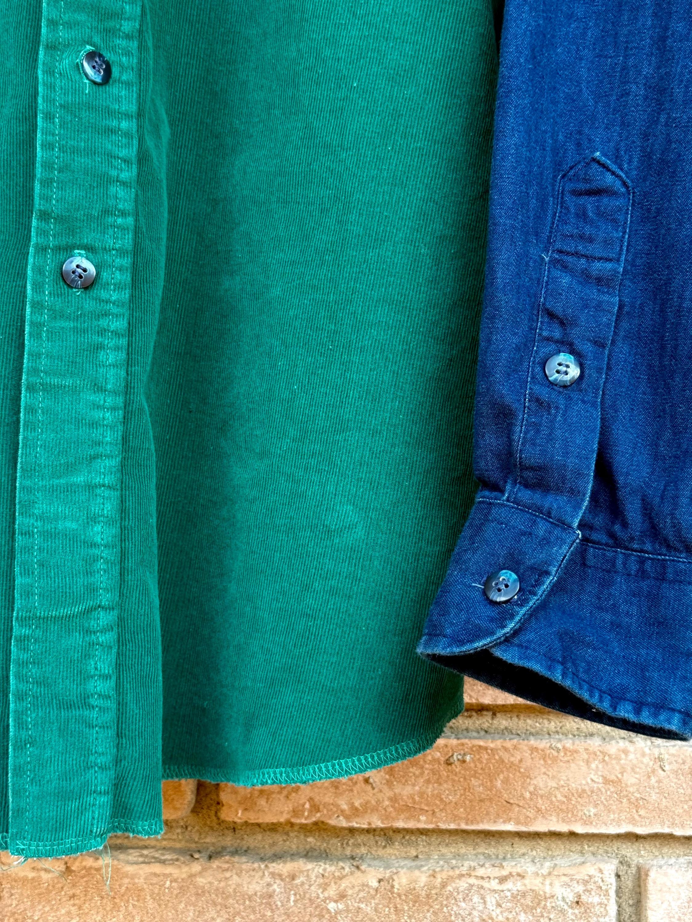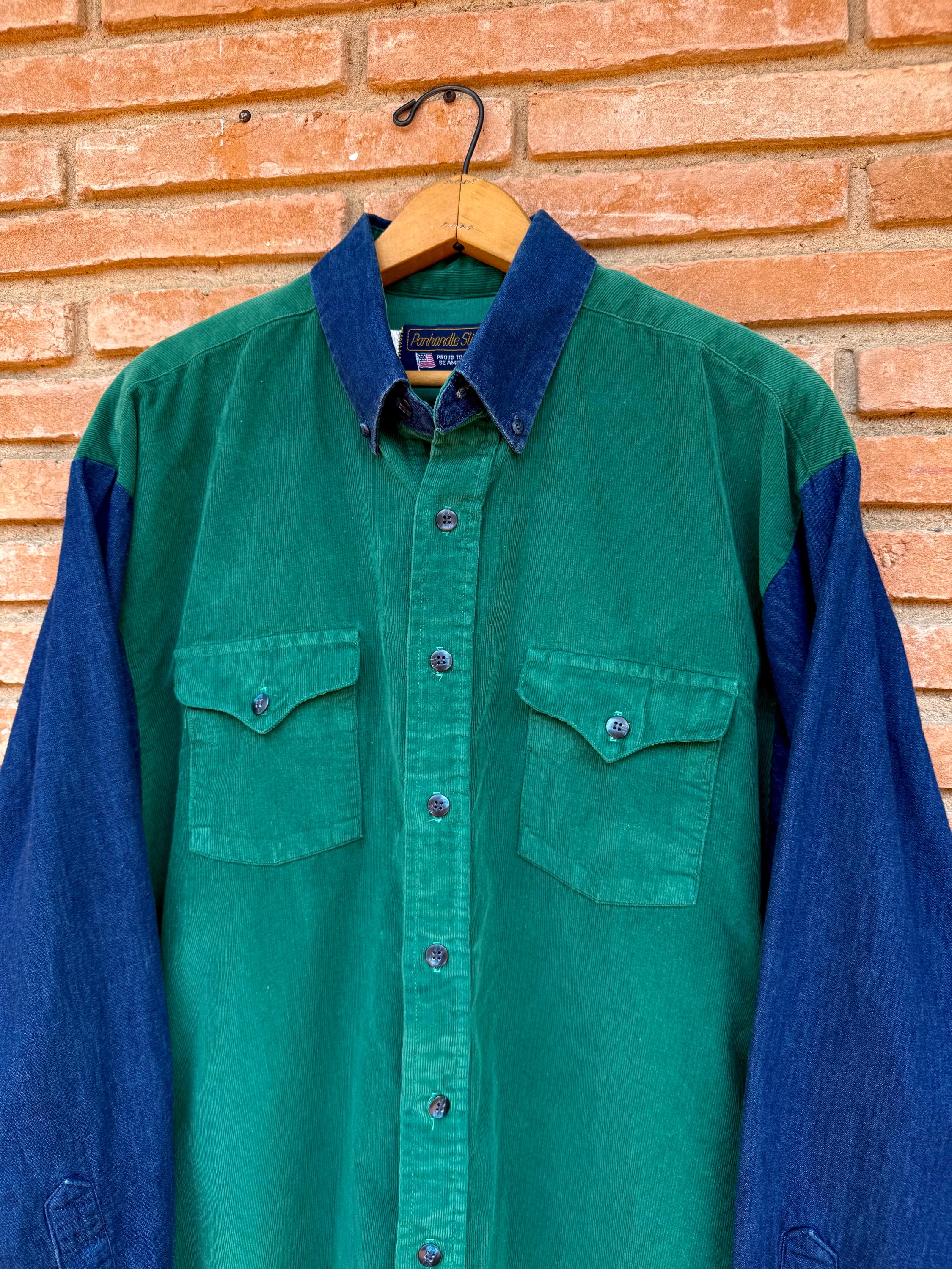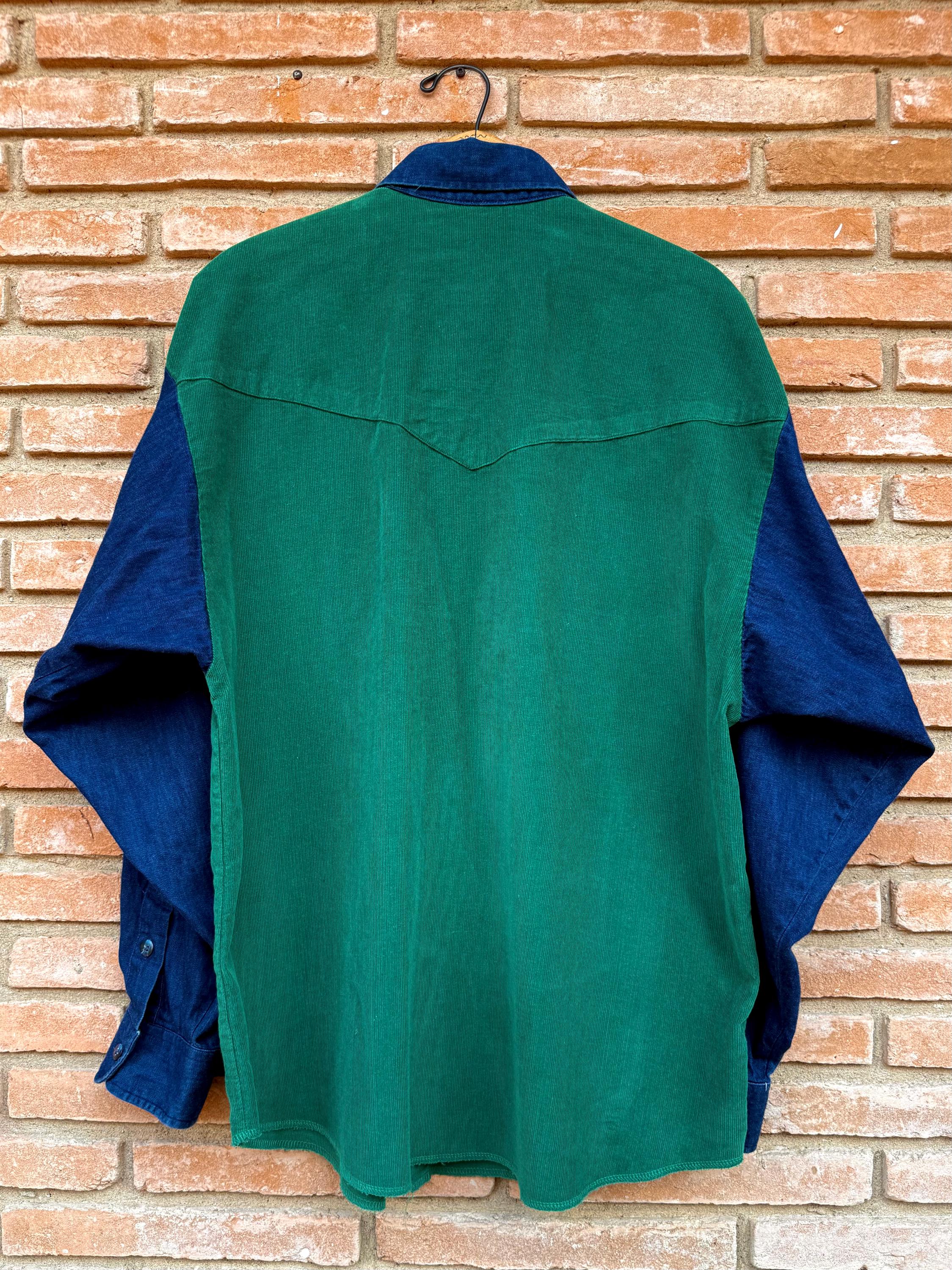 An authentic vintage western shirt by Panhandle Slim. a two tone colorblock design featuring a corduroy body with lightweight denim sleeves and collar. made in USA