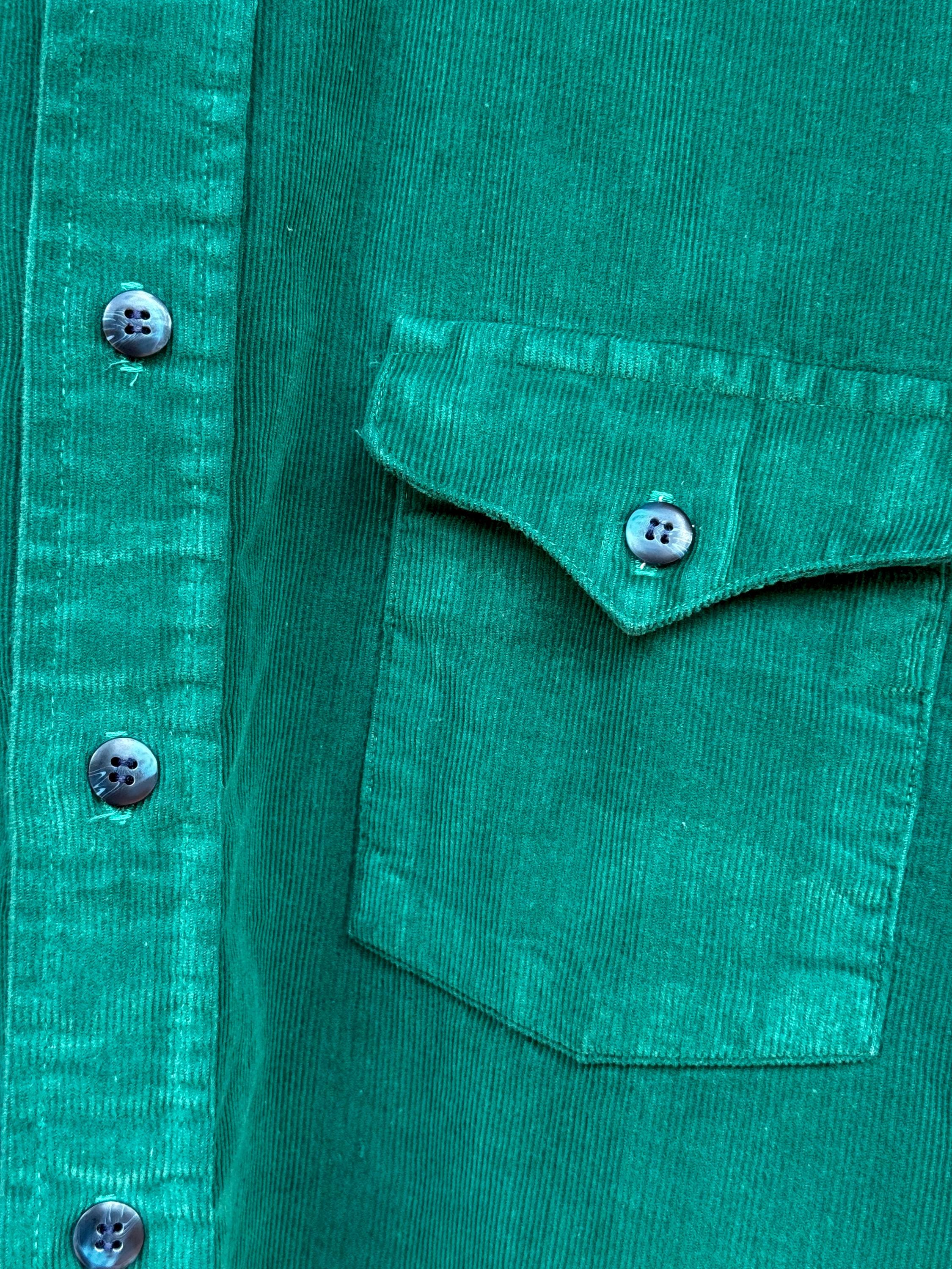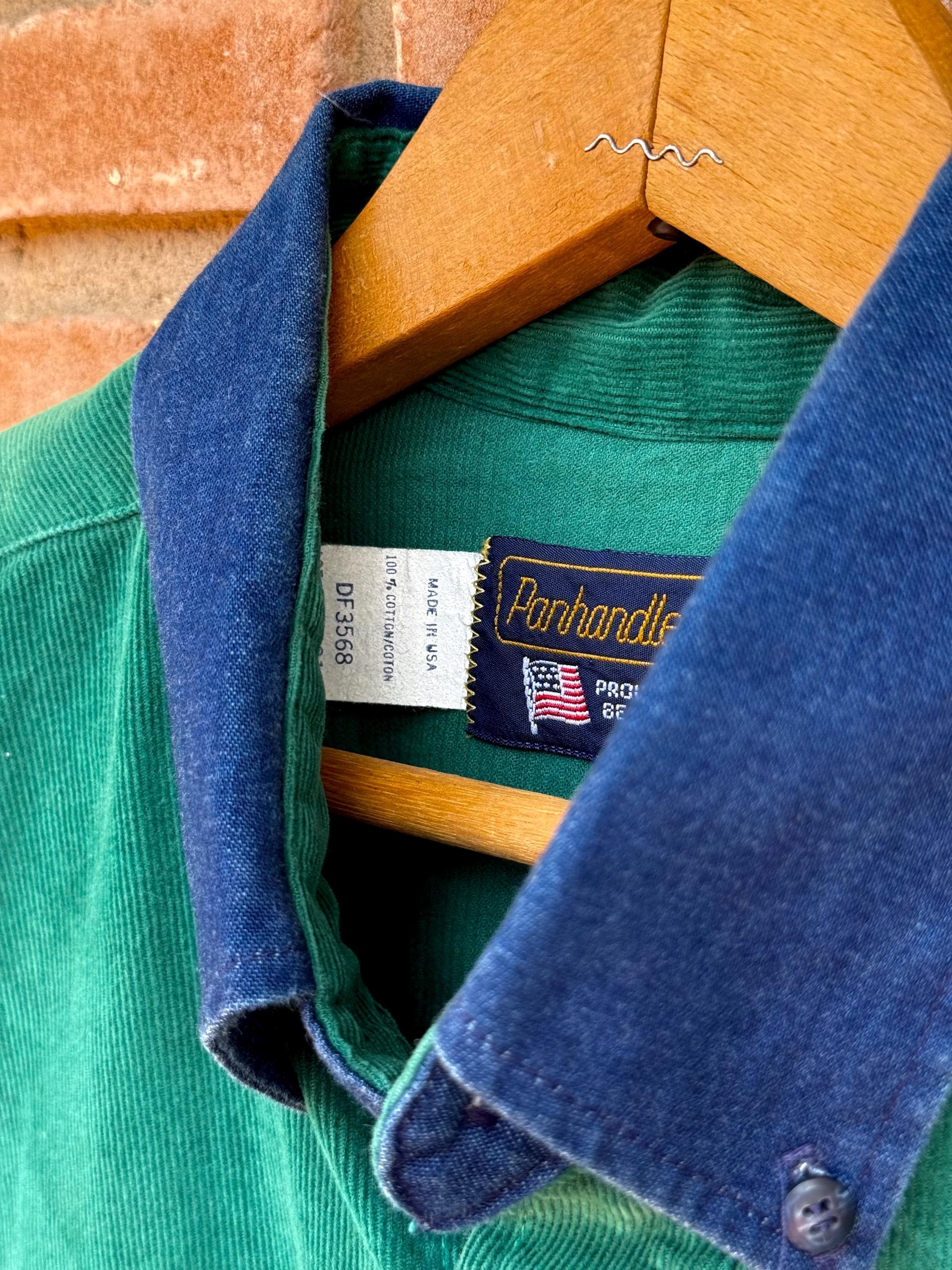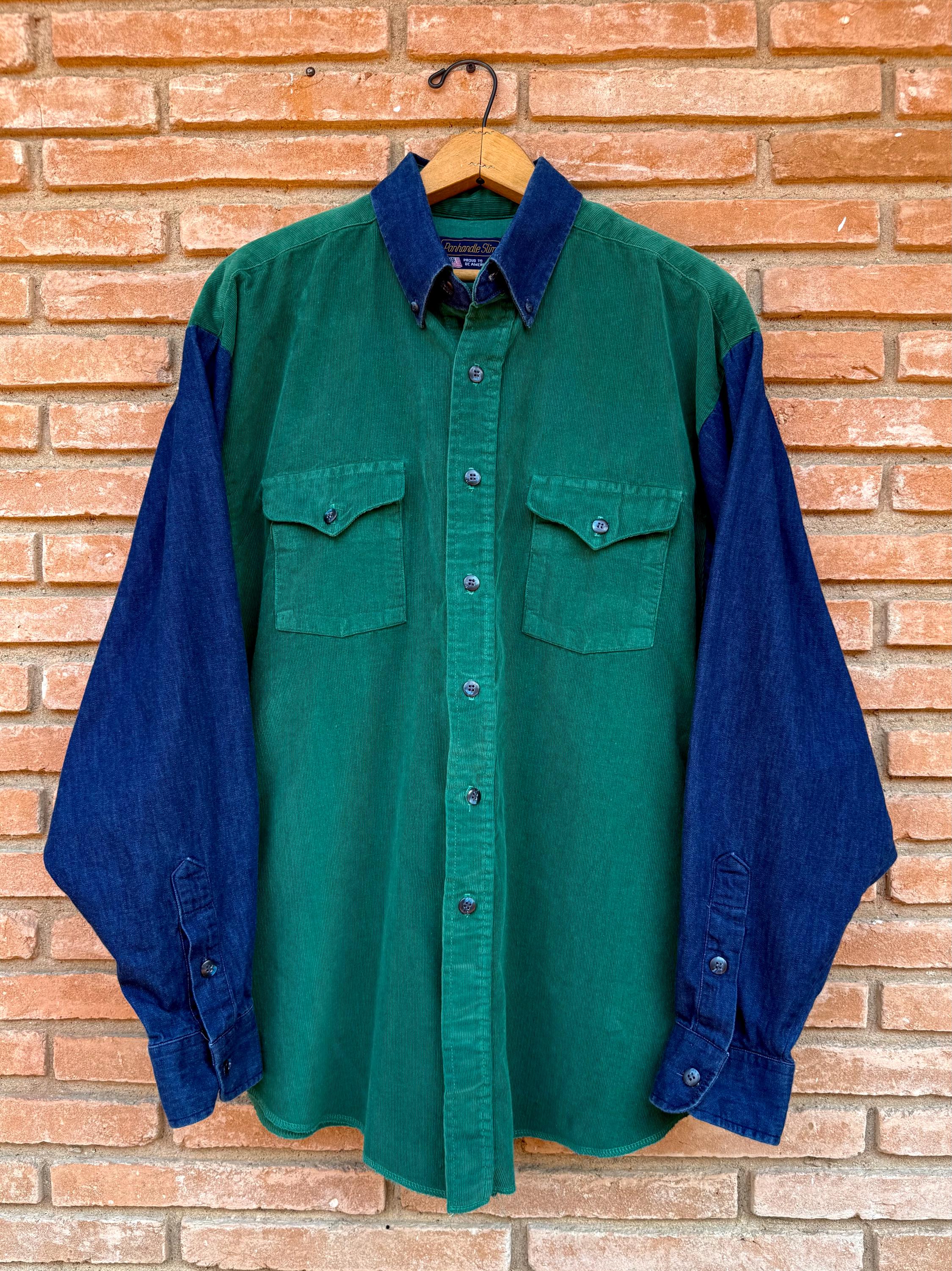 An authentic vintage western shirt by Panhandle Slim. a two tone colorblock design featuring a corduroy body with lightweight denim sleeves and collar. made in USA