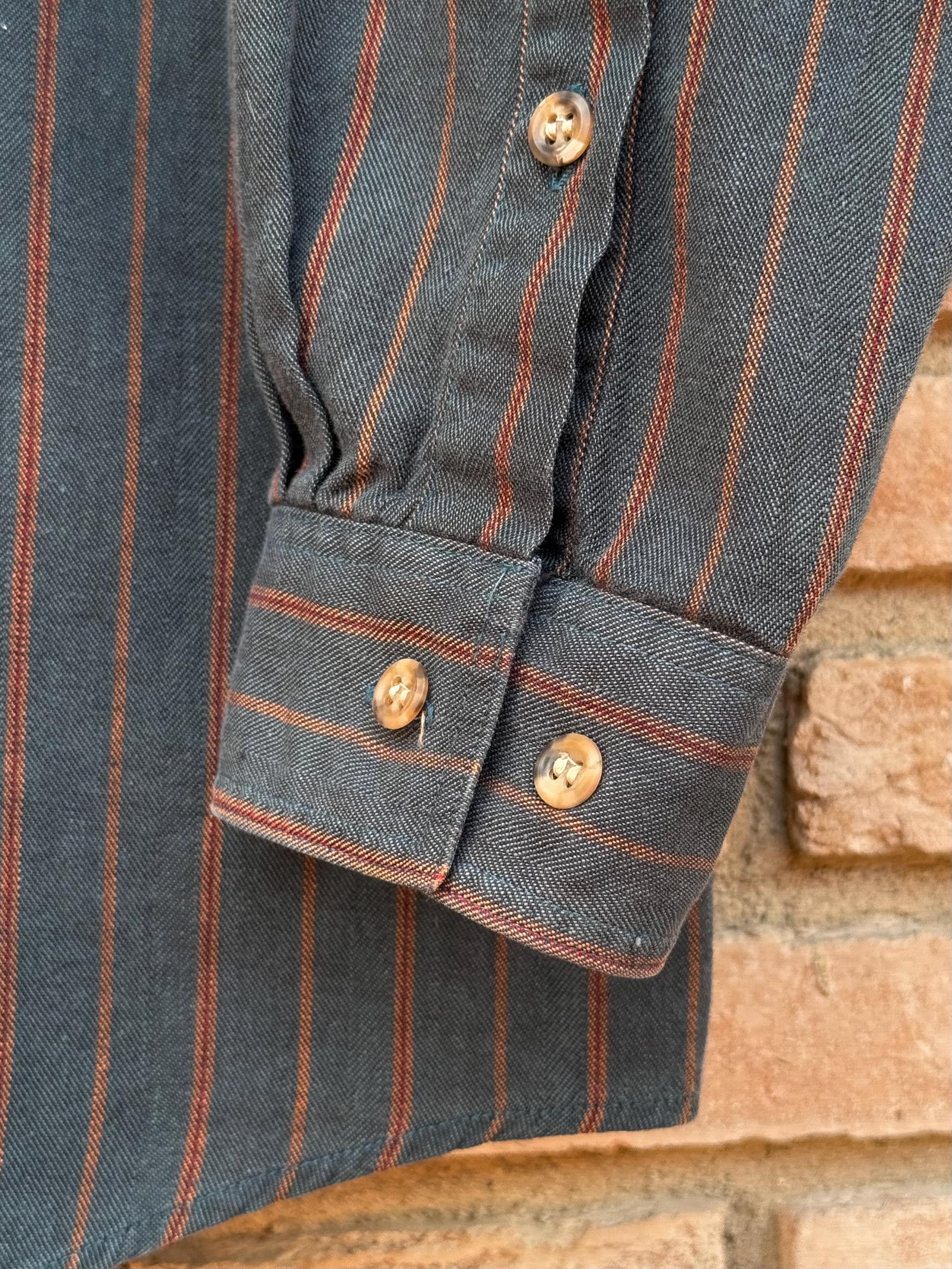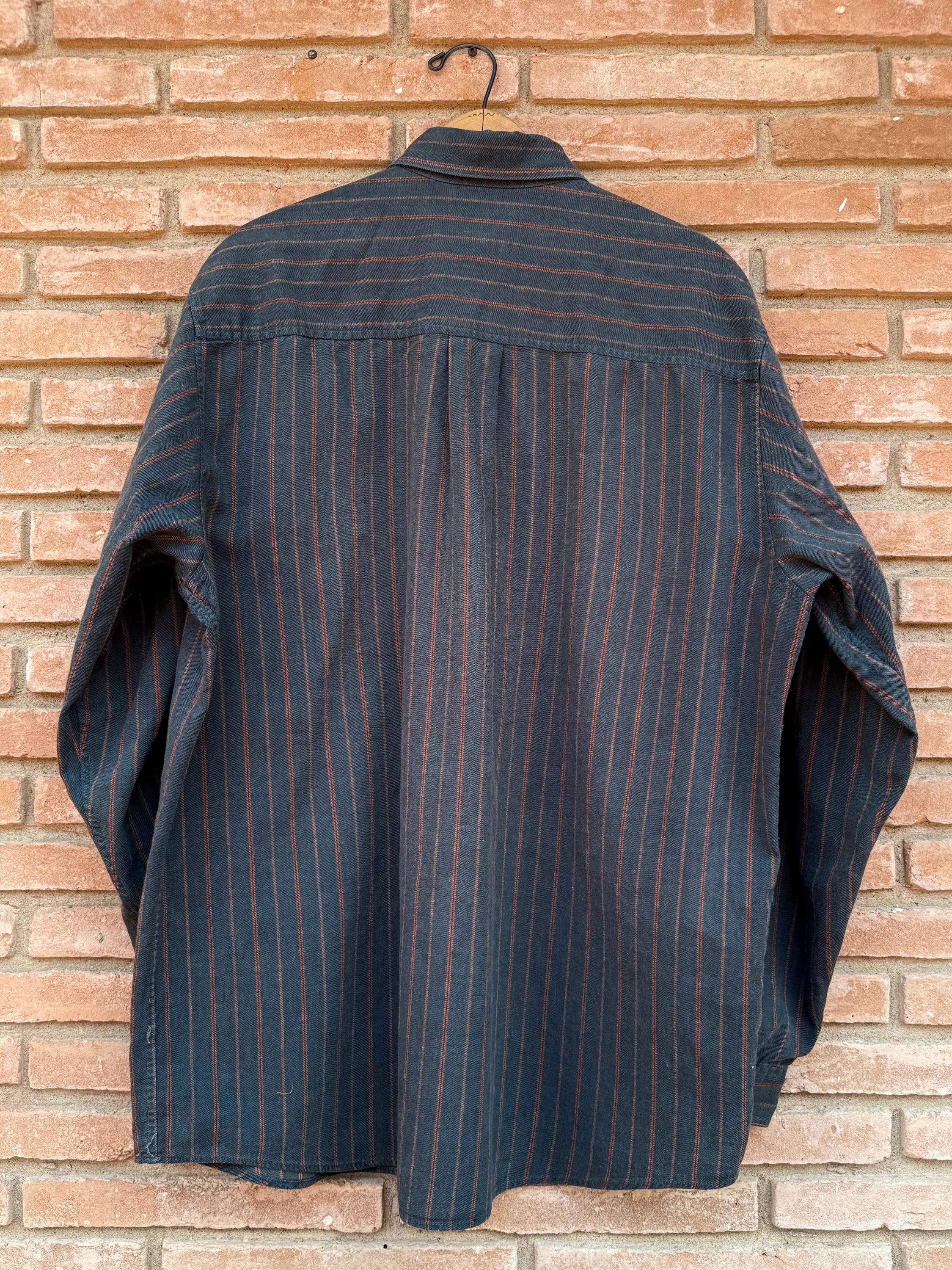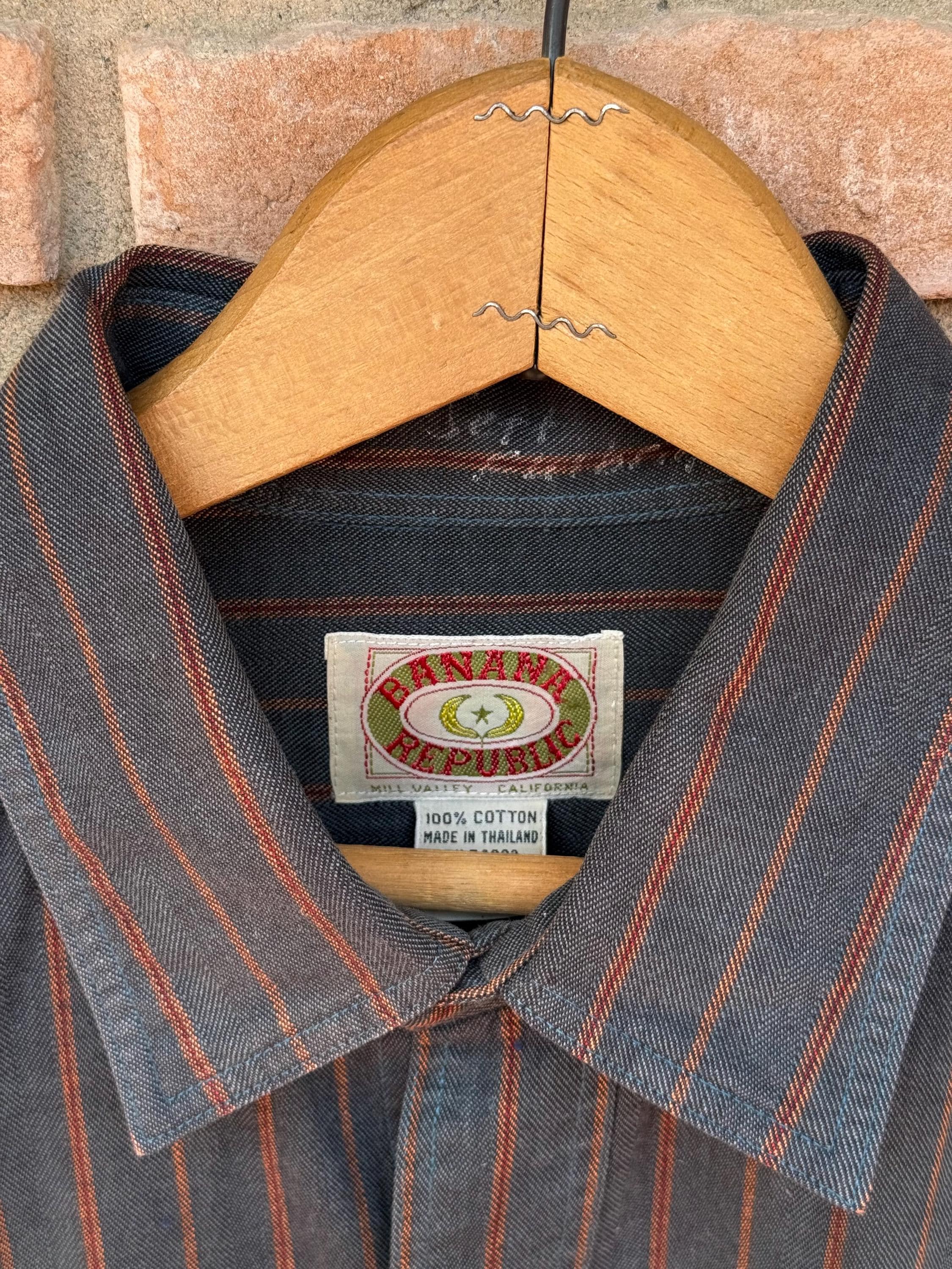 An authentic vintage shirt by Banana Republic (Mill Valley label). made from a medium weight woven twill vertical stripe fabric. a durable utility style in an interesting colorway.